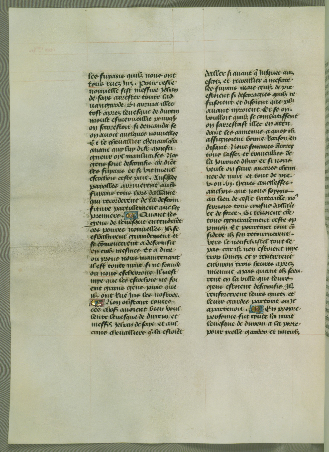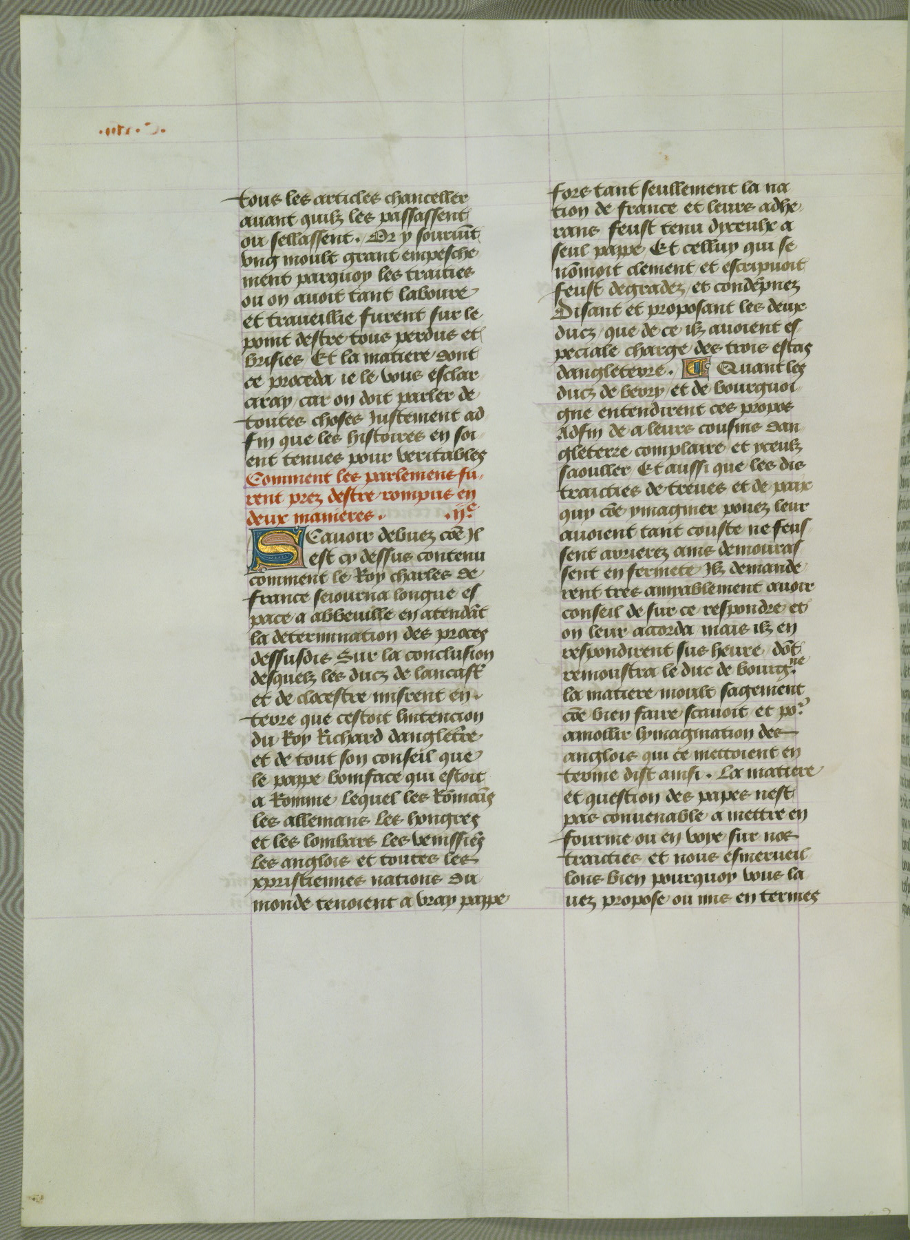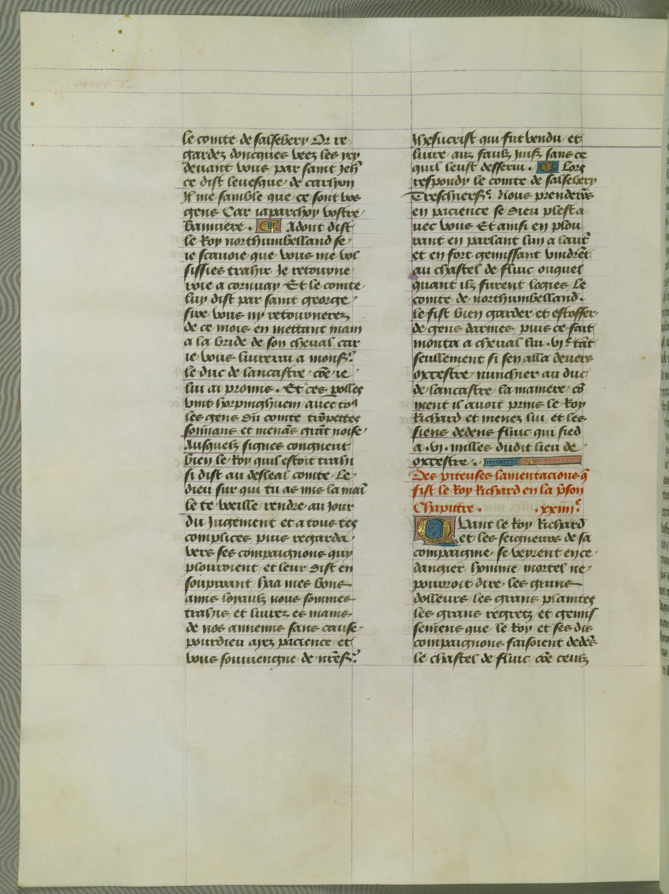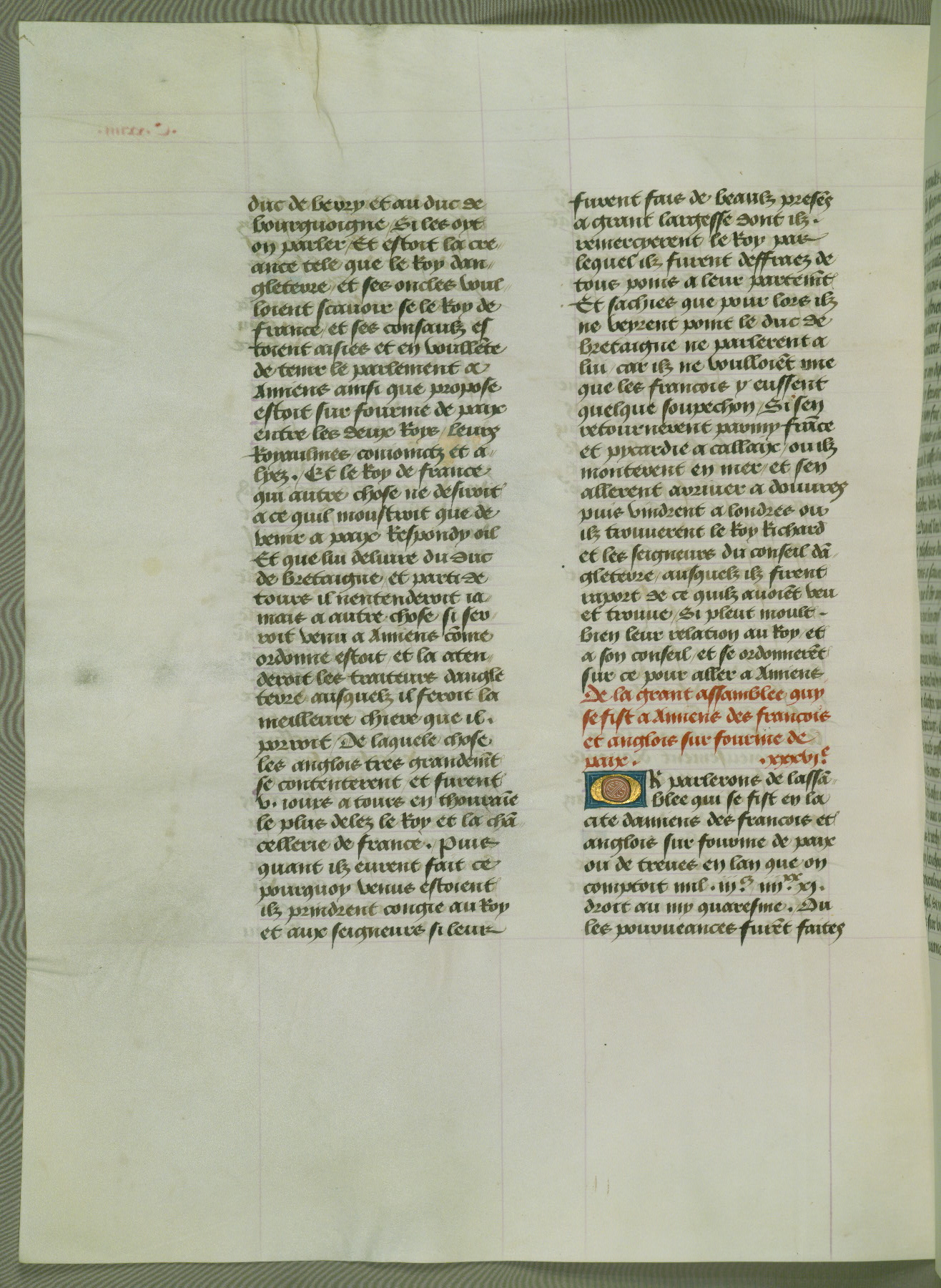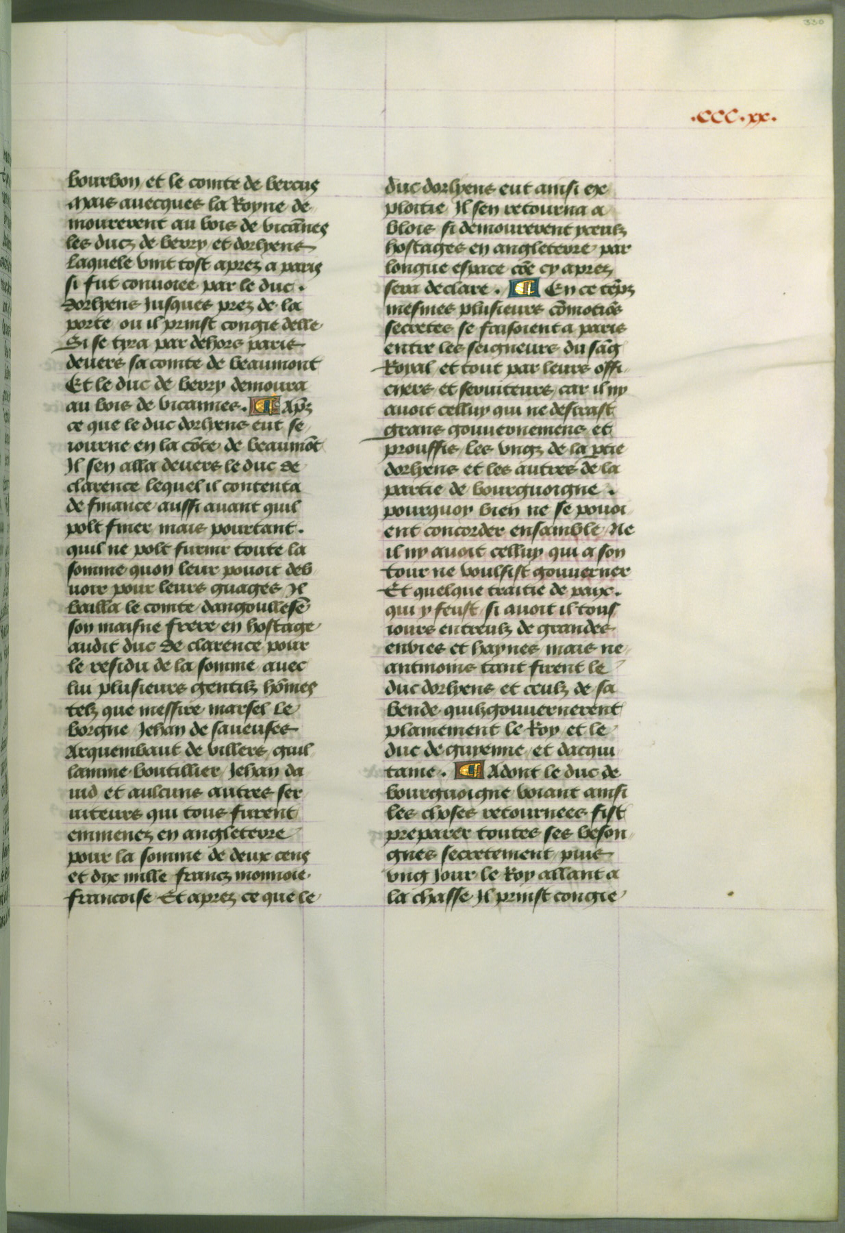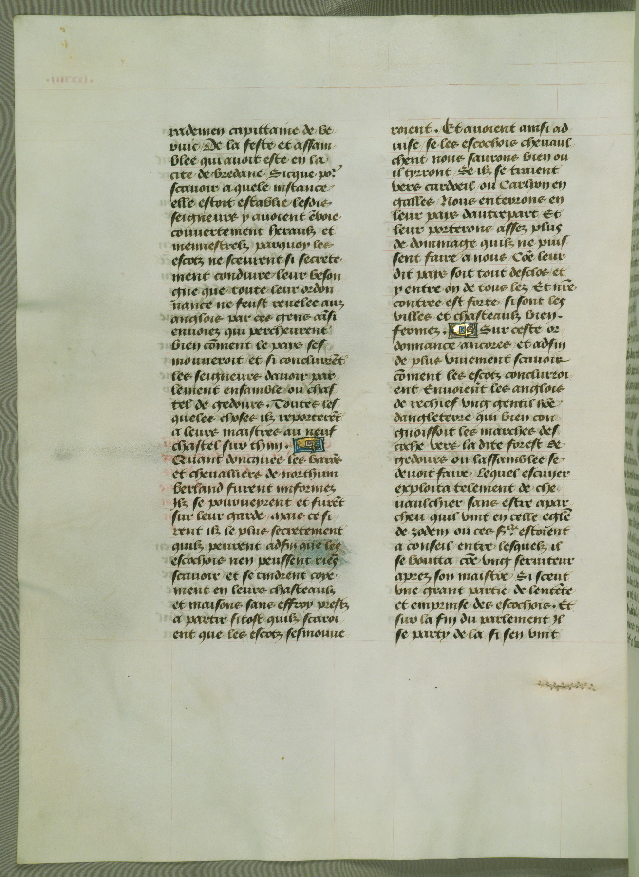 This manuscript is volume IV in a set of five from the collection "Recueil des chroniques et anchiennes istories de la Grant Bretaigne," written by Phillip the Good's counselor and chamberlain Jean de Wavrin. It chronicles the history of England from the early years of the reign of Richard II in 1377 to the demise of Henry IV, his successor, between 1400 and 1413. This volume, produced in Flanders between 1470 and 1480, was part of a set of which volumes II, III and V were recorded in the inventory of the library of William III of Orange in 1686, and was later rebound during the seventeenth or eighteenth century. Six three-quarter-page miniatures open the text of each book and depict events documented therein (with the exception of that of Book 1, portraying Richard II's coronation, which occurs prior to the period detailed in that book). The manuscript's margins are wide and relatively pristine throughout the textblock, but show significant signs of use on illuminated folios, indicating that this manuscript was primarily used for display and not as a historical text. Although few volumes of the Chroniques remain, this manuscript is particularly rare in that it is one of the two surviving exemplars of the text of volume IV, the other being part of the complete set in the Bibliothèque nationale de France (BN fr. 74-85). Volumes II, III, and V of the set to which this volume originally belonged are now in the collection of the Koninklijke Bibliotheek (Den Haag, KB : 133 A 7).