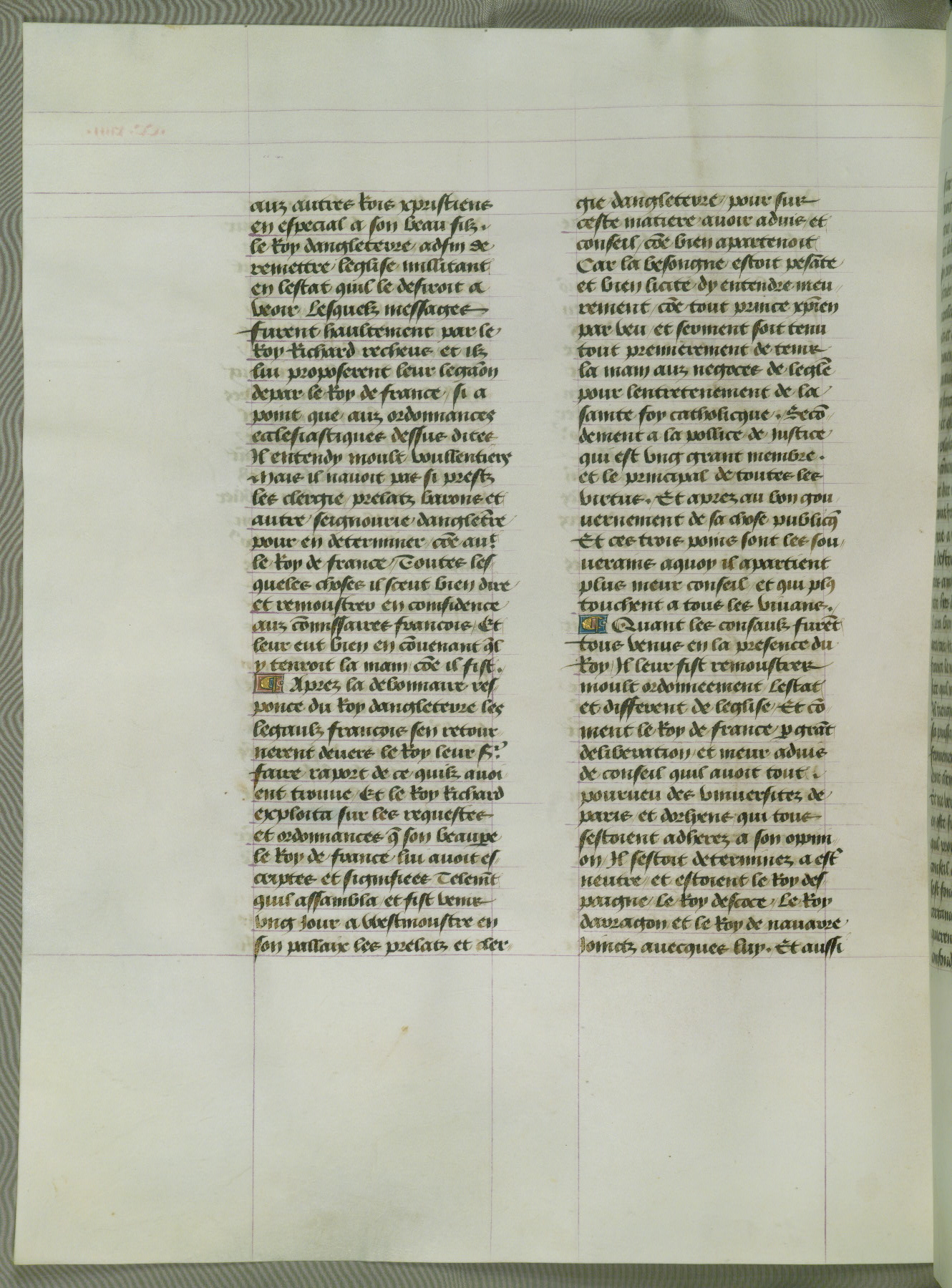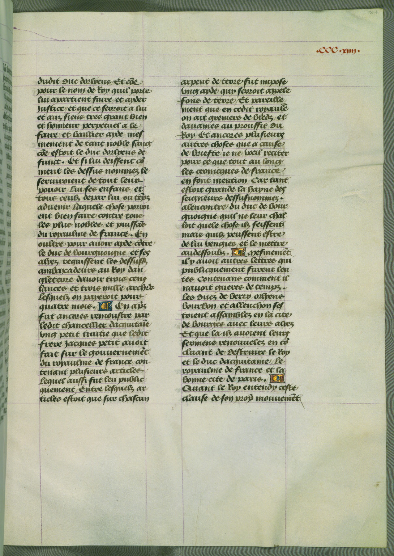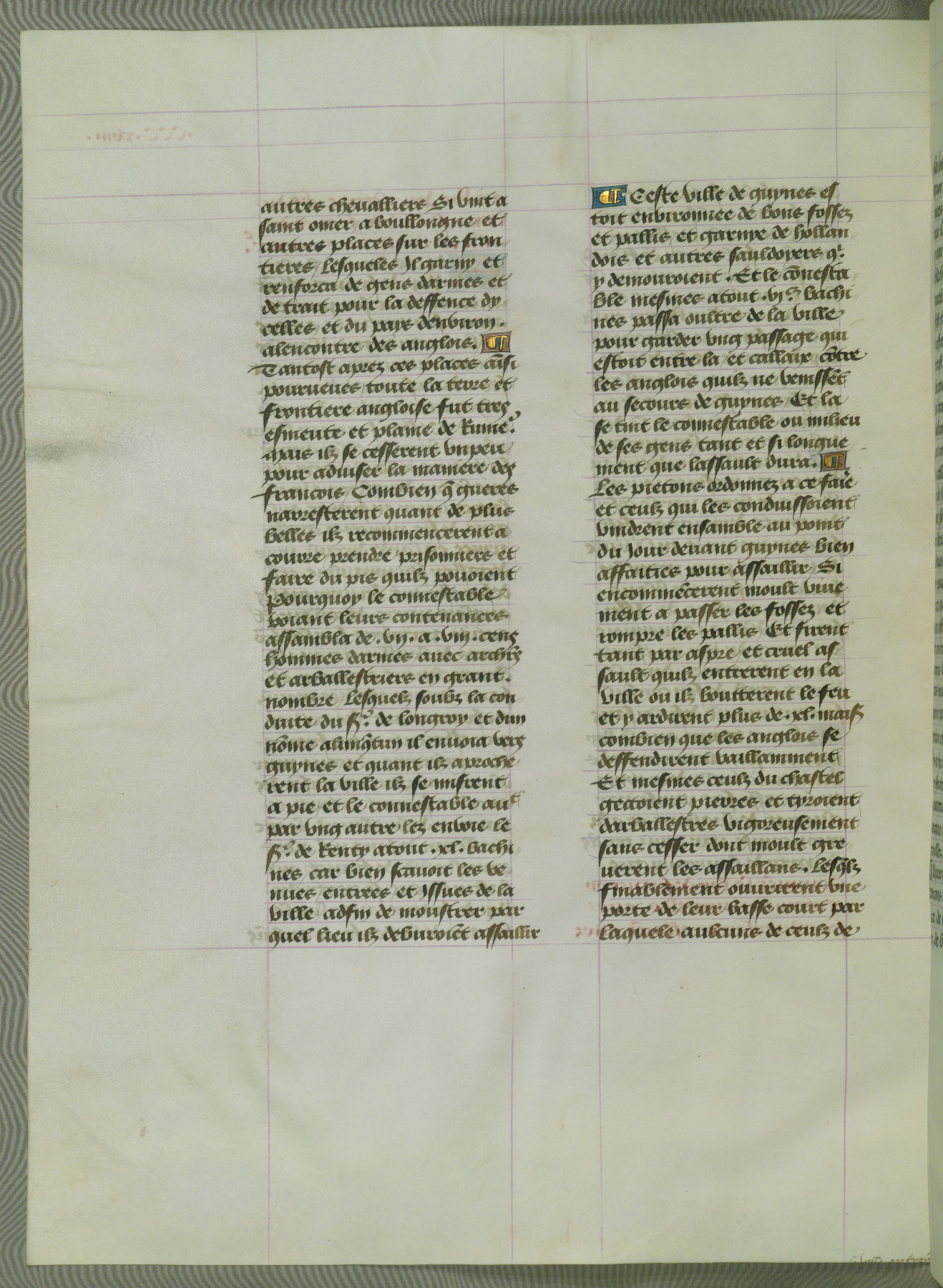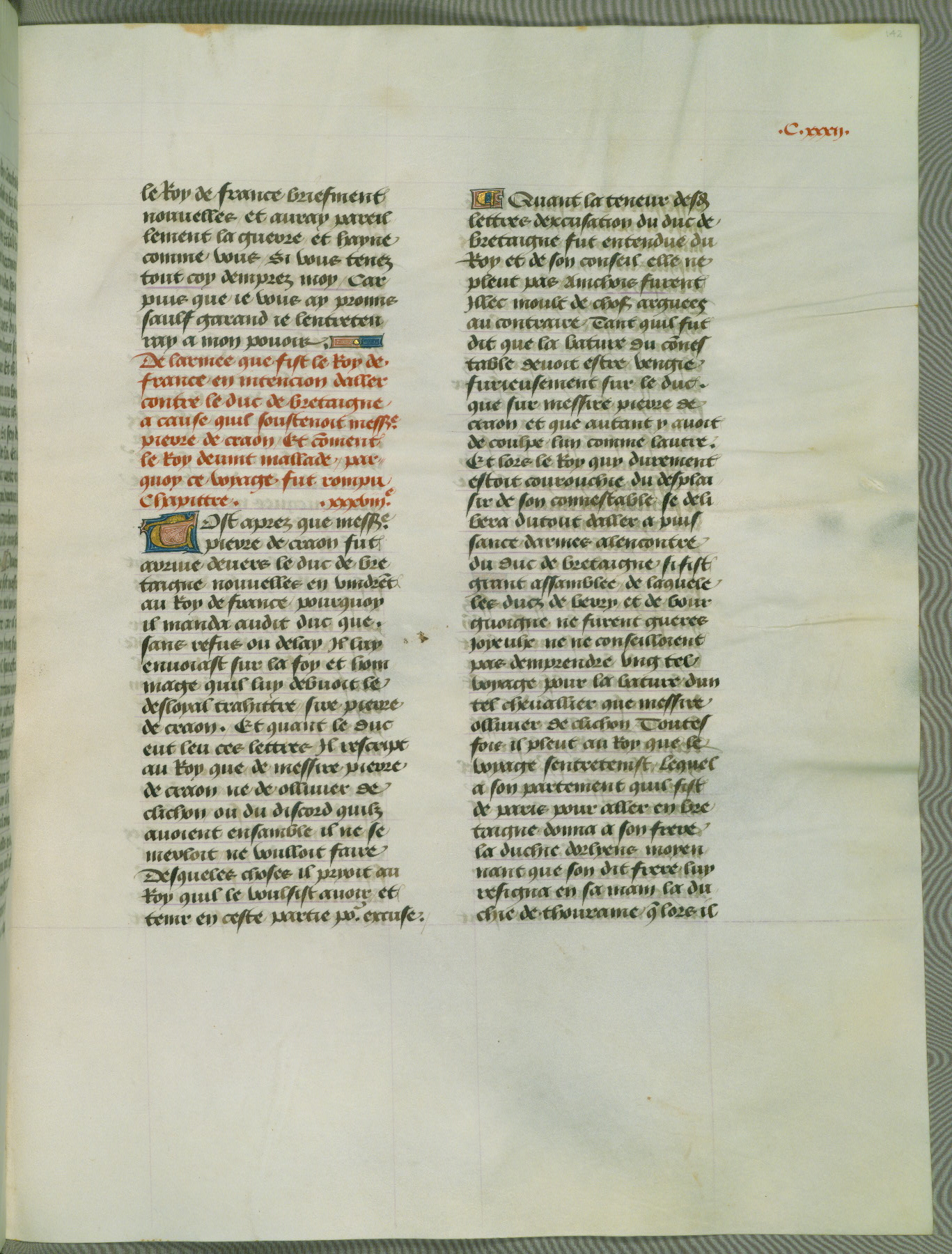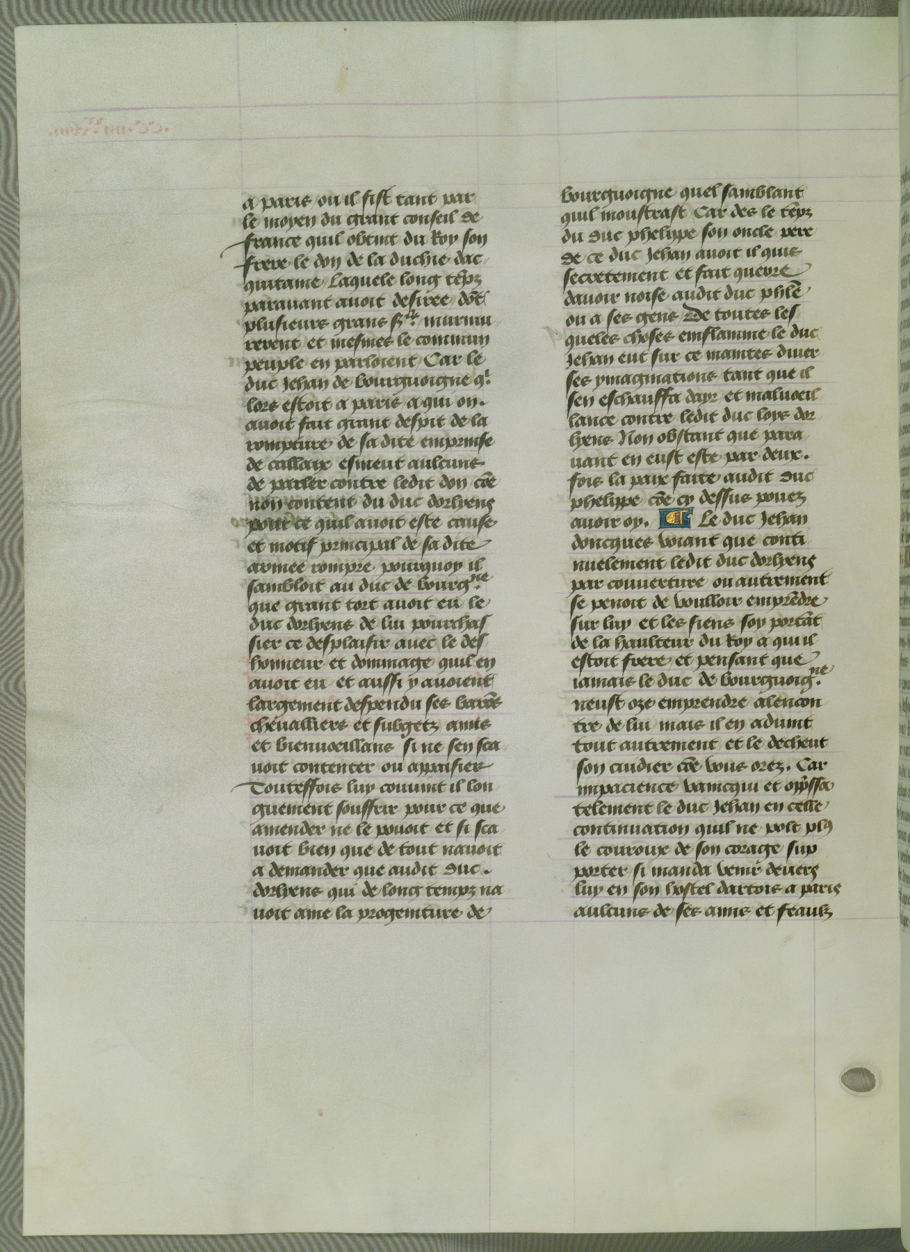 This manuscript is volume IV in a set of five from the collection "Recueil des chroniques et anchiennes istories de la Grant Bretaigne," written by Phillip the Good's counselor and chamberlain Jean de Wavrin. It chronicles the history of England from the early years of the reign of Richard II in 1377 to the demise of Henry IV, his successor, between 1400 and 1413. This volume, produced in Flanders between 1470 and 1480, was part of a set of which volumes II, III and V were recorded in the inventory of the library of William III of Orange in 1686, and was later rebound during the seventeenth or eighteenth century. Six three-quarter-page miniatures open the text of each book and depict events documented therein (with the exception of that of Book 1, portraying Richard II's coronation, which occurs prior to the period detailed in that book). The manuscript's margins are wide and relatively pristine throughout the textblock, but show significant signs of use on illuminated folios, indicating that this manuscript was primarily used for display and not as a historical text. Although few volumes of the Chroniques remain, this manuscript is particularly rare in that it is one of the two surviving exemplars of the text of volume IV, the other being part of the complete set in the Bibliothèque nationale de France (BN fr. 74-85). Volumes II, III, and V of the set to which this volume originally belonged are now in the collection of the Koninklijke Bibliotheek (Den Haag, KB : 133 A 7).