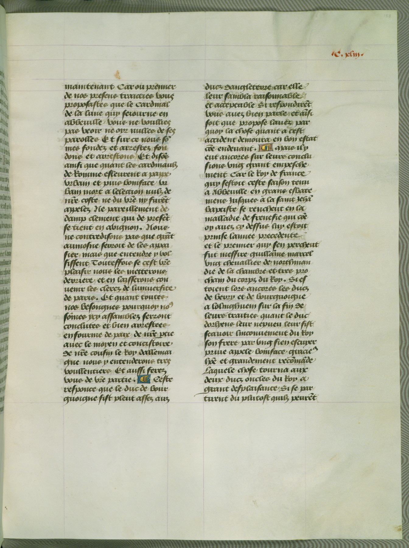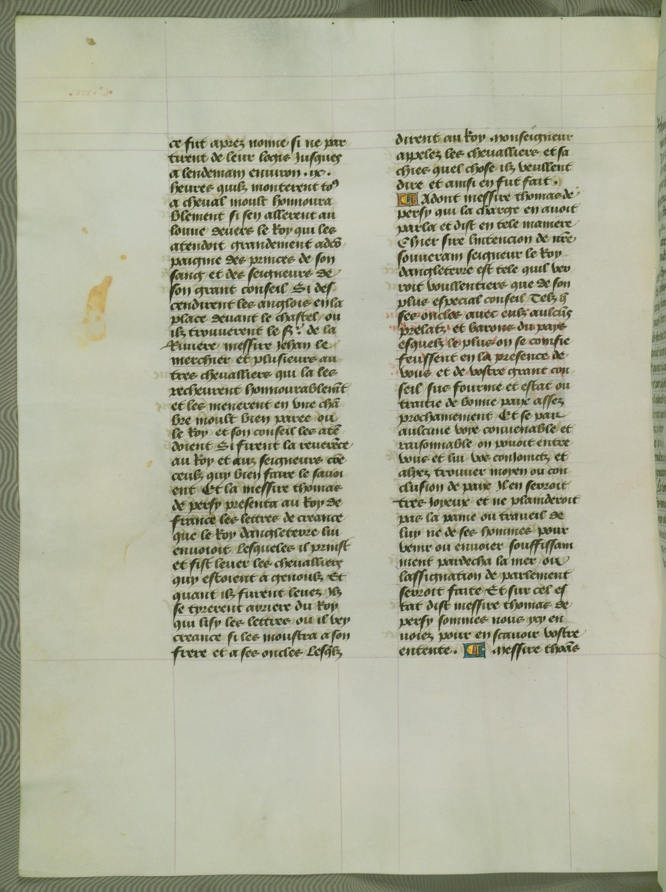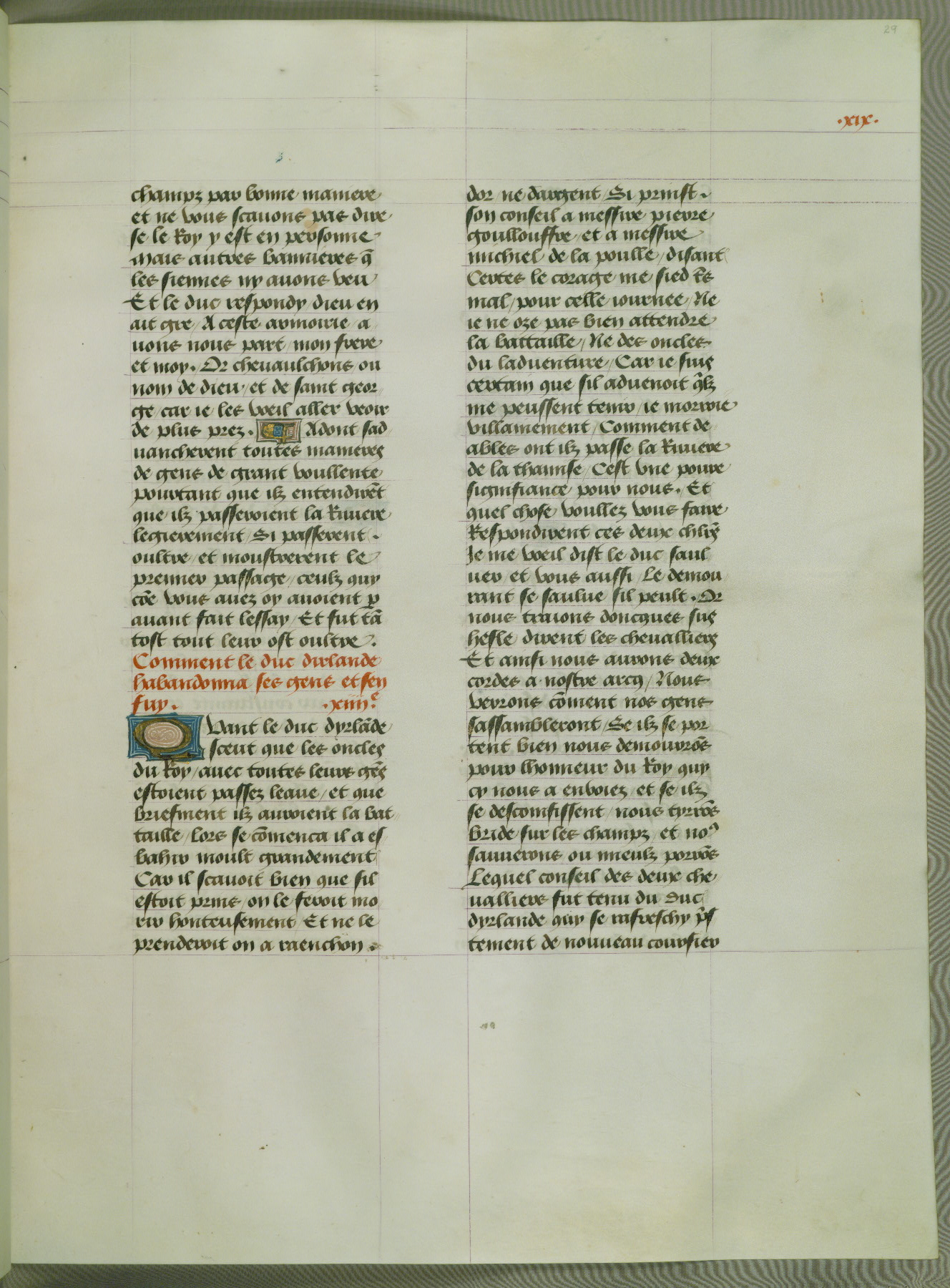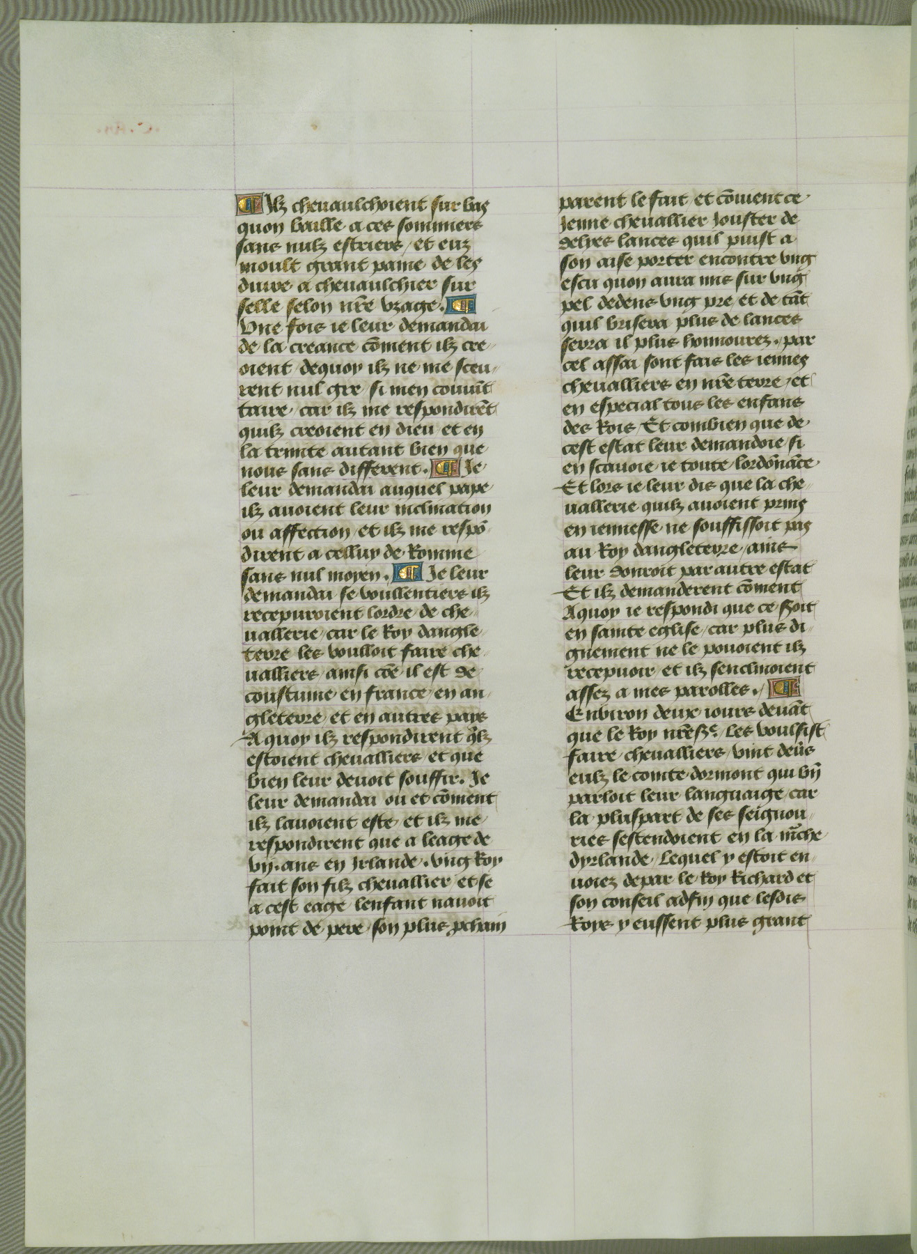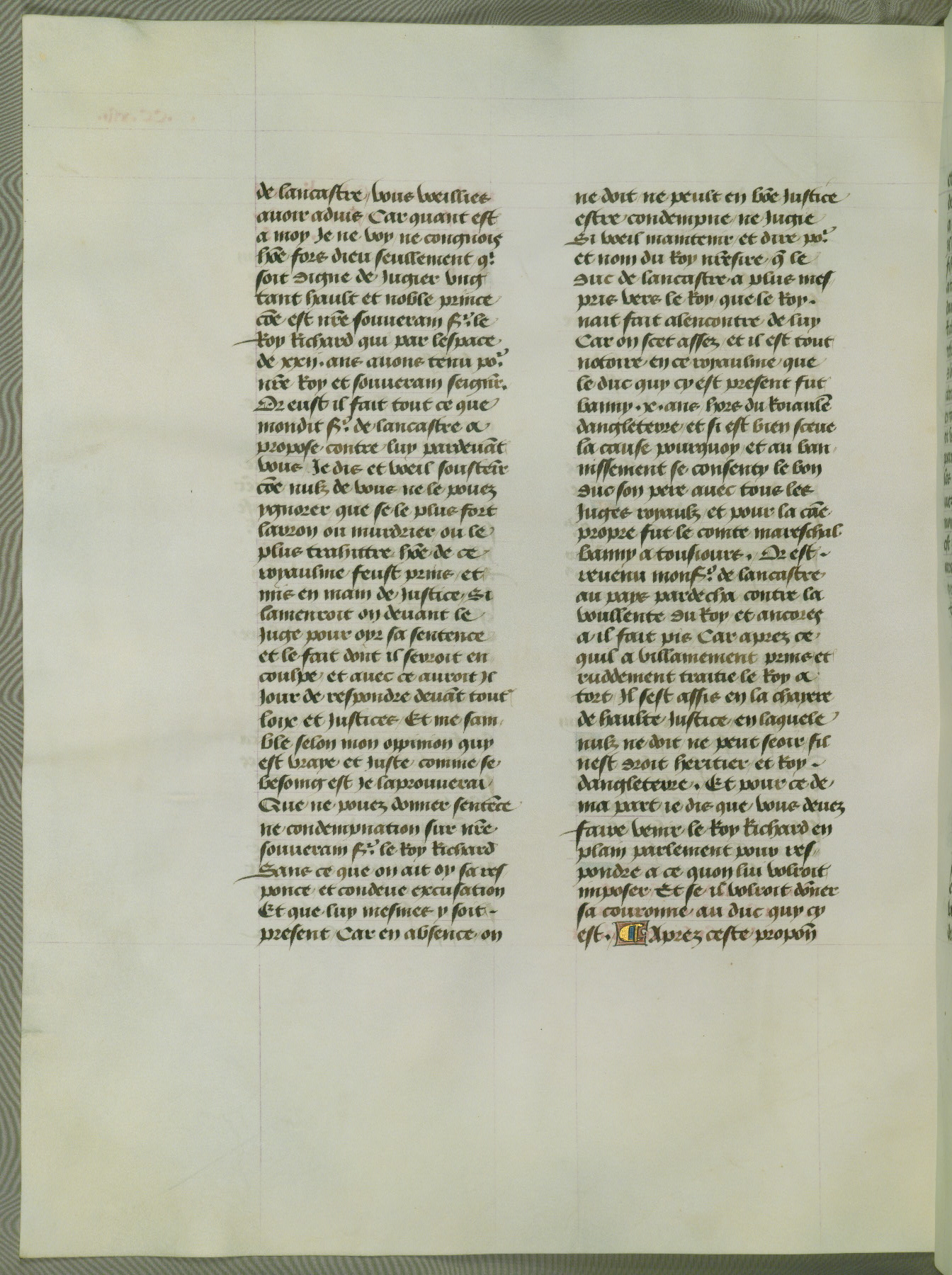 This manuscript is volume IV in a set of five from the collection "Recueil des chroniques et anchiennes istories de la Grant Bretaigne," written by Phillip the Good's counselor and chamberlain Jean de Wavrin. It chronicles the history of England from the early years of the reign of Richard II in 1377 to the demise of Henry IV, his successor, between 1400 and 1413. This volume, produced in Flanders between 1470 and 1480, was part of a set of which volumes II, III and V were recorded in the inventory of the library of William III of Orange in 1686, and was later rebound during the seventeenth or eighteenth century. Six three-quarter-page miniatures open the text of each book and depict events documented therein (with the exception of that of Book 1, portraying Richard II's coronation, which occurs prior to the period detailed in that book). The manuscript's margins are wide and relatively pristine throughout the textblock, but show significant signs of use on illuminated folios, indicating that this manuscript was primarily used for display and not as a historical text. Although few volumes of the Chroniques remain, this manuscript is particularly rare in that it is one of the two surviving exemplars of the text of volume IV, the other being part of the complete set in the Bibliothèque nationale de France (BN fr. 74-85). Volumes II, III, and V of the set to which this volume originally belonged are now in the collection of the Koninklijke Bibliotheek (Den Haag, KB : 133 A 7).