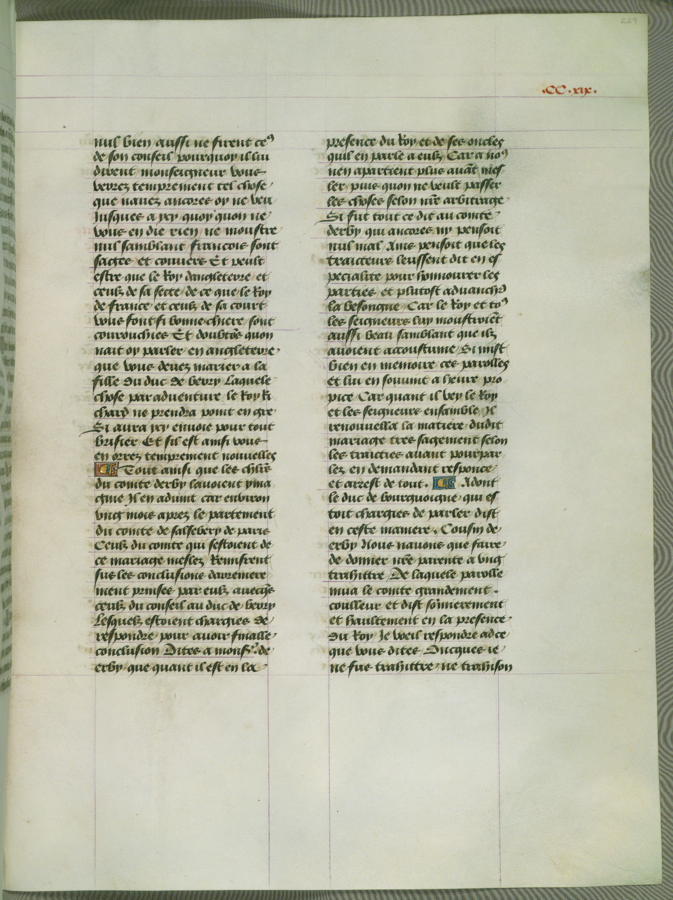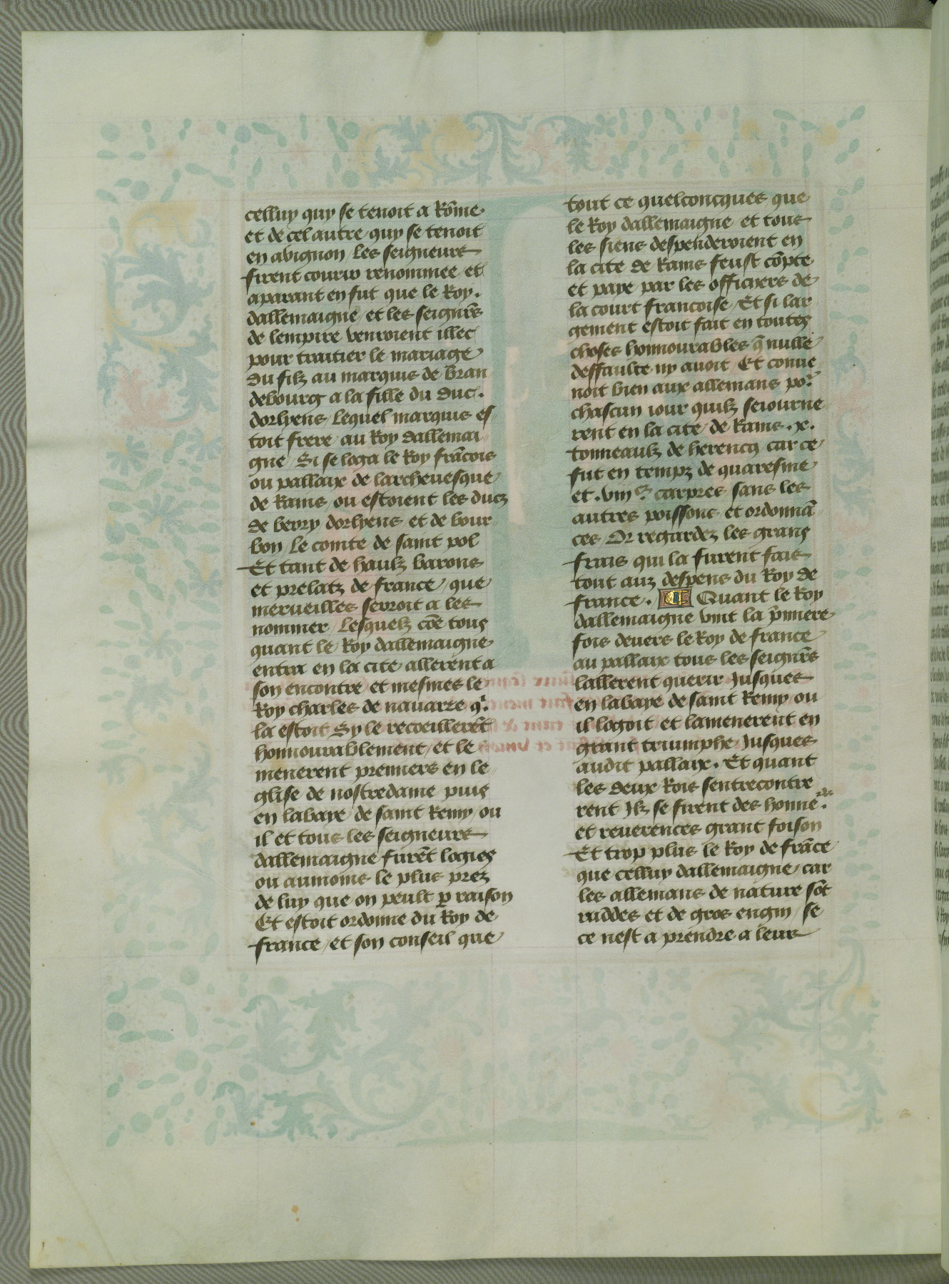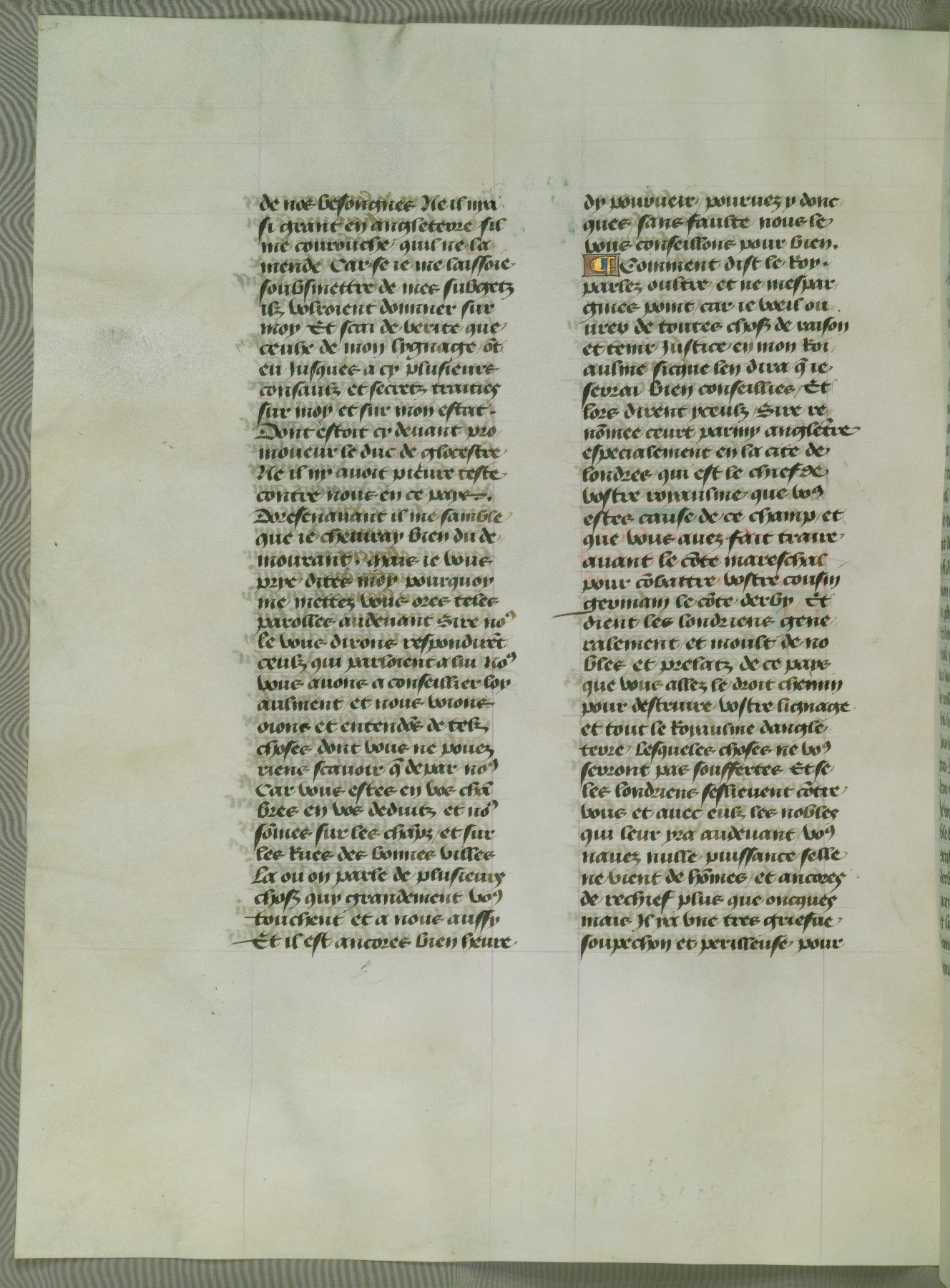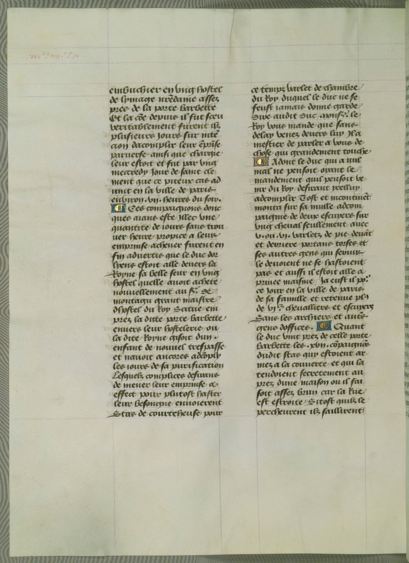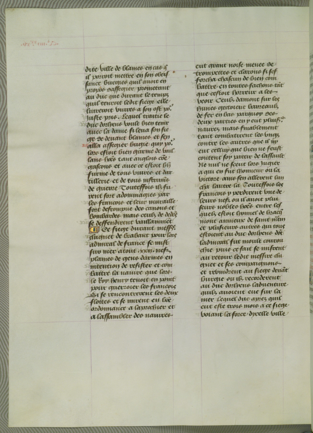 This manuscript is volume IV in a set of five from the collection "Recueil des chroniques et anchiennes istories de la Grant Bretaigne," written by Phillip the Good's counselor and chamberlain Jean de Wavrin. It chronicles the history of England from the early years of the reign of Richard II in 1377 to the demise of Henry IV, his successor, between 1400 and 1413. This volume, produced in Flanders between 1470 and 1480, was part of a set of which volumes II, III and V were recorded in the inventory of the library of William III of Orange in 1686, and was later rebound during the seventeenth or eighteenth century. Six three-quarter-page miniatures open the text of each book and depict events documented therein (with the exception of that of Book 1, portraying Richard II's coronation, which occurs prior to the period detailed in that book). The manuscript's margins are wide and relatively pristine throughout the textblock, but show significant signs of use on illuminated folios, indicating that this manuscript was primarily used for display and not as a historical text. Although few volumes of the Chroniques remain, this manuscript is particularly rare in that it is one of the two surviving exemplars of the text of volume IV, the other being part of the complete set in the Bibliothèque nationale de France (BN fr. 74-85). Volumes II, III, and V of the set to which this volume originally belonged are now in the collection of the Koninklijke Bibliotheek (Den Haag, KB : 133 A 7).