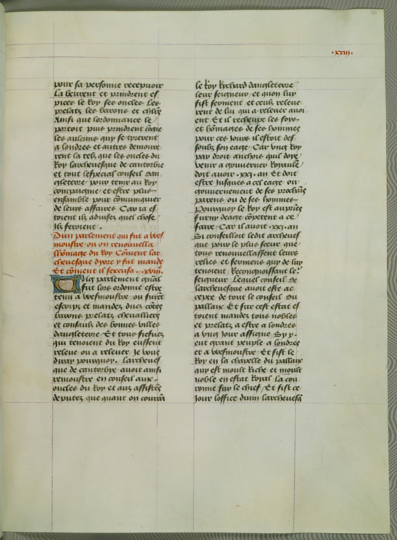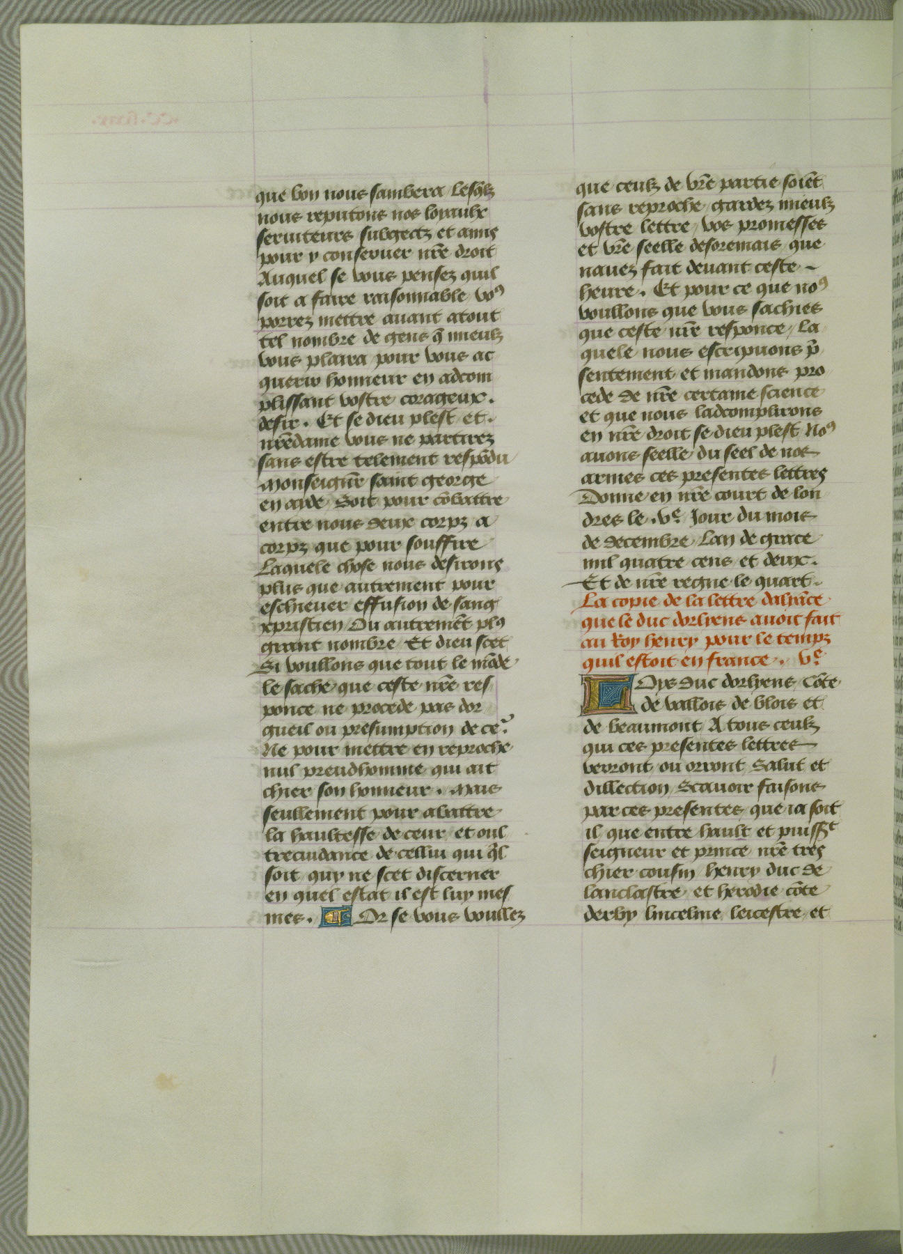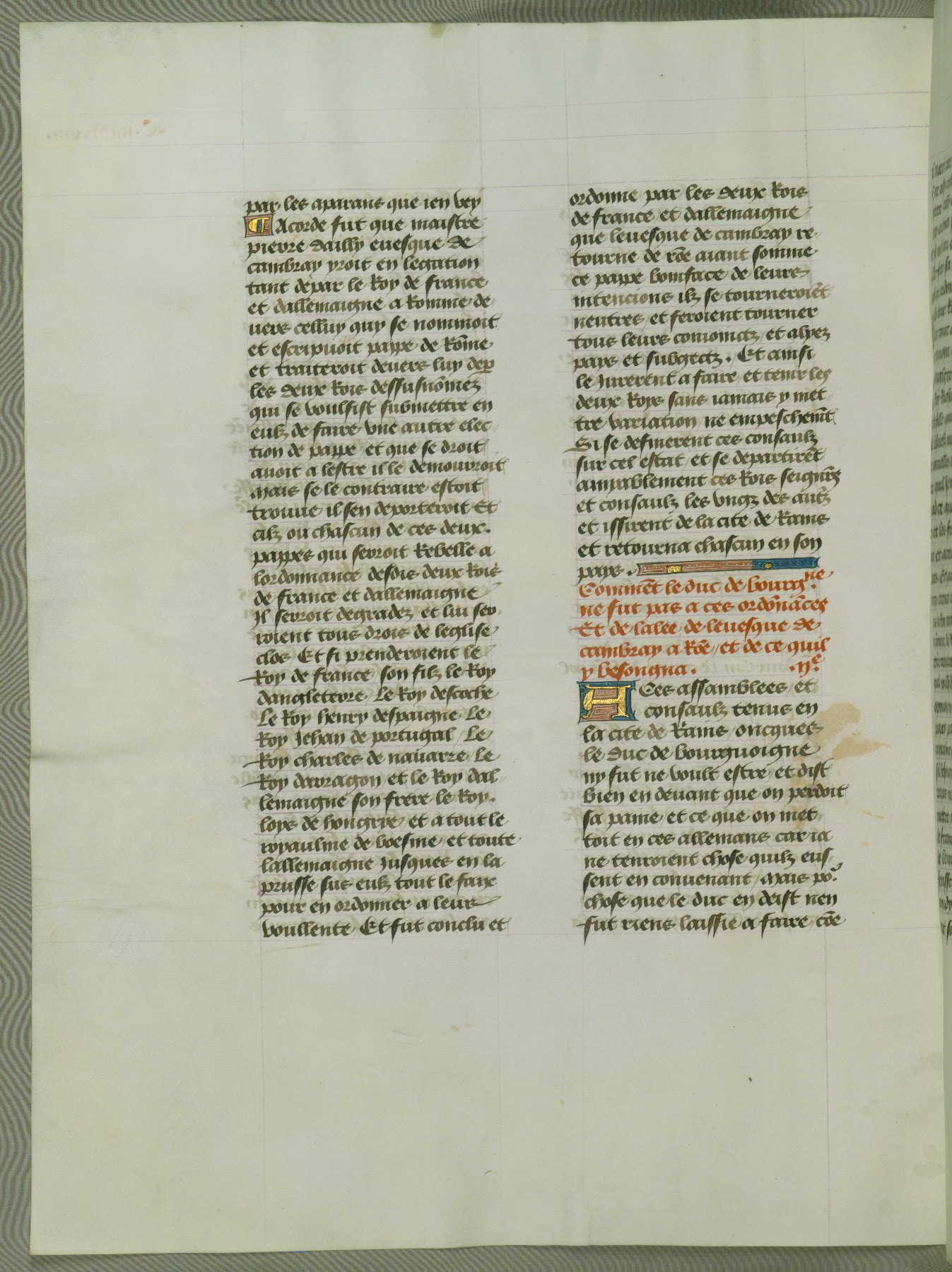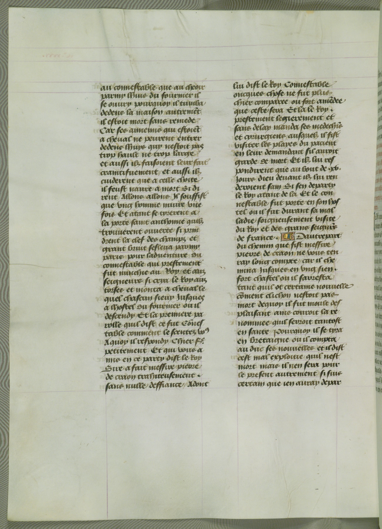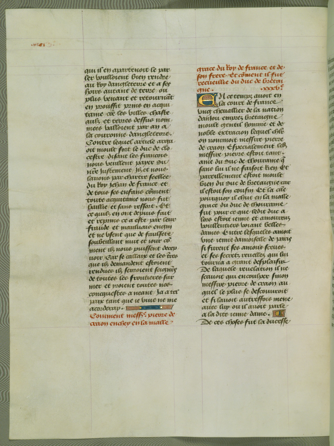 This manuscript is volume IV in a set of five from the collection "Recueil des chroniques et anchiennes istories de la Grant Bretaigne," written by Phillip the Good's counselor and chamberlain Jean de Wavrin. It chronicles the history of England from the early years of the reign of Richard II in 1377 to the demise of Henry IV, his successor, between 1400 and 1413. This volume, produced in Flanders between 1470 and 1480, was part of a set of which volumes II, III and V were recorded in the inventory of the library of William III of Orange in 1686, and was later rebound during the seventeenth or eighteenth century. Six three-quarter-page miniatures open the text of each book and depict events documented therein (with the exception of that of Book 1, portraying Richard II's coronation, which occurs prior to the period detailed in that book). The manuscript's margins are wide and relatively pristine throughout the textblock, but show significant signs of use on illuminated folios, indicating that this manuscript was primarily used for display and not as a historical text. Although few volumes of the Chroniques remain, this manuscript is particularly rare in that it is one of the two surviving exemplars of the text of volume IV, the other being part of the complete set in the Bibliothèque nationale de France (BN fr. 74-85). Volumes II, III, and V of the set to which this volume originally belonged are now in the collection of the Koninklijke Bibliotheek (Den Haag, KB : 133 A 7).