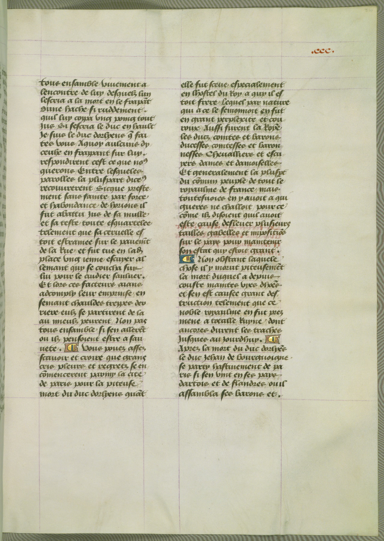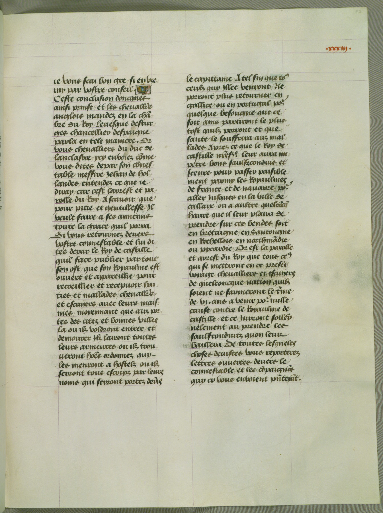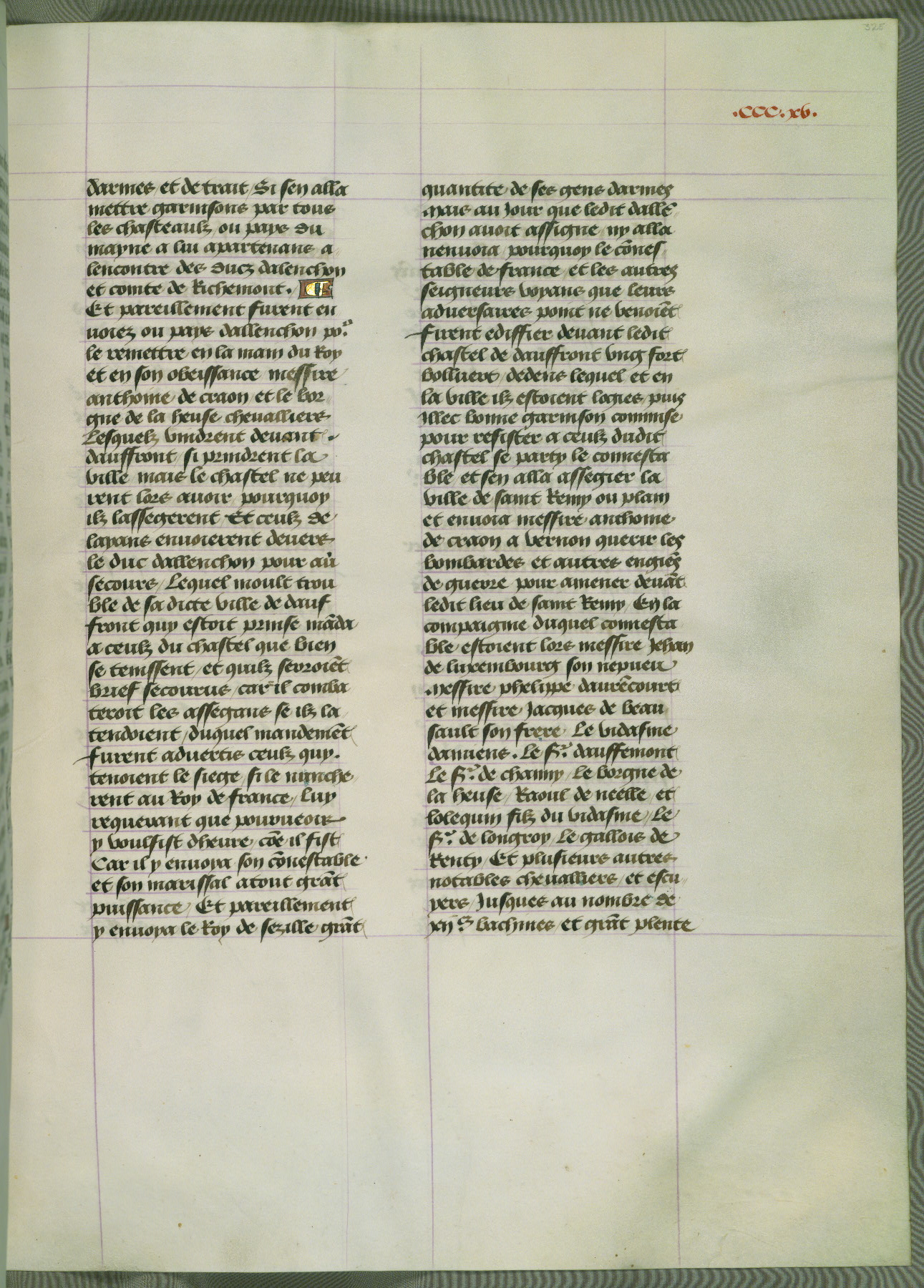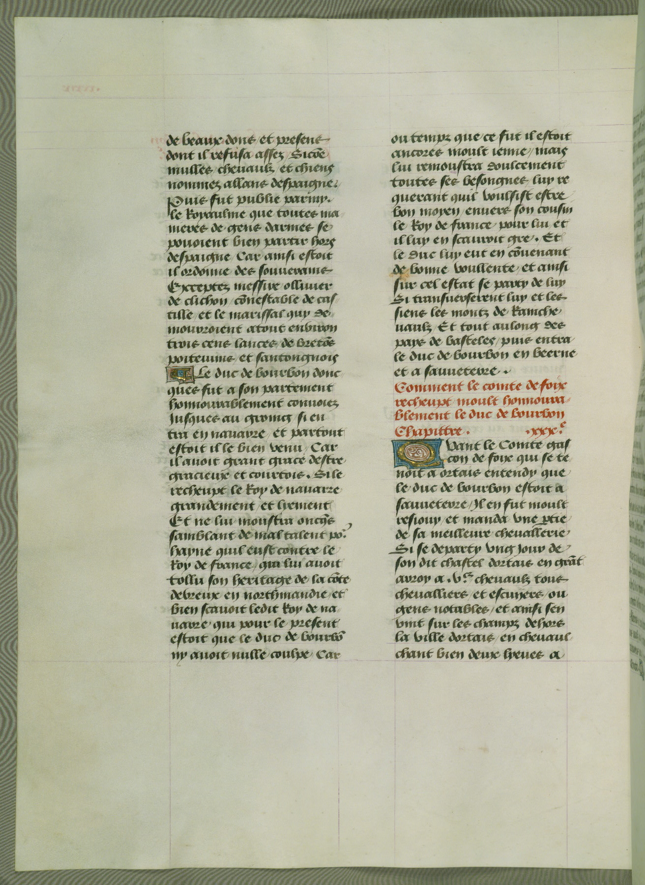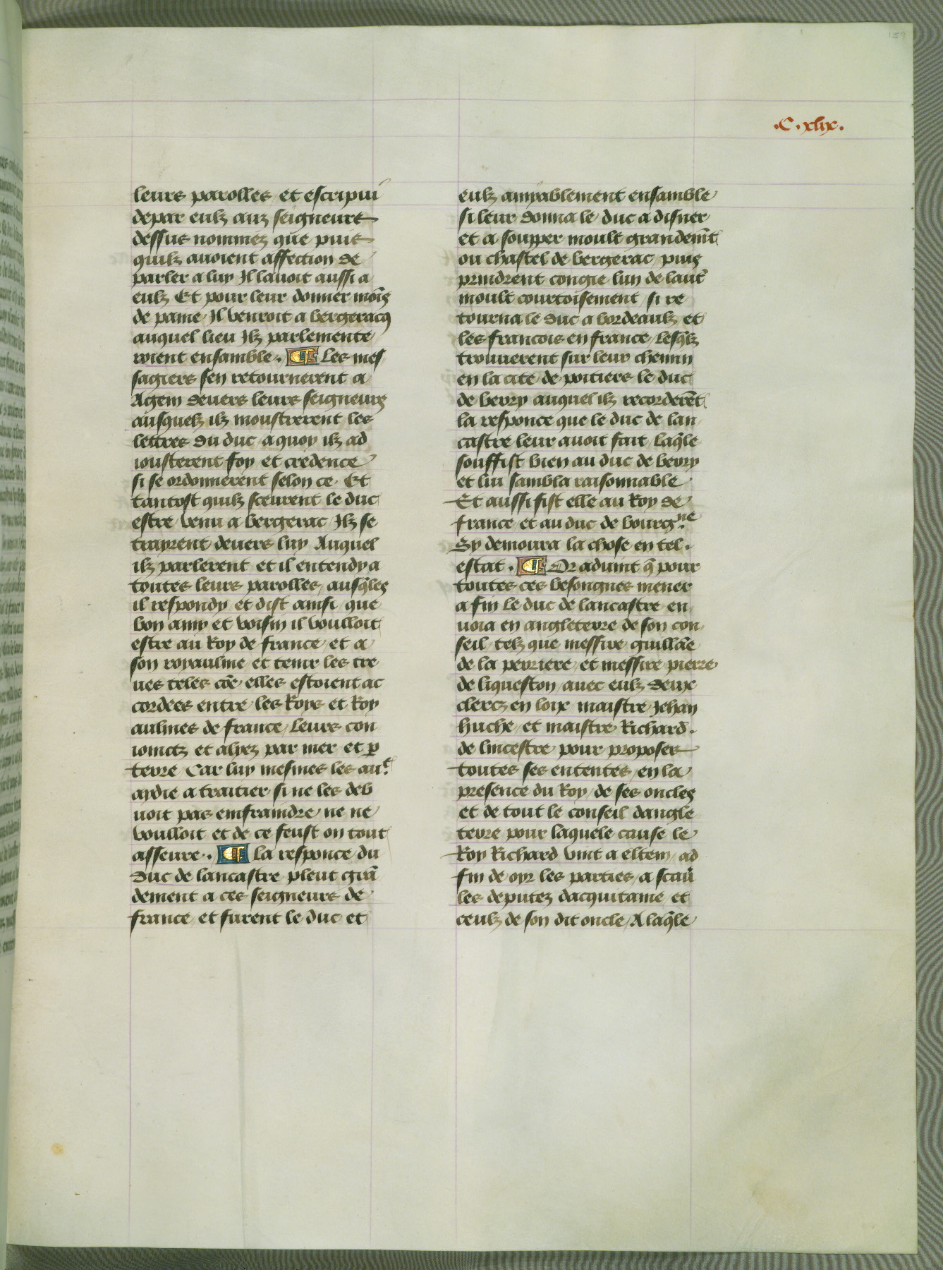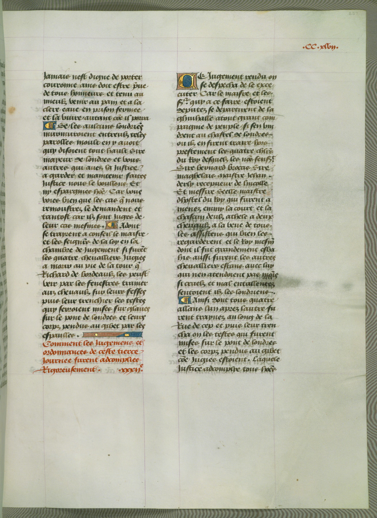 This manuscript is volume IV in a set of five from the collection "Recueil des chroniques et anchiennes istories de la Grant Bretaigne," written by Phillip the Good's counselor and chamberlain Jean de Wavrin. It chronicles the history of England from the early years of the reign of Richard II in 1377 to the demise of Henry IV, his successor, between 1400 and 1413. This volume, produced in Flanders between 1470 and 1480, was part of a set of which volumes II, III and V were recorded in the inventory of the library of William III of Orange in 1686, and was later rebound during the seventeenth or eighteenth century. Six three-quarter-page miniatures open the text of each book and depict events documented therein (with the exception of that of Book 1, portraying Richard II's coronation, which occurs prior to the period detailed in that book). The manuscript's margins are wide and relatively pristine throughout the textblock, but show significant signs of use on illuminated folios, indicating that this manuscript was primarily used for display and not as a historical text. Although few volumes of the Chroniques remain, this manuscript is particularly rare in that it is one of the two surviving exemplars of the text of volume IV, the other being part of the complete set in the Bibliothèque nationale de France (BN fr. 74-85). Volumes II, III, and V of the set to which this volume originally belonged are now in the collection of the Koninklijke Bibliotheek (Den Haag, KB : 133 A 7).