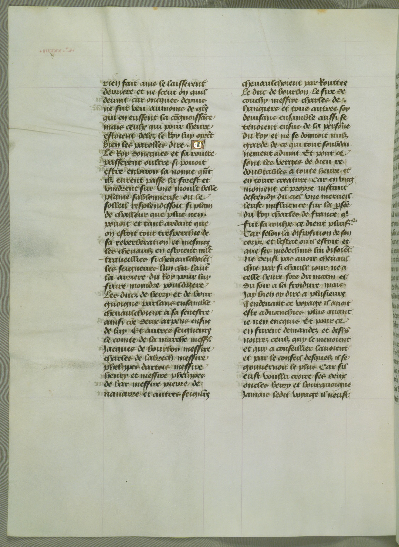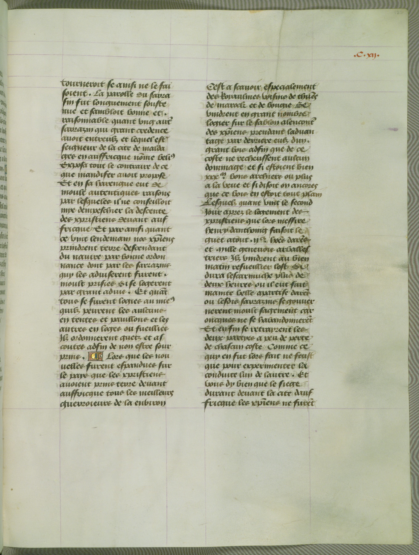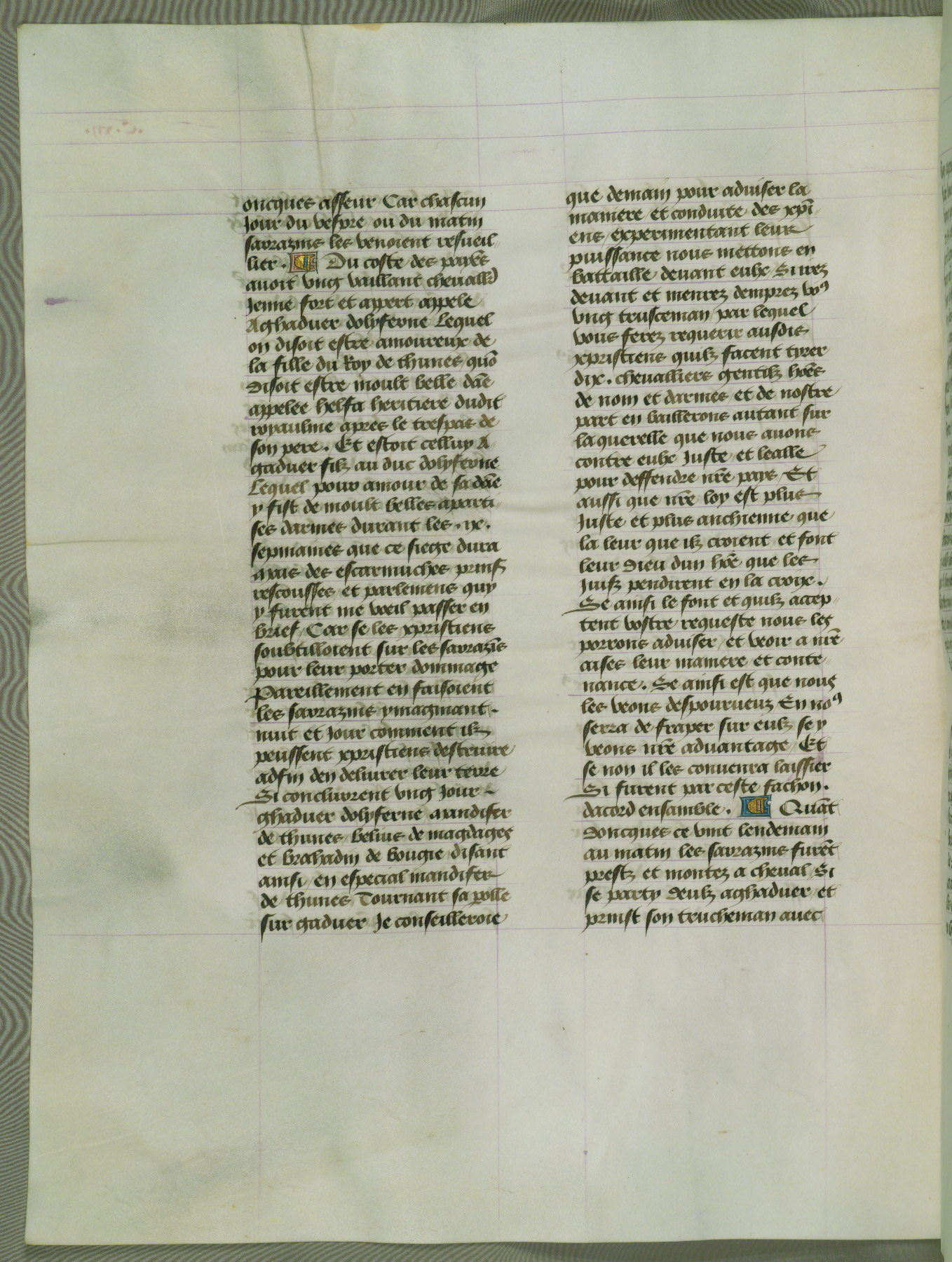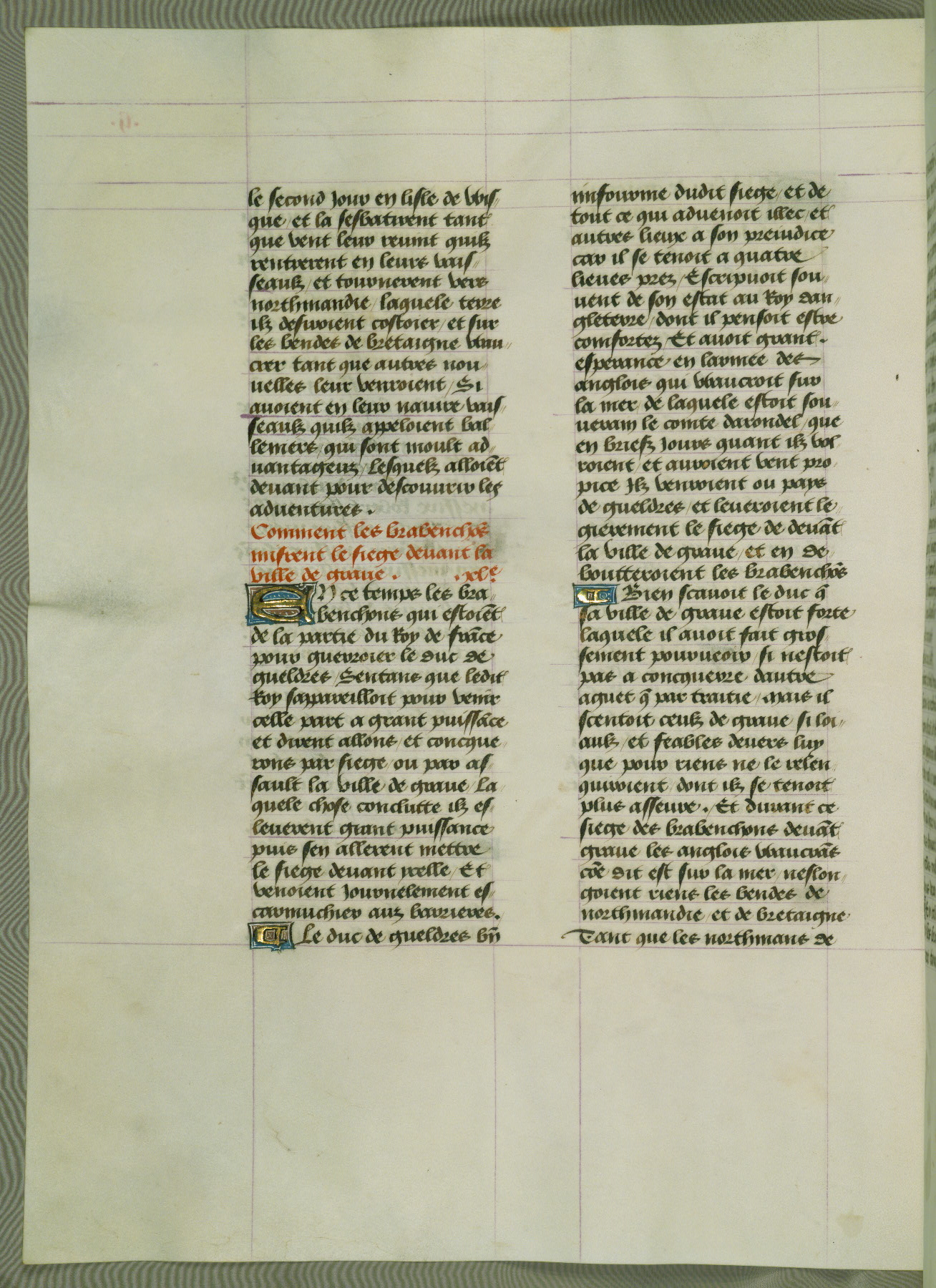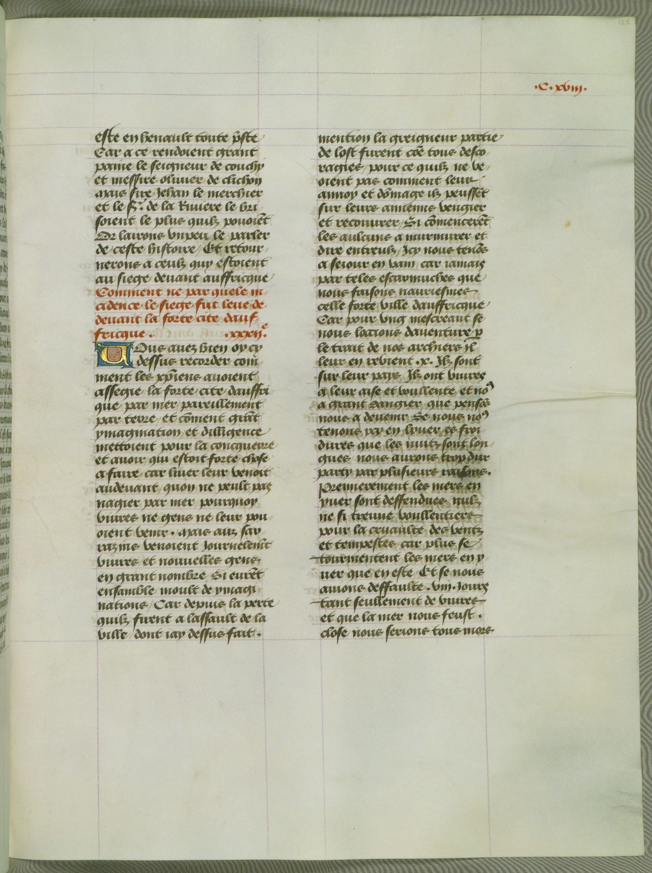 This manuscript is volume IV in a set of five from the collection "Recueil des chroniques et anchiennes istories de la Grant Bretaigne," written by Phillip the Good's counselor and chamberlain Jean de Wavrin. It chronicles the history of England from the early years of the reign of Richard II in 1377 to the demise of Henry IV, his successor, between 1400 and 1413. This volume, produced in Flanders between 1470 and 1480, was part of a set of which volumes II, III and V were recorded in the inventory of the library of William III of Orange in 1686, and was later rebound during the seventeenth or eighteenth century. Six three-quarter-page miniatures open the text of each book and depict events documented therein (with the exception of that of Book 1, portraying Richard II's coronation, which occurs prior to the period detailed in that book). The manuscript's margins are wide and relatively pristine throughout the textblock, but show significant signs of use on illuminated folios, indicating that this manuscript was primarily used for display and not as a historical text. Although few volumes of the Chroniques remain, this manuscript is particularly rare in that it is one of the two surviving exemplars of the text of volume IV, the other being part of the complete set in the Bibliothèque nationale de France (BN fr. 74-85). Volumes II, III, and V of the set to which this volume originally belonged are now in the collection of the Koninklijke Bibliotheek (Den Haag, KB : 133 A 7).