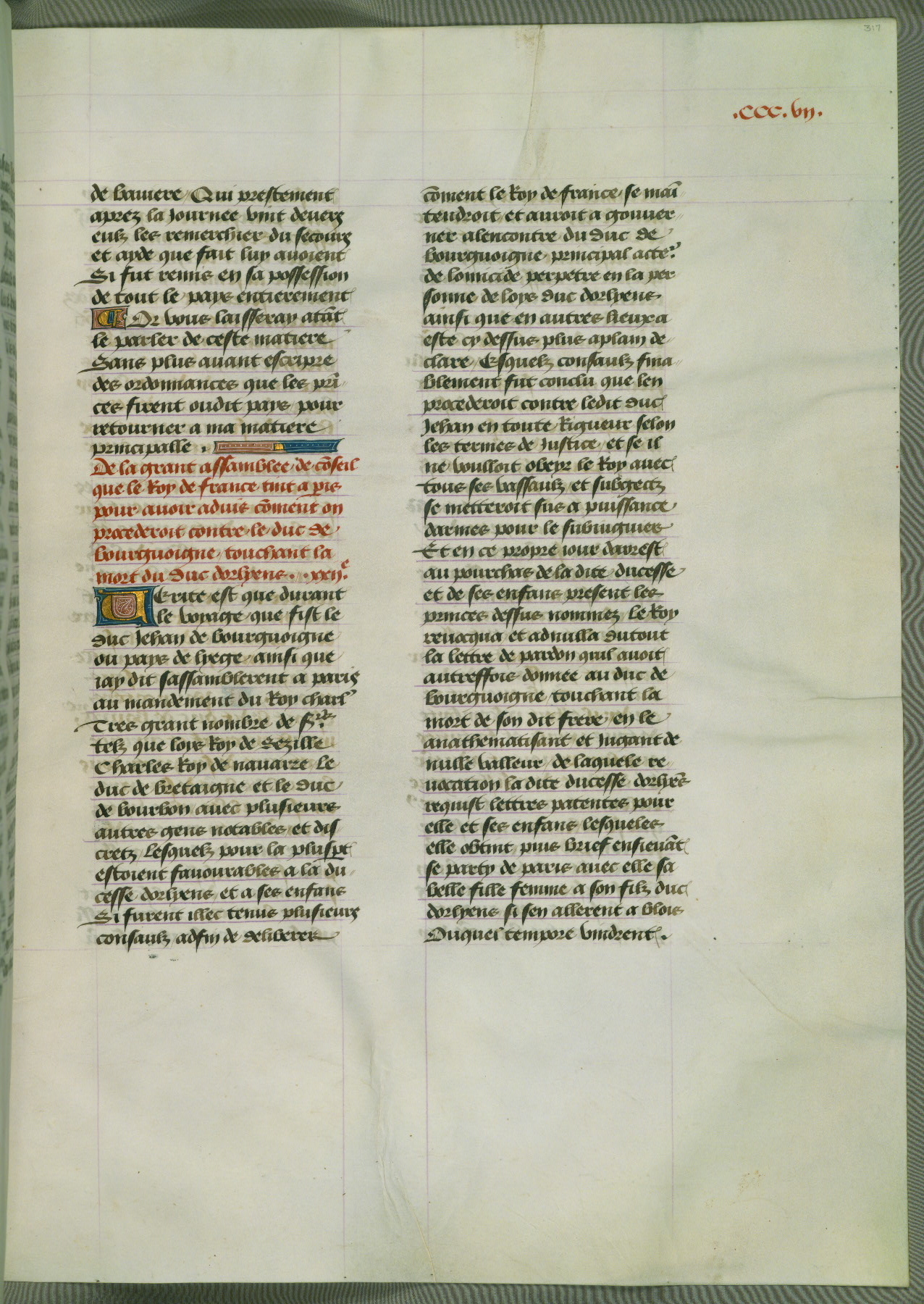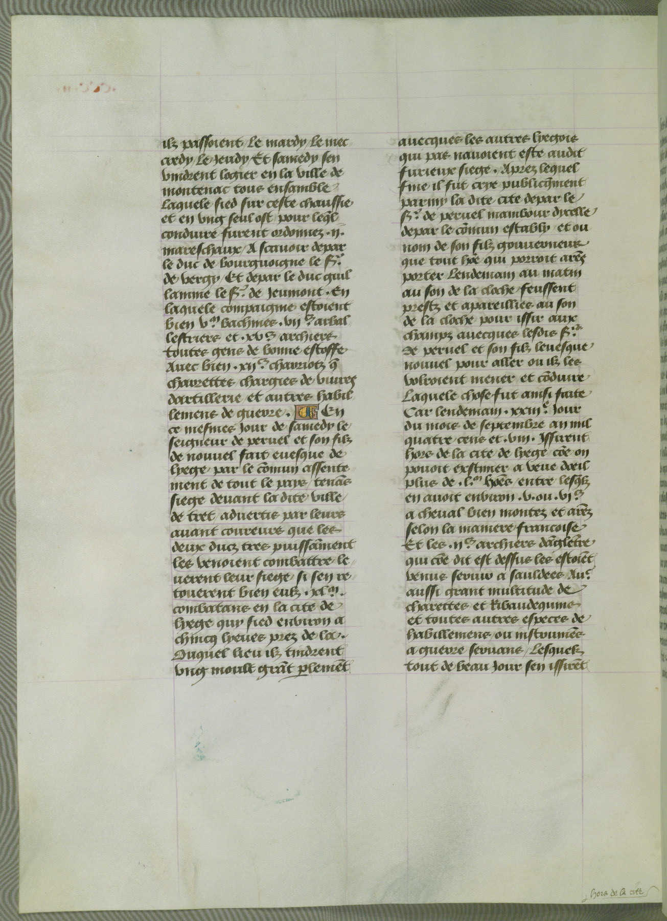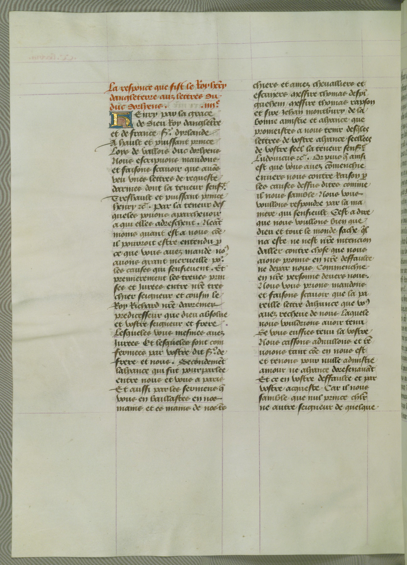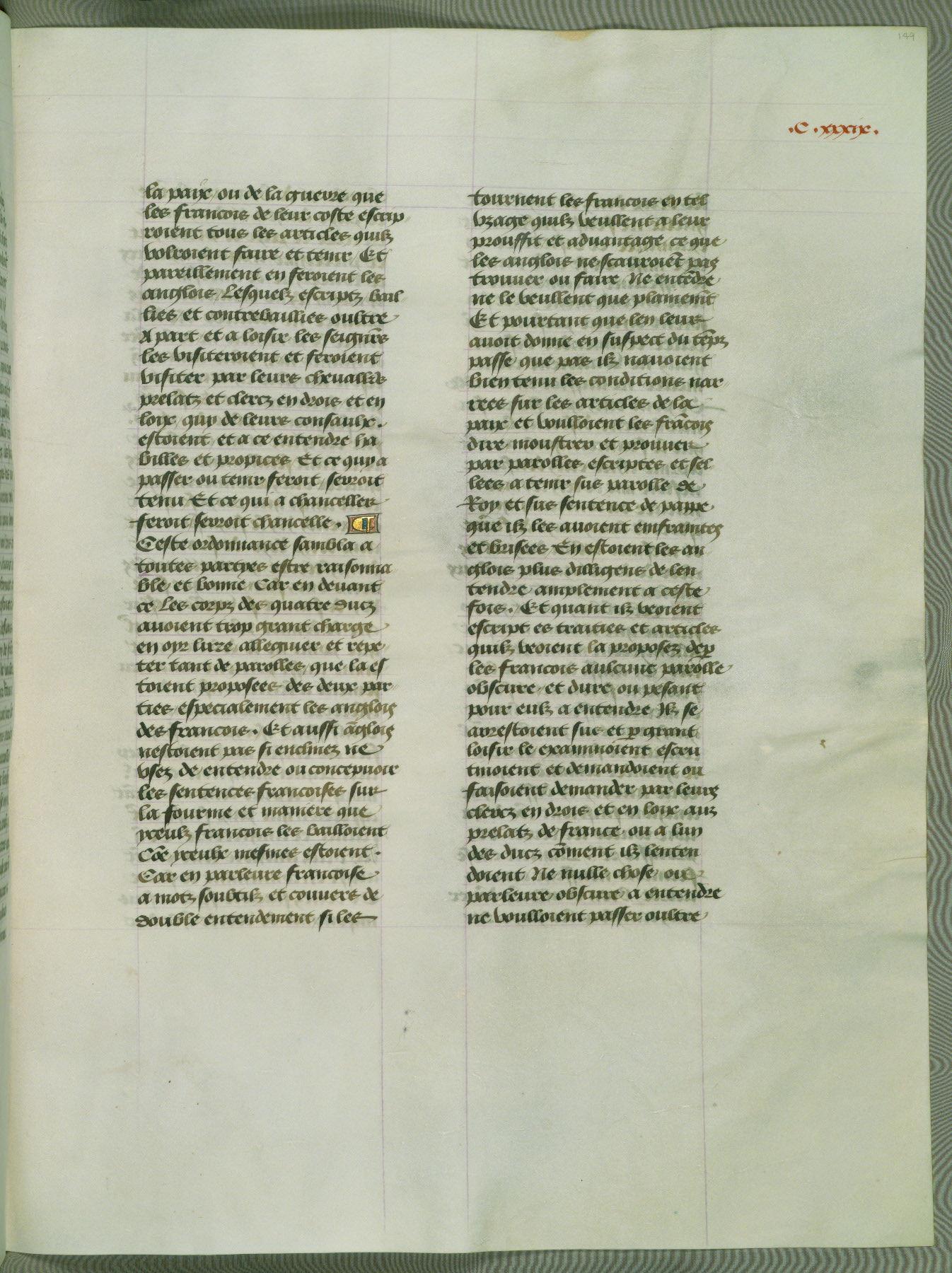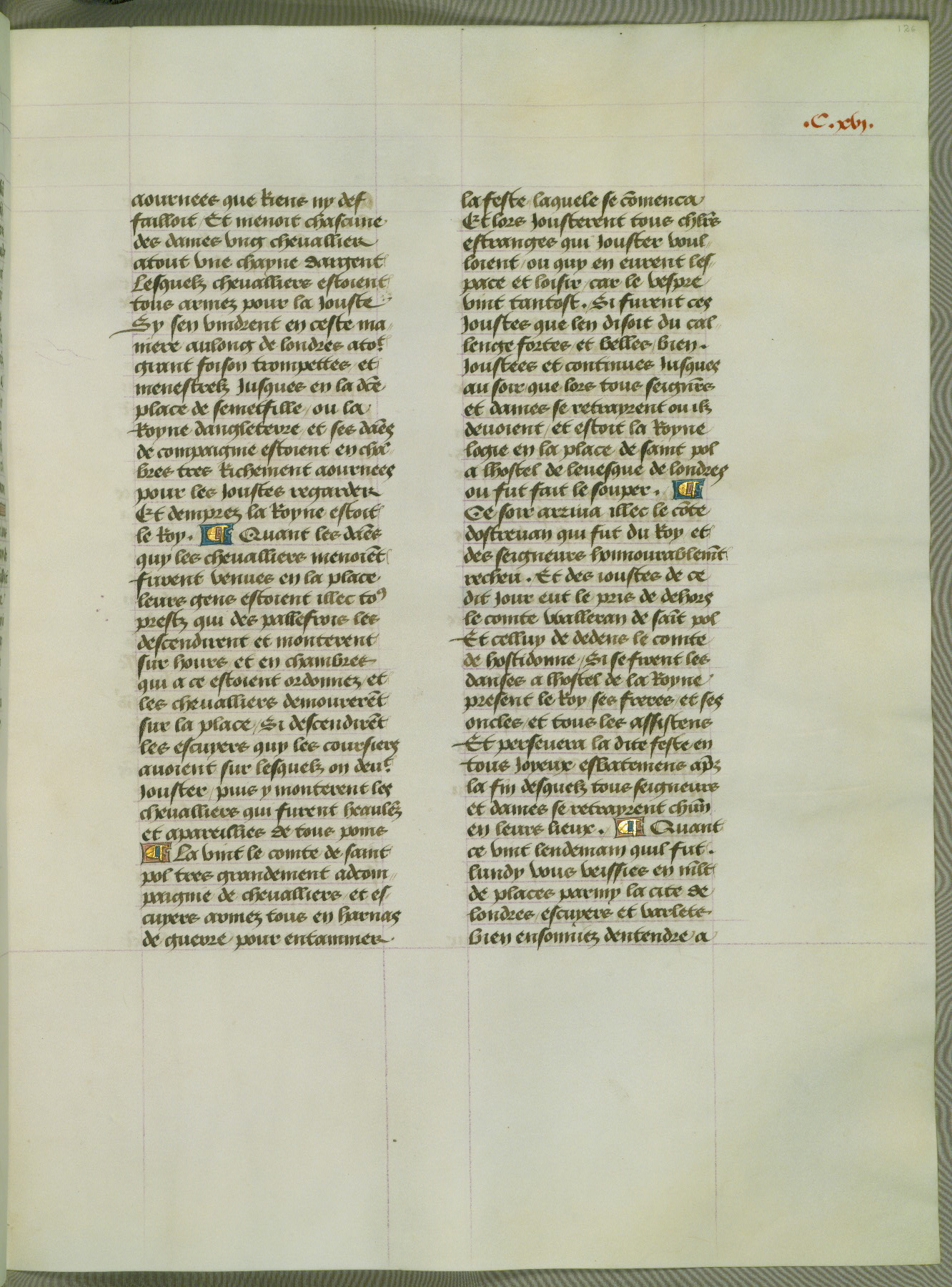 This manuscript is volume IV in a set of five from the collection "Recueil des chroniques et anchiennes istories de la Grant Bretaigne," written by Phillip the Good's counselor and chamberlain Jean de Wavrin. It chronicles the history of England from the early years of the reign of Richard II in 1377 to the demise of Henry IV, his successor, between 1400 and 1413. This volume, produced in Flanders between 1470 and 1480, was part of a set of which volumes II, III and V were recorded in the inventory of the library of William III of Orange in 1686, and was later rebound during the seventeenth or eighteenth century. Six three-quarter-page miniatures open the text of each book and depict events documented therein (with the exception of that of Book 1, portraying Richard II's coronation, which occurs prior to the period detailed in that book). The manuscript's margins are wide and relatively pristine throughout the textblock, but show significant signs of use on illuminated folios, indicating that this manuscript was primarily used for display and not as a historical text. Although few volumes of the Chroniques remain, this manuscript is particularly rare in that it is one of the two surviving exemplars of the text of volume IV, the other being part of the complete set in the Bibliothèque nationale de France (BN fr. 74-85). Volumes II, III, and V of the set to which this volume originally belonged are now in the collection of the Koninklijke Bibliotheek (Den Haag, KB : 133 A 7).