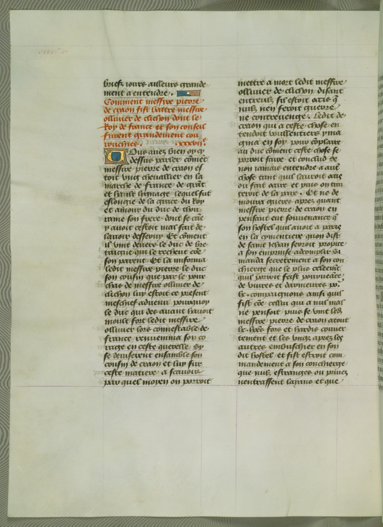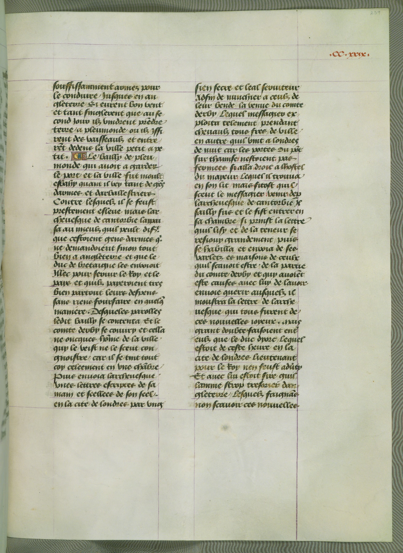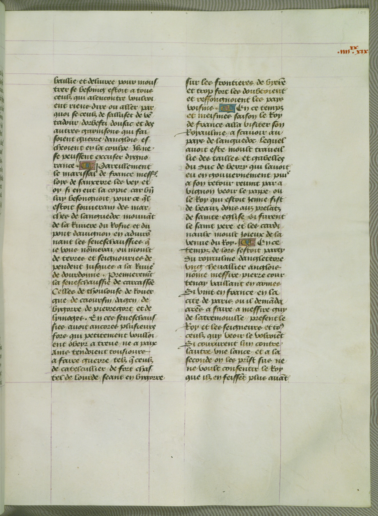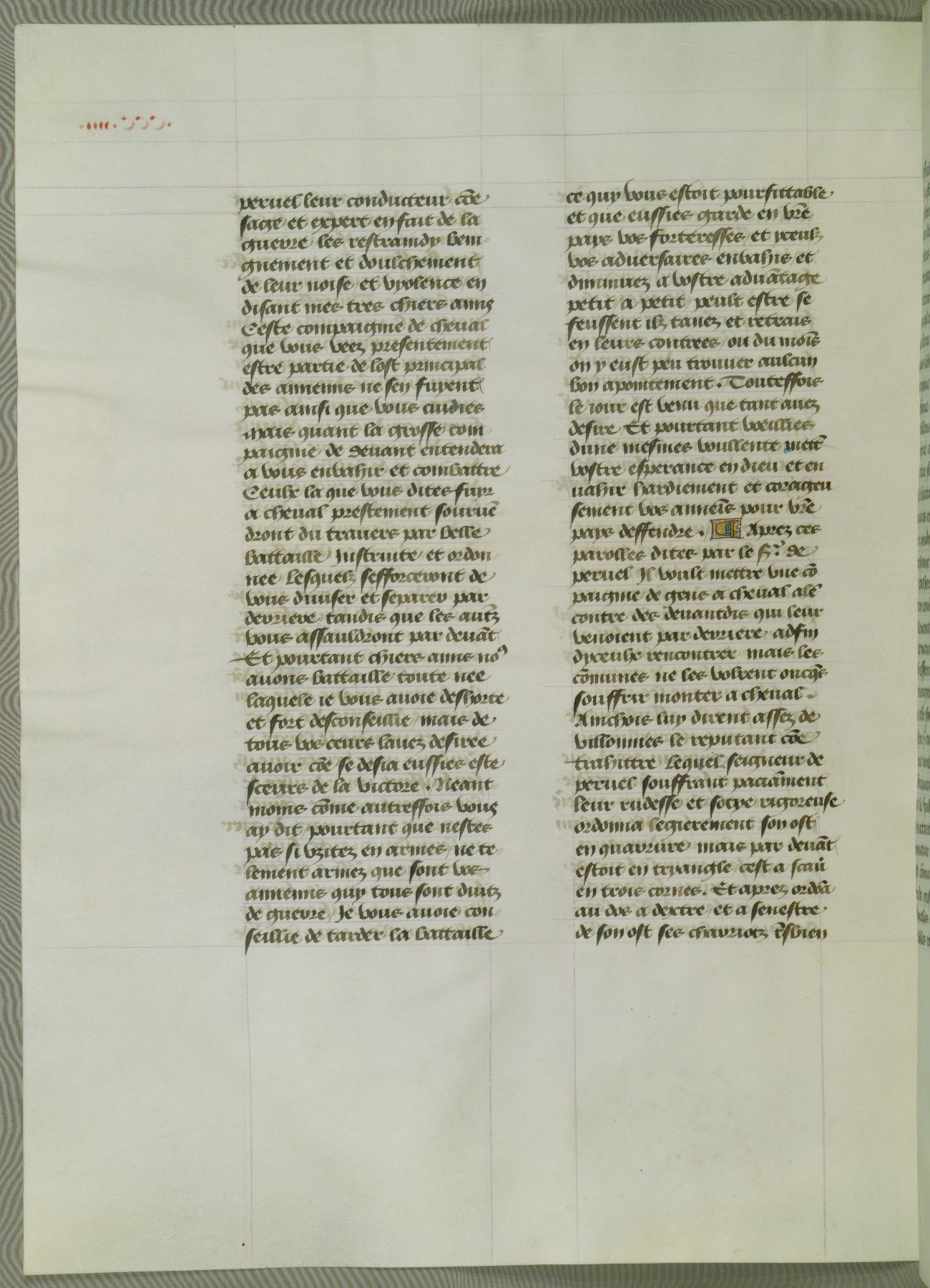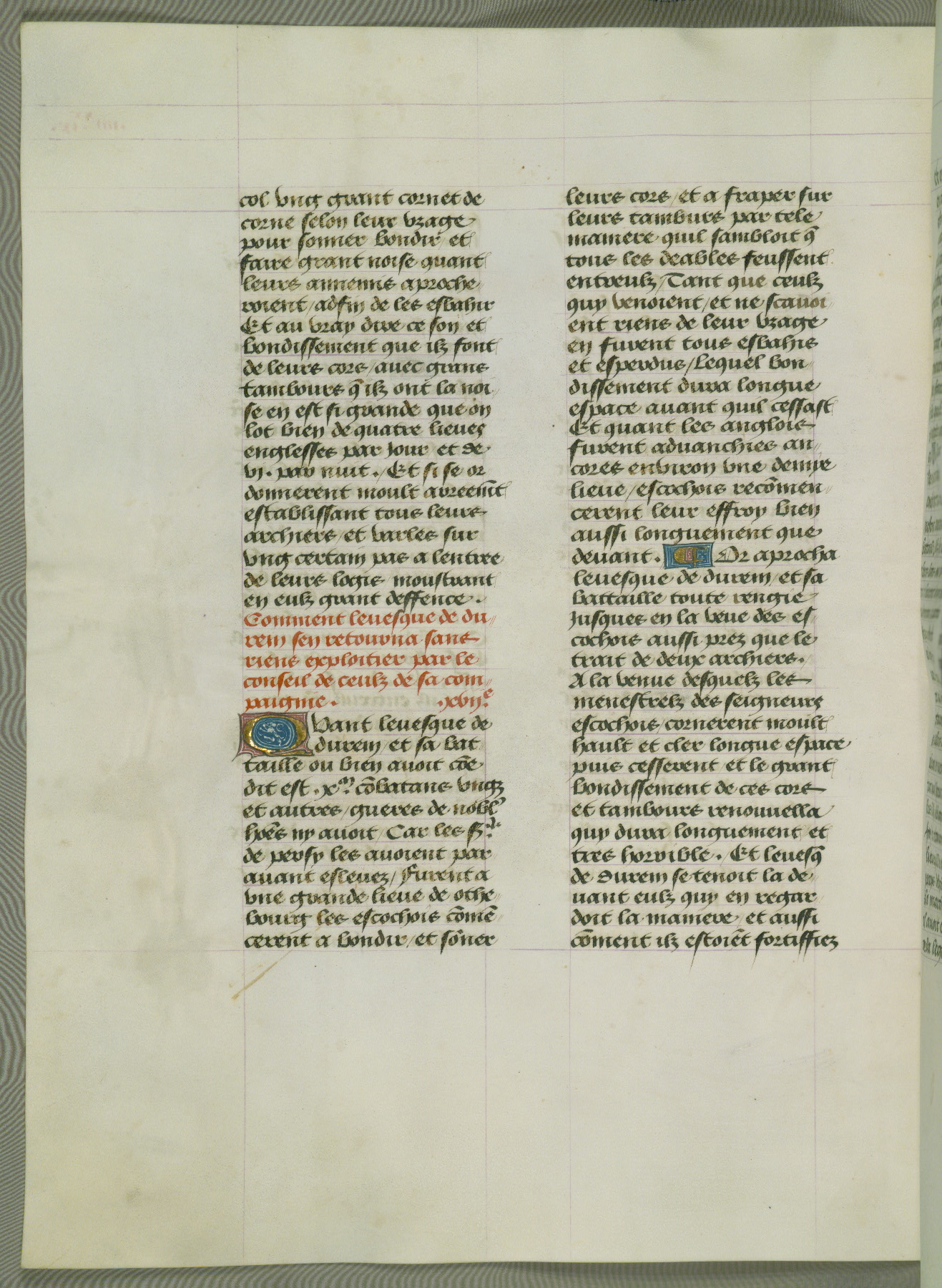 This manuscript is volume IV in a set of five from the collection "Recueil des chroniques et anchiennes istories de la Grant Bretaigne," written by Phillip the Good's counselor and chamberlain Jean de Wavrin. It chronicles the history of England from the early years of the reign of Richard II in 1377 to the demise of Henry IV, his successor, between 1400 and 1413. This volume, produced in Flanders between 1470 and 1480, was part of a set of which volumes II, III and V were recorded in the inventory of the library of William III of Orange in 1686, and was later rebound during the seventeenth or eighteenth century. Six three-quarter-page miniatures open the text of each book and depict events documented therein (with the exception of that of Book 1, portraying Richard II's coronation, which occurs prior to the period detailed in that book). The manuscript's margins are wide and relatively pristine throughout the textblock, but show significant signs of use on illuminated folios, indicating that this manuscript was primarily used for display and not as a historical text. Although few volumes of the Chroniques remain, this manuscript is particularly rare in that it is one of the two surviving exemplars of the text of volume IV, the other being part of the complete set in the Bibliothèque nationale de France (BN fr. 74-85). Volumes II, III, and V of the set to which this volume originally belonged are now in the collection of the Koninklijke Bibliotheek (Den Haag, KB : 133 A 7).