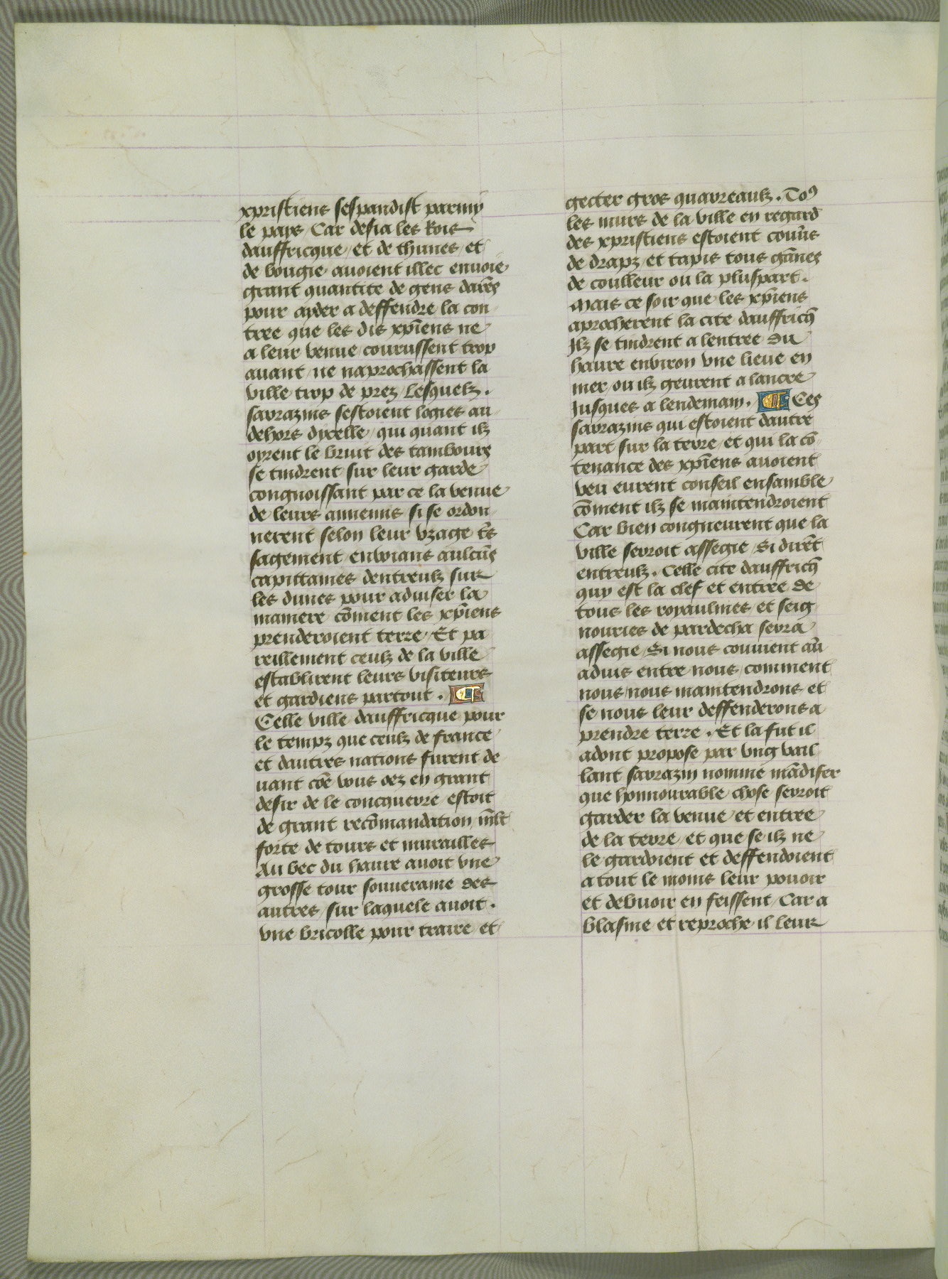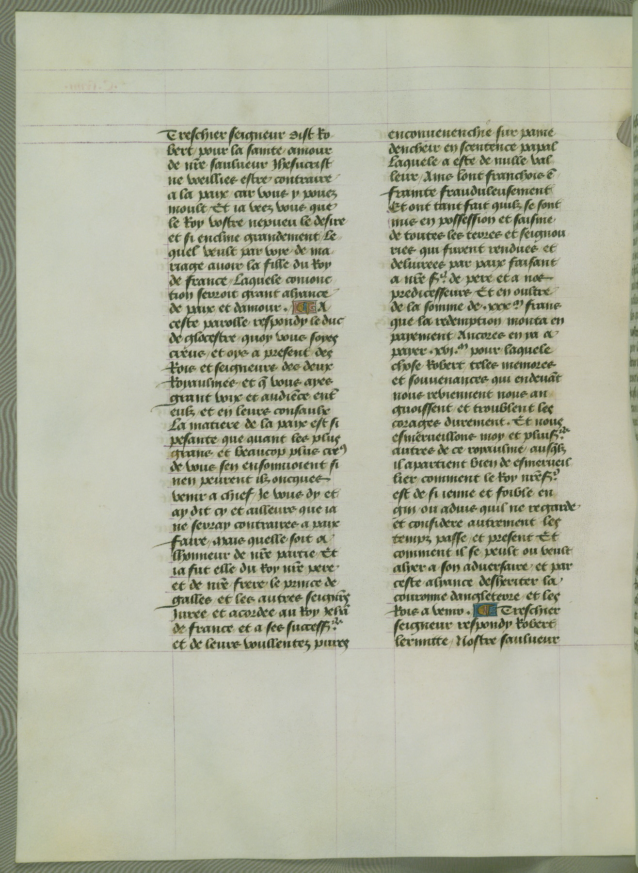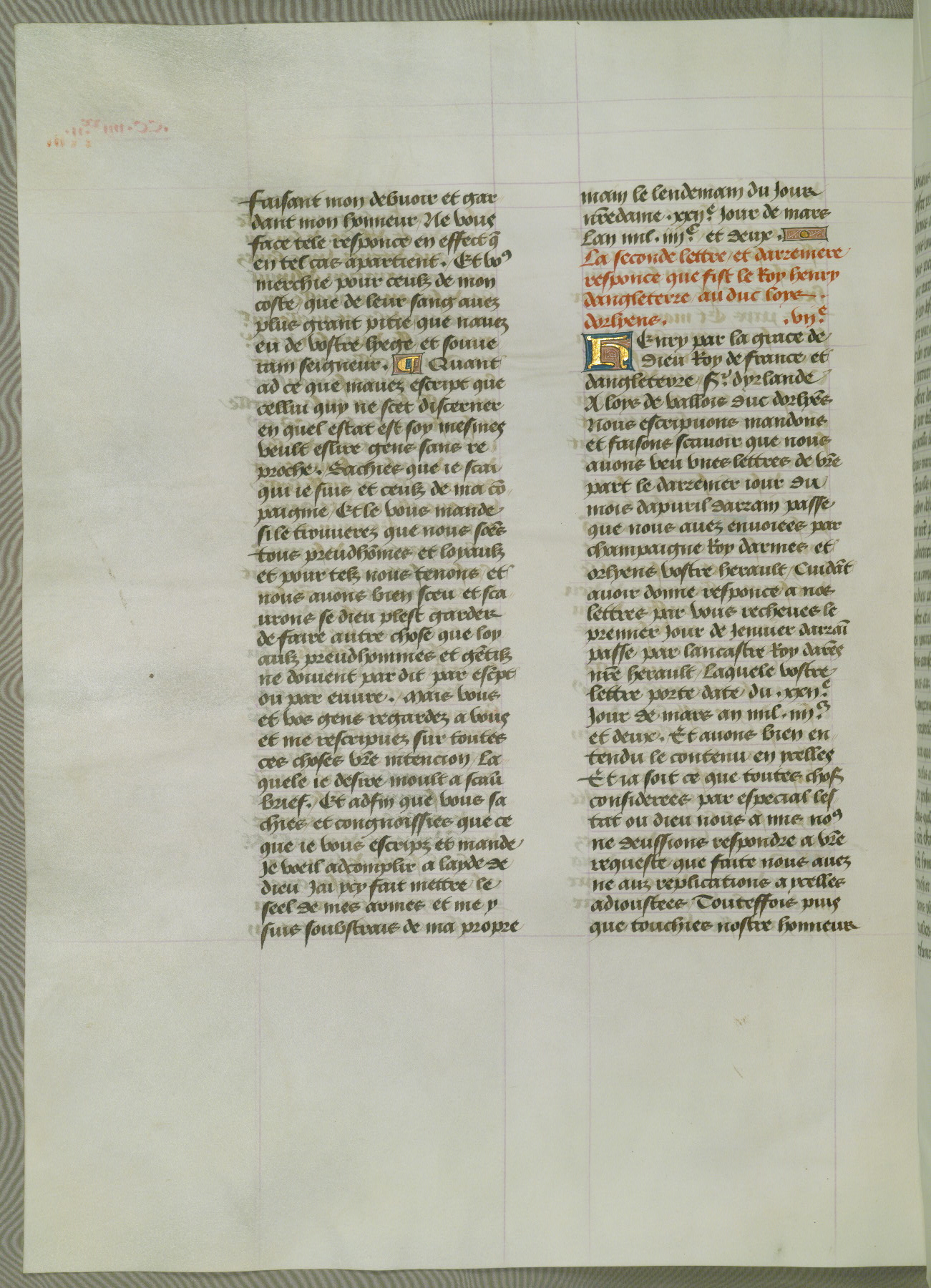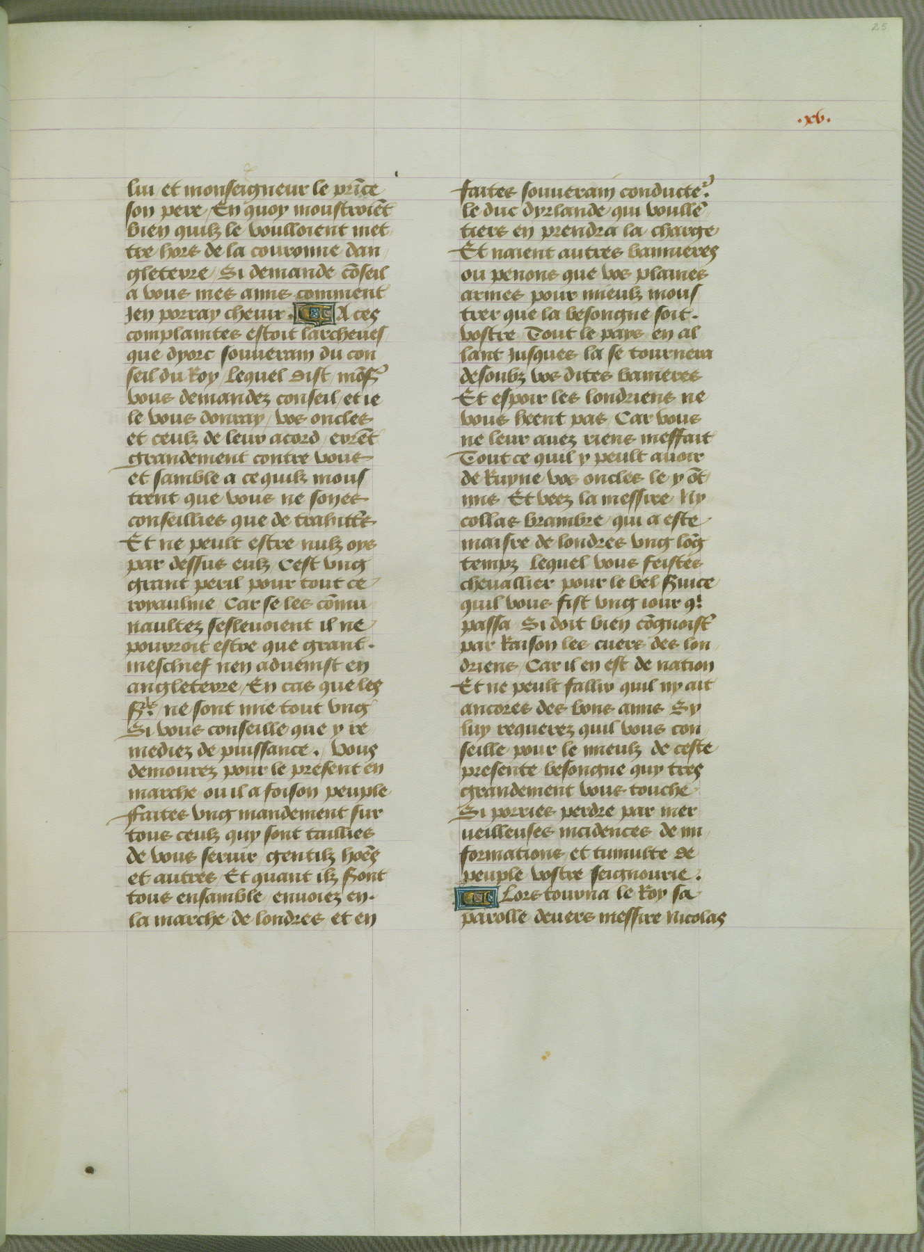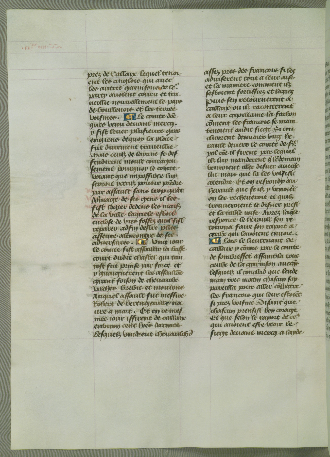 This manuscript is volume IV in a set of five from the collection "Recueil des chroniques et anchiennes istories de la Grant Bretaigne," written by Phillip the Good's counselor and chamberlain Jean de Wavrin. It chronicles the history of England from the early years of the reign of Richard II in 1377 to the demise of Henry IV, his successor, between 1400 and 1413. This volume, produced in Flanders between 1470 and 1480, was part of a set of which volumes II, III and V were recorded in the inventory of the library of William III of Orange in 1686, and was later rebound during the seventeenth or eighteenth century. Six three-quarter-page miniatures open the text of each book and depict events documented therein (with the exception of that of Book 1, portraying Richard II's coronation, which occurs prior to the period detailed in that book). The manuscript's margins are wide and relatively pristine throughout the textblock, but show significant signs of use on illuminated folios, indicating that this manuscript was primarily used for display and not as a historical text. Although few volumes of the Chroniques remain, this manuscript is particularly rare in that it is one of the two surviving exemplars of the text of volume IV, the other being part of the complete set in the Bibliothèque nationale de France (BN fr. 74-85). Volumes II, III, and V of the set to which this volume originally belonged are now in the collection of the Koninklijke Bibliotheek (Den Haag, KB : 133 A 7).