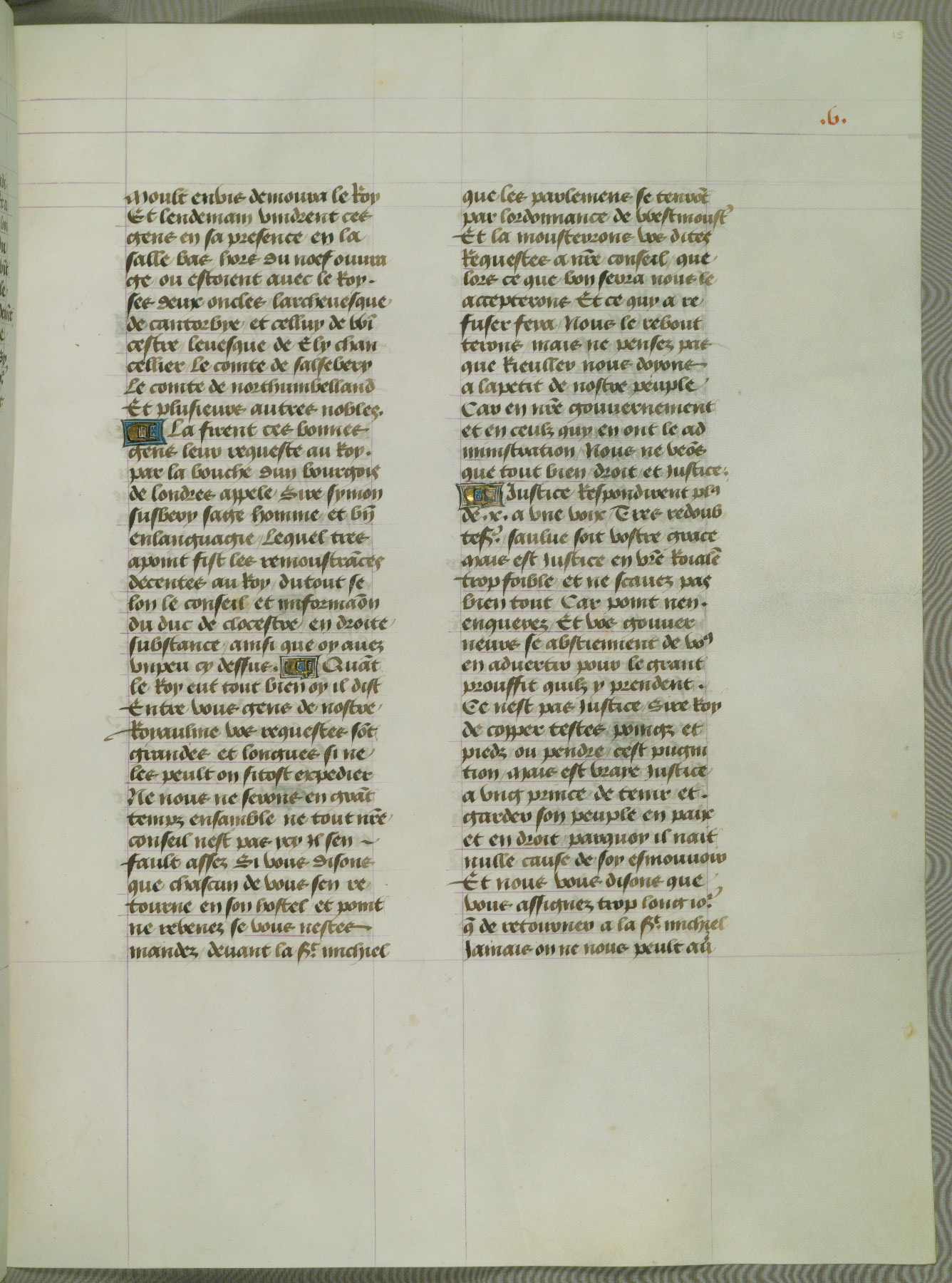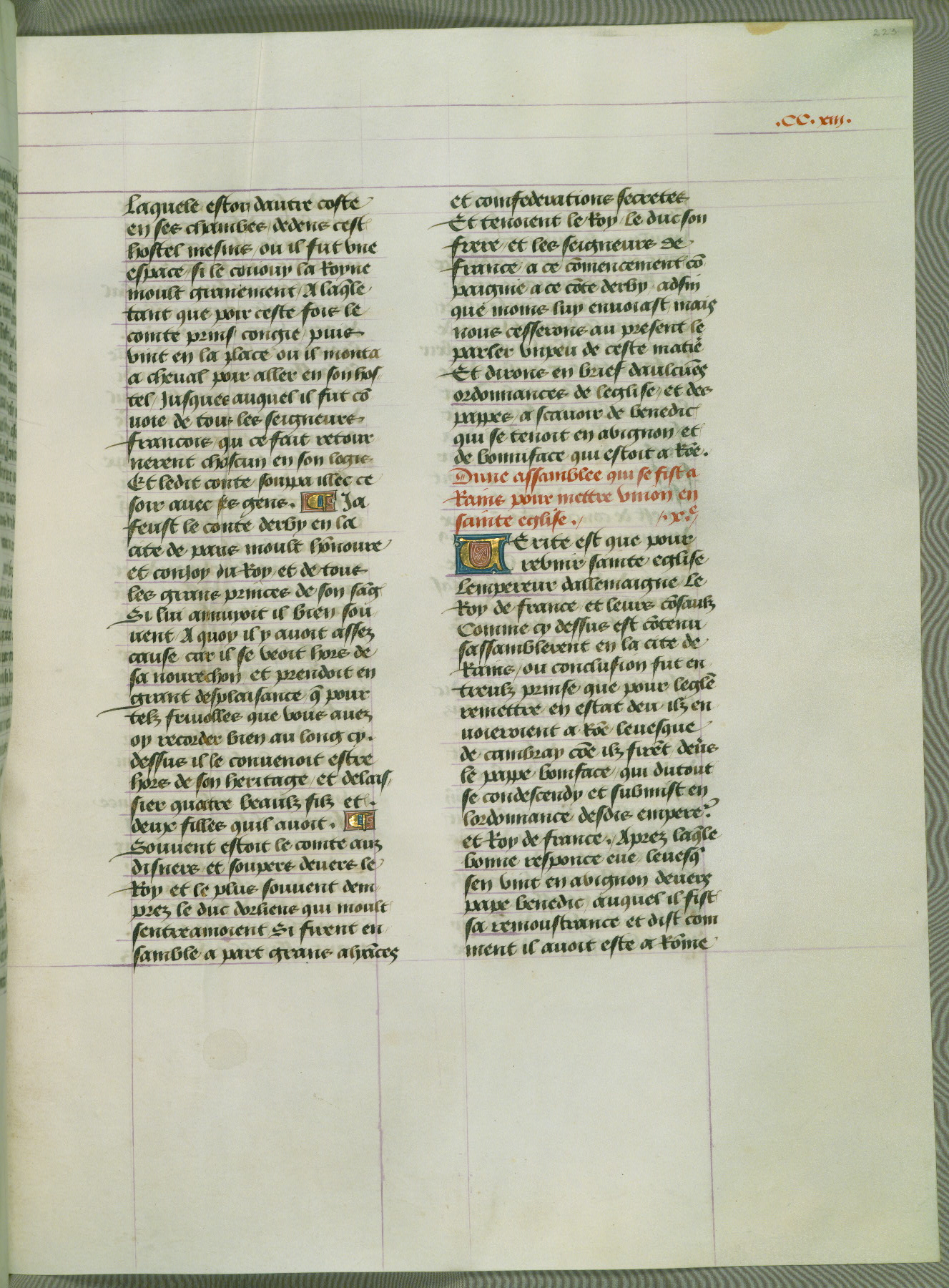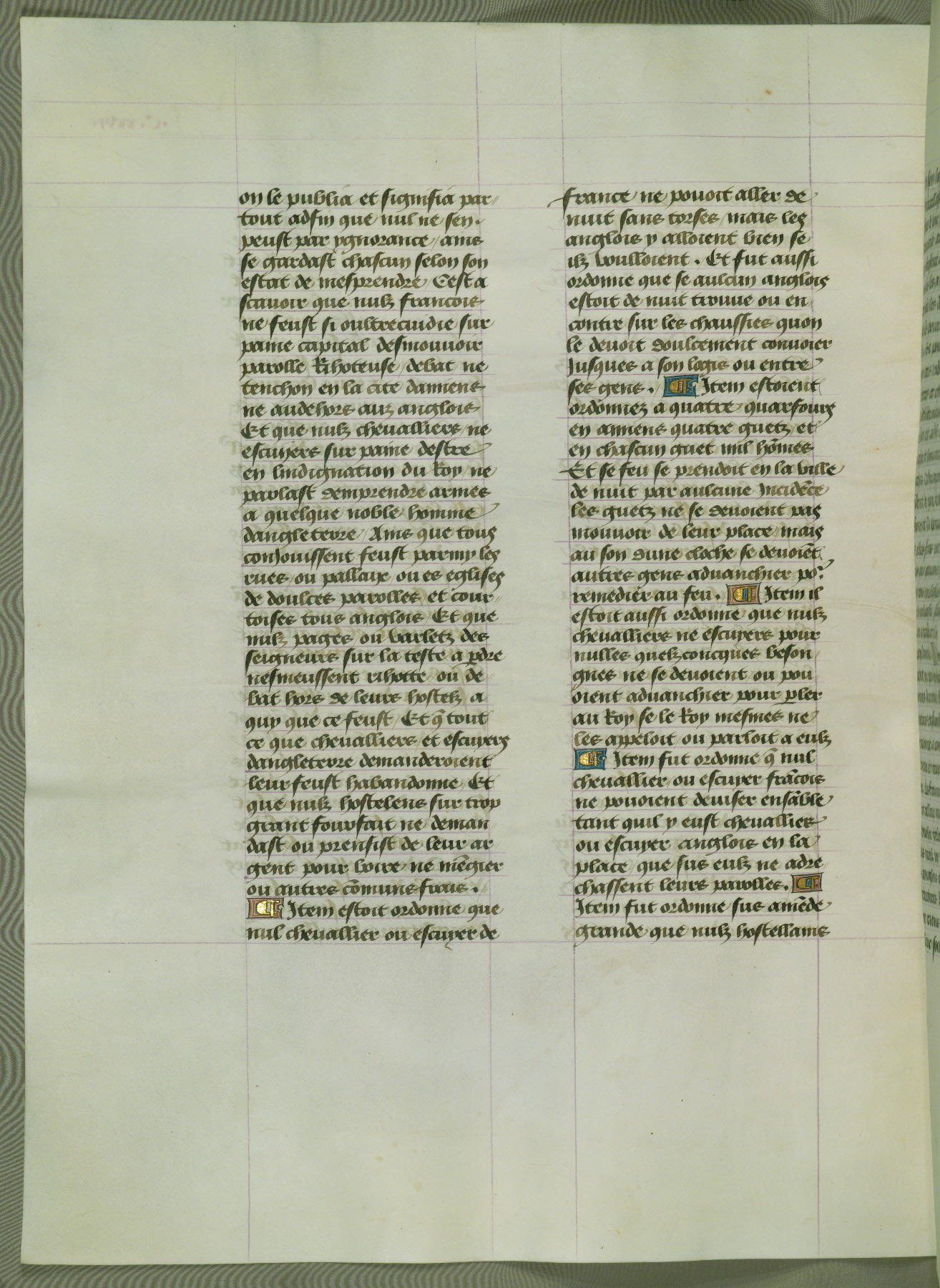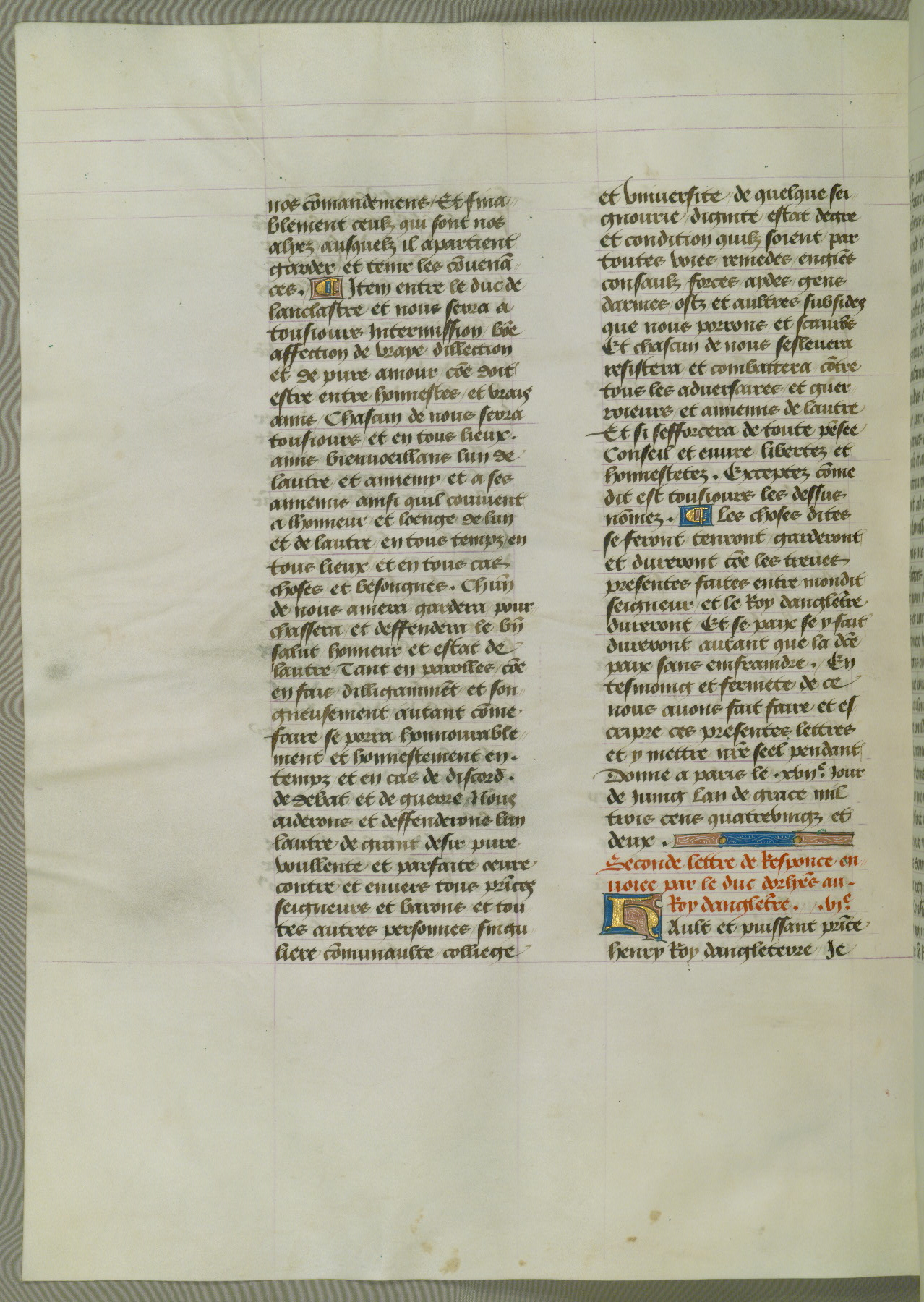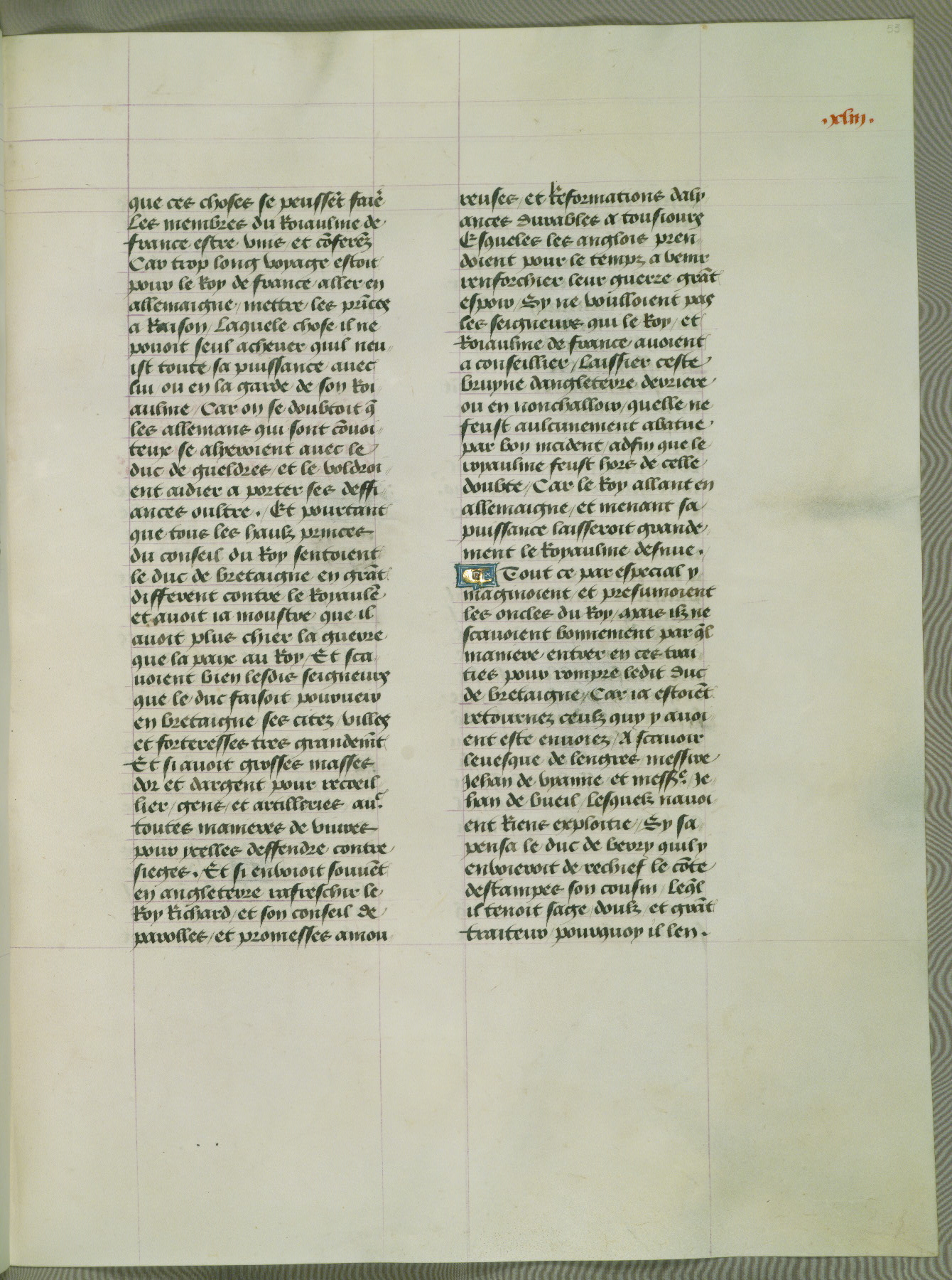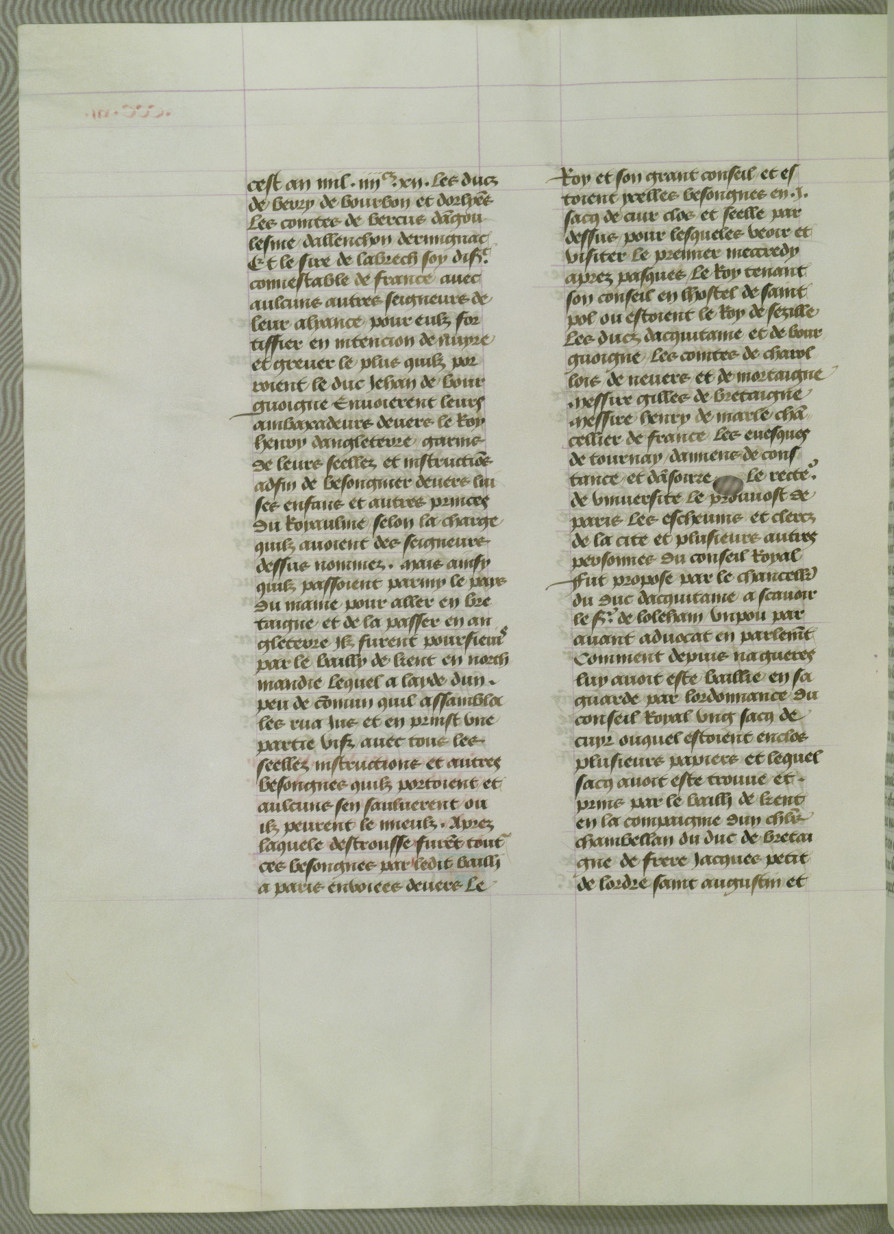 This manuscript is volume IV in a set of five from the collection "Recueil des chroniques et anchiennes istories de la Grant Bretaigne," written by Phillip the Good's counselor and chamberlain Jean de Wavrin. It chronicles the history of England from the early years of the reign of Richard II in 1377 to the demise of Henry IV, his successor, between 1400 and 1413. This volume, produced in Flanders between 1470 and 1480, was part of a set of which volumes II, III and V were recorded in the inventory of the library of William III of Orange in 1686, and was later rebound during the seventeenth or eighteenth century. Six three-quarter-page miniatures open the text of each book and depict events documented therein (with the exception of that of Book 1, portraying Richard II's coronation, which occurs prior to the period detailed in that book). The manuscript's margins are wide and relatively pristine throughout the textblock, but show significant signs of use on illuminated folios, indicating that this manuscript was primarily used for display and not as a historical text. Although few volumes of the Chroniques remain, this manuscript is particularly rare in that it is one of the two surviving exemplars of the text of volume IV, the other being part of the complete set in the Bibliothèque nationale de France (BN fr. 74-85). Volumes II, III, and V of the set to which this volume originally belonged are now in the collection of the Koninklijke Bibliotheek (Den Haag, KB : 133 A 7).