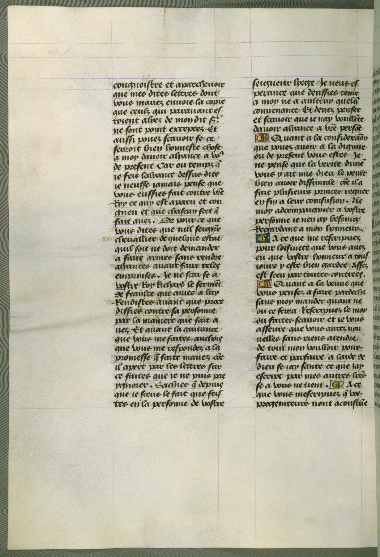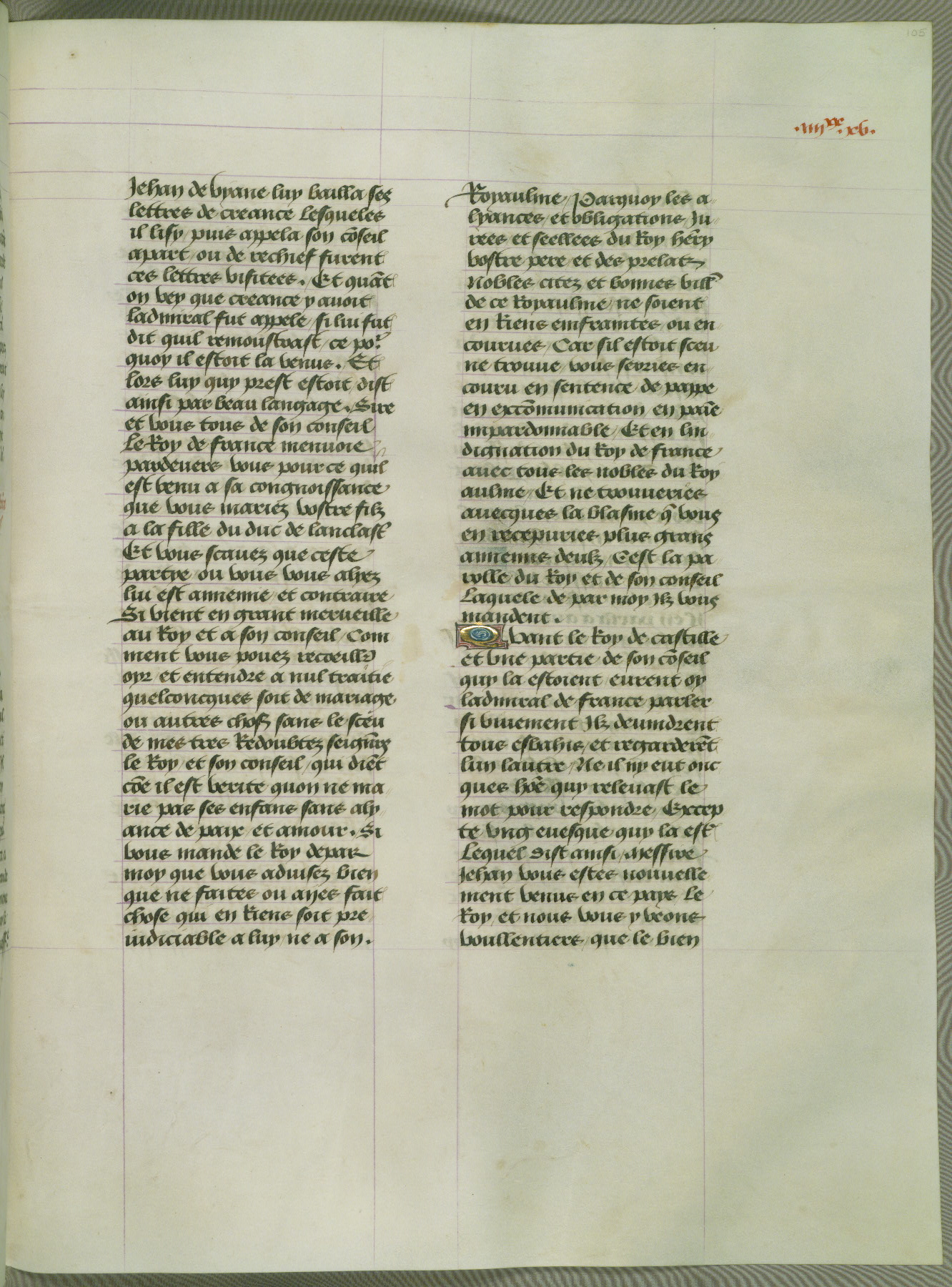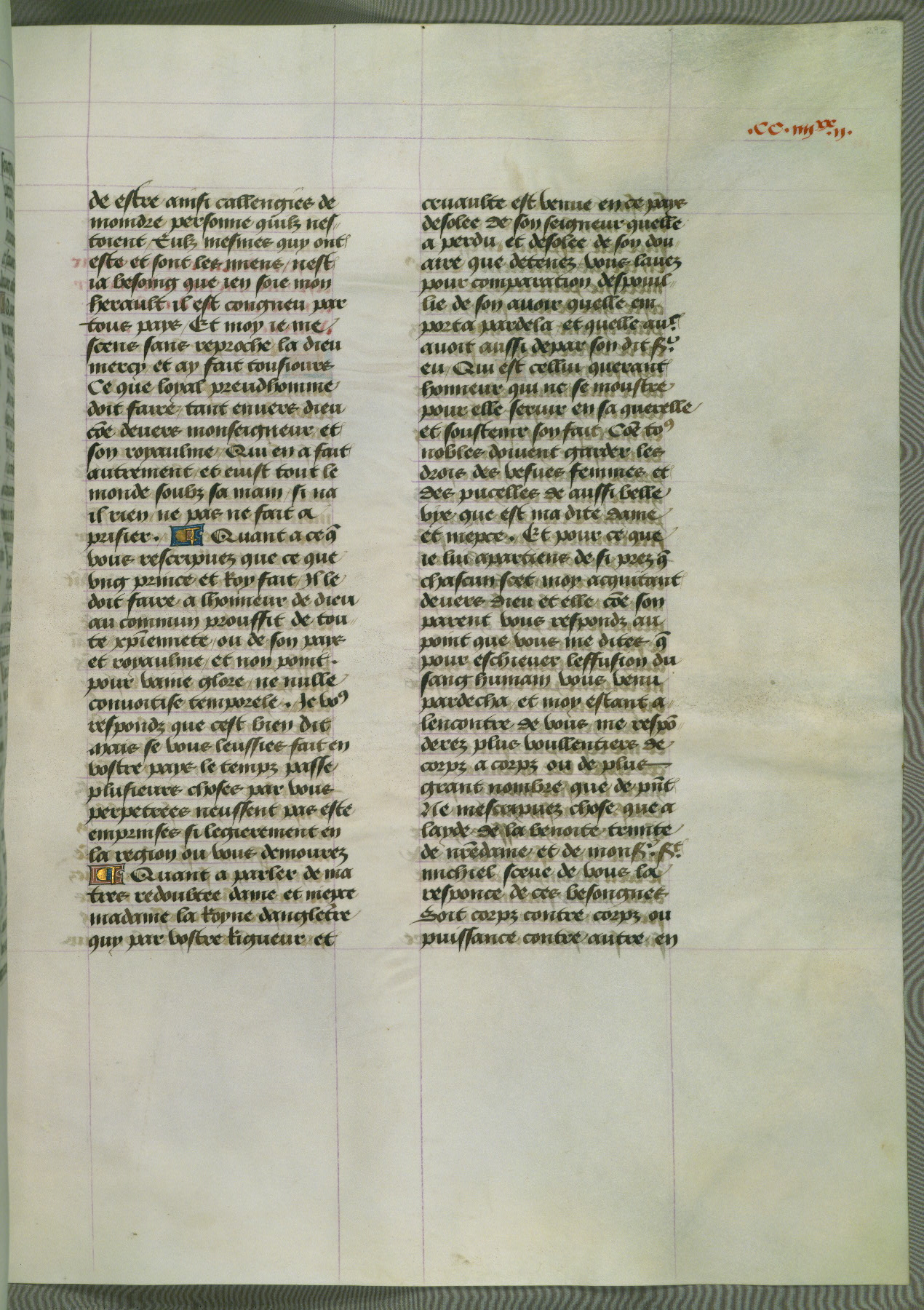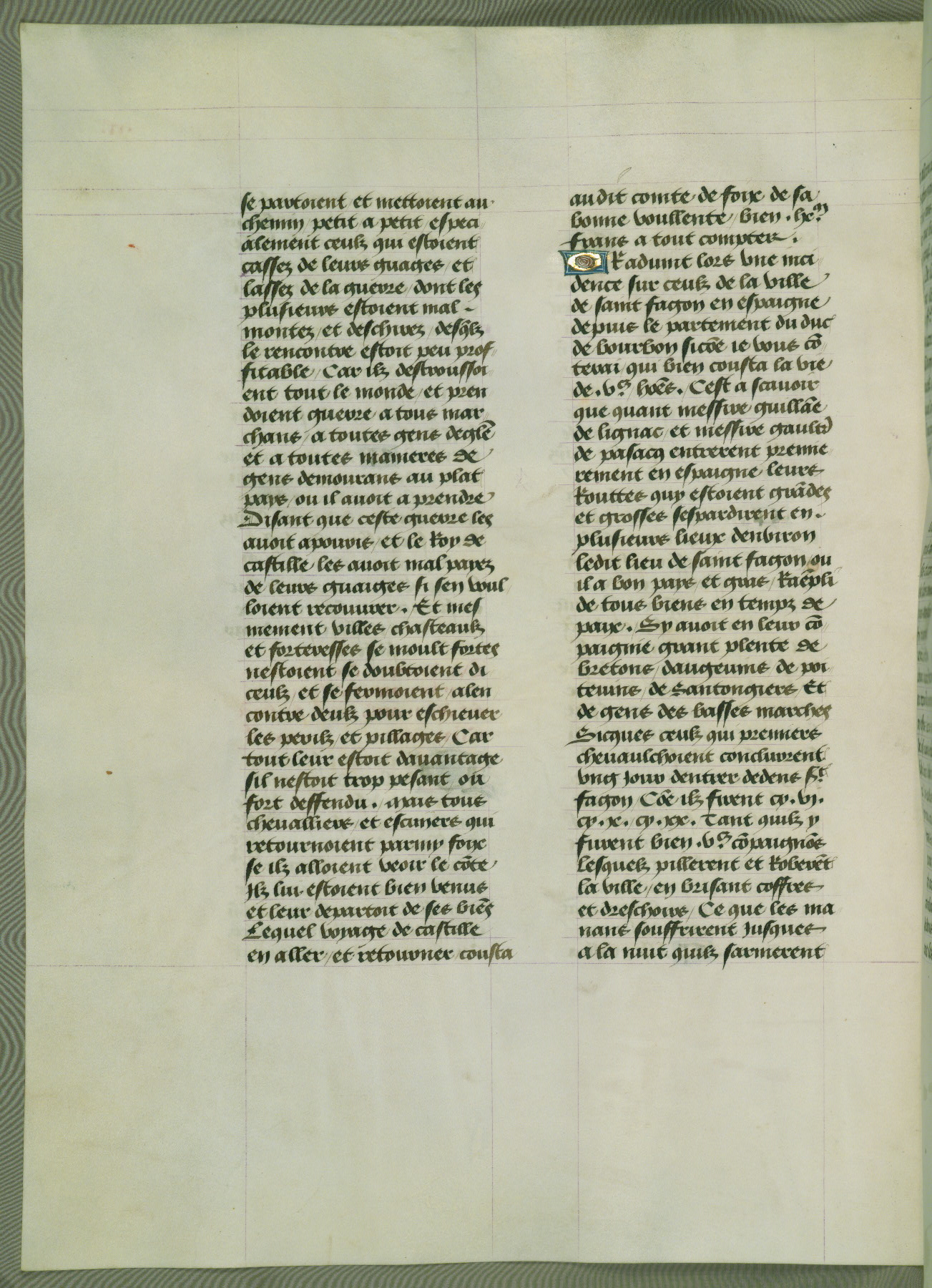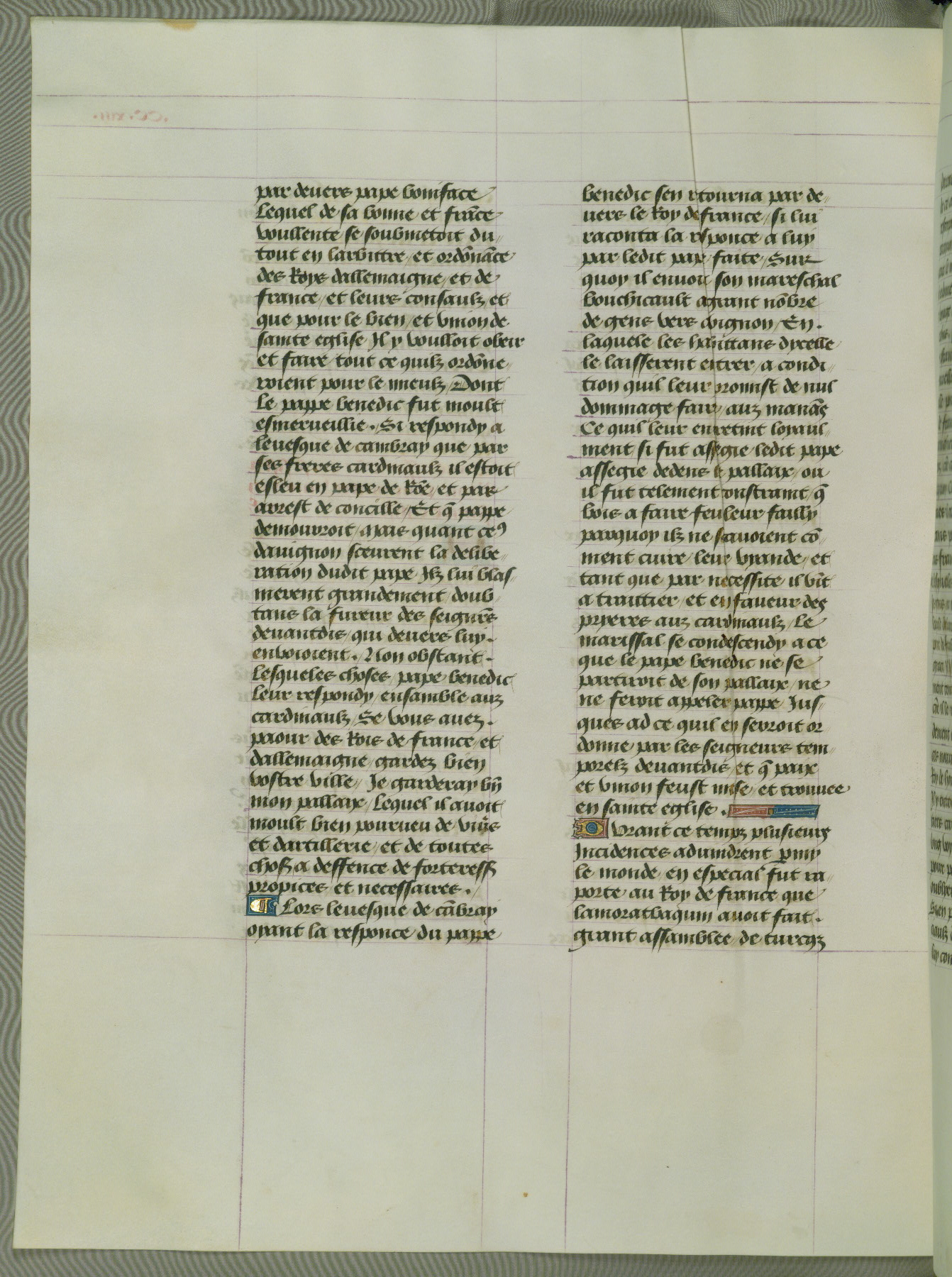 This manuscript is volume IV in a set of five from the collection "Recueil des chroniques et anchiennes istories de la Grant Bretaigne," written by Phillip the Good's counselor and chamberlain Jean de Wavrin. It chronicles the history of England from the early years of the reign of Richard II in 1377 to the demise of Henry IV, his successor, between 1400 and 1413. This volume, produced in Flanders between 1470 and 1480, was part of a set of which volumes II, III and V were recorded in the inventory of the library of William III of Orange in 1686, and was later rebound during the seventeenth or eighteenth century. Six three-quarter-page miniatures open the text of each book and depict events documented therein (with the exception of that of Book 1, portraying Richard II's coronation, which occurs prior to the period detailed in that book). The manuscript's margins are wide and relatively pristine throughout the textblock, but show significant signs of use on illuminated folios, indicating that this manuscript was primarily used for display and not as a historical text. Although few volumes of the Chroniques remain, this manuscript is particularly rare in that it is one of the two surviving exemplars of the text of volume IV, the other being part of the complete set in the Bibliothèque nationale de France (BN fr. 74-85). Volumes II, III, and V of the set to which this volume originally belonged are now in the collection of the Koninklijke Bibliotheek (Den Haag, KB : 133 A 7).