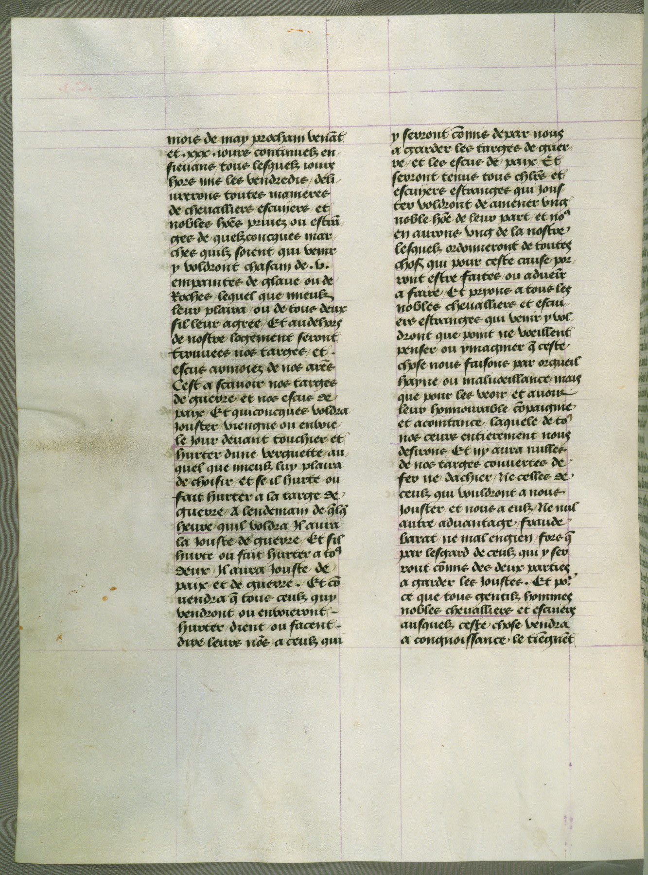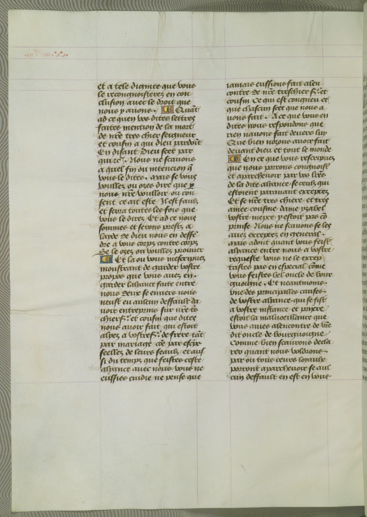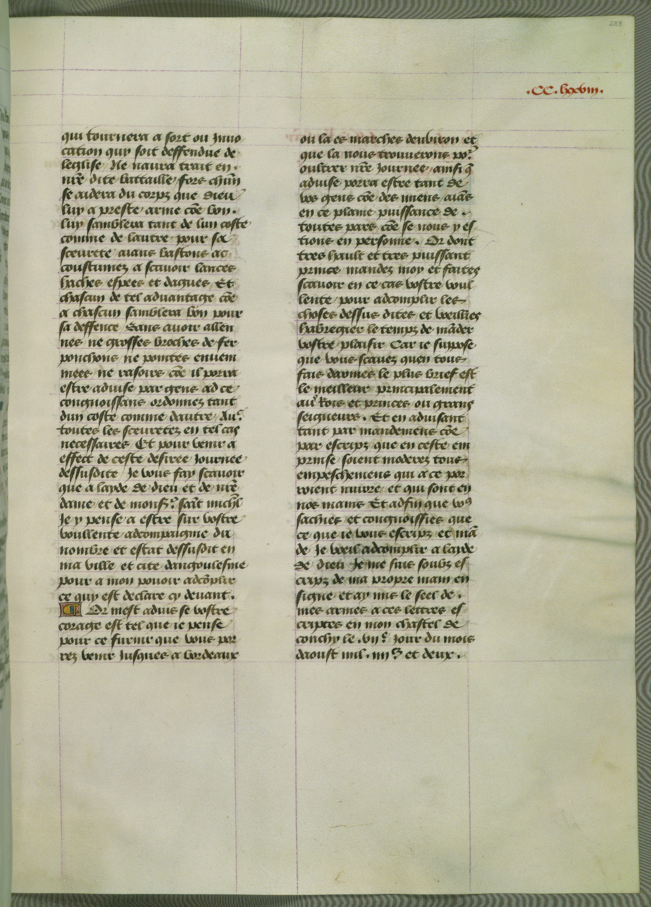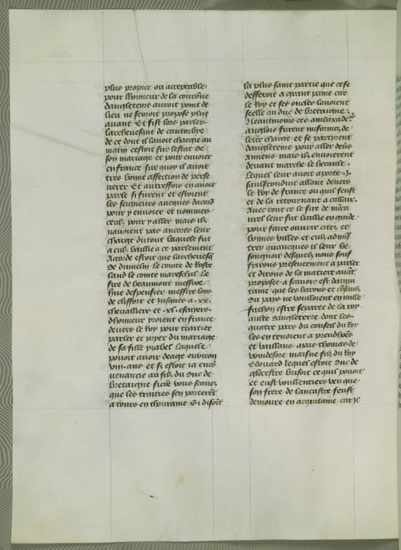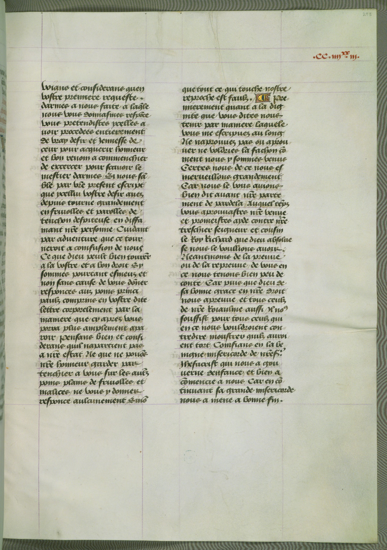 This manuscript is volume IV in a set of five from the collection "Recueil des chroniques et anchiennes istories de la Grant Bretaigne," written by Phillip the Good's counselor and chamberlain Jean de Wavrin. It chronicles the history of England from the early years of the reign of Richard II in 1377 to the demise of Henry IV, his successor, between 1400 and 1413. This volume, produced in Flanders between 1470 and 1480, was part of a set of which volumes II, III and V were recorded in the inventory of the library of William III of Orange in 1686, and was later rebound during the seventeenth or eighteenth century. Six three-quarter-page miniatures open the text of each book and depict events documented therein (with the exception of that of Book 1, portraying Richard II's coronation, which occurs prior to the period detailed in that book). The manuscript's margins are wide and relatively pristine throughout the textblock, but show significant signs of use on illuminated folios, indicating that this manuscript was primarily used for display and not as a historical text. Although few volumes of the Chroniques remain, this manuscript is particularly rare in that it is one of the two surviving exemplars of the text of volume IV, the other being part of the complete set in the Bibliothèque nationale de France (BN fr. 74-85). Volumes II, III, and V of the set to which this volume originally belonged are now in the collection of the Koninklijke Bibliotheek (Den Haag, KB : 133 A 7).