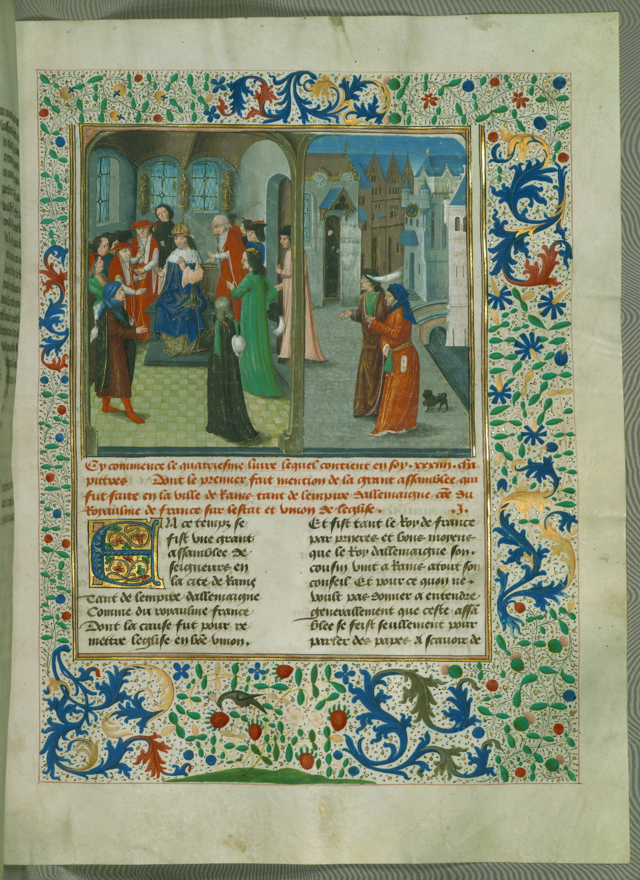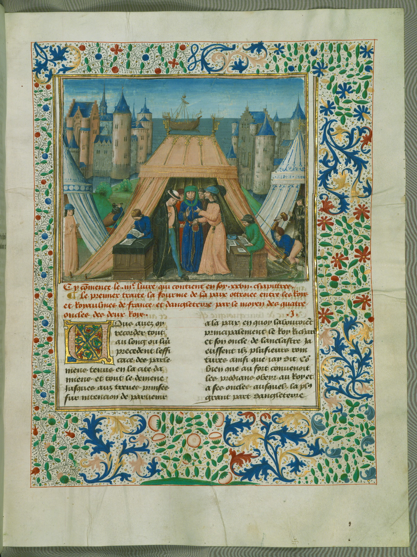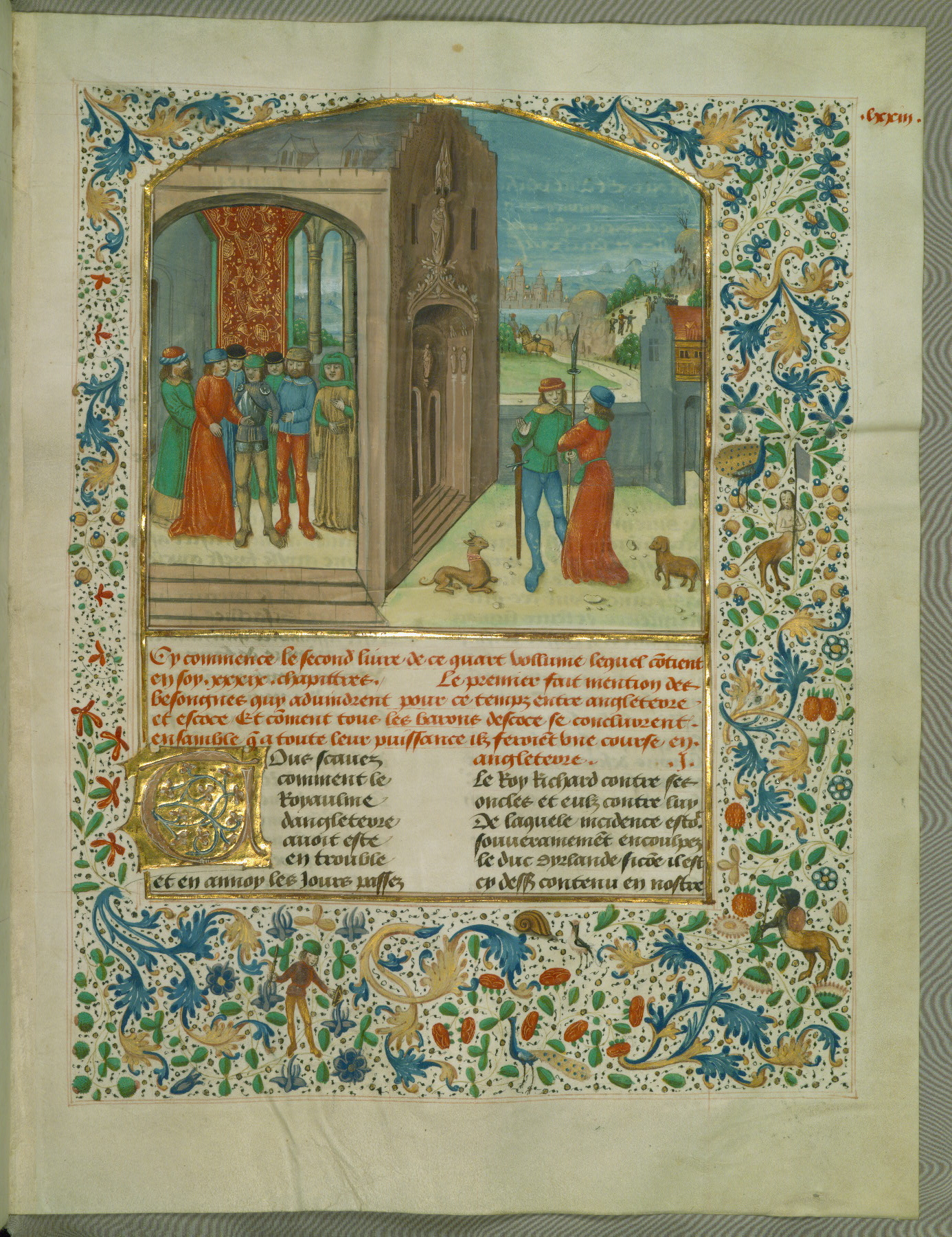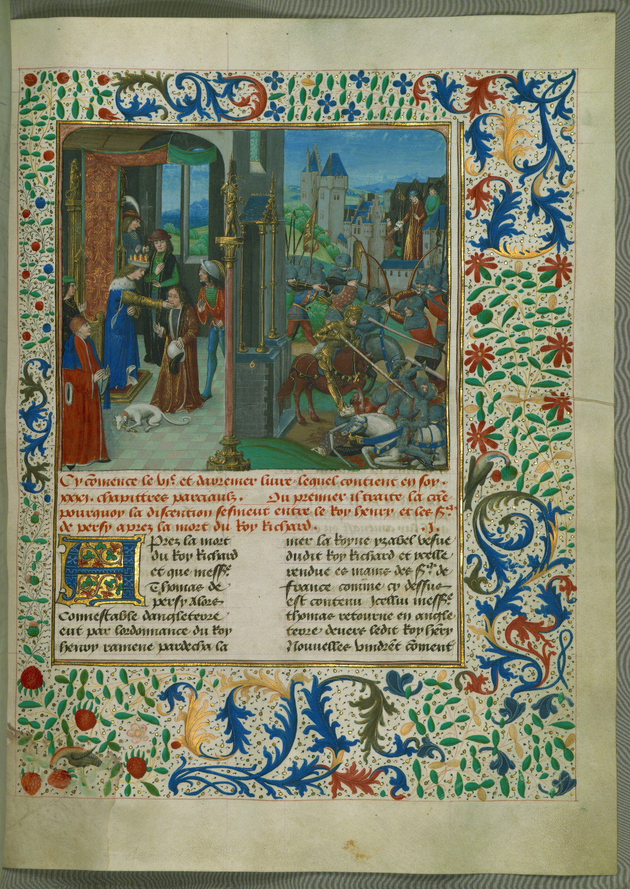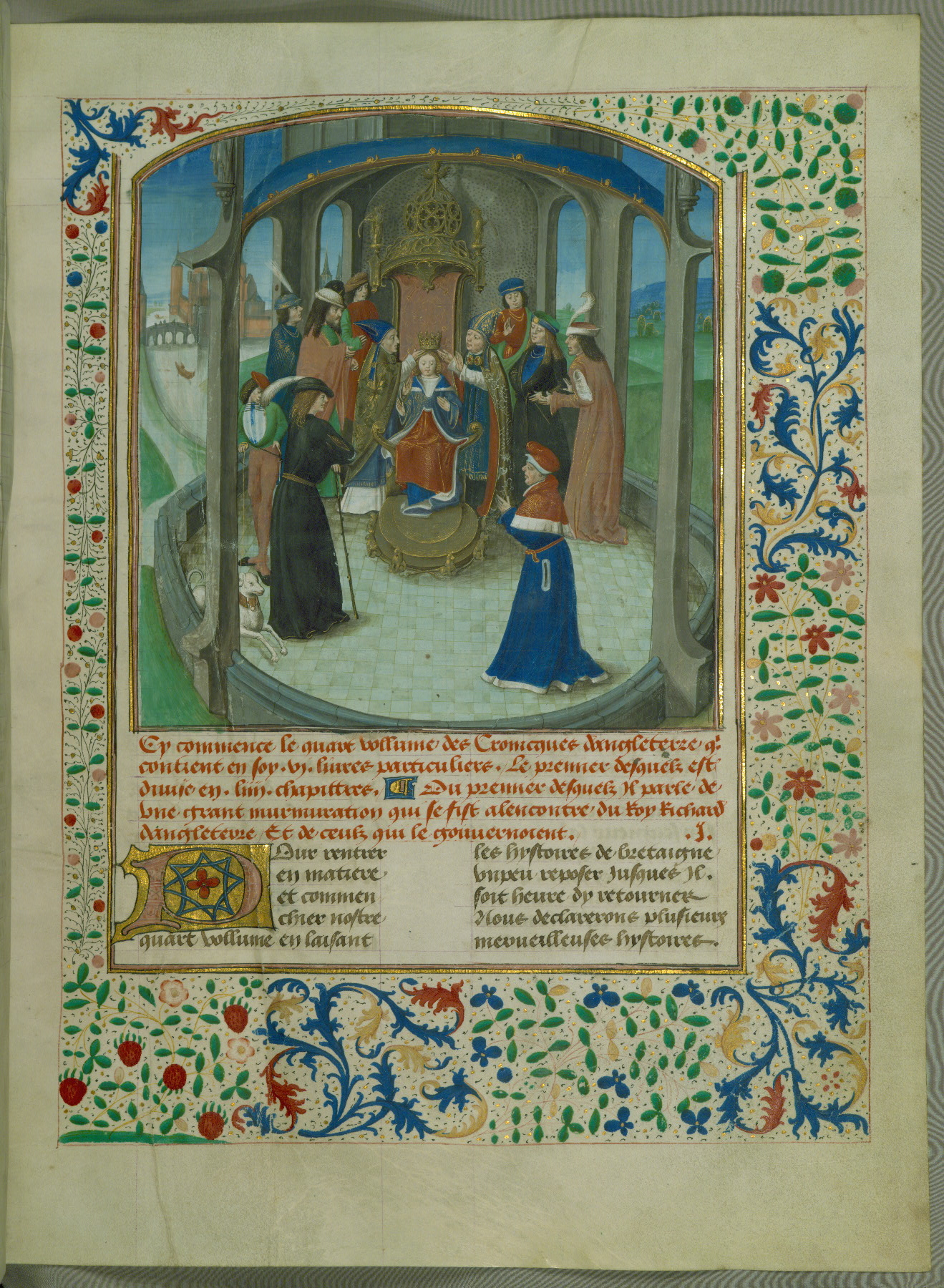 - Rubric: Cy commence le quart vollume des Cronicques dangleterre qui contient en soy .vi. liures particuliers. Le premier desquelz est diuise en .liiii. chapittres. Du premier desquelz il parle de une grant murmuration qui se fist alencontre du roy richard dangleterre Et de ceulz qui le gouuernoient.