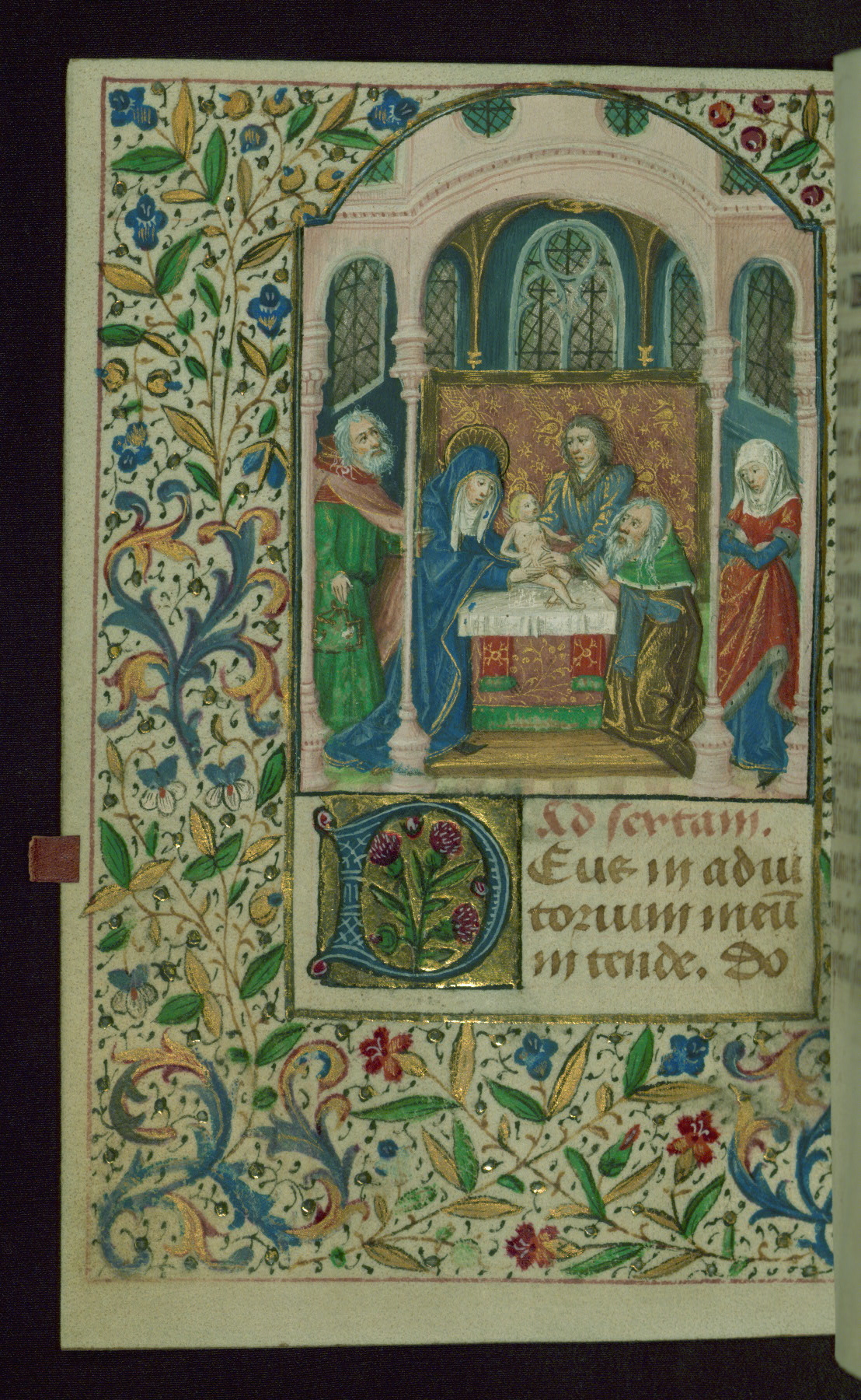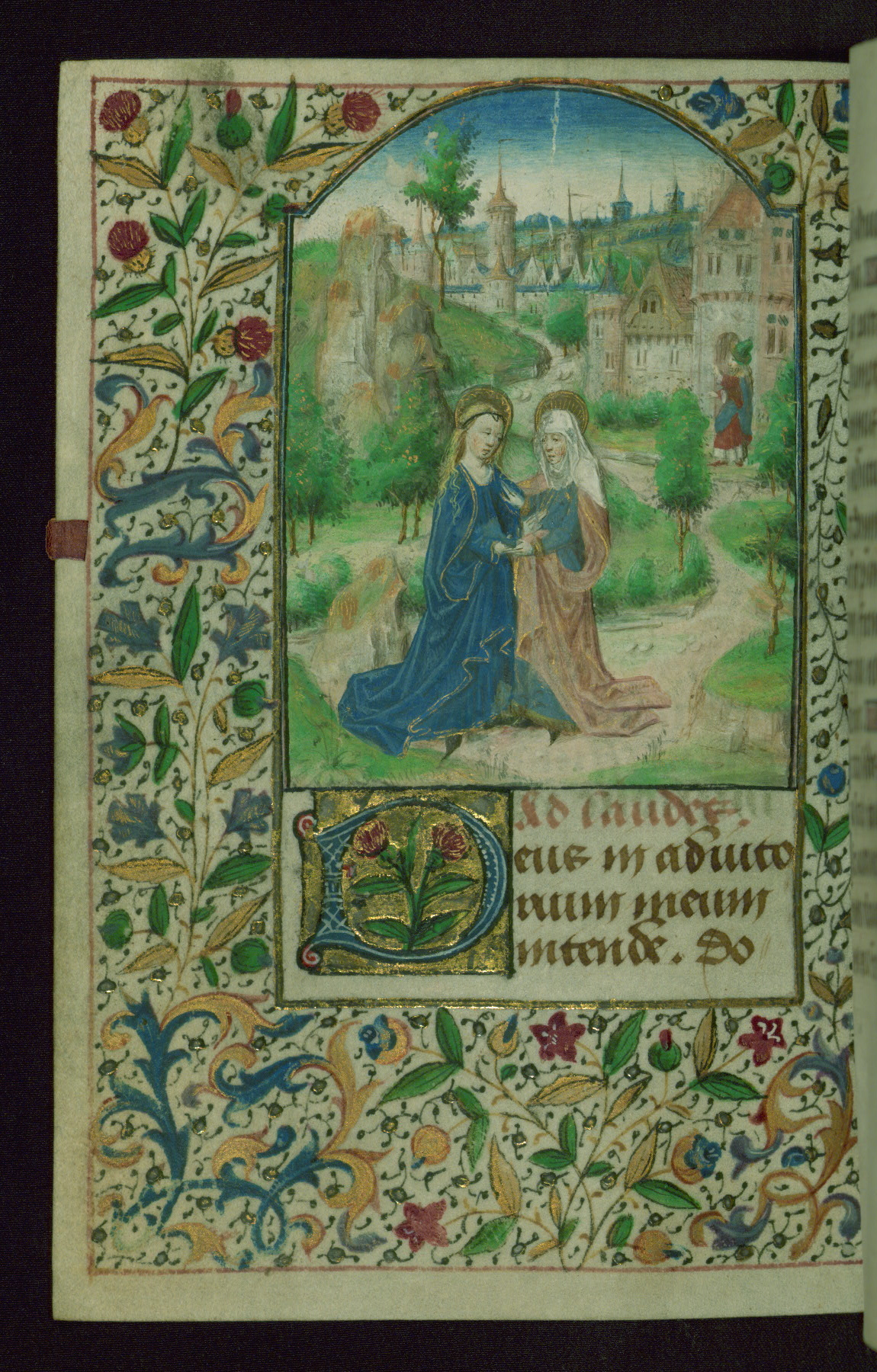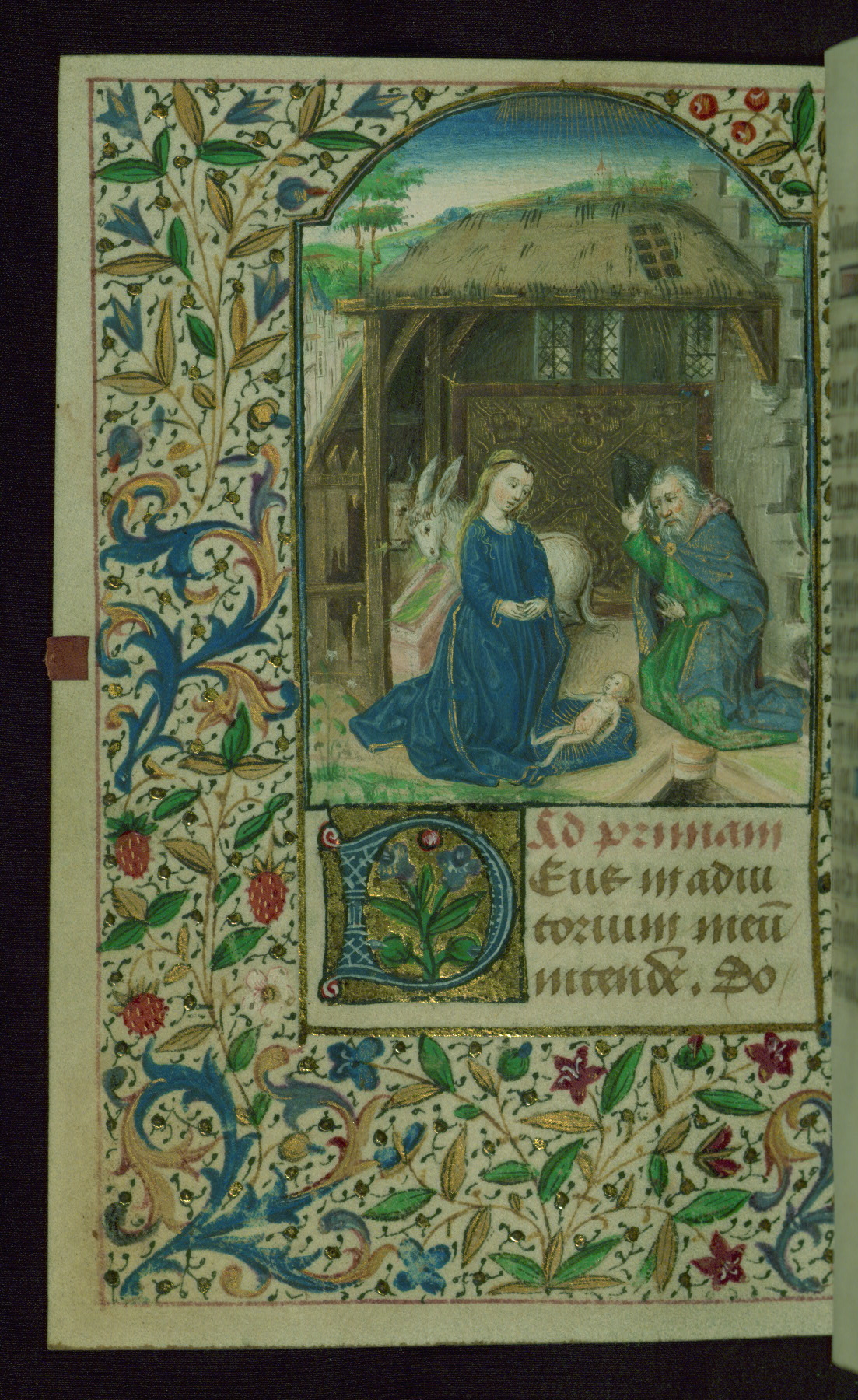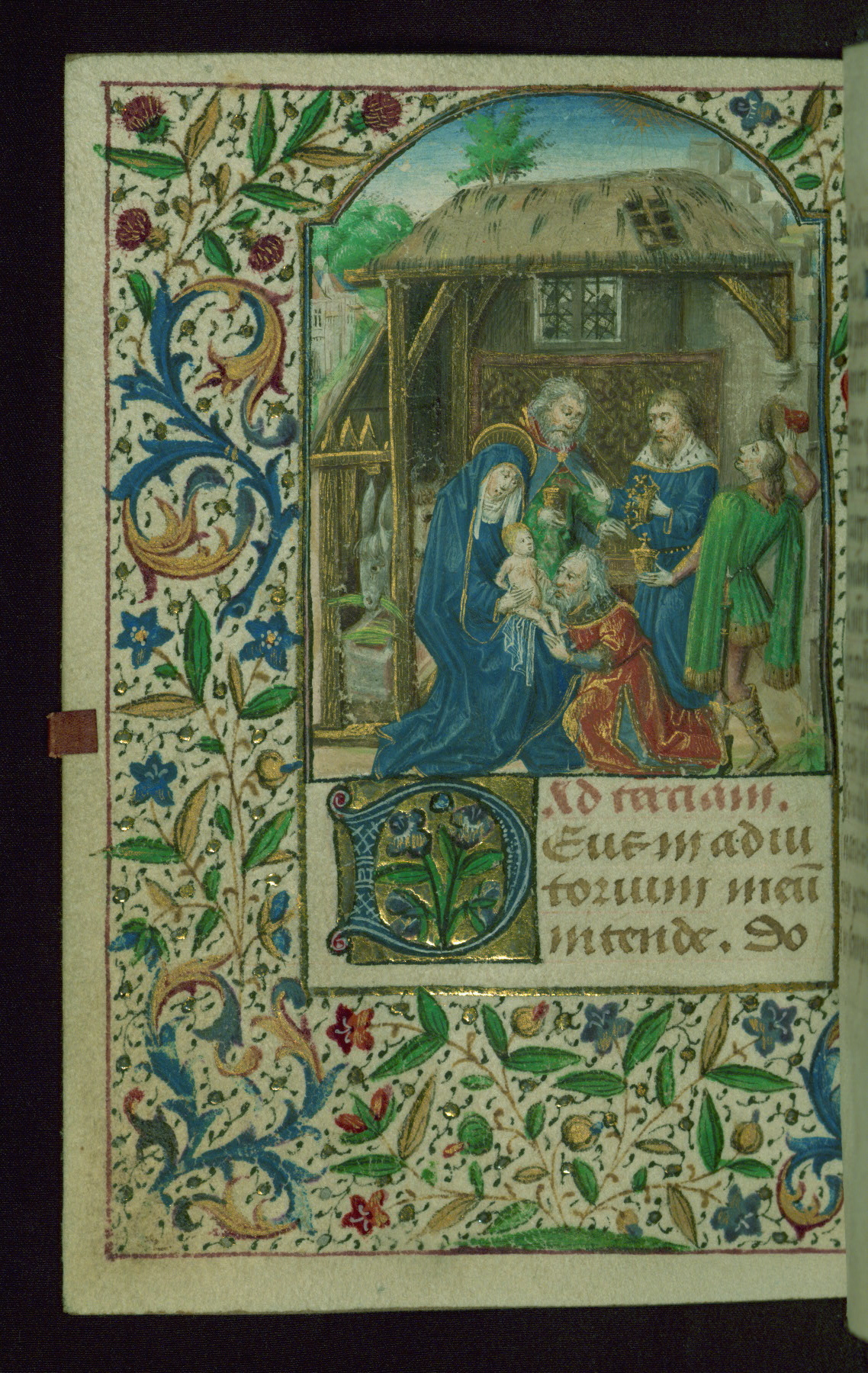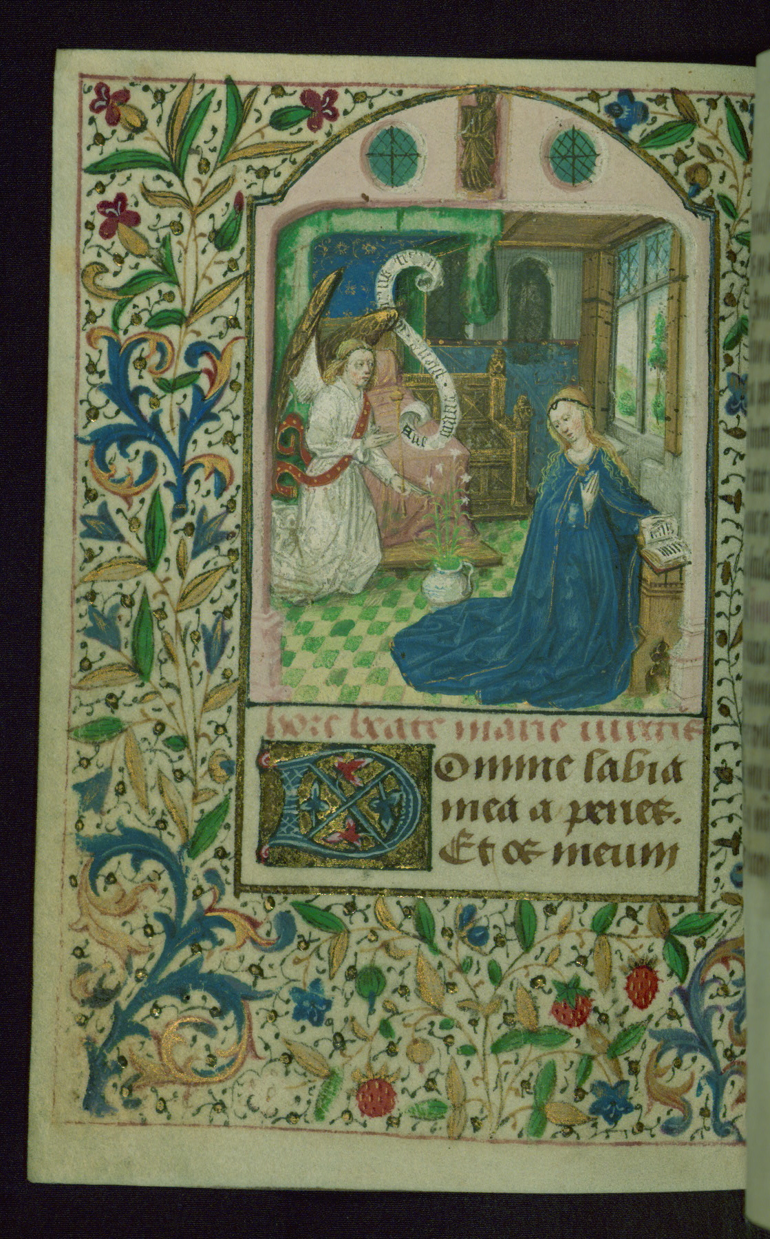 - Decoration note: Twelve extant full-page miniatures, with one likely lost along with now missing text of Office of the Dead; dense foliate borders around miniatures; more delicate partial borders found only in outer side margins from fols. 36r-39v and fols. 128v-143v; large decorated initials in blue on gold grounds, often containing flowers, at major text openings (3-4 lines); smaller decorated initials in blue and rose on gold grounds, for secondary text divisions (2 lines); small initials in gold on blue and pink grounds with white patterning for versals (1 line) and for KL in calendar (2 lines); line fillers throughout in blue and rose with white designs and gold dots; rubrics in dark rose; text in brown ink