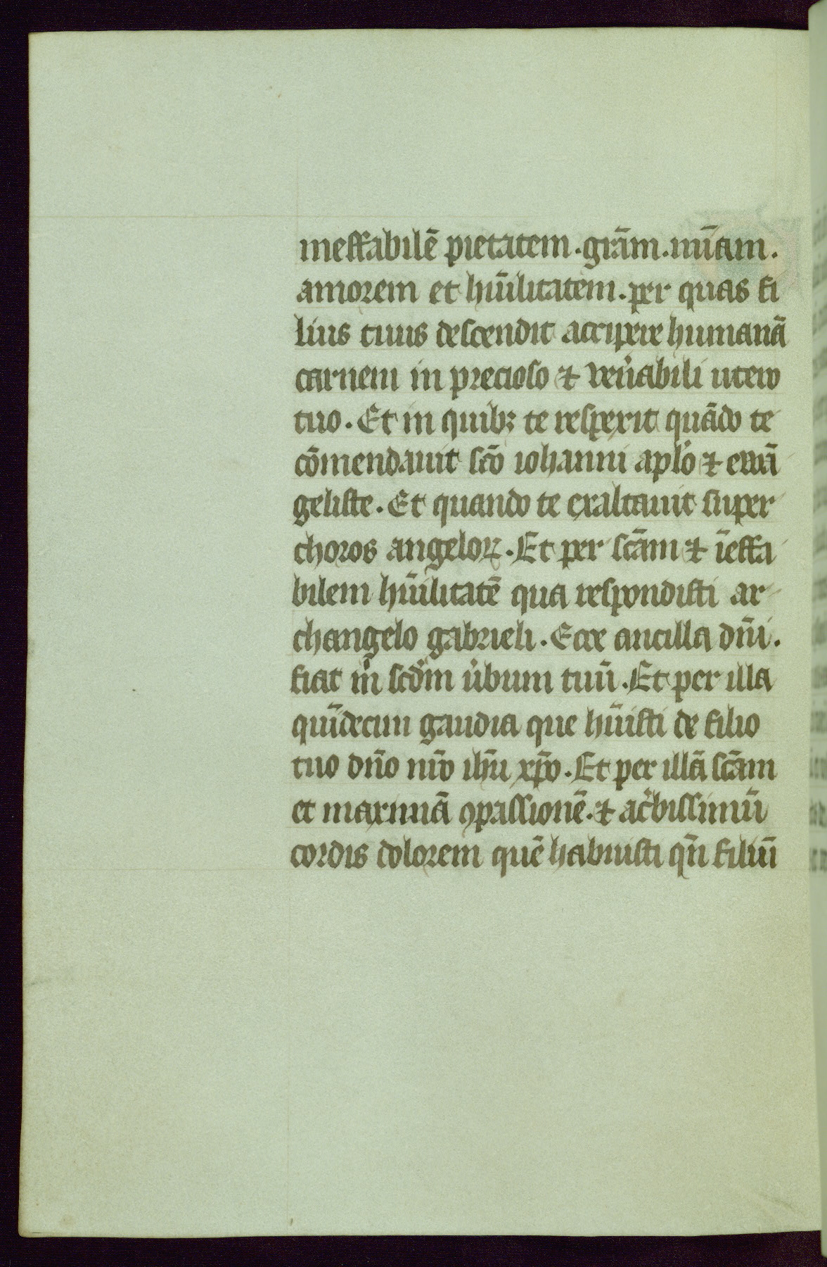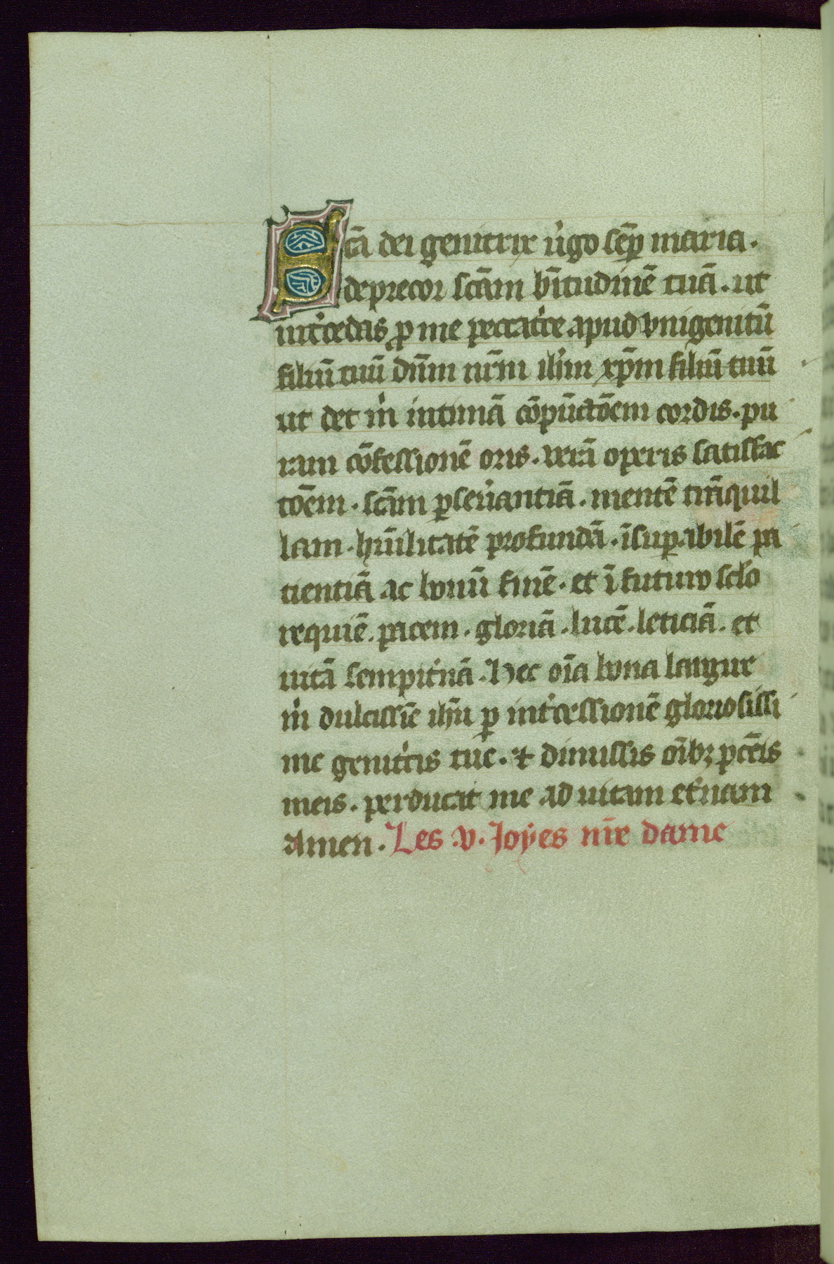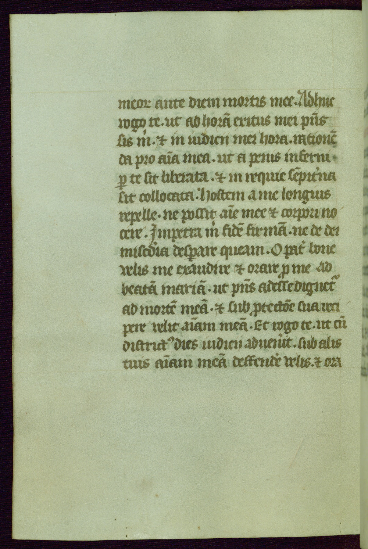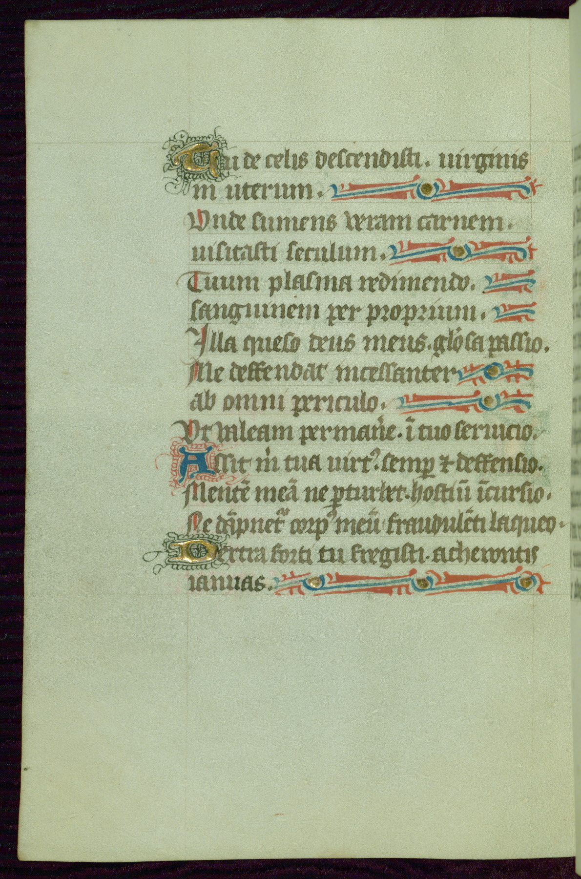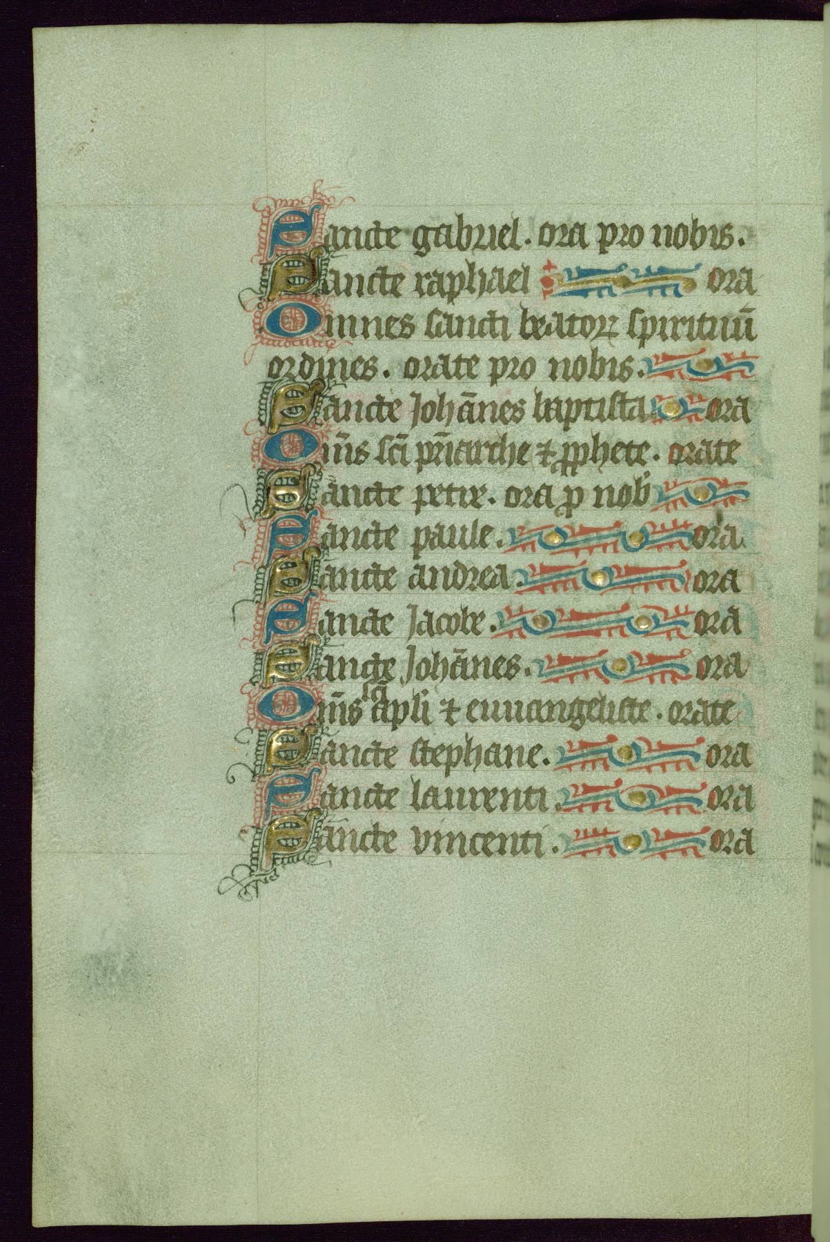 This Book of Hours was created ca. 1440 in Hainaut for a female patron with Cistercian connections, which is suggested by long devotional sequences focused on the Passion of Christ and the Virgin, including indulgences, a litany with Cistercian affiliation, and various references to a female suppliant. Two devotional texts written by various scribes in Latin and French were added to the front and back of the book ca. 1450-1600. At the end of the front devotional text, on fol. 6v, there are sewing holes and strong impressions of a variety of pilgrim badges. The manuscript contains eight full-page miniatures, five of which were at some point protected by pieces of gauze that have been removed and are now in the WAM file.