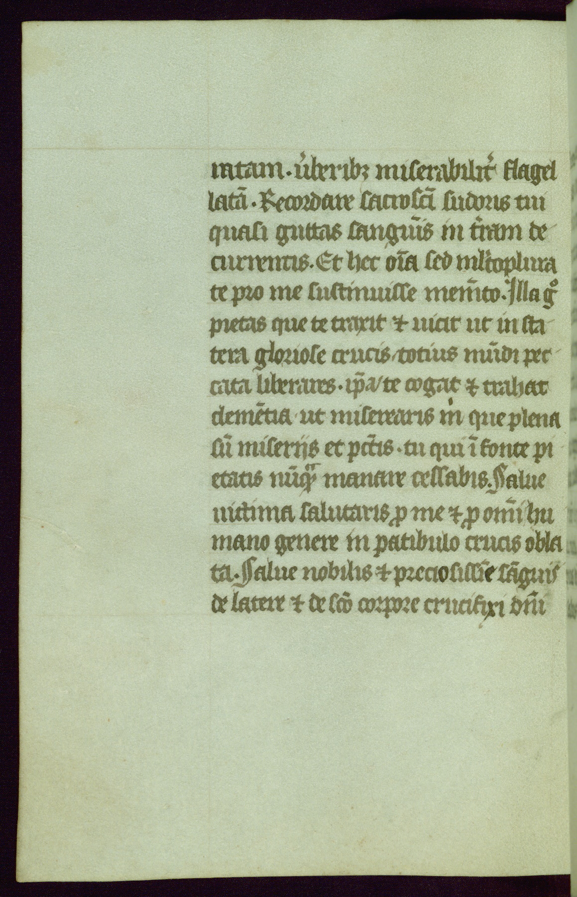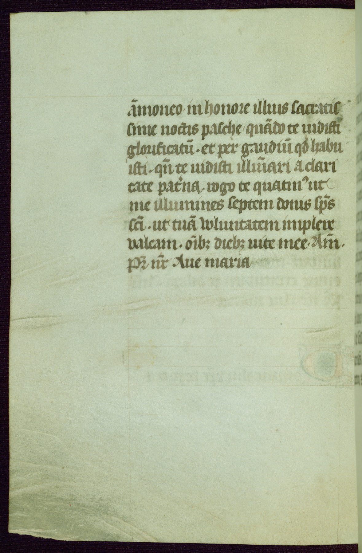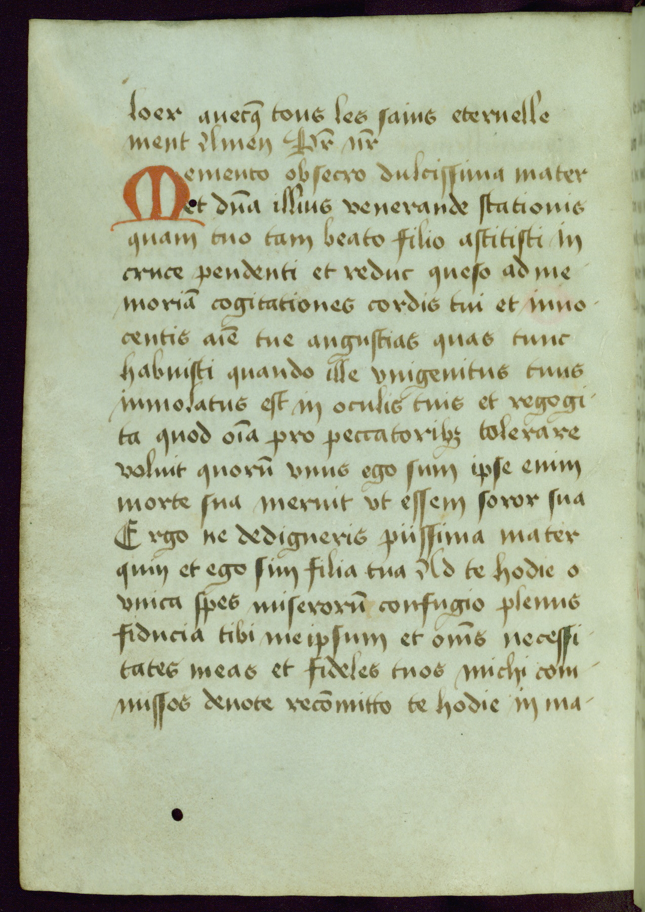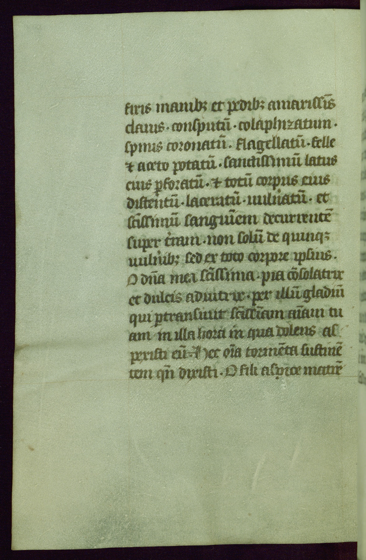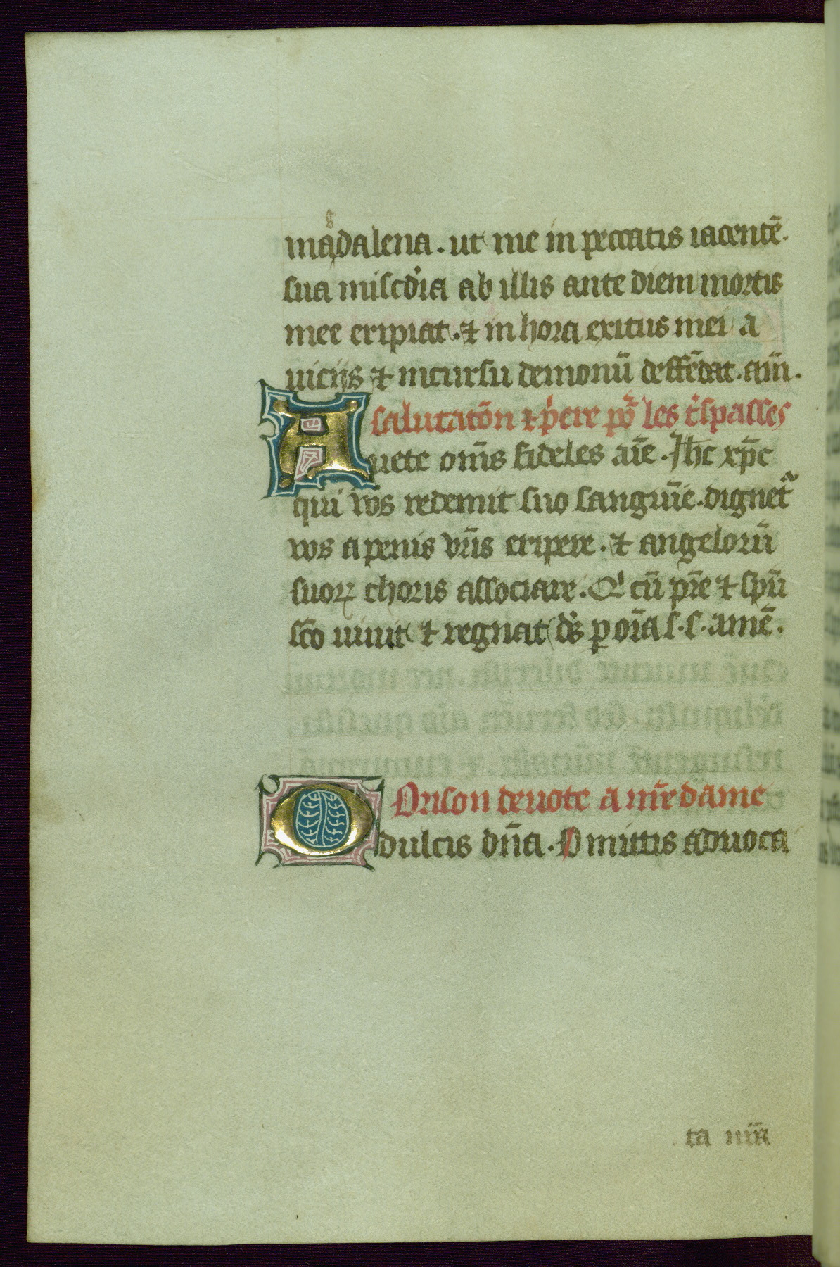 This Book of Hours was created ca. 1440 in Hainaut for a female patron with Cistercian connections, which is suggested by long devotional sequences focused on the Passion of Christ and the Virgin, including indulgences, a litany with Cistercian affiliation, and various references to a female suppliant. Two devotional texts written by various scribes in Latin and French were added to the front and back of the book ca. 1450-1600. At the end of the front devotional text, on fol. 6v, there are sewing holes and strong impressions of a variety of pilgrim badges. The manuscript contains eight full-page miniatures, five of which were at some point protected by pieces of gauze that have been removed and are now in the WAM file.