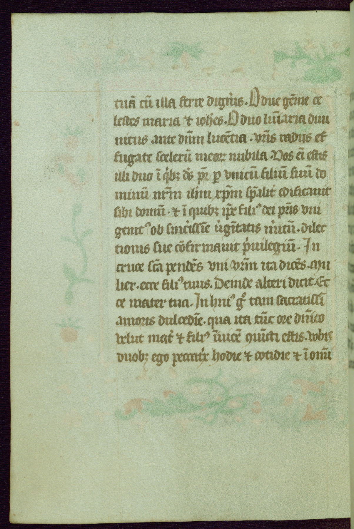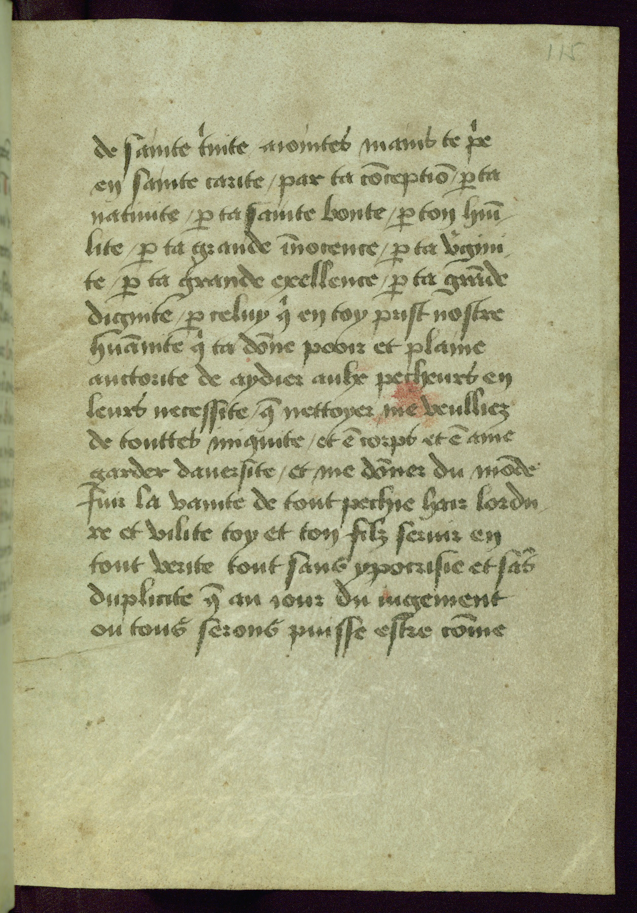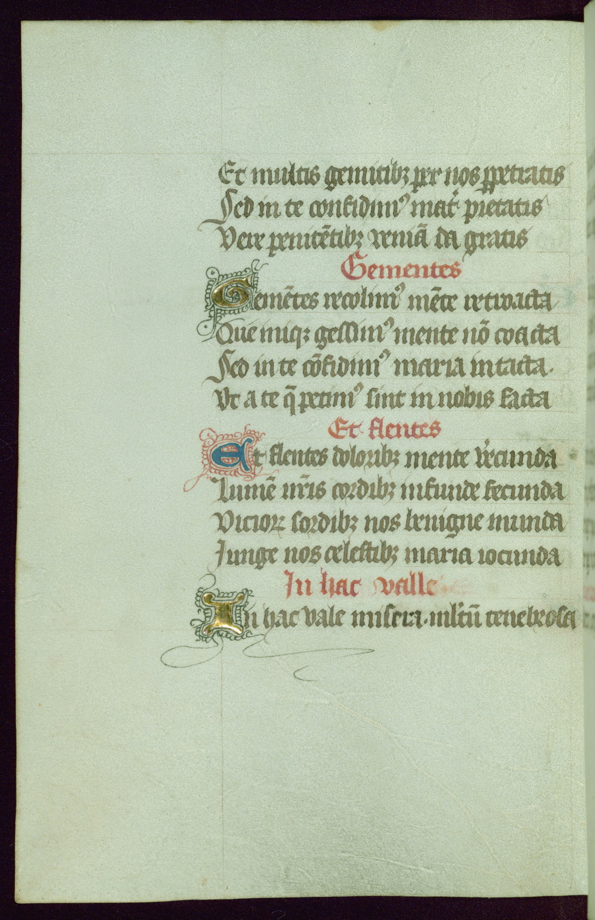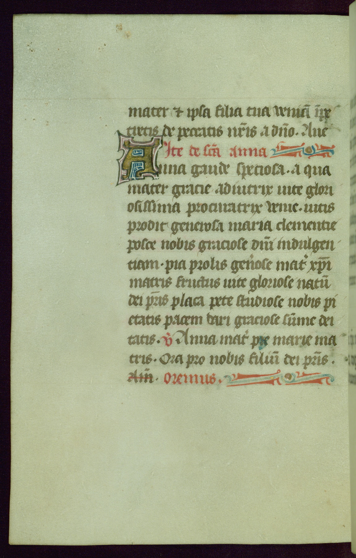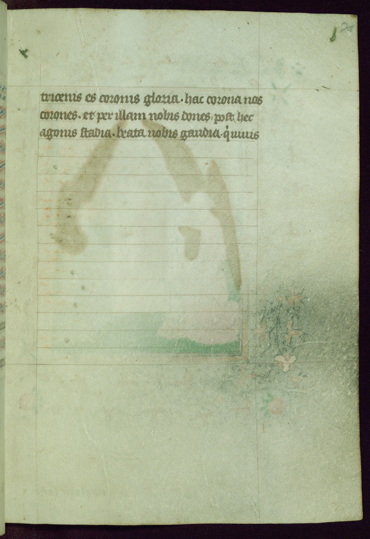 This Book of Hours was created ca. 1440 in Hainaut for a female patron with Cistercian connections, which is suggested by long devotional sequences focused on the Passion of Christ and the Virgin, including indulgences, a litany with Cistercian affiliation, and various references to a female suppliant. Two devotional texts written by various scribes in Latin and French were added to the front and back of the book ca. 1450-1600. At the end of the front devotional text, on fol. 6v, there are sewing holes and strong impressions of a variety of pilgrim badges. The manuscript contains eight full-page miniatures, five of which were at some point protected by pieces of gauze that have been removed and are now in the WAM file.