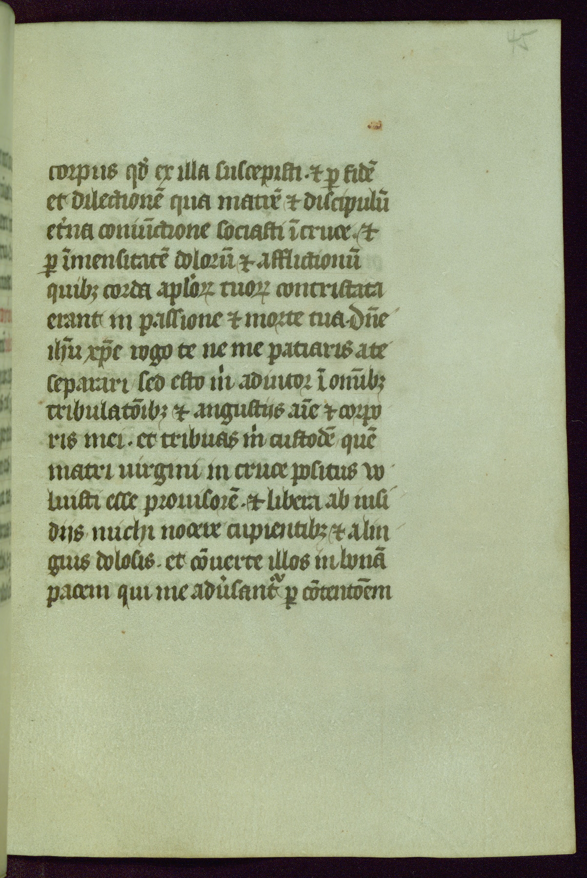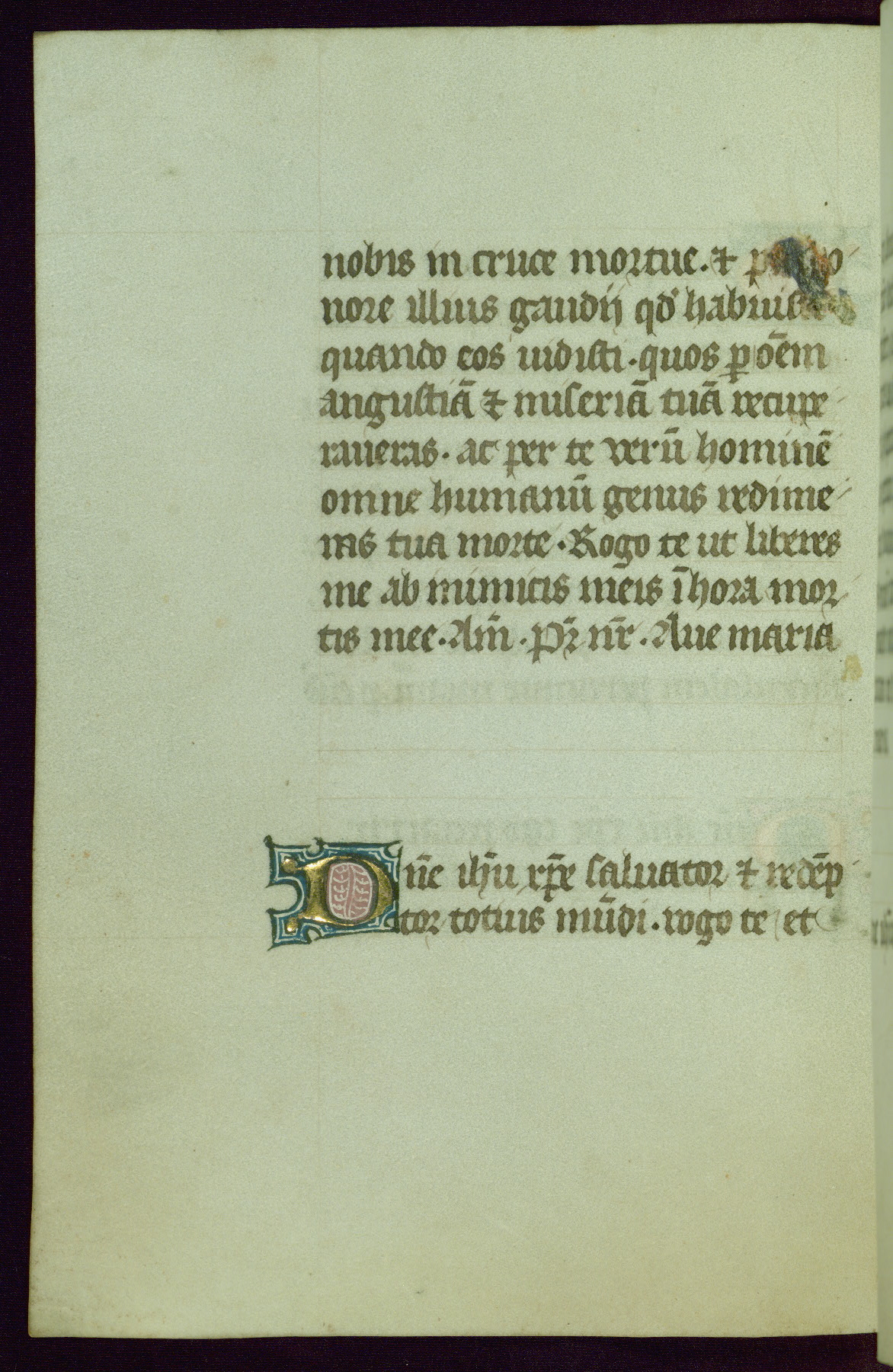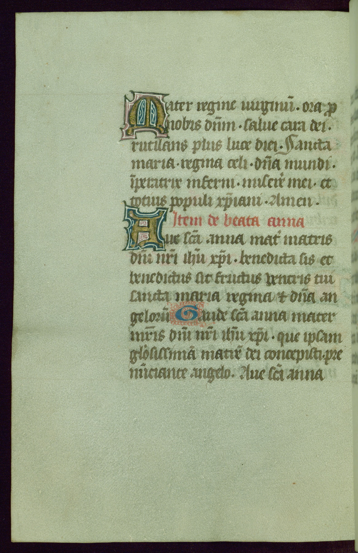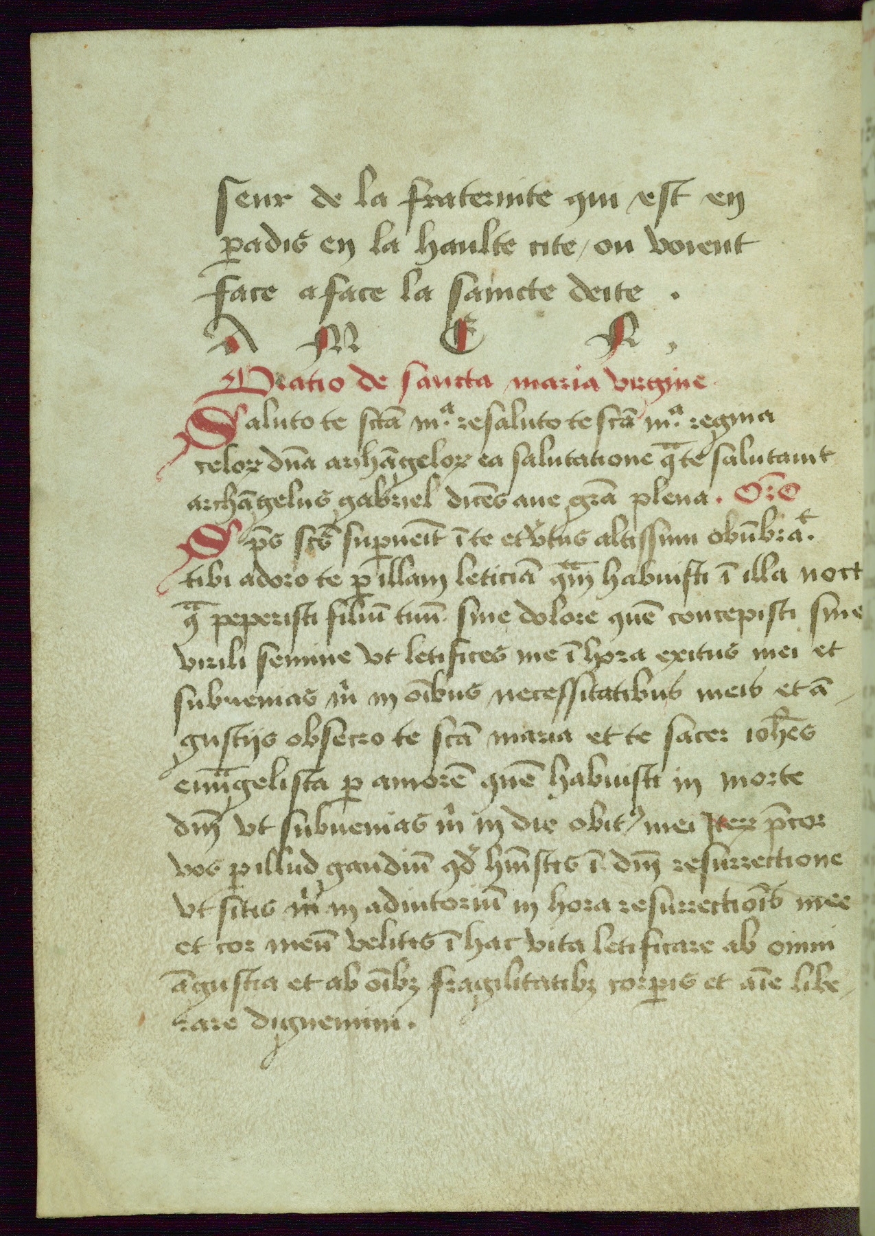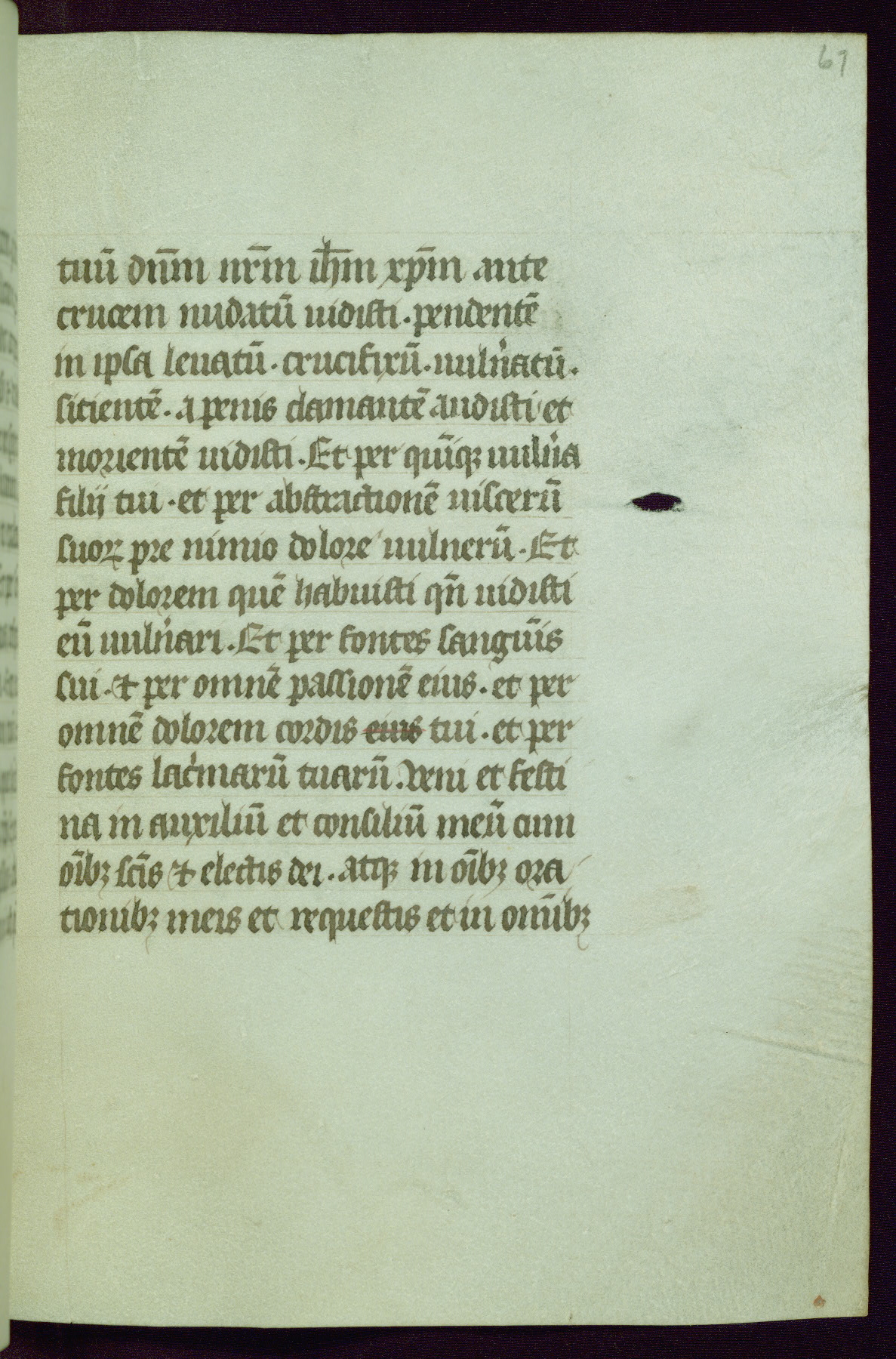 This Book of Hours was created ca. 1440 in Hainaut for a female patron with Cistercian connections, which is suggested by long devotional sequences focused on the Passion of Christ and the Virgin, including indulgences, a litany with Cistercian affiliation, and various references to a female suppliant. Two devotional texts written by various scribes in Latin and French were added to the front and back of the book ca. 1450-1600. At the end of the front devotional text, on fol. 6v, there are sewing holes and strong impressions of a variety of pilgrim badges. The manuscript contains eight full-page miniatures, five of which were at some point protected by pieces of gauze that have been removed and are now in the WAM file.