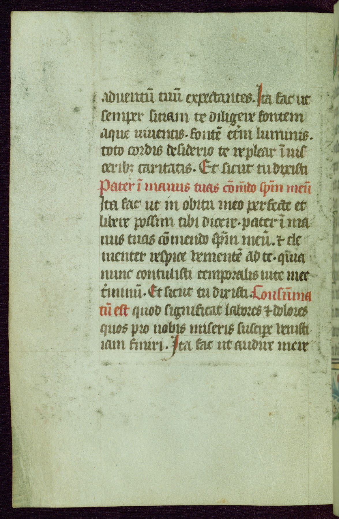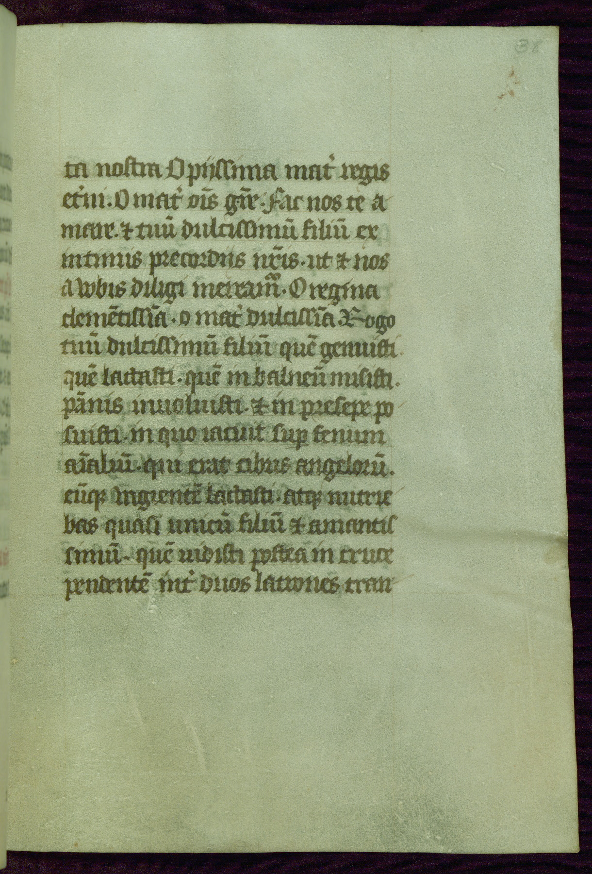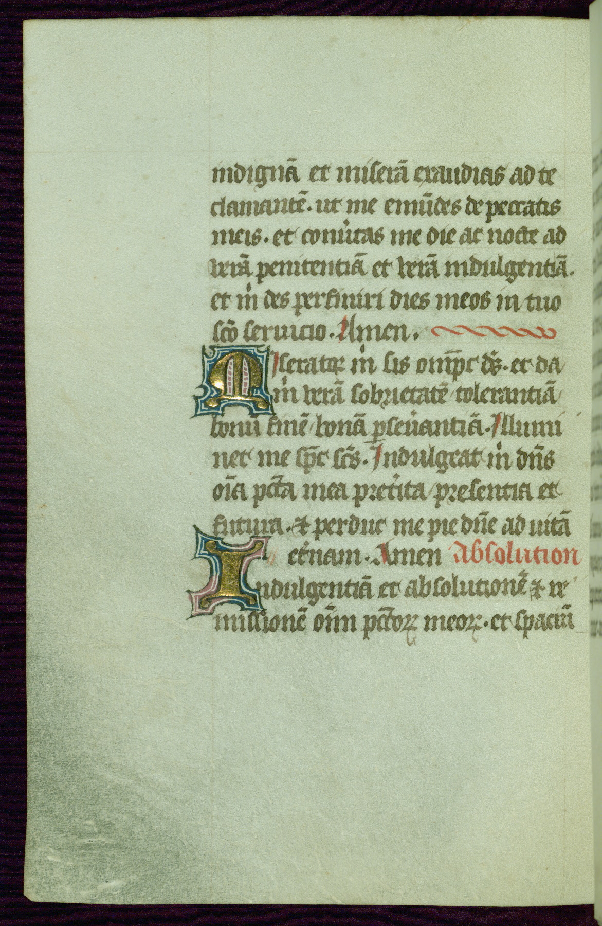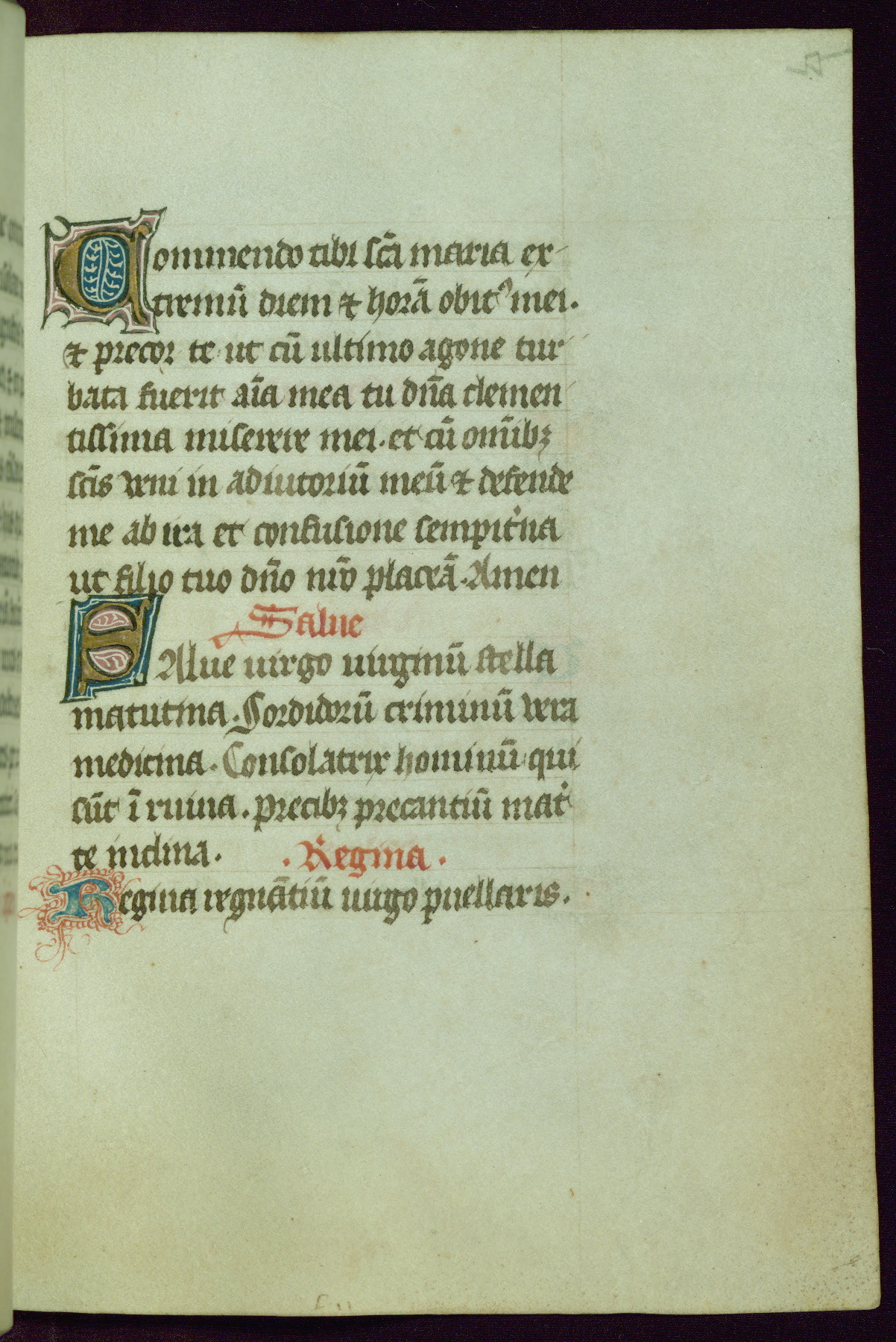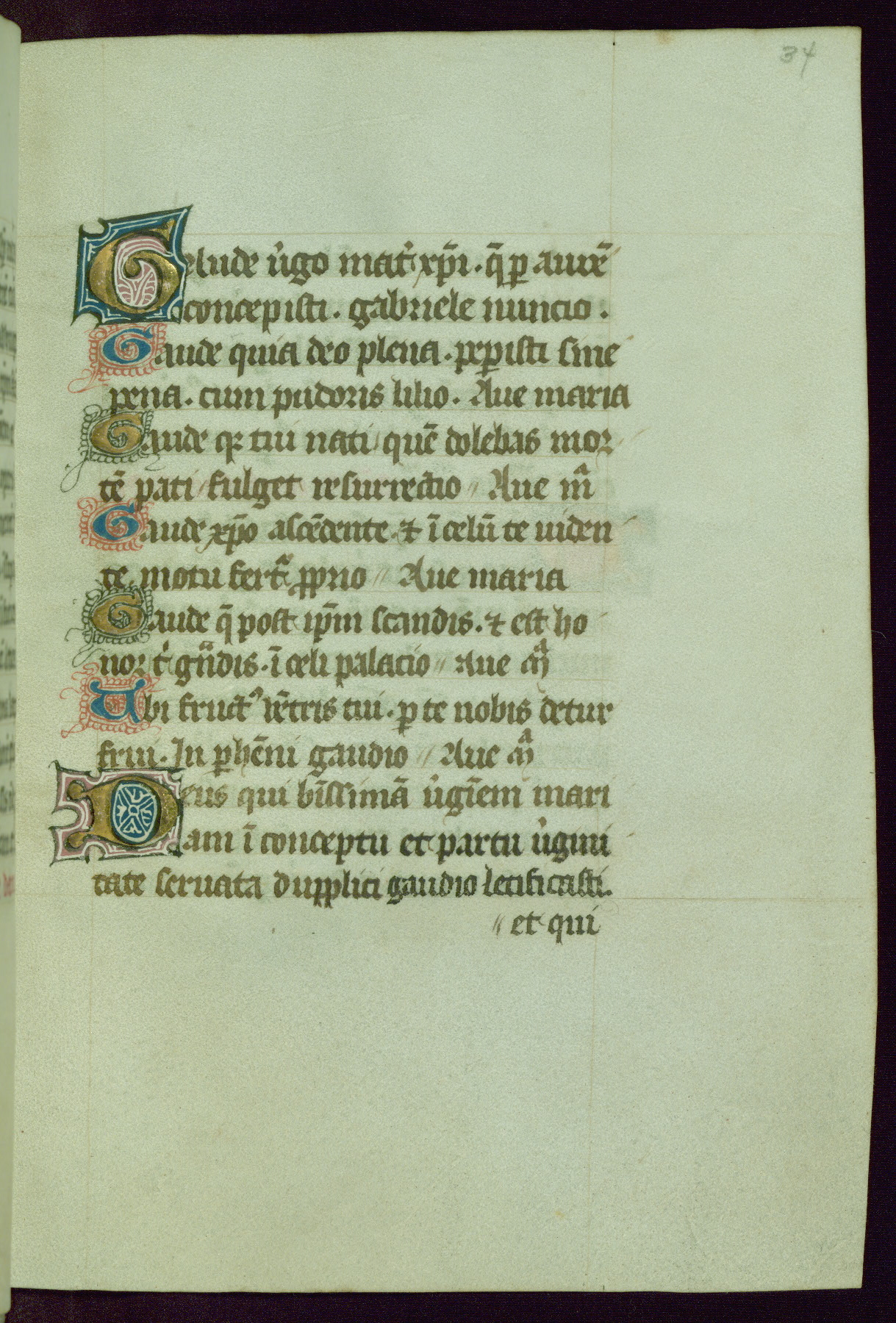 This Book of Hours was created ca. 1440 in Hainaut for a female patron with Cistercian connections, which is suggested by long devotional sequences focused on the Passion of Christ and the Virgin, including indulgences, a litany with Cistercian affiliation, and various references to a female suppliant. Two devotional texts written by various scribes in Latin and French were added to the front and back of the book ca. 1450-1600. At the end of the front devotional text, on fol. 6v, there are sewing holes and strong impressions of a variety of pilgrim badges. The manuscript contains eight full-page miniatures, five of which were at some point protected by pieces of gauze that have been removed and are now in the WAM file.