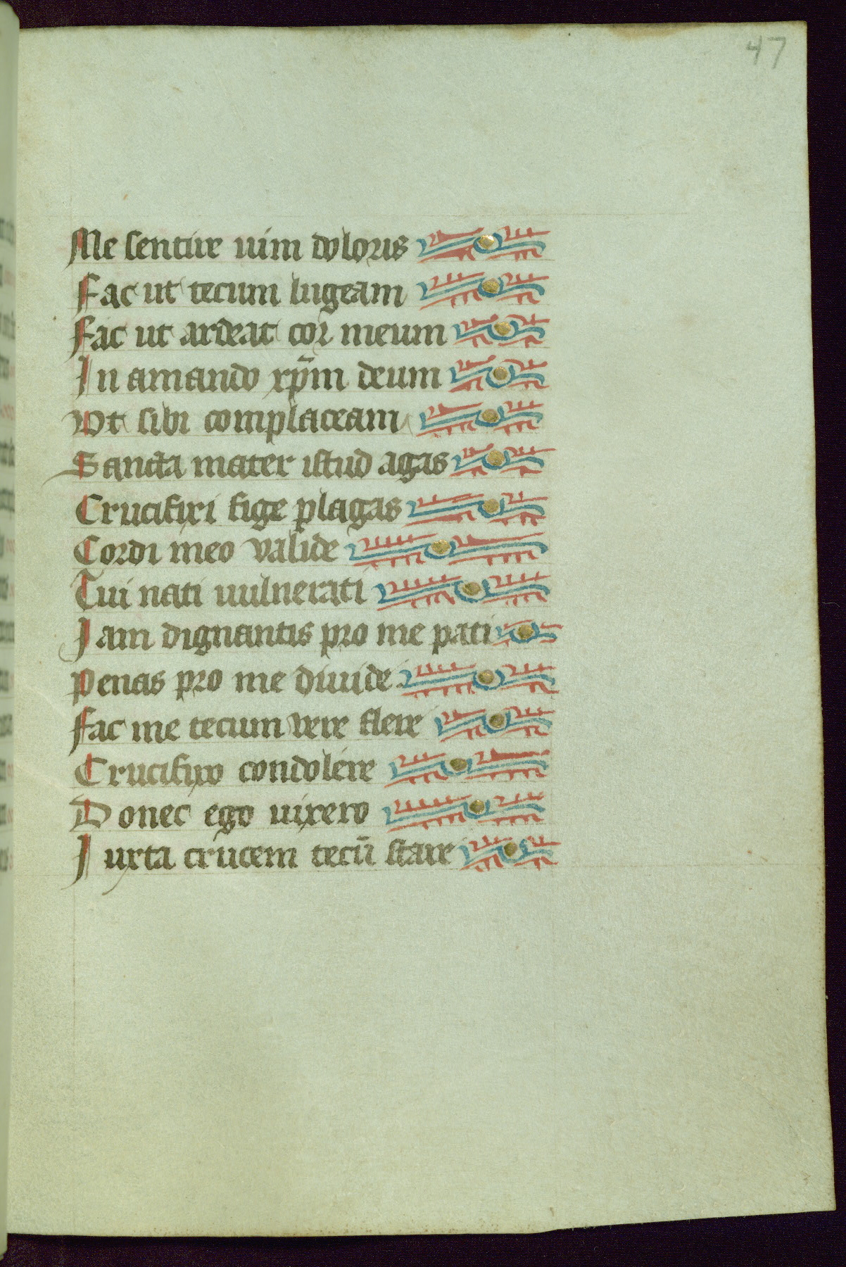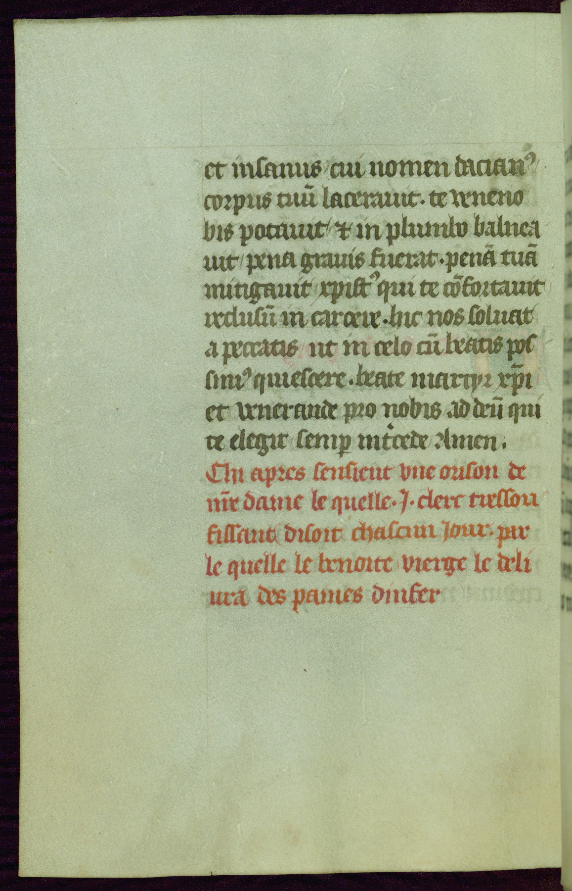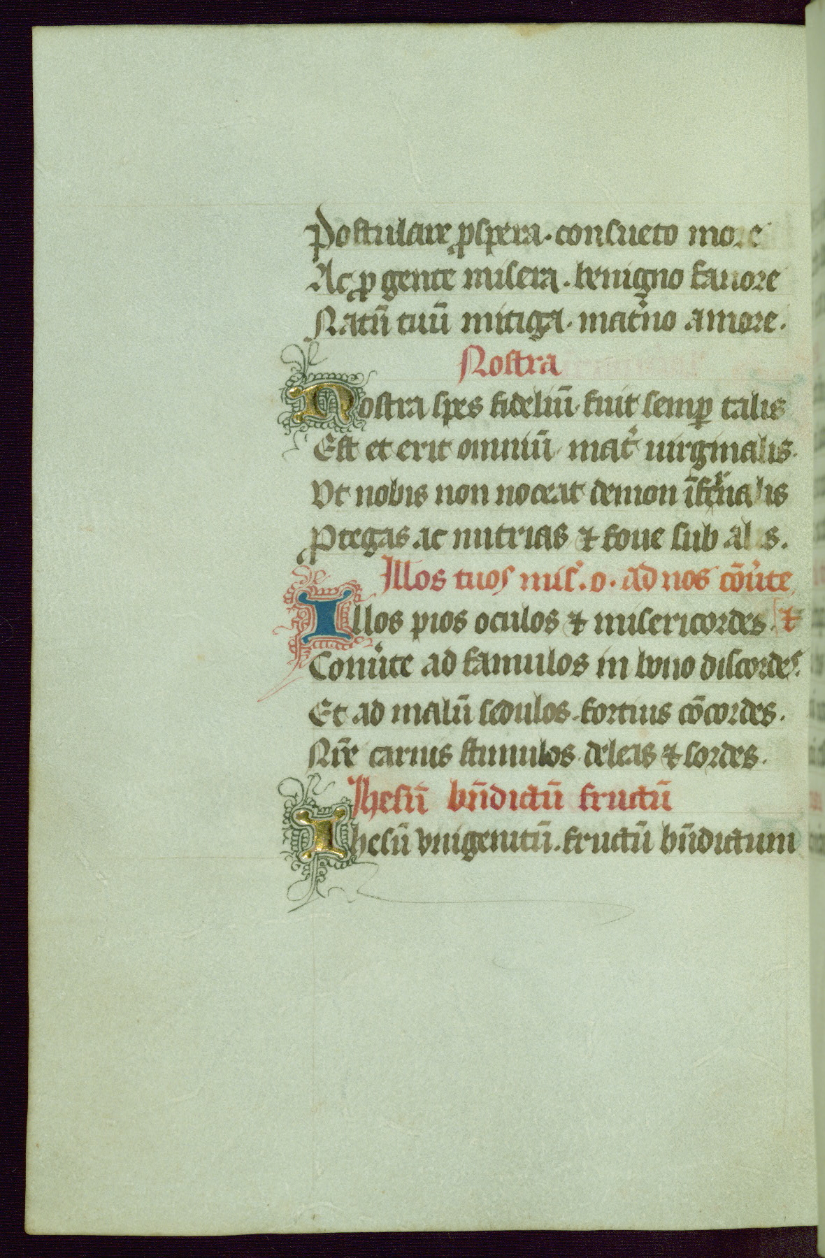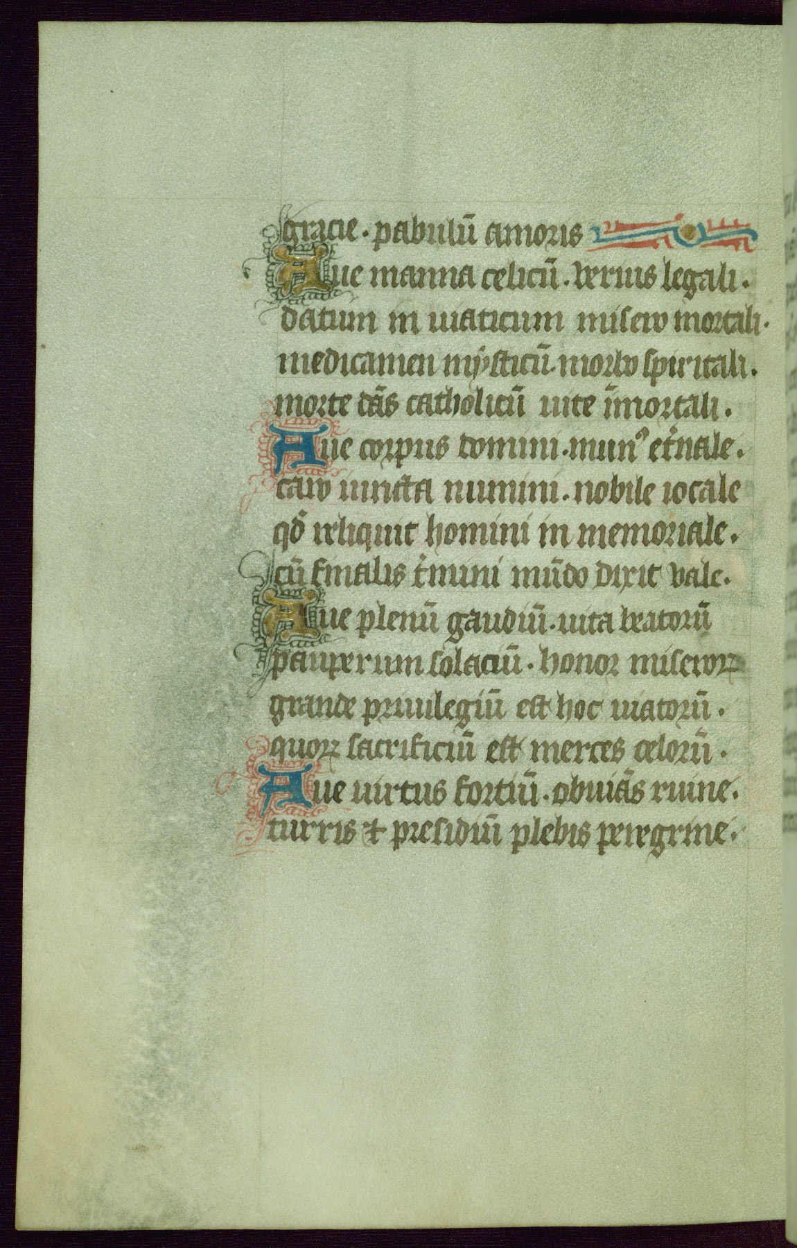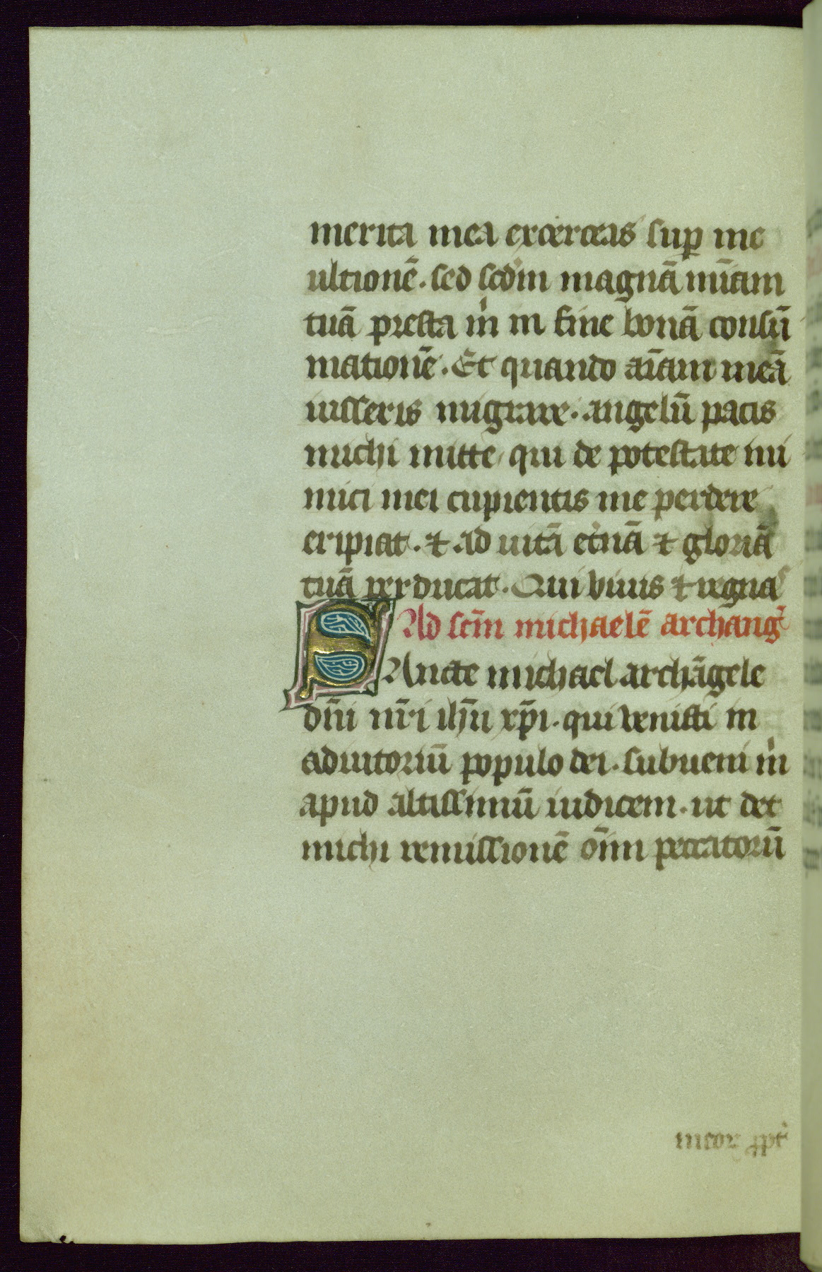 This Book of Hours was created ca. 1440 in Hainaut for a female patron with Cistercian connections, which is suggested by long devotional sequences focused on the Passion of Christ and the Virgin, including indulgences, a litany with Cistercian affiliation, and various references to a female suppliant. Two devotional texts written by various scribes in Latin and French were added to the front and back of the book ca. 1450-1600. At the end of the front devotional text, on fol. 6v, there are sewing holes and strong impressions of a variety of pilgrim badges. The manuscript contains eight full-page miniatures, five of which were at some point protected by pieces of gauze that have been removed and are now in the WAM file.