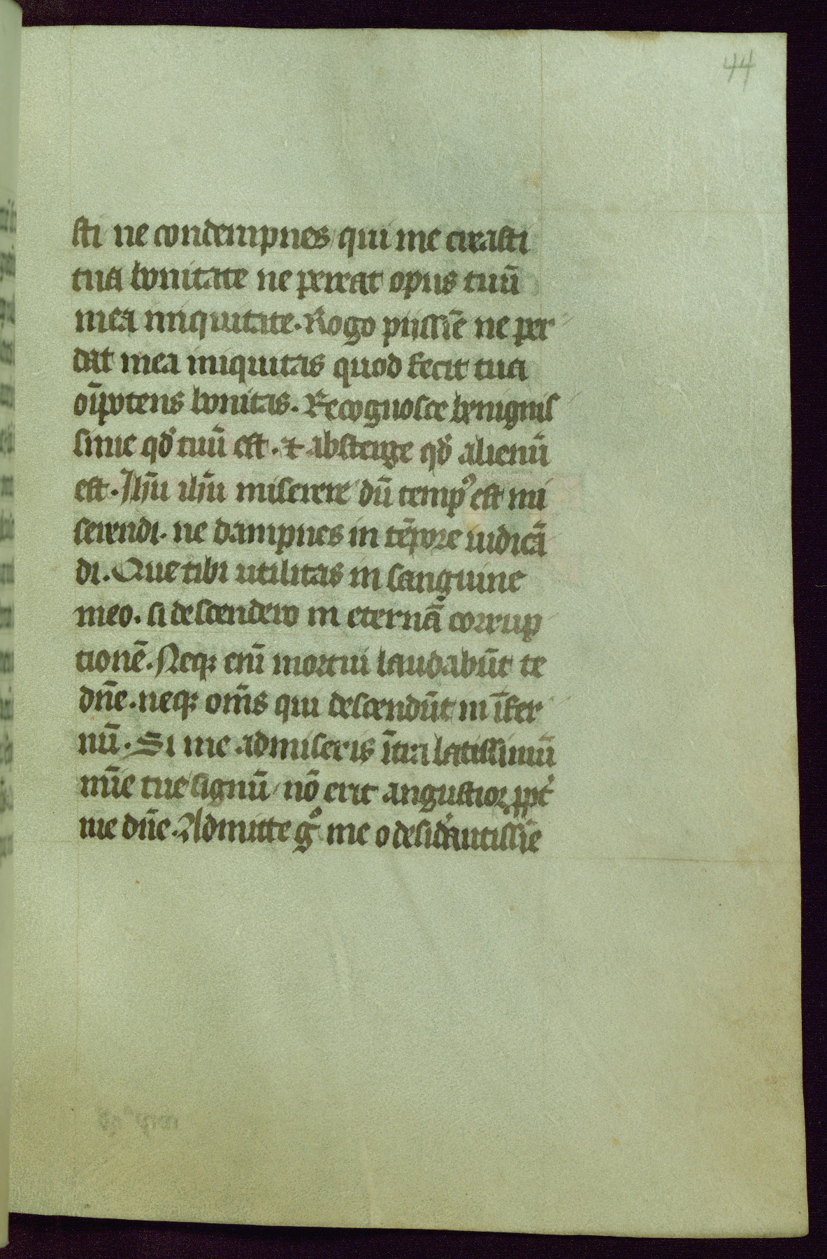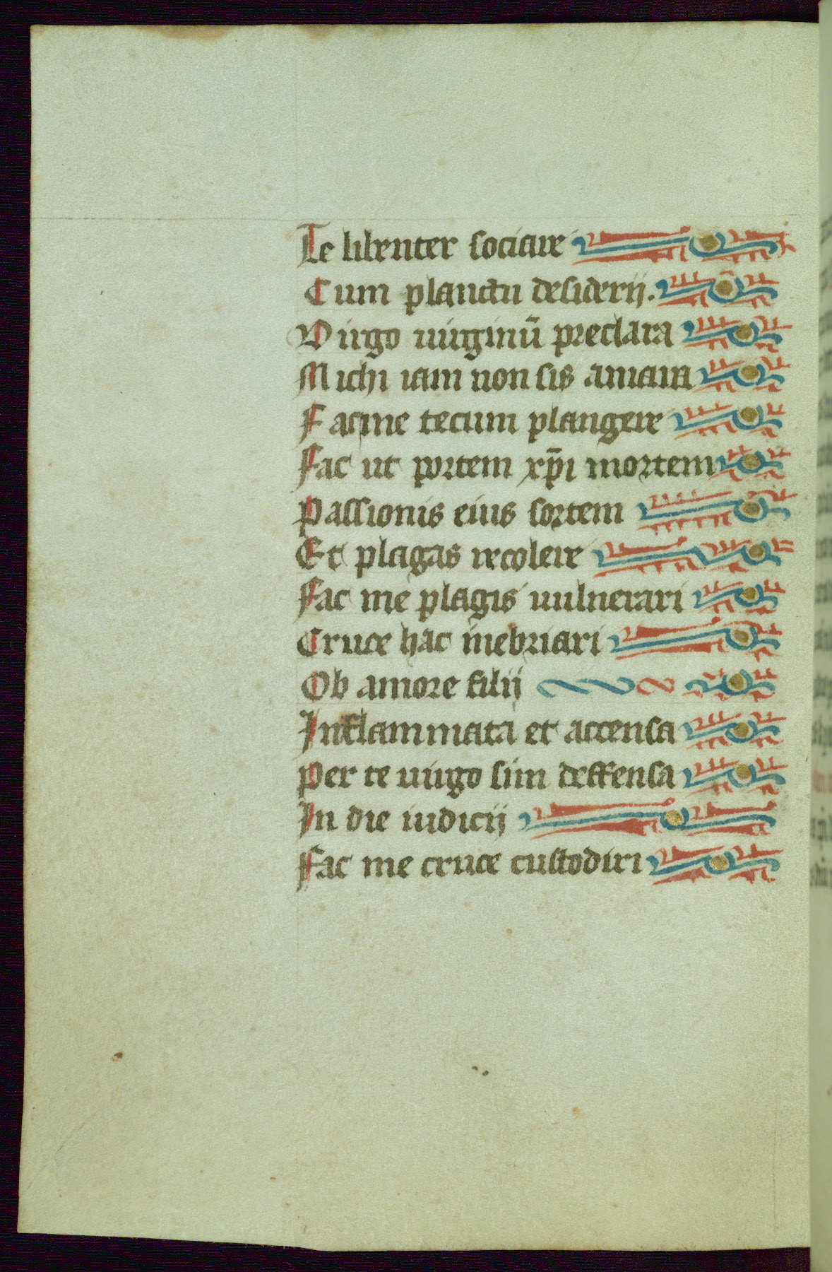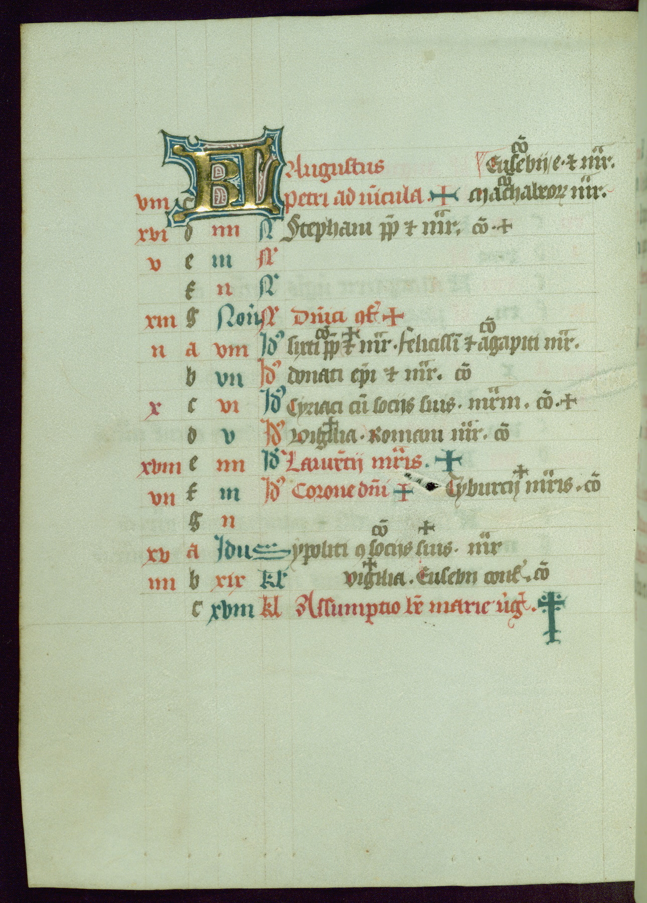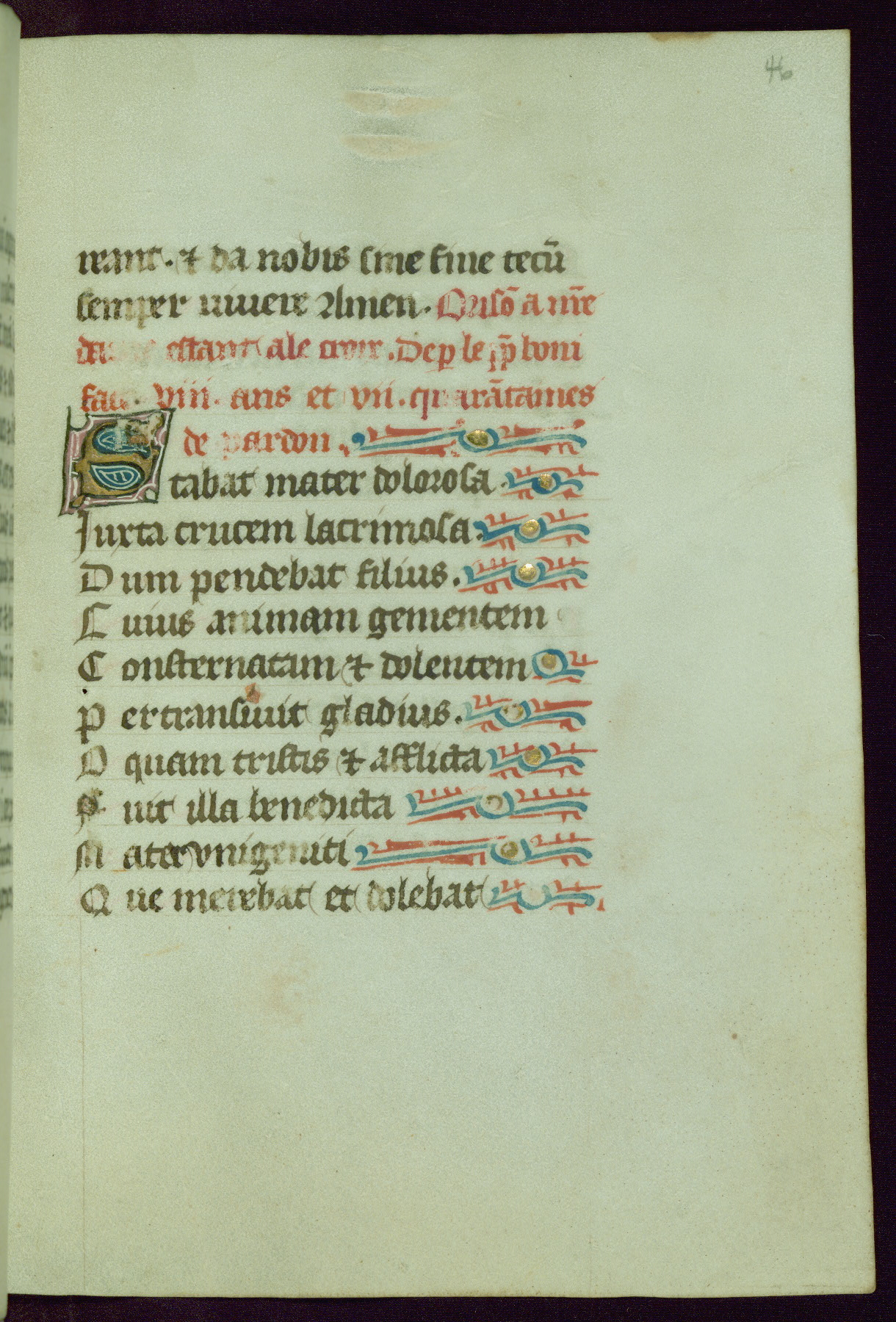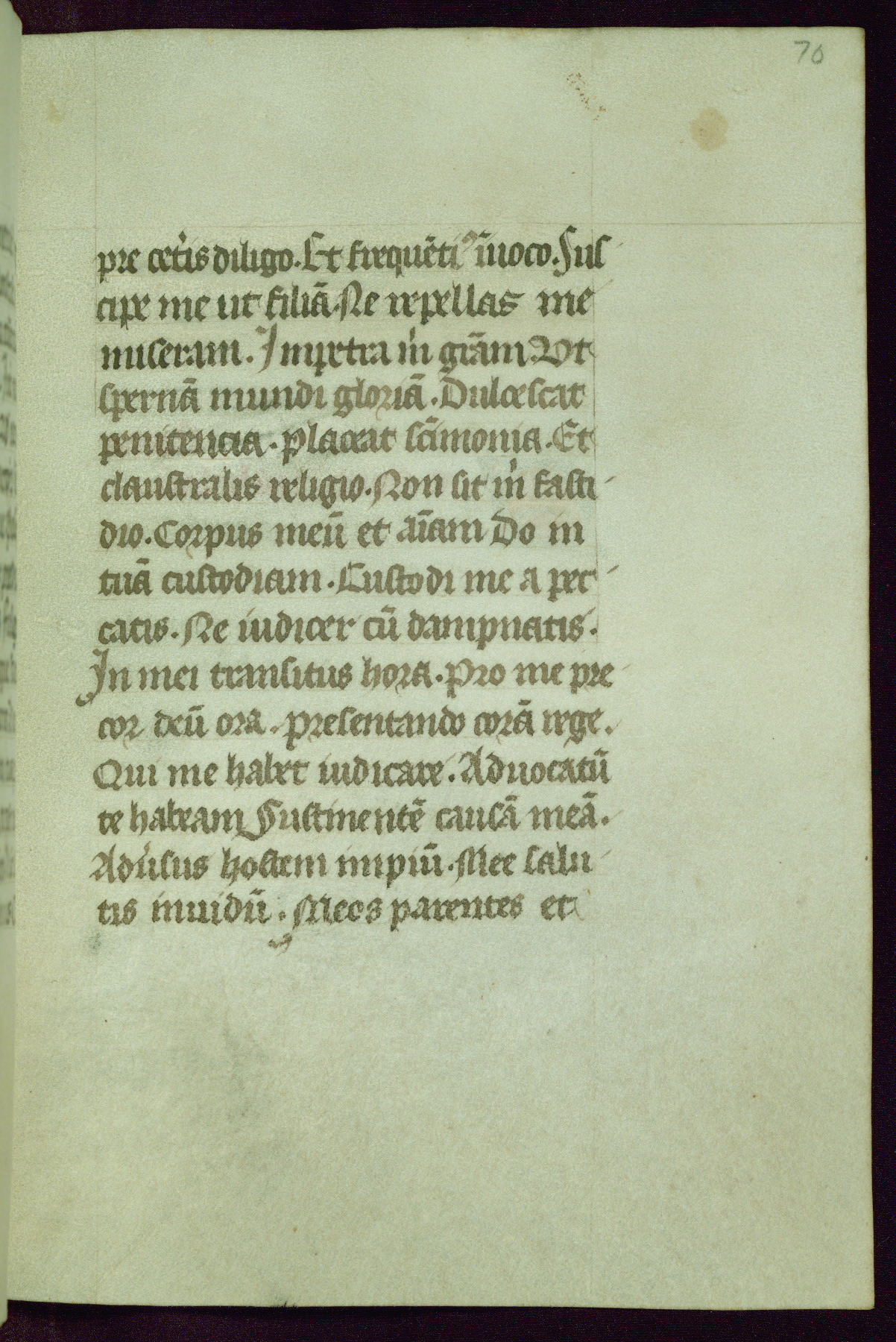 This Book of Hours was created ca. 1440 in Hainaut for a female patron with Cistercian connections, which is suggested by long devotional sequences focused on the Passion of Christ and the Virgin, including indulgences, a litany with Cistercian affiliation, and various references to a female suppliant. Two devotional texts written by various scribes in Latin and French were added to the front and back of the book ca. 1450-1600. At the end of the front devotional text, on fol. 6v, there are sewing holes and strong impressions of a variety of pilgrim badges. The manuscript contains eight full-page miniatures, five of which were at some point protected by pieces of gauze that have been removed and are now in the WAM file.