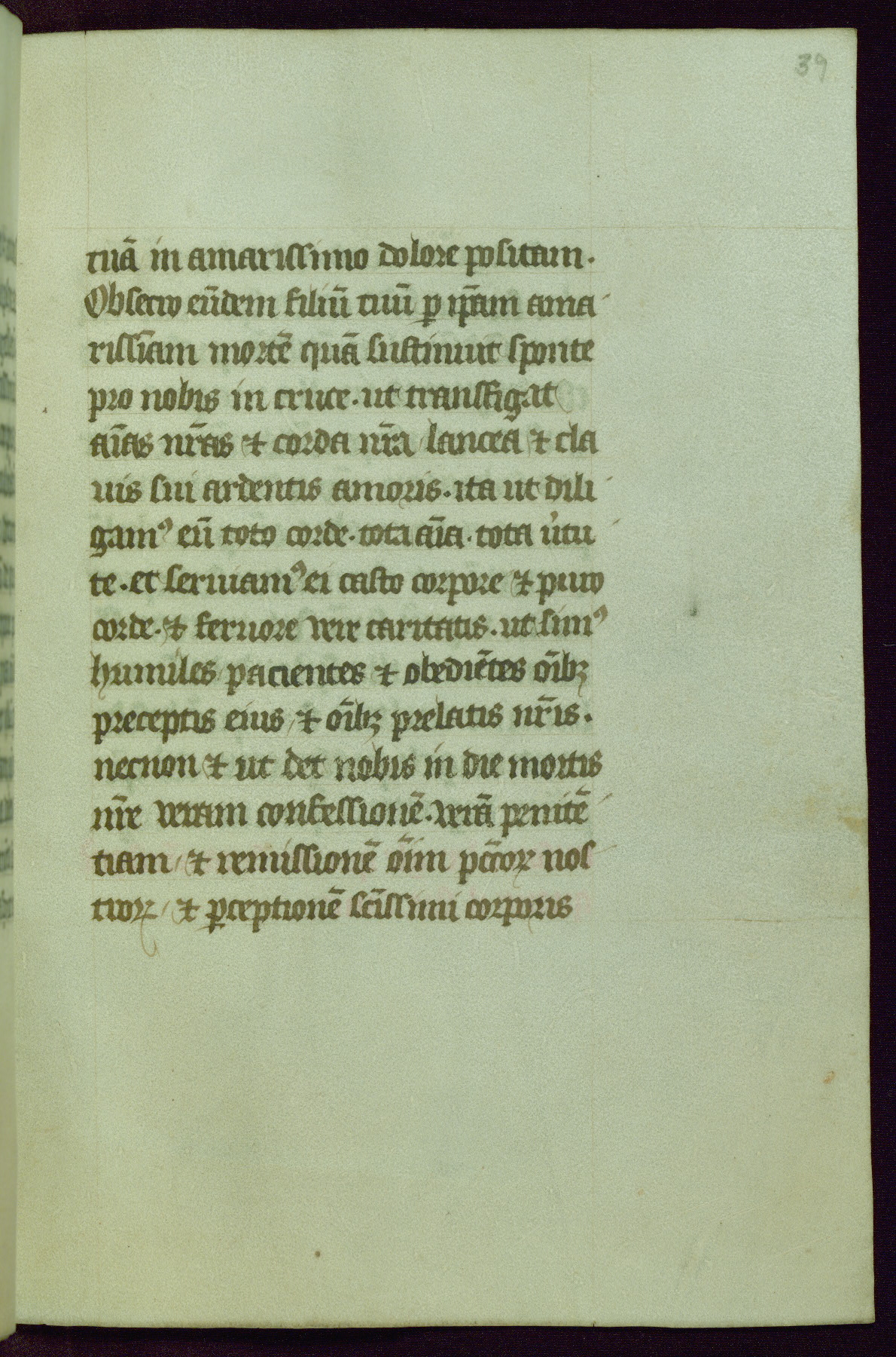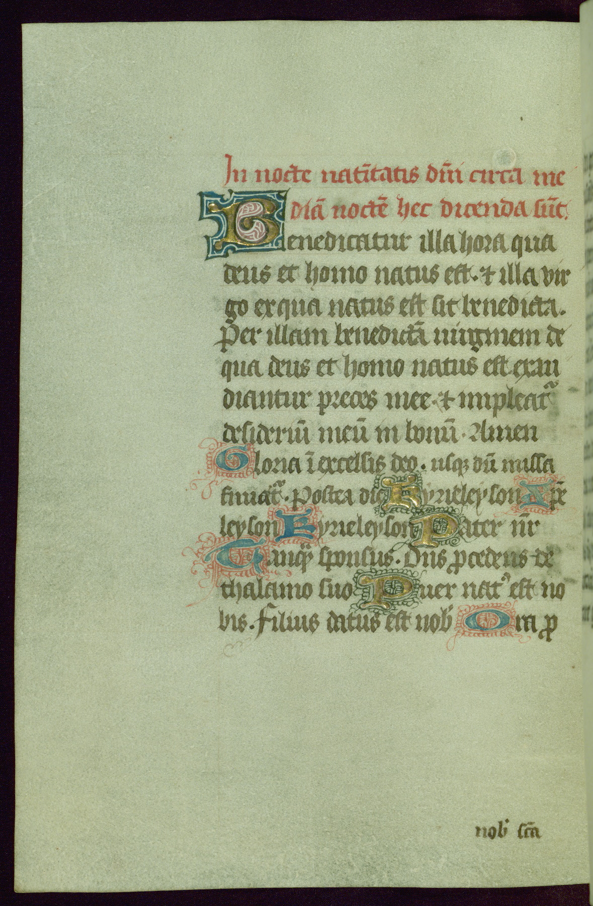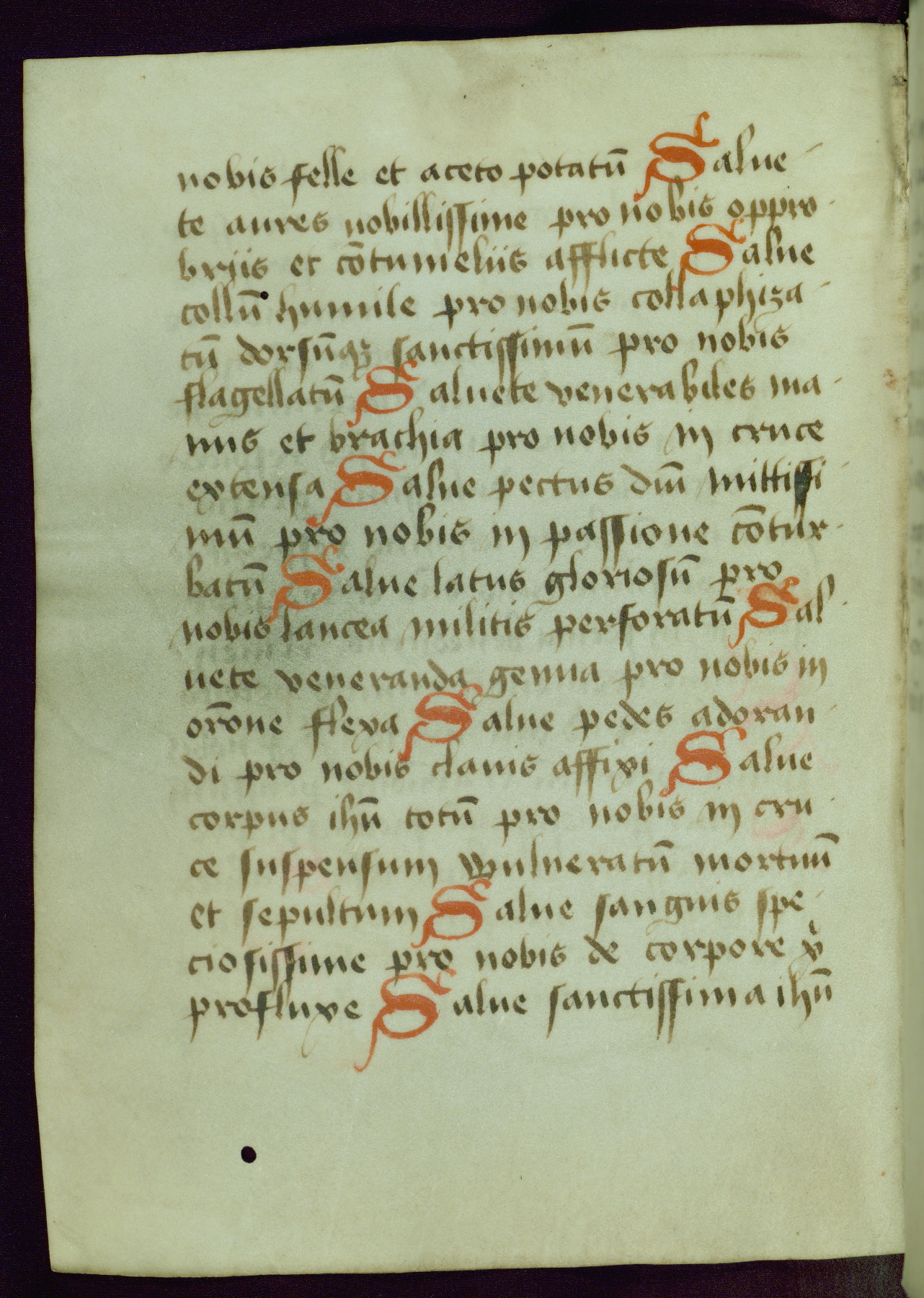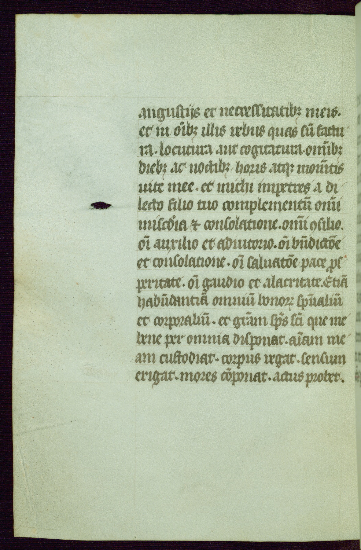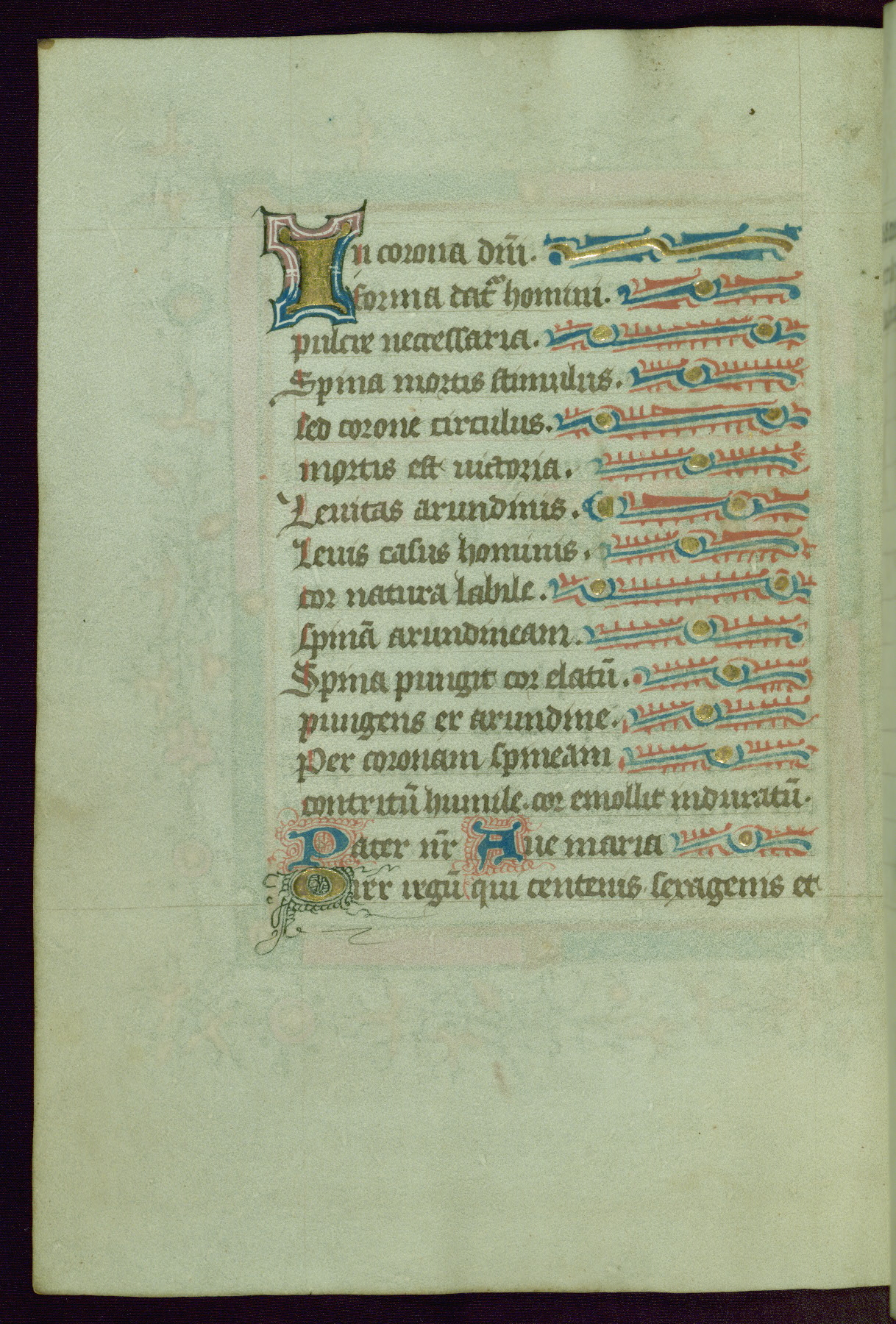 This Book of Hours was created ca. 1440 in Hainaut for a female patron with Cistercian connections, which is suggested by long devotional sequences focused on the Passion of Christ and the Virgin, including indulgences, a litany with Cistercian affiliation, and various references to a female suppliant. Two devotional texts written by various scribes in Latin and French were added to the front and back of the book ca. 1450-1600. At the end of the front devotional text, on fol. 6v, there are sewing holes and strong impressions of a variety of pilgrim badges. The manuscript contains eight full-page miniatures, five of which were at some point protected by pieces of gauze that have been removed and are now in the WAM file.