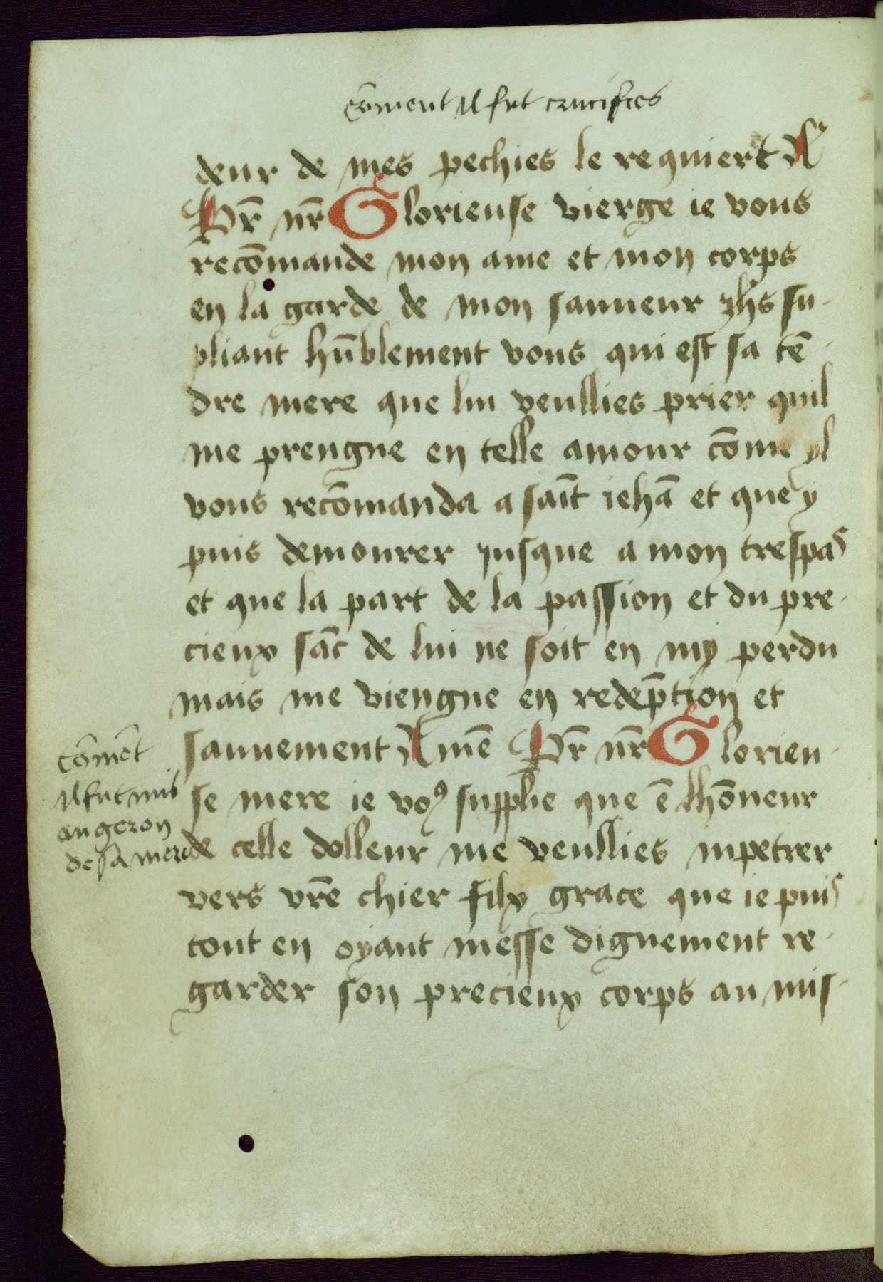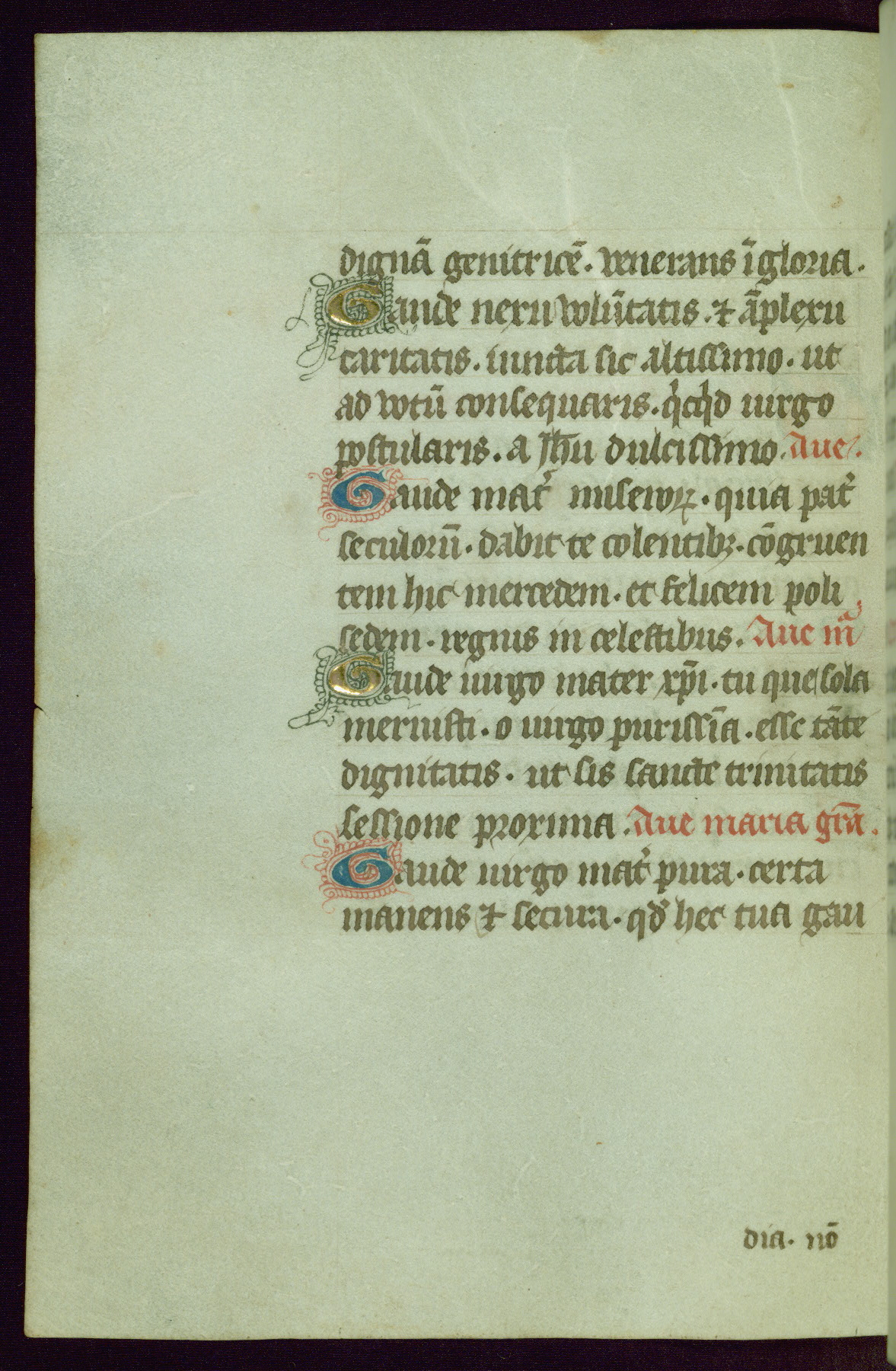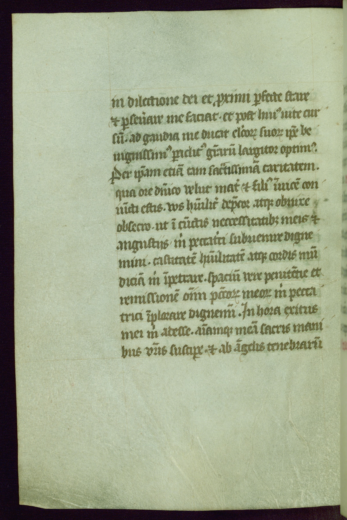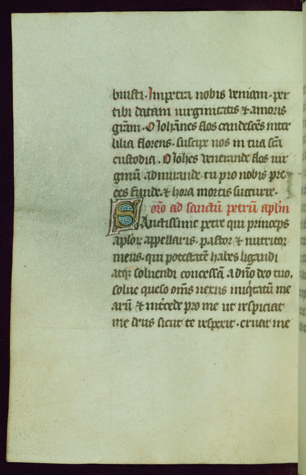 This Book of Hours was created ca. 1440 in Hainaut for a female patron with Cistercian connections, which is suggested by long devotional sequences focused on the Passion of Christ and the Virgin, including indulgences, a litany with Cistercian affiliation, and various references to a female suppliant. Two devotional texts written by various scribes in Latin and French were added to the front and back of the book ca. 1450-1600. At the end of the front devotional text, on fol. 6v, there are sewing holes and strong impressions of a variety of pilgrim badges. The manuscript contains eight full-page miniatures, five of which were at some point protected by pieces of gauze that have been removed and are now in the WAM file.