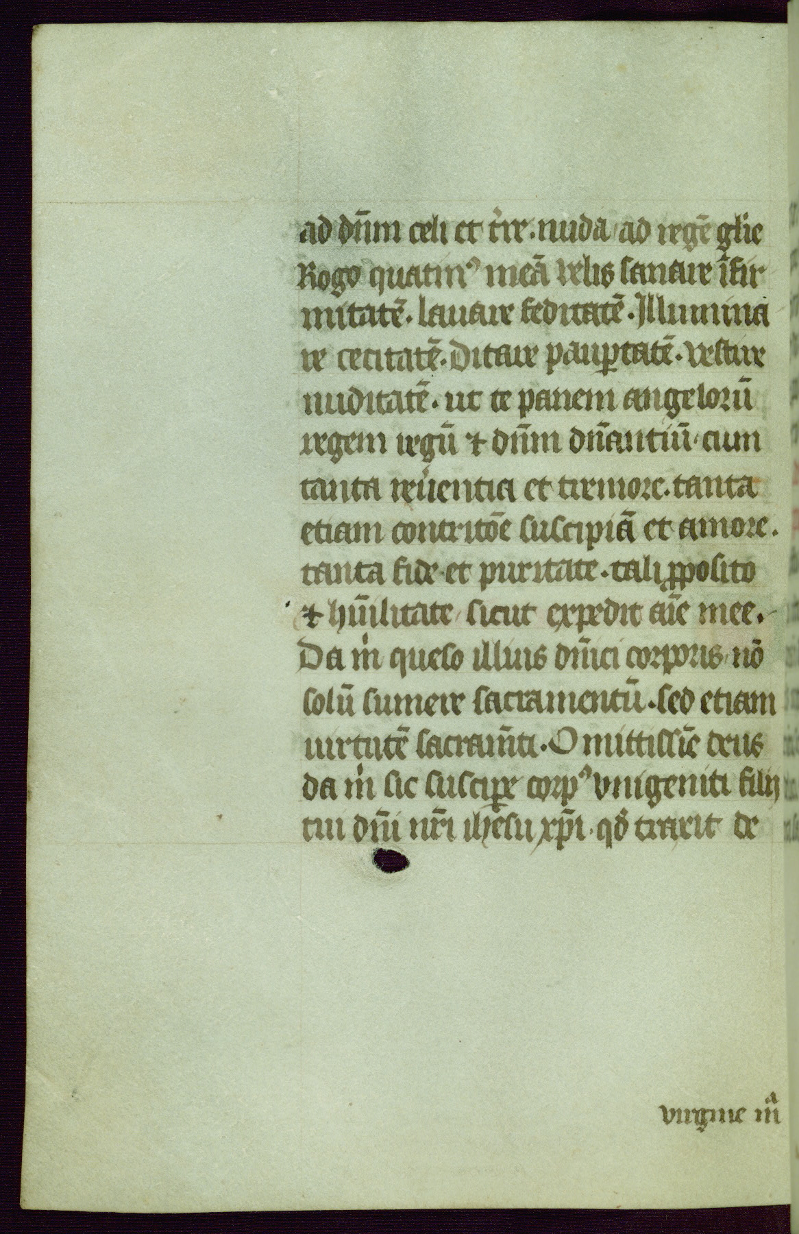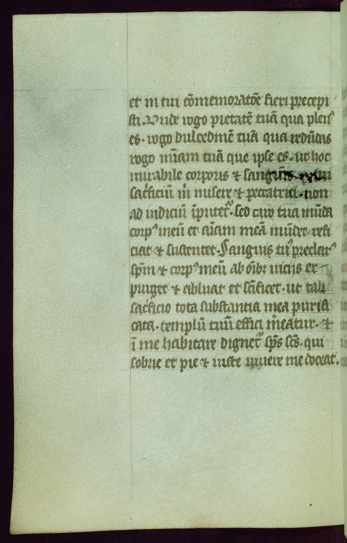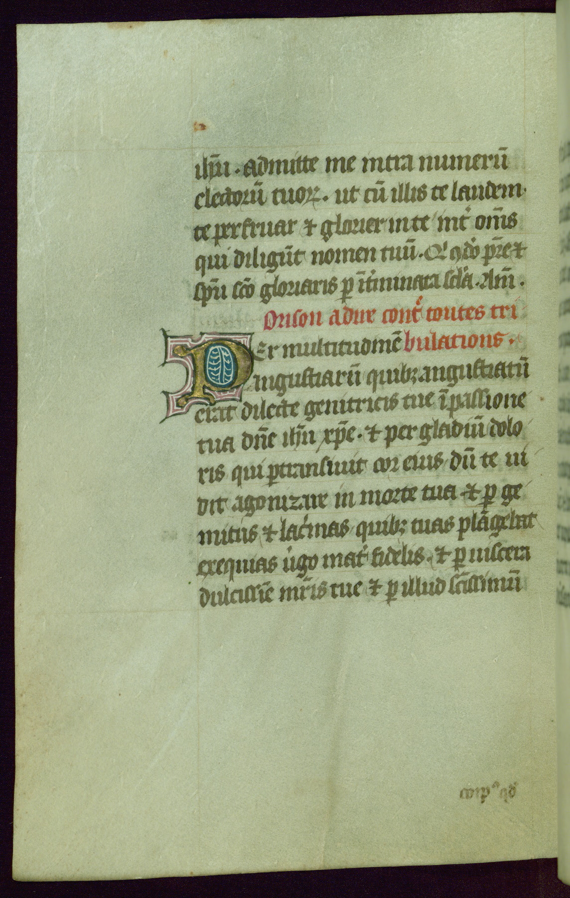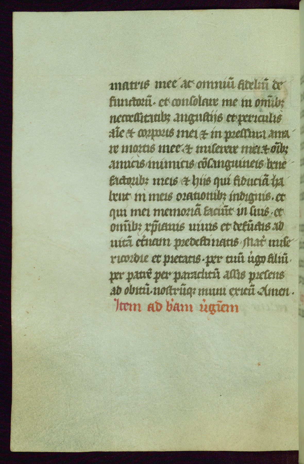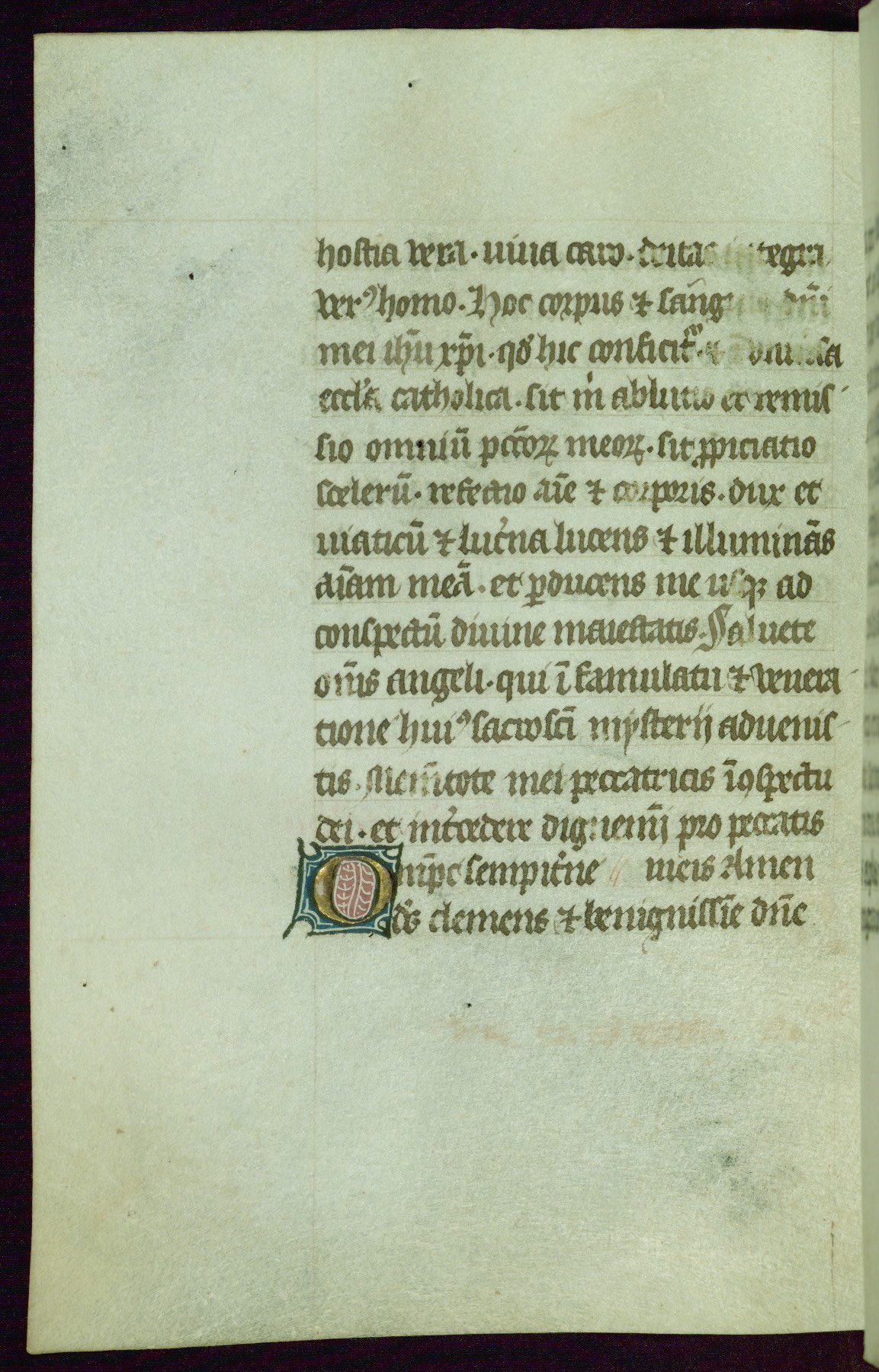 This Book of Hours was created ca. 1440 in Hainaut for a female patron with Cistercian connections, which is suggested by long devotional sequences focused on the Passion of Christ and the Virgin, including indulgences, a litany with Cistercian affiliation, and various references to a female suppliant. Two devotional texts written by various scribes in Latin and French were added to the front and back of the book ca. 1450-1600. At the end of the front devotional text, on fol. 6v, there are sewing holes and strong impressions of a variety of pilgrim badges. The manuscript contains eight full-page miniatures, five of which were at some point protected by pieces of gauze that have been removed and are now in the WAM file.