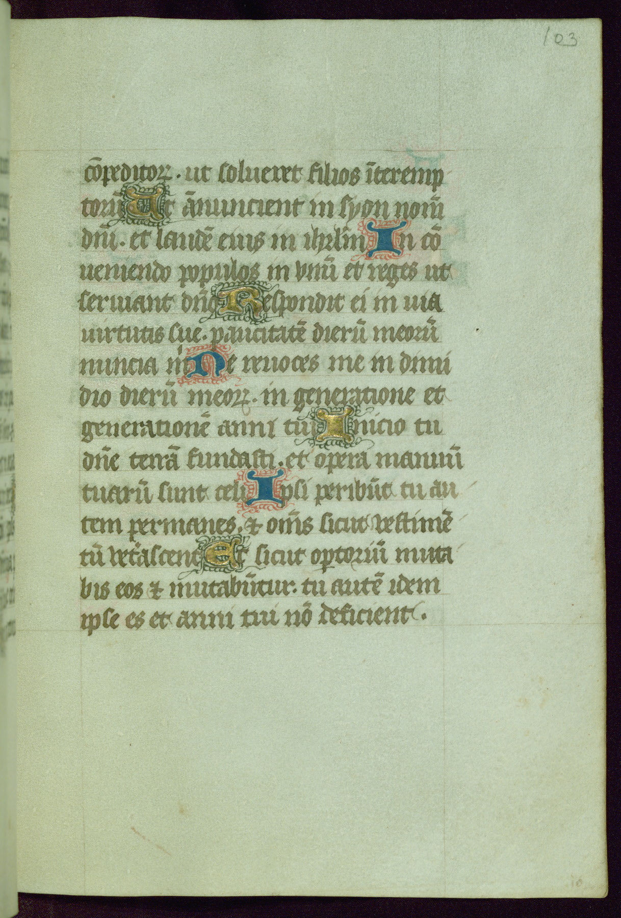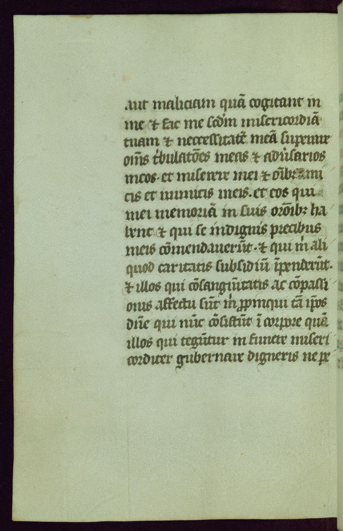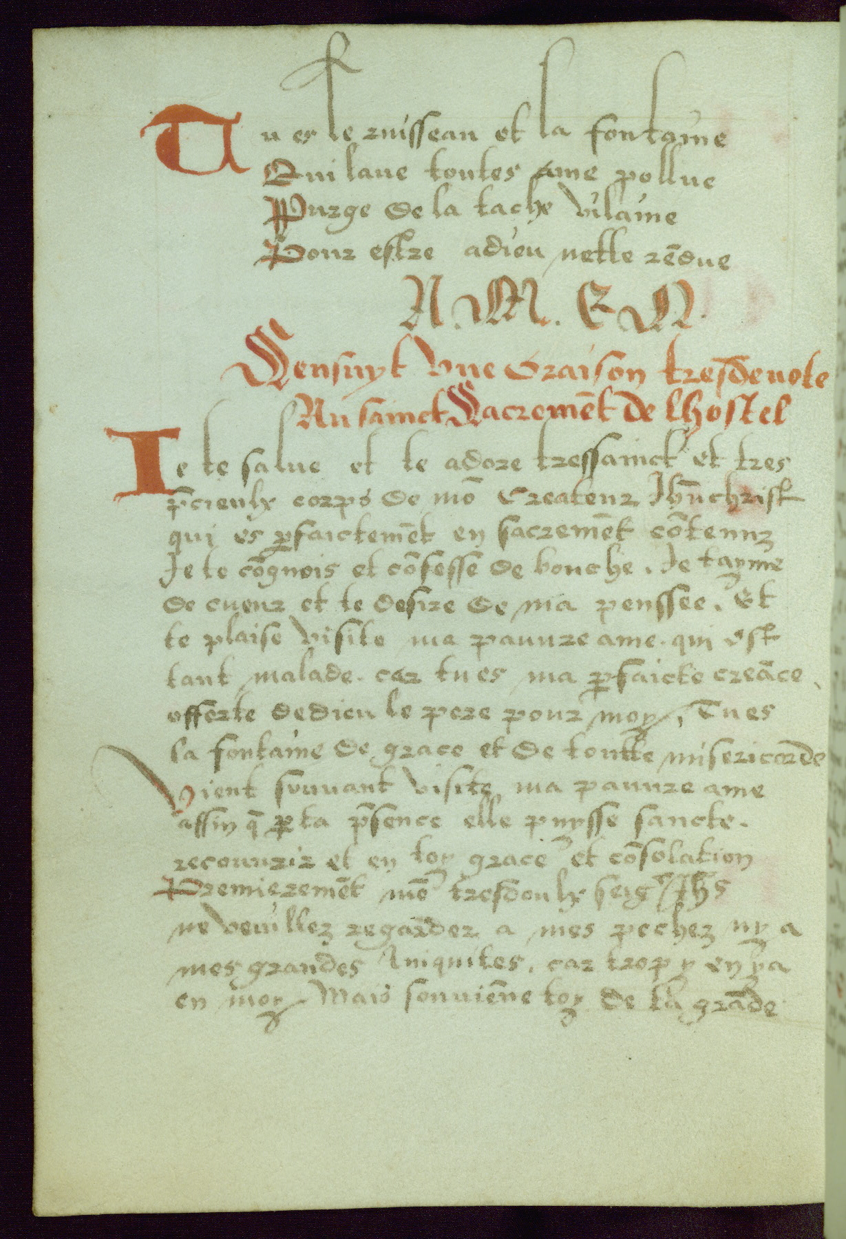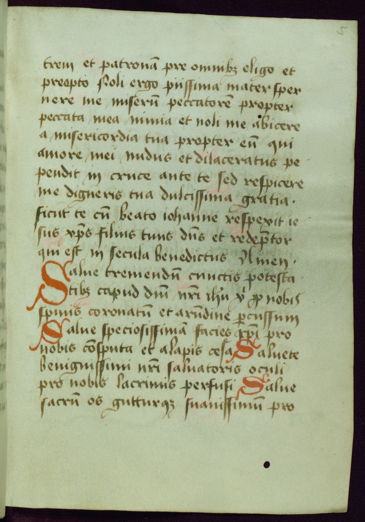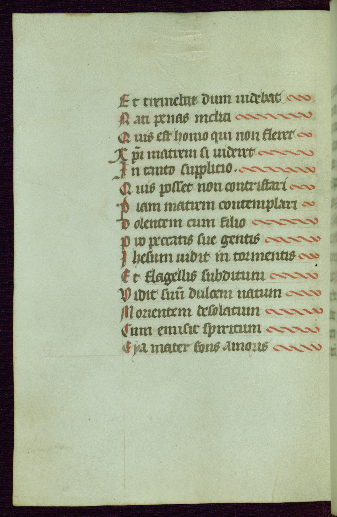 This Book of Hours was created ca. 1440 in Hainaut for a female patron with Cistercian connections, which is suggested by long devotional sequences focused on the Passion of Christ and the Virgin, including indulgences, a litany with Cistercian affiliation, and various references to a female suppliant. Two devotional texts written by various scribes in Latin and French were added to the front and back of the book ca. 1450-1600. At the end of the front devotional text, on fol. 6v, there are sewing holes and strong impressions of a variety of pilgrim badges. The manuscript contains eight full-page miniatures, five of which were at some point protected by pieces of gauze that have been removed and are now in the WAM file.