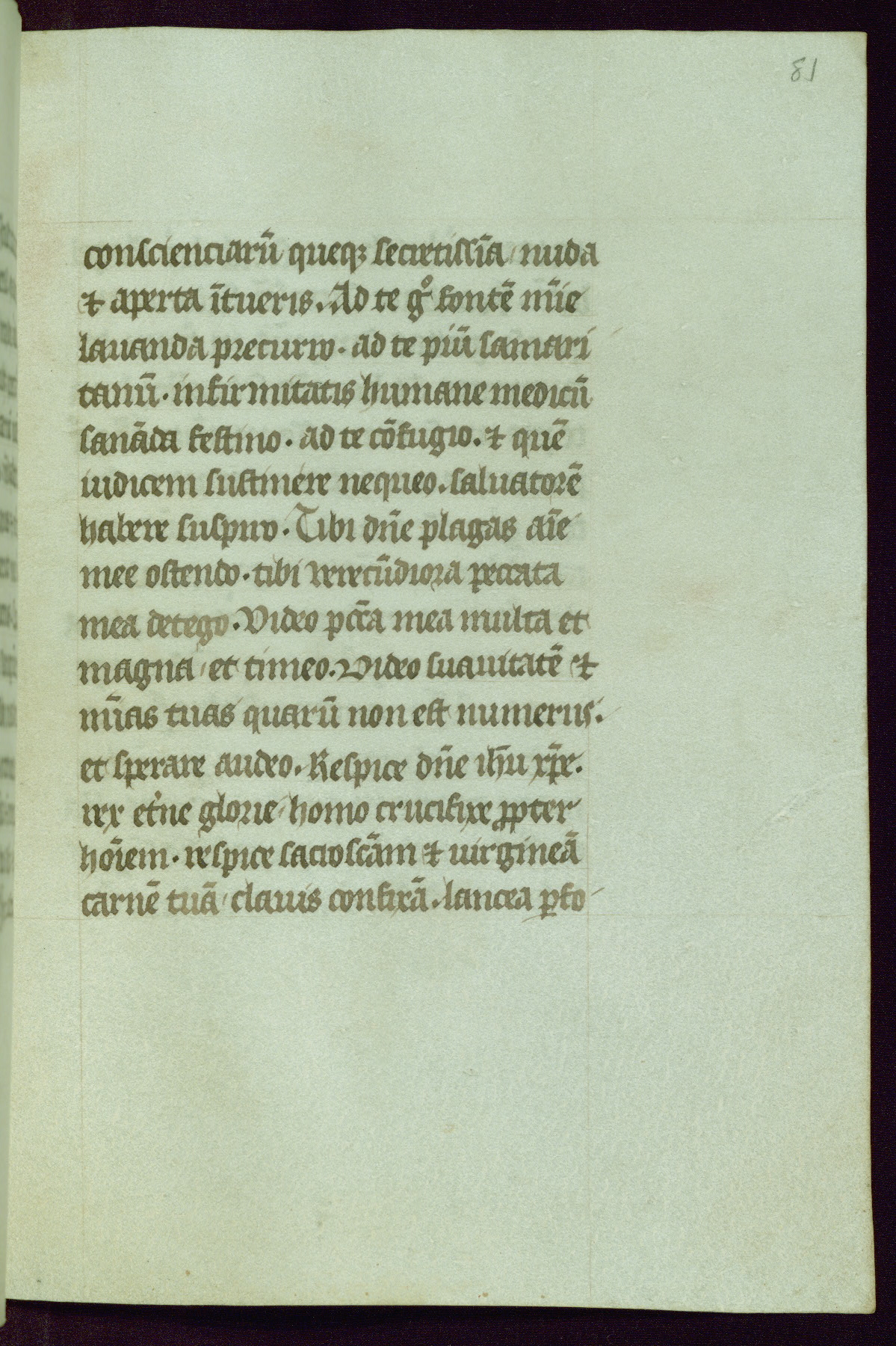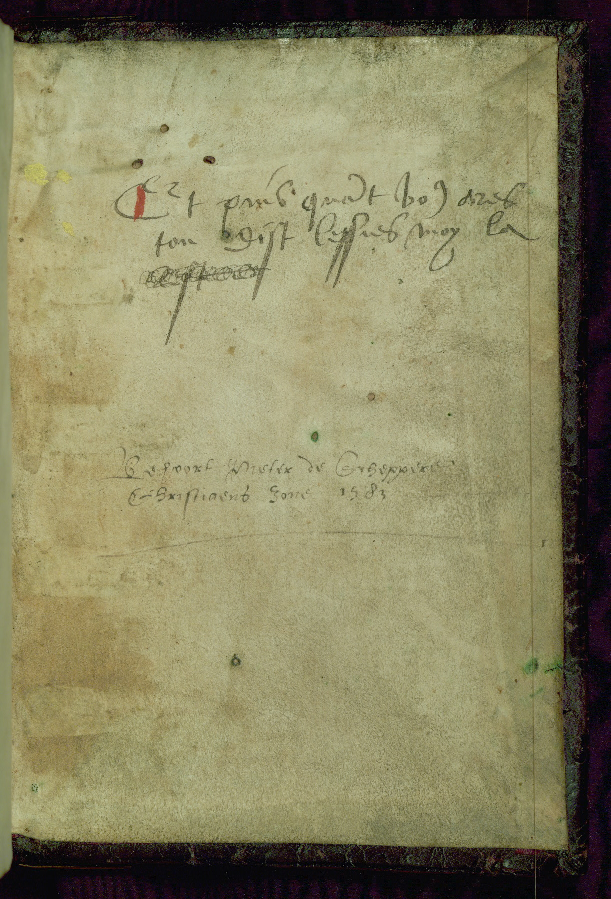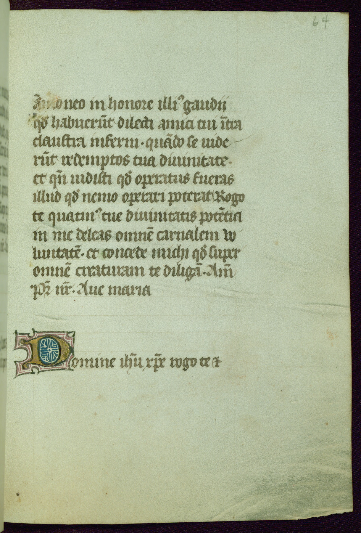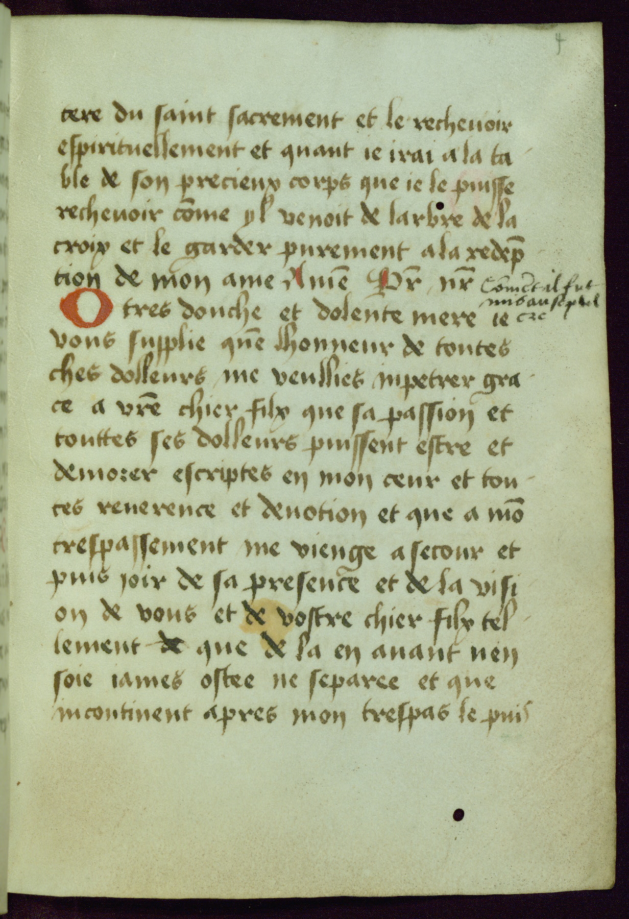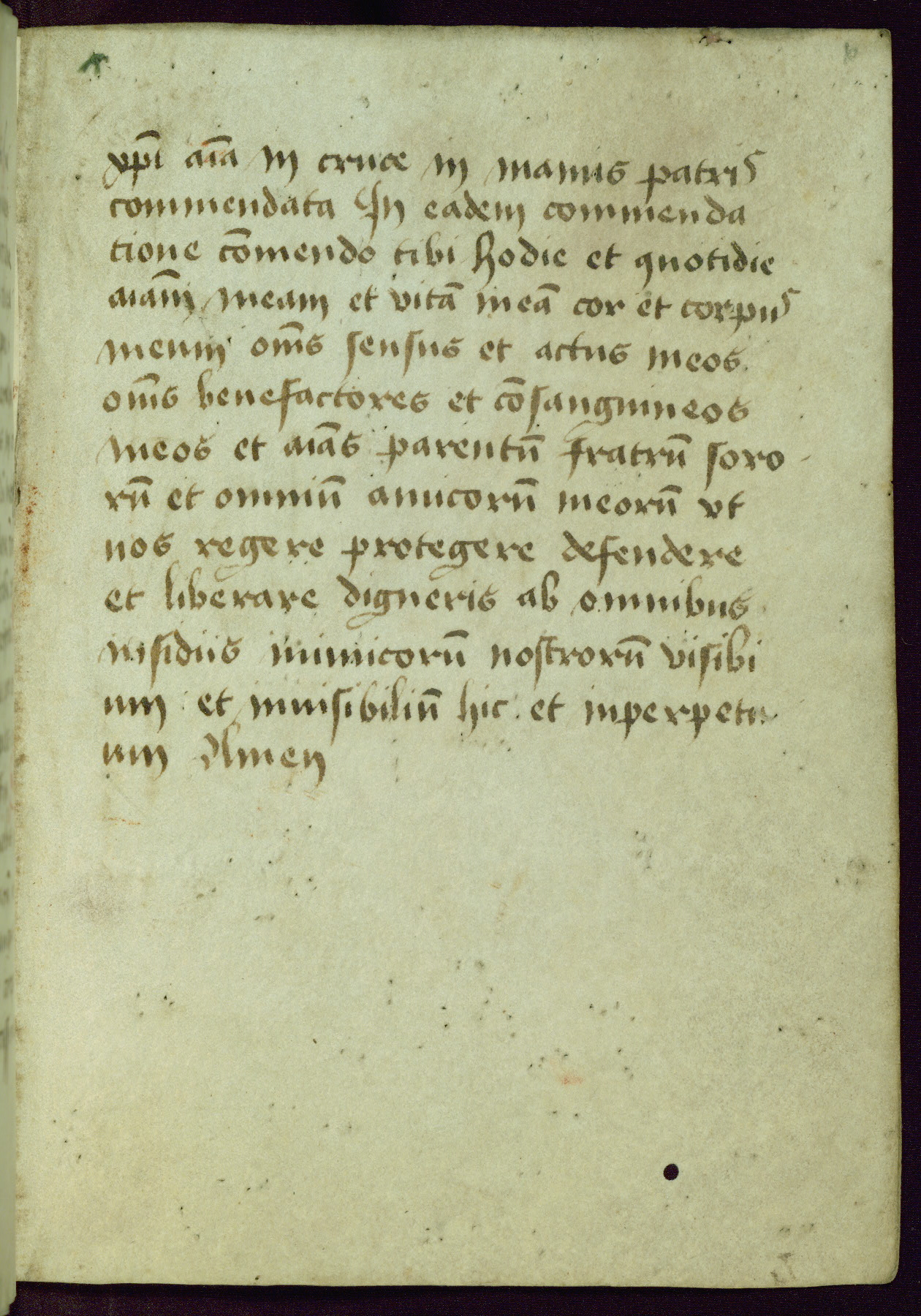 This Book of Hours was created ca. 1440 in Hainaut for a female patron with Cistercian connections, which is suggested by long devotional sequences focused on the Passion of Christ and the Virgin, including indulgences, a litany with Cistercian affiliation, and various references to a female suppliant. Two devotional texts written by various scribes in Latin and French were added to the front and back of the book ca. 1450-1600. At the end of the front devotional text, on fol. 6v, there are sewing holes and strong impressions of a variety of pilgrim badges. The manuscript contains eight full-page miniatures, five of which were at some point protected by pieces of gauze that have been removed and are now in the WAM file.
