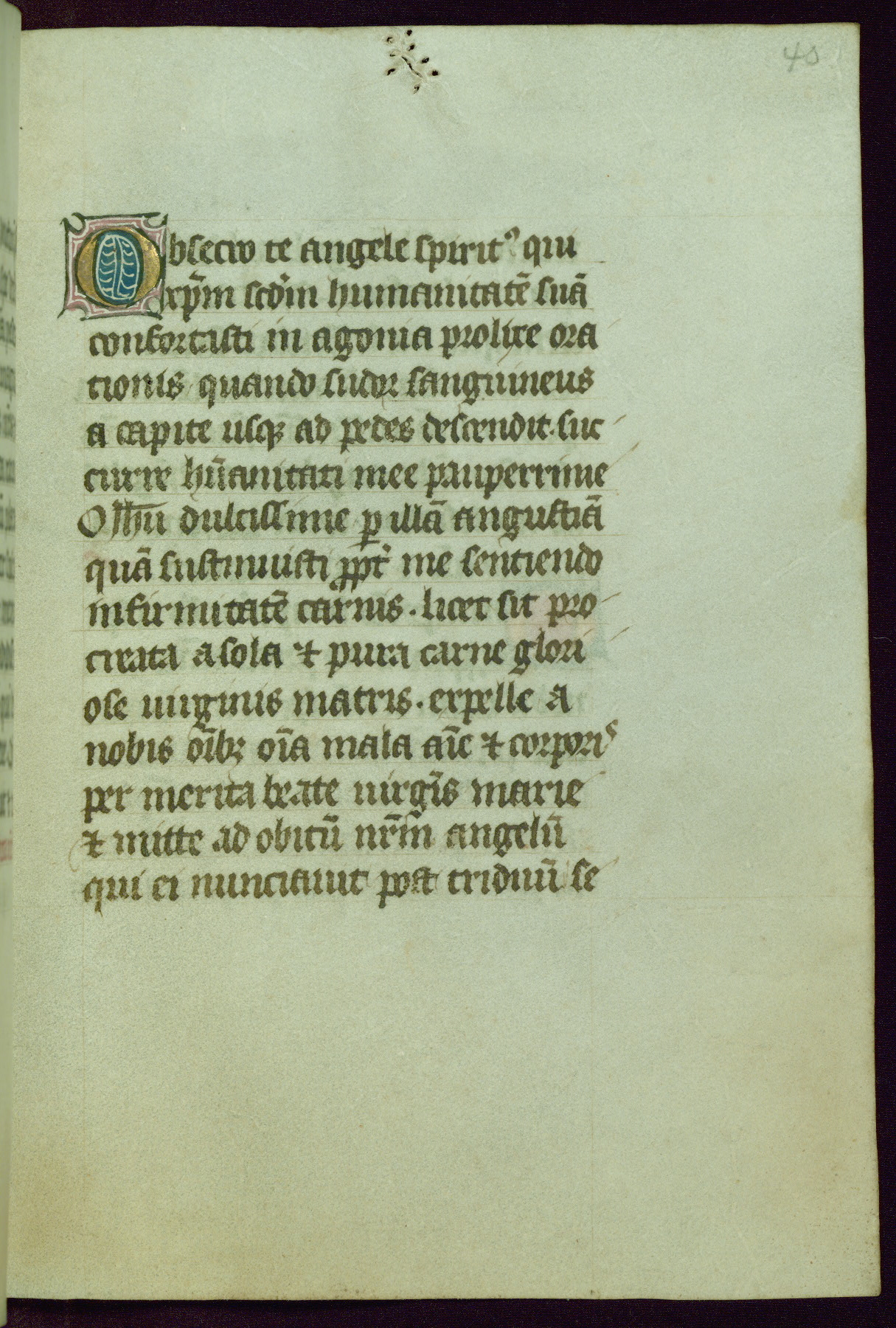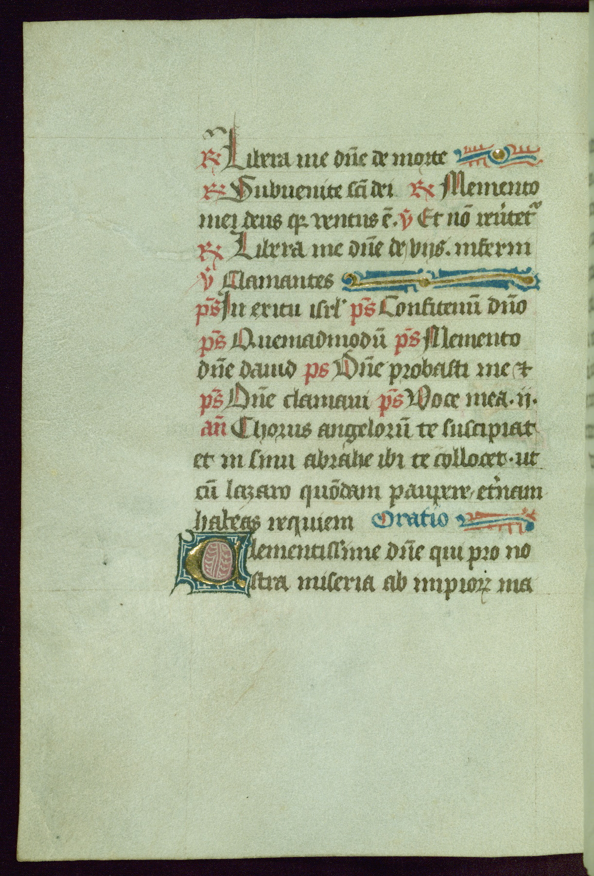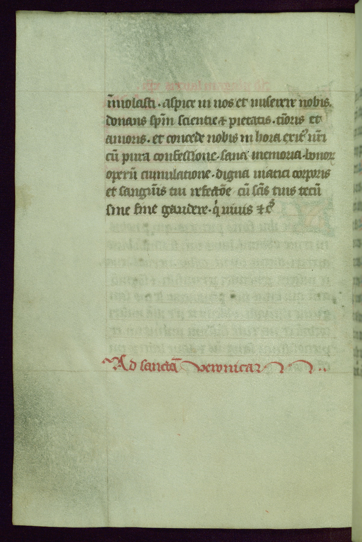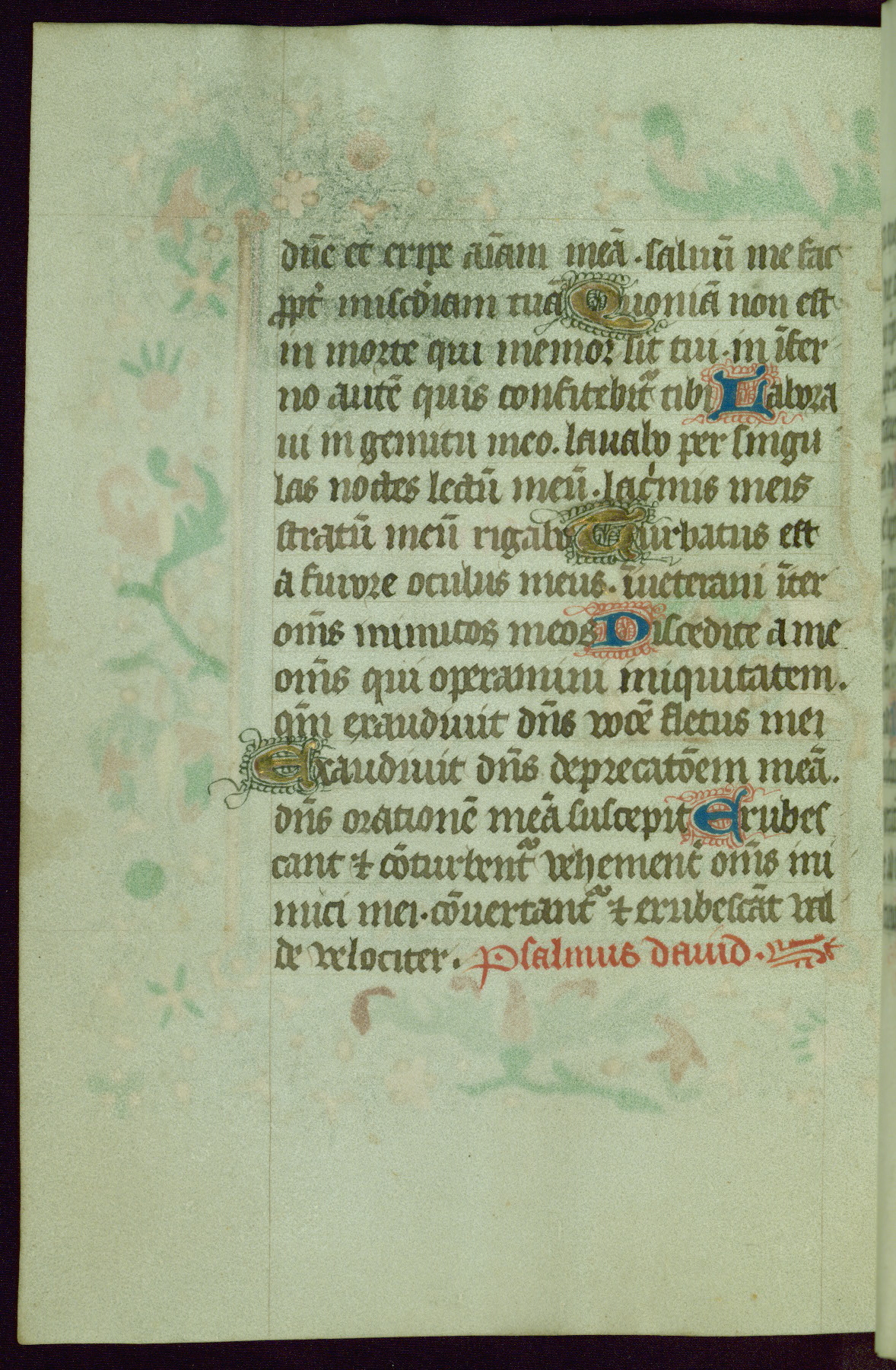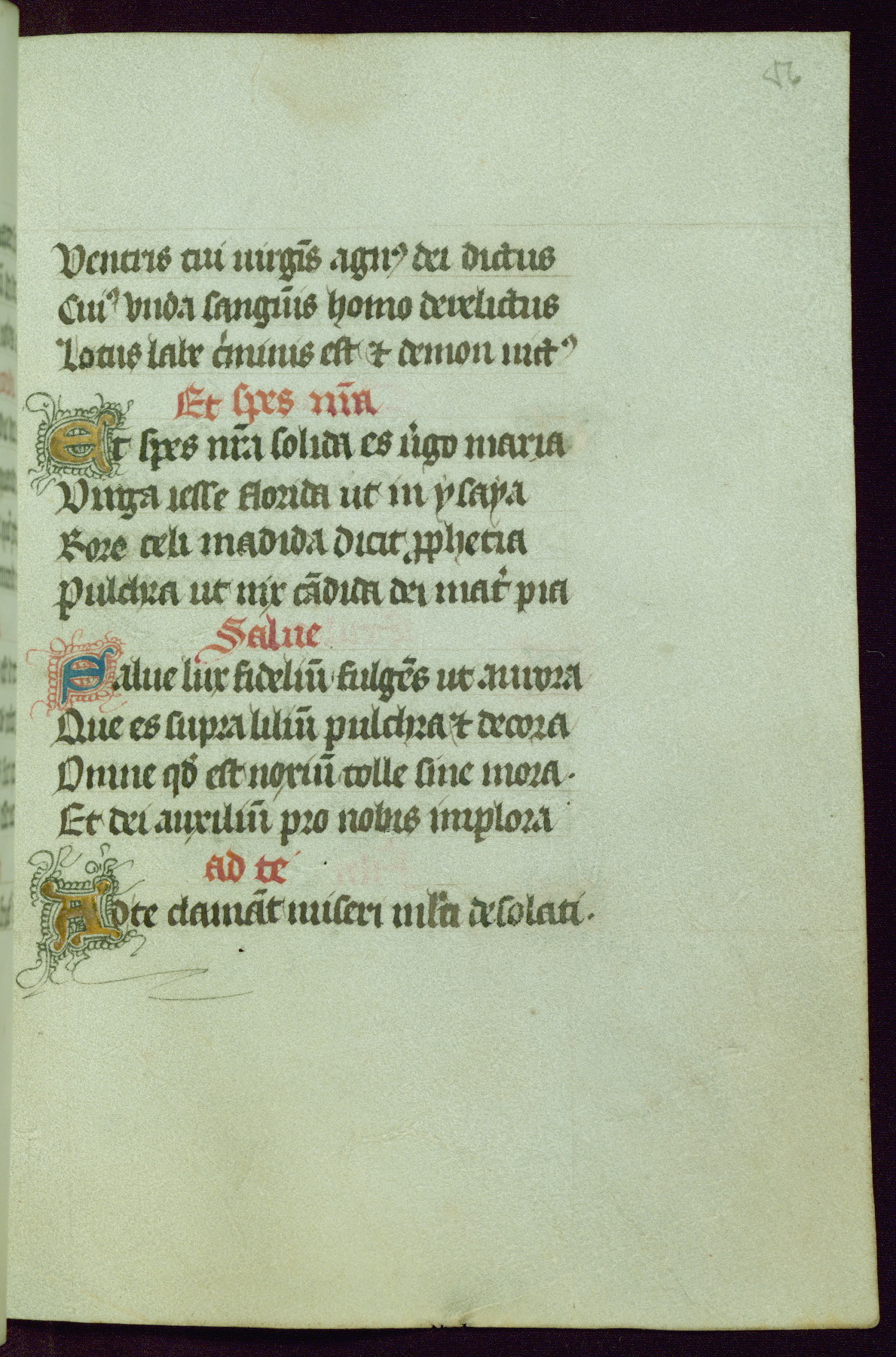 This Book of Hours was created ca. 1440 in Hainaut for a female patron with Cistercian connections, which is suggested by long devotional sequences focused on the Passion of Christ and the Virgin, including indulgences, a litany with Cistercian affiliation, and various references to a female suppliant. Two devotional texts written by various scribes in Latin and French were added to the front and back of the book ca. 1450-1600. At the end of the front devotional text, on fol. 6v, there are sewing holes and strong impressions of a variety of pilgrim badges. The manuscript contains eight full-page miniatures, five of which were at some point protected by pieces of gauze that have been removed and are now in the WAM file.