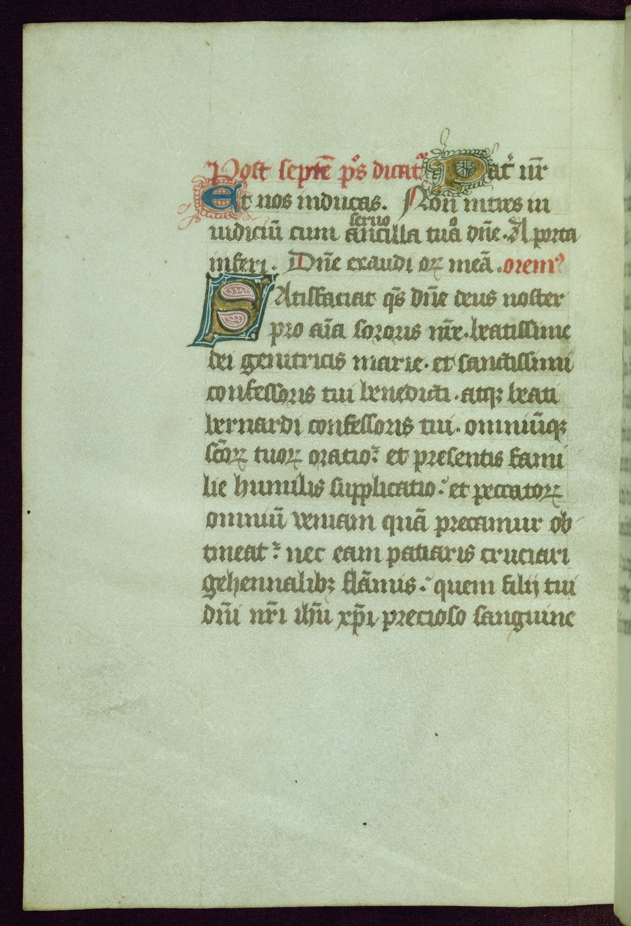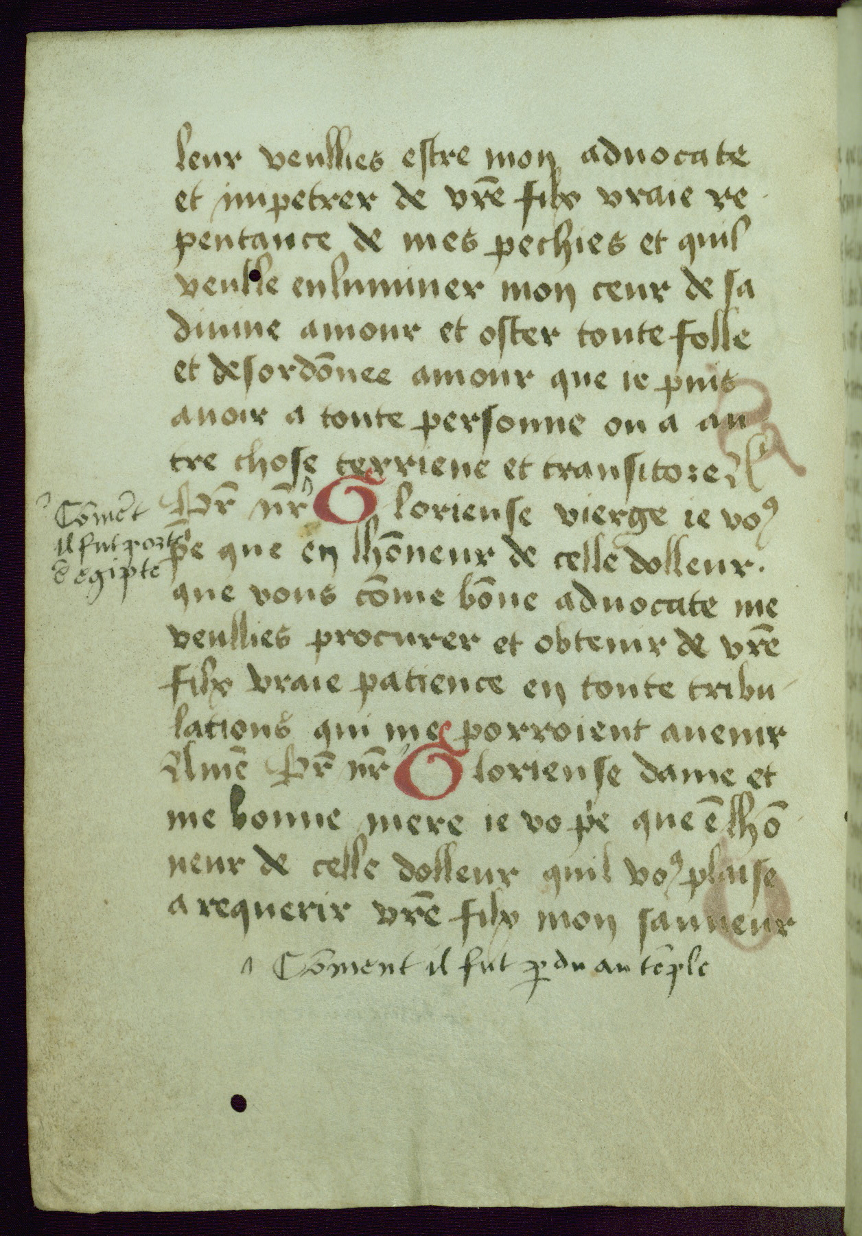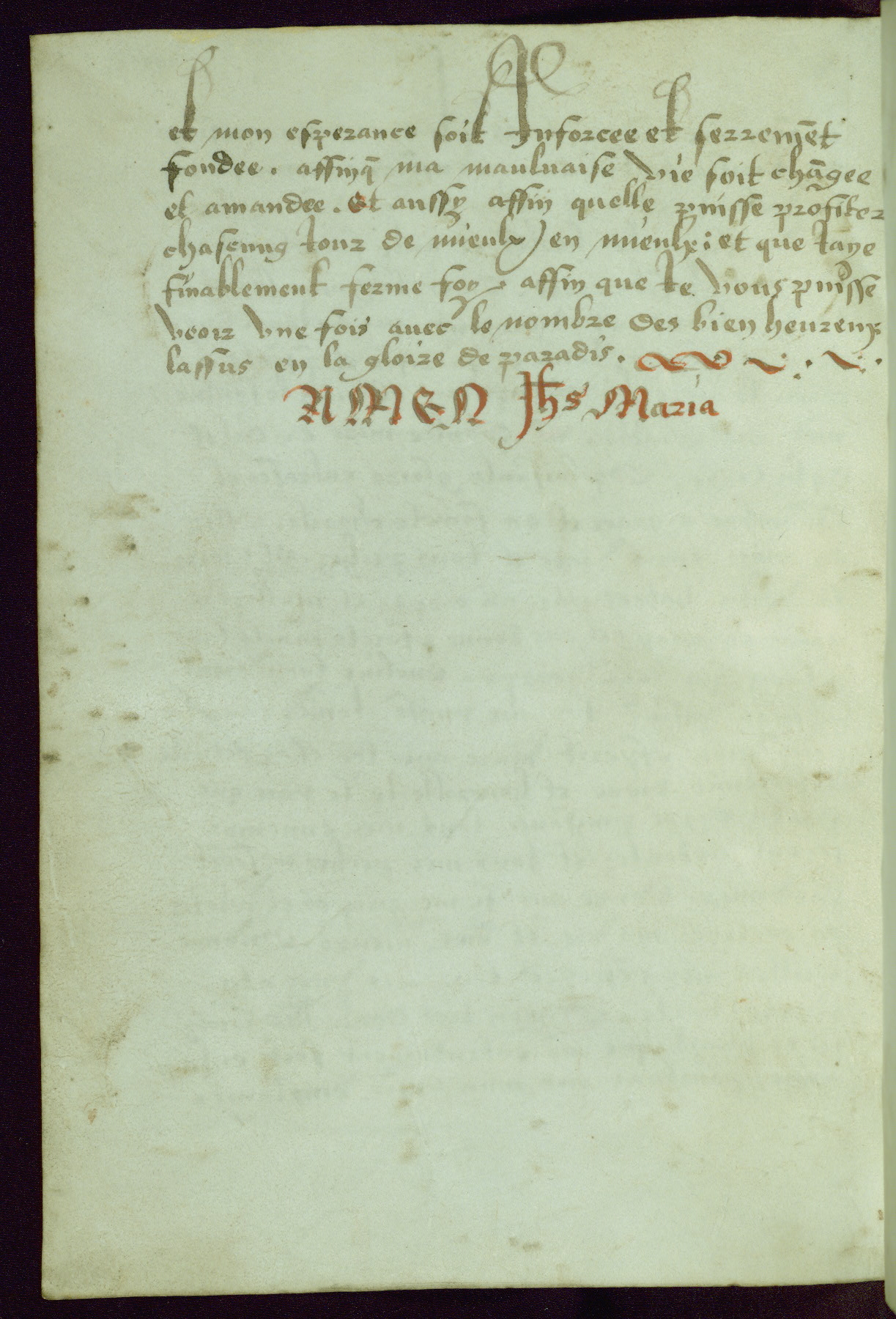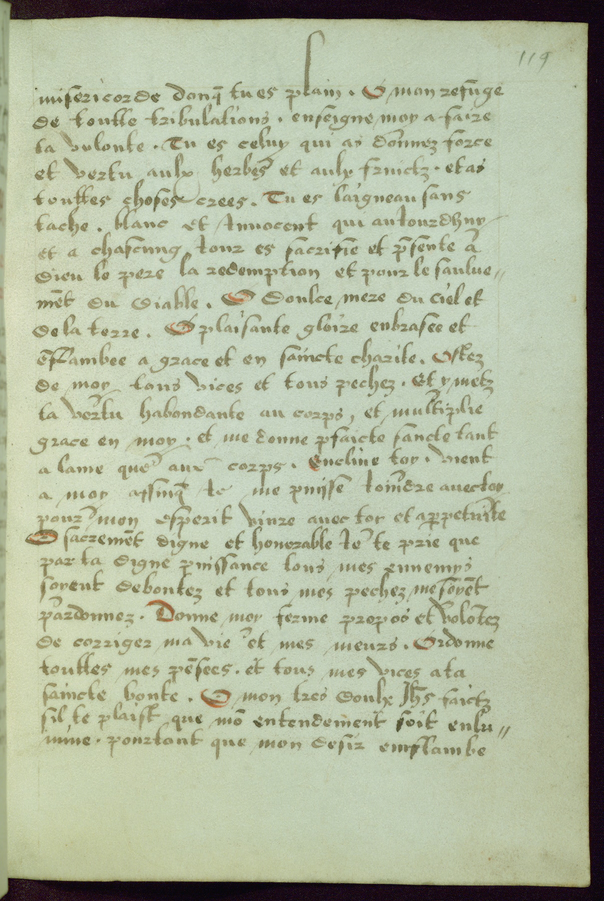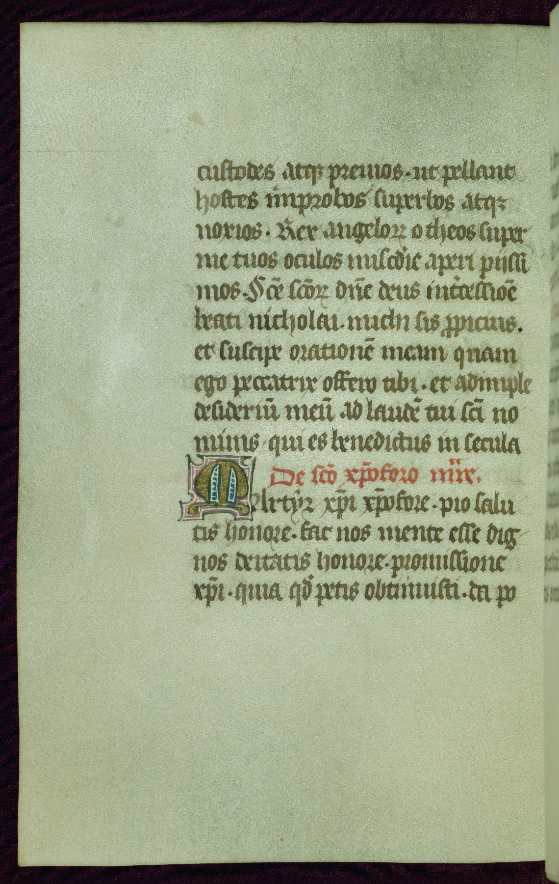 This Book of Hours was created ca. 1440 in Hainaut for a female patron with Cistercian connections, which is suggested by long devotional sequences focused on the Passion of Christ and the Virgin, including indulgences, a litany with Cistercian affiliation, and various references to a female suppliant. Two devotional texts written by various scribes in Latin and French were added to the front and back of the book ca. 1450-1600. At the end of the front devotional text, on fol. 6v, there are sewing holes and strong impressions of a variety of pilgrim badges. The manuscript contains eight full-page miniatures, five of which were at some point protected by pieces of gauze that have been removed and are now in the WAM file.