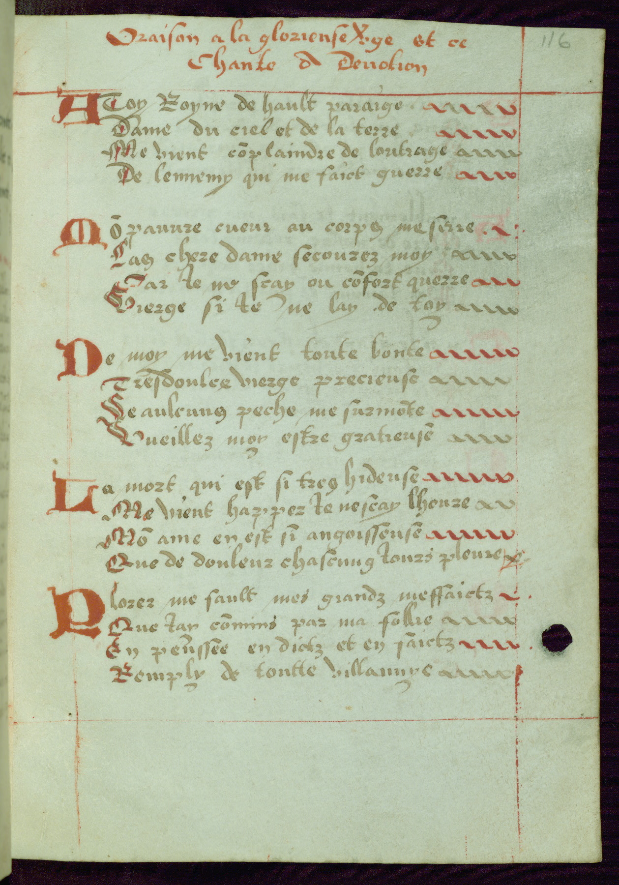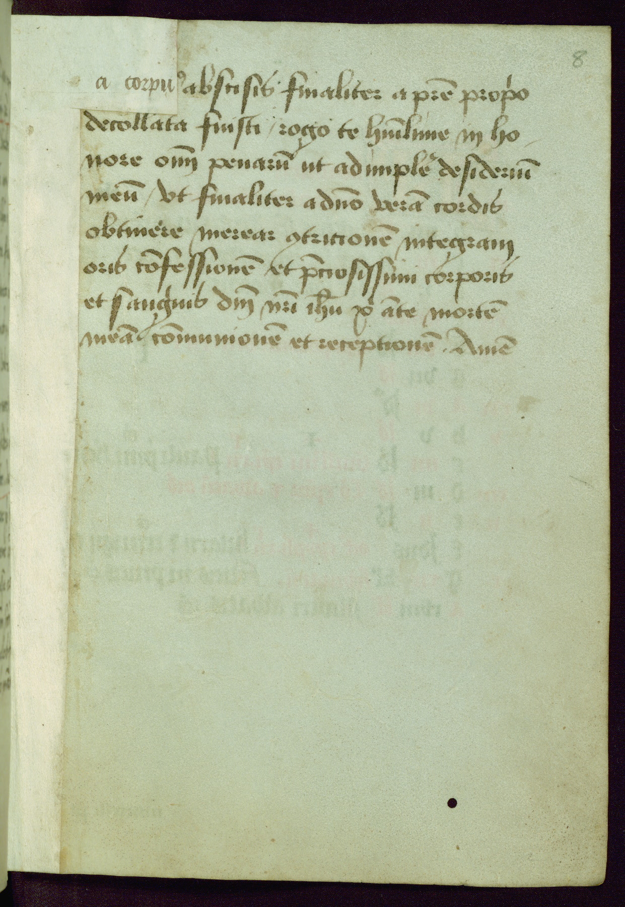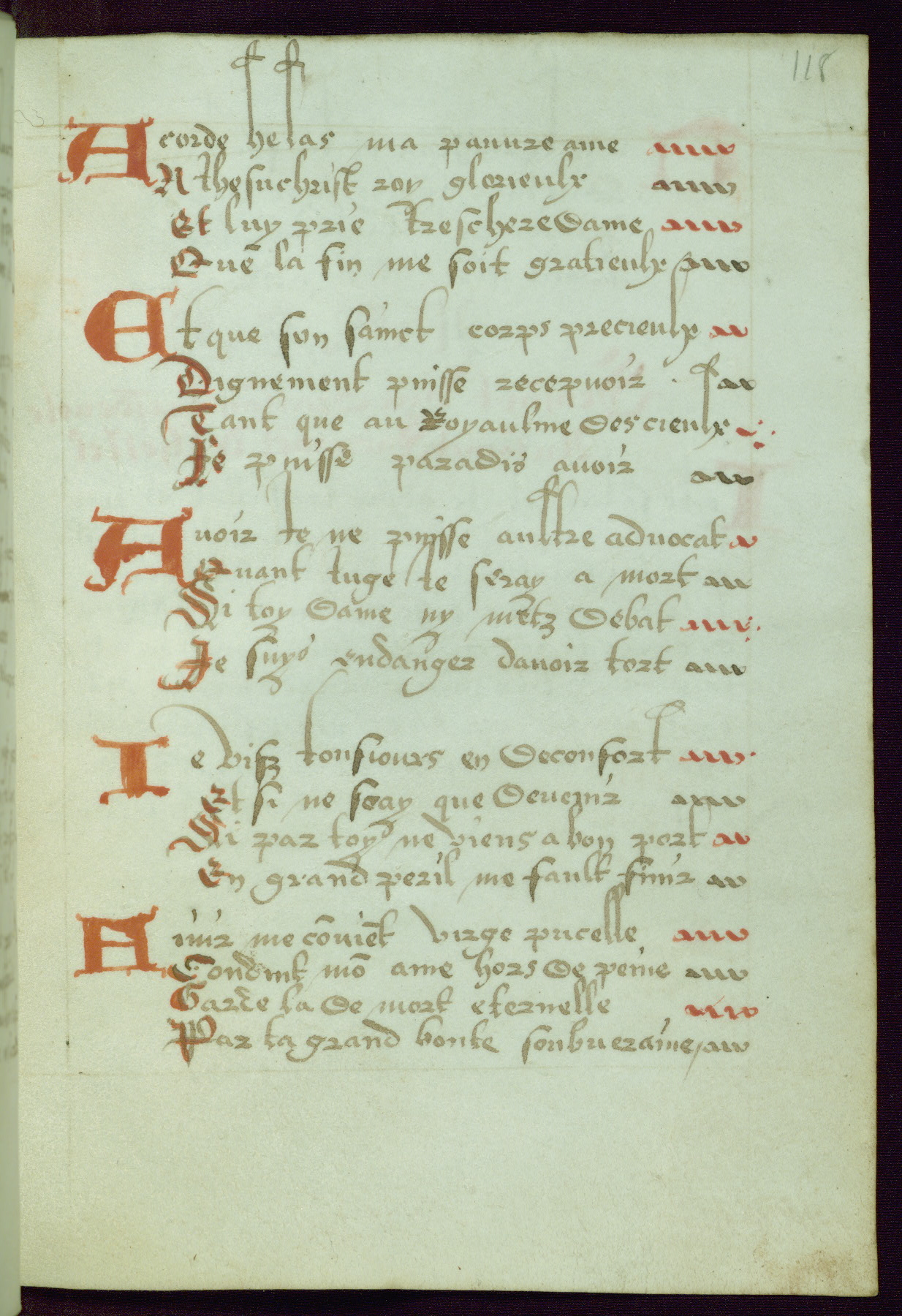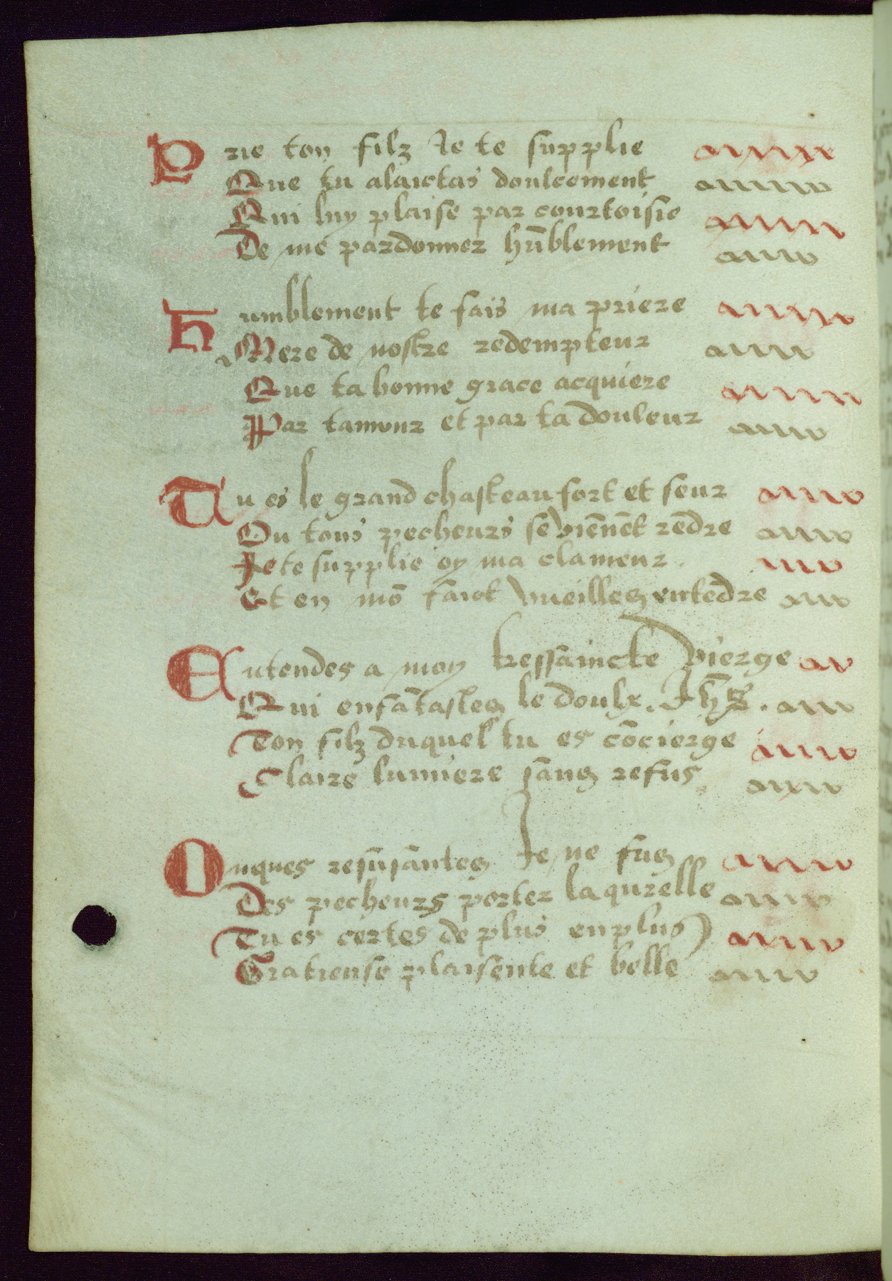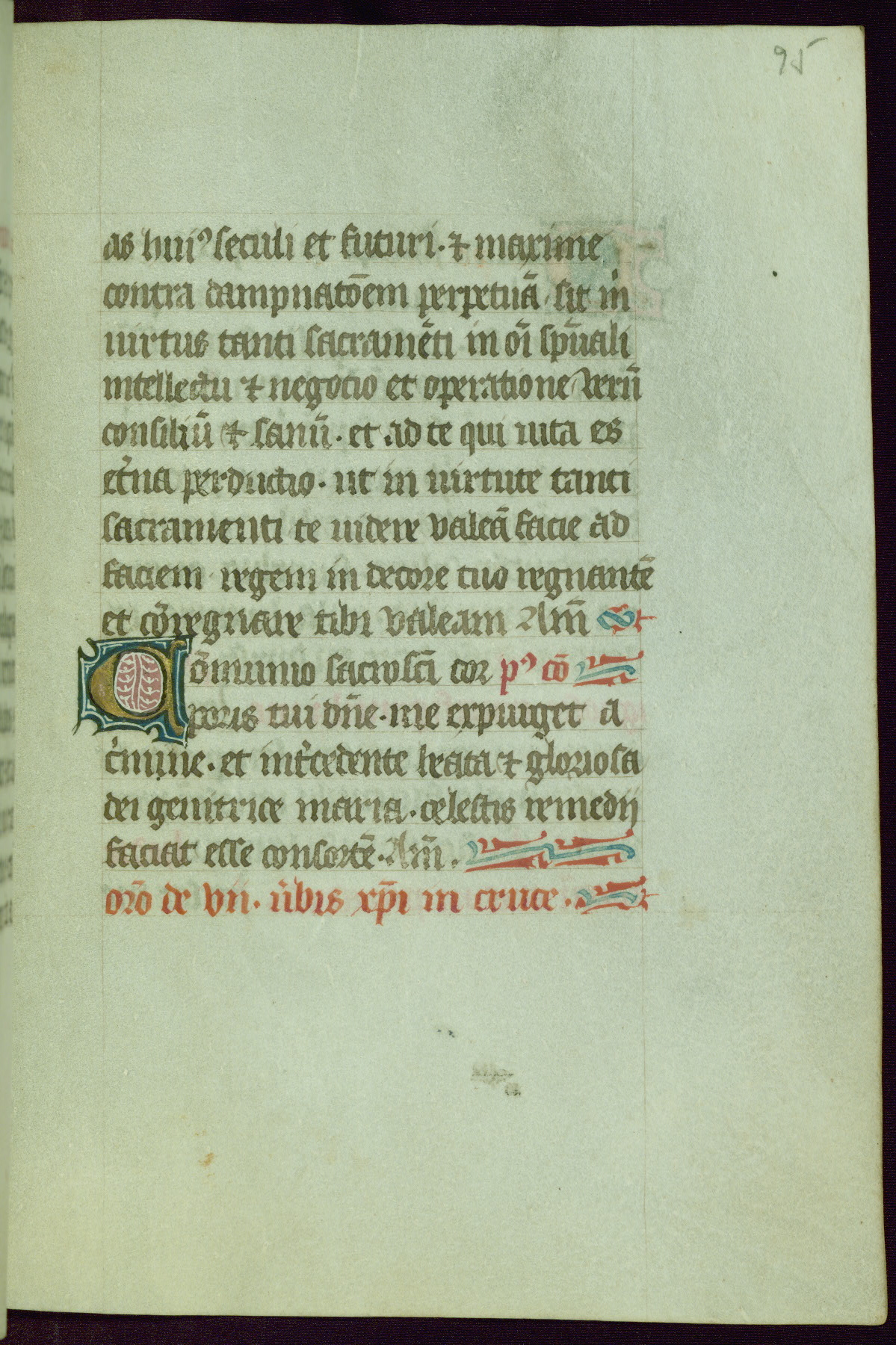 This Book of Hours was created ca. 1440 in Hainaut for a female patron with Cistercian connections, which is suggested by long devotional sequences focused on the Passion of Christ and the Virgin, including indulgences, a litany with Cistercian affiliation, and various references to a female suppliant. Two devotional texts written by various scribes in Latin and French were added to the front and back of the book ca. 1450-1600. At the end of the front devotional text, on fol. 6v, there are sewing holes and strong impressions of a variety of pilgrim badges. The manuscript contains eight full-page miniatures, five of which were at some point protected by pieces of gauze that have been removed and are now in the WAM file.