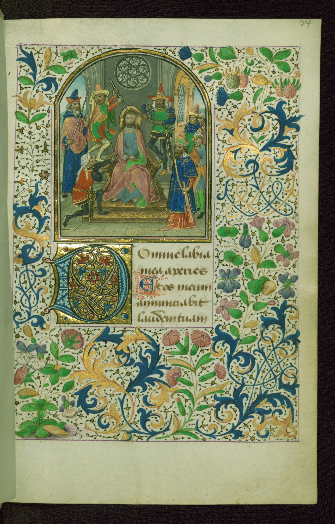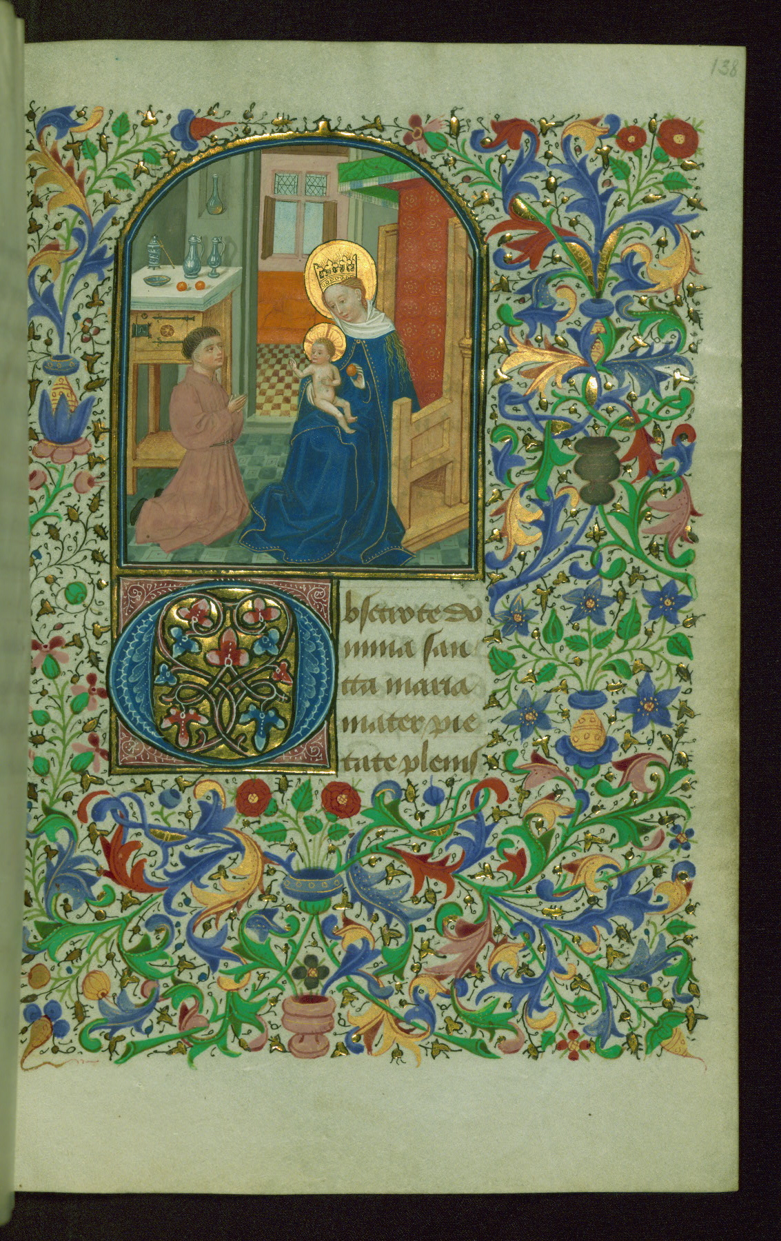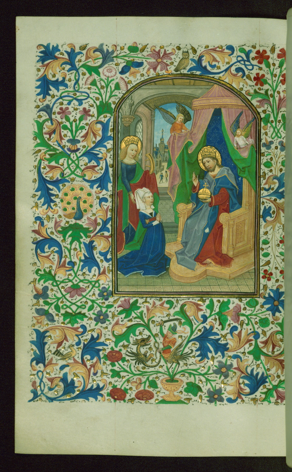 This Book of Hours was created ca. 1450-55 in Bruges by Willem Vrelant and associates. It was commissioned for its first owners, a husband and wife, who are depicted on fols. 138r and 150v, respectively. This book contains eighteen extant miniatures, including many unusual thematic depictions, such as the Buffeting of Christ (fol. 24r) in the Hours of the Cross, and a very Dürer-like depiction of the Holy Face in the Suffrages (fol. 146r).