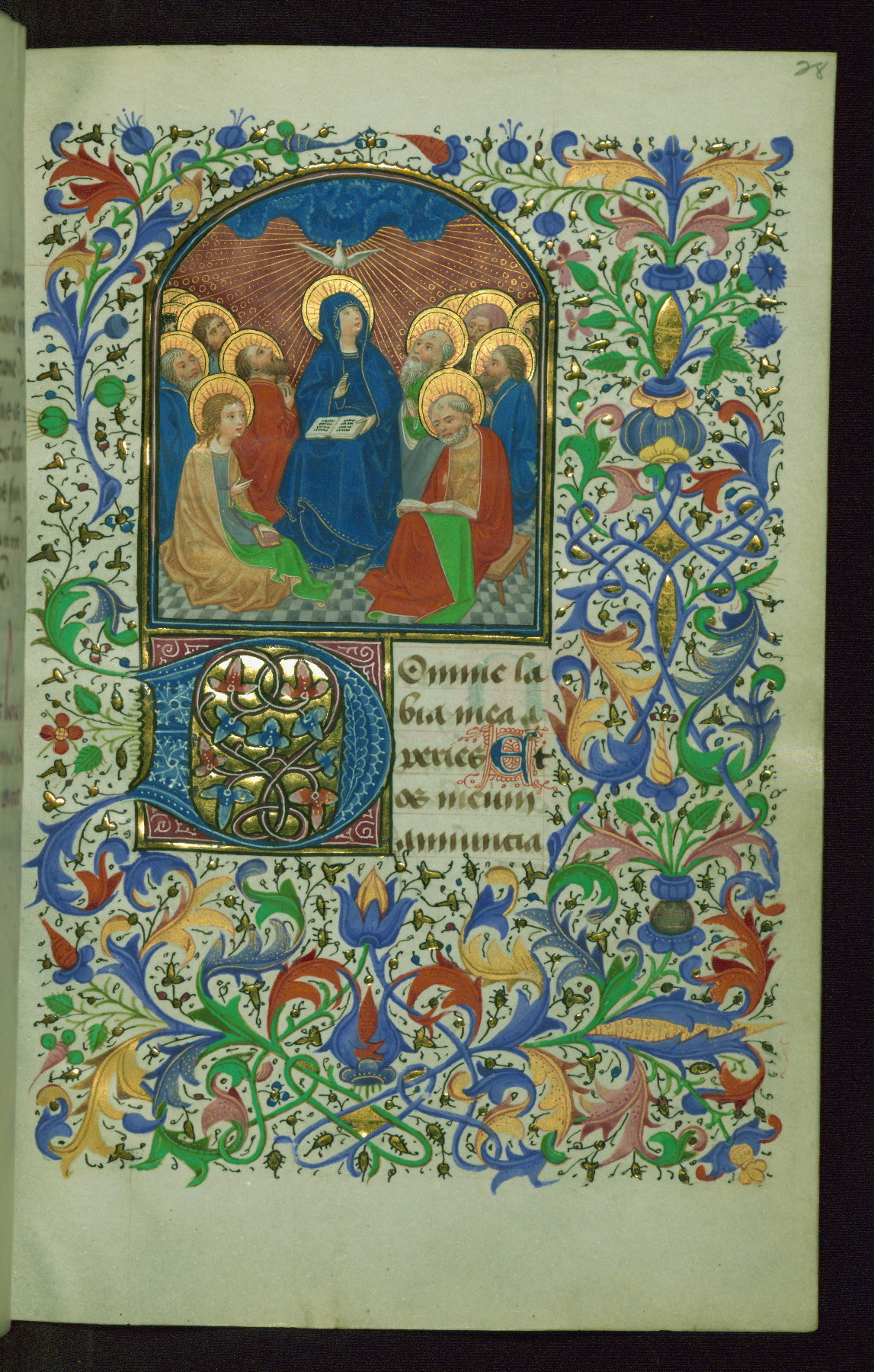 - Contents: Fols. 28r-32r: Hours of the Holy Spirit, headed on fol. 27v; fols. 32r-39v: Mass of the Virgin, two prayers including Oracio (fol. 38v) and Alia Oracio (fol. 39r); fols. 39v-42r: Prayer on Sorrow of the Virgin by the Cross