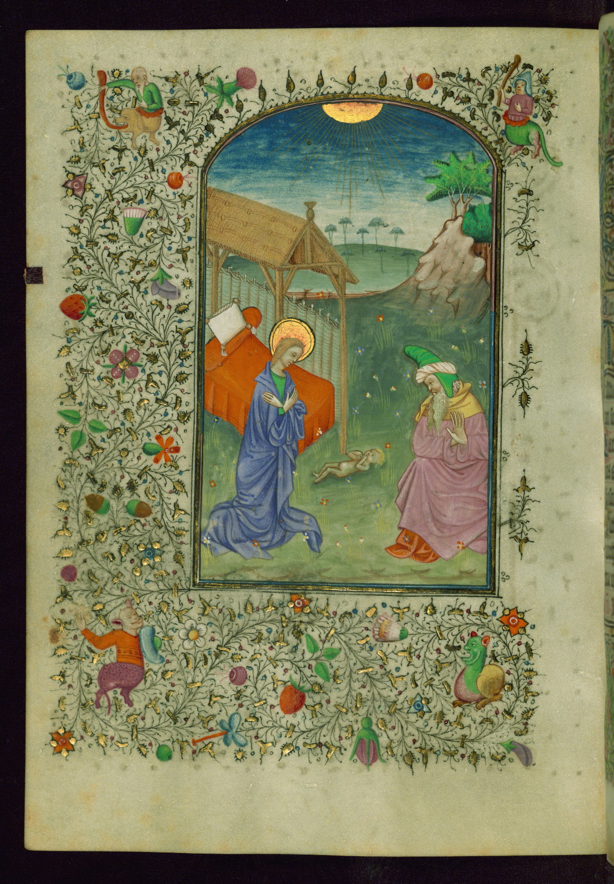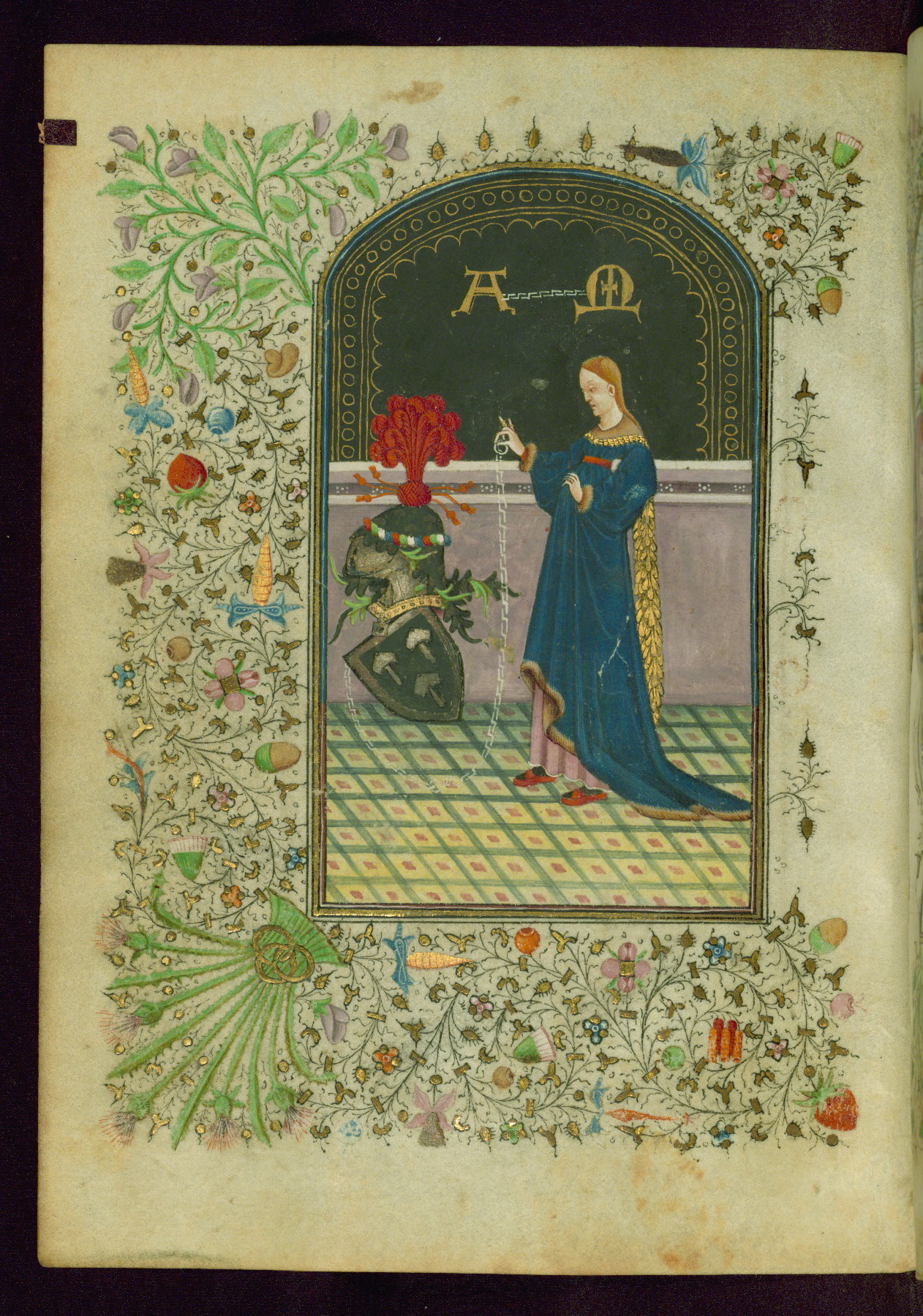 This Book of Hours of ca. 1430-45 was illuminated by the followers of the Masters of the Gold Scrolls under North Netherlandish influence, suggesting an origin in Bruges. The manuscript, which is partially misbound, is decorated with thirteen extant miniatures (ten full-page, inserted), three historiated initials, and drolleries. In addition to a diverse collection of South Netherlandish, North French, and occasional English saints, this manuscript also features suffrages (namely SS. Margaret, Sebastian, and Anthony) that were added early. The manuscript has traces of different hands and artists throughout: in addition to mismatched borders, where the same design has been painted by different hands, there is also the unusual presence of an artist’s stamp visible in the form of a circle of thistles, which is found on the inside edge of the miniatures. An added frontispiece miniature featuring an armorial shield with an ostrich-plumed helmet crest seemingly attributes the manuscript to a younger son of the de Mailly branch of the Mametz family in Picardy (identified by Michel Pastoureau).