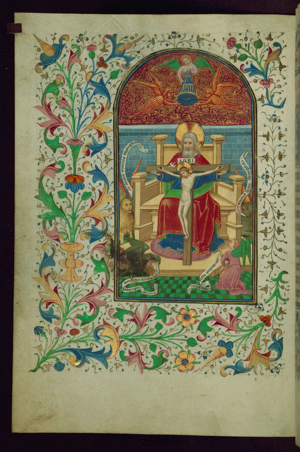 - Contents: Fols. 15r-32v: Sunday Hours of the Trinity: fols. 33r-34v: Two prayers to the Trinity, specifying "N" for name of suppliant; fols. 36r-43v: Hours of the Dead; fols. 43v-49r: Two prayers, to God and to the Virgin; fols. 49v-53v: Mass of the Dead; fols. 55r-60v: Tuesday Hours of the Holy Spirit; fols. 60v-61v: Prayer to God, "Mane cum surrexero"; fols. 61v-66r: Mass of the Holy Spirit; fols. 68r-73r: Wednesday Hours of All Saints; fols. 73r-76r: Prayer to the Virgin, "O intemerata"; fols. 76v-81v: Mass of All Saints; fols. 83r-89r: Thursday Hours of the Holy Sacrament; fols. 89r-92v: Communion prayers; fols. 93r-97v: Mass of the Holy Sacrament; fols. 99r-114v: Friday Hours of the Cross; fols. 114v-116v: Prayer on the Seven Last Words of Christ; fols. 116v-118r: Prayer lamenting the Sorrow of the Virgin by the Cross; fols. 118v-121r: Mass of the Cross; fols. 123r-129v: Saturday Hours of the Virgin; fols. 129v-136v: Two prayers to the Virgin, "O gloriosissima" and "Obsecro te"; fols. 137r-145r: Mass of the Virgin; fols. 146r-147v: Prayer to God for recitation before the Mass; fols. 149r-154v: Mass of St. Michael; fols. 156r-161v: Mass of the Conception of the Virgin; fols. 163r-166v: Mass of the Virgin
