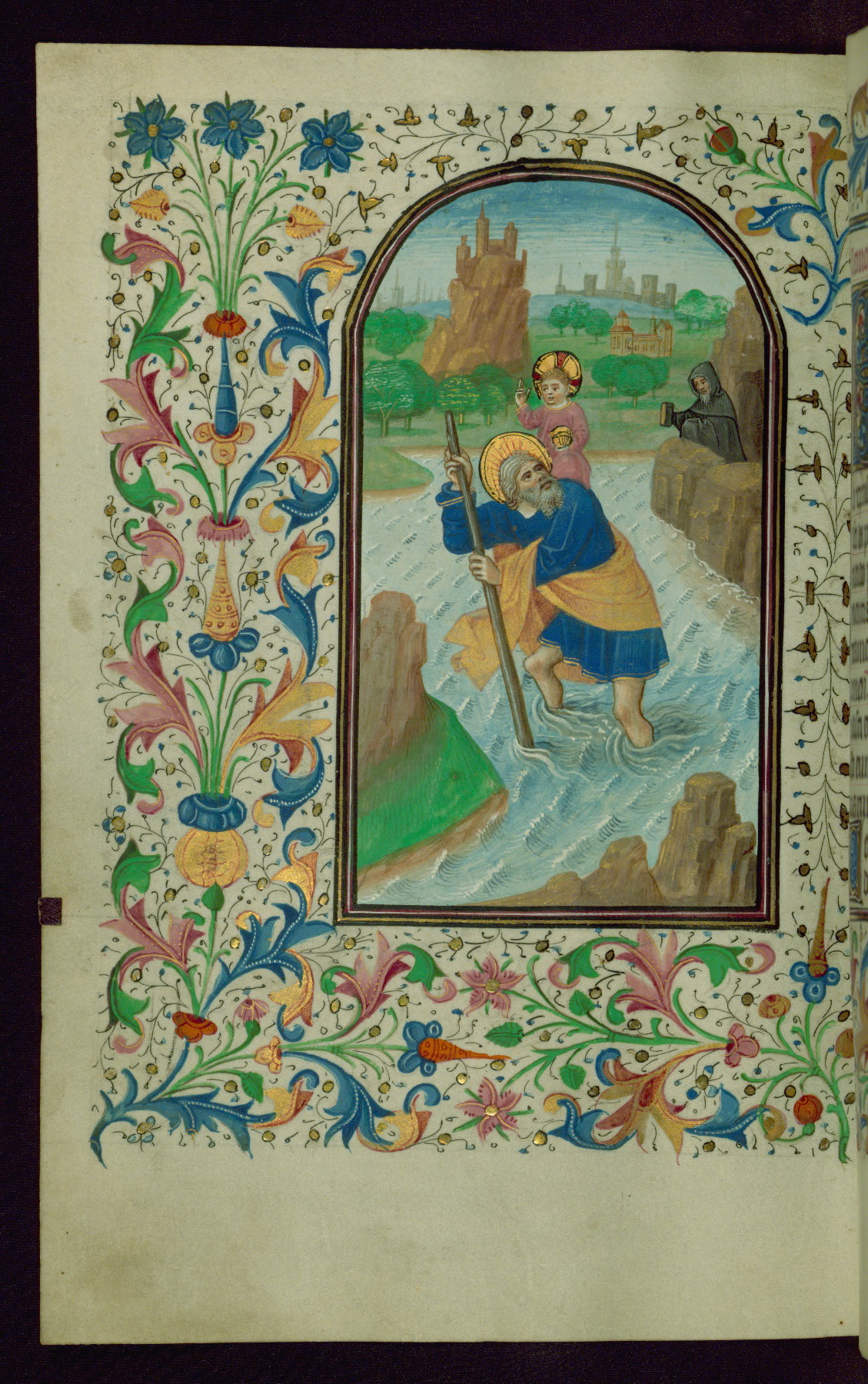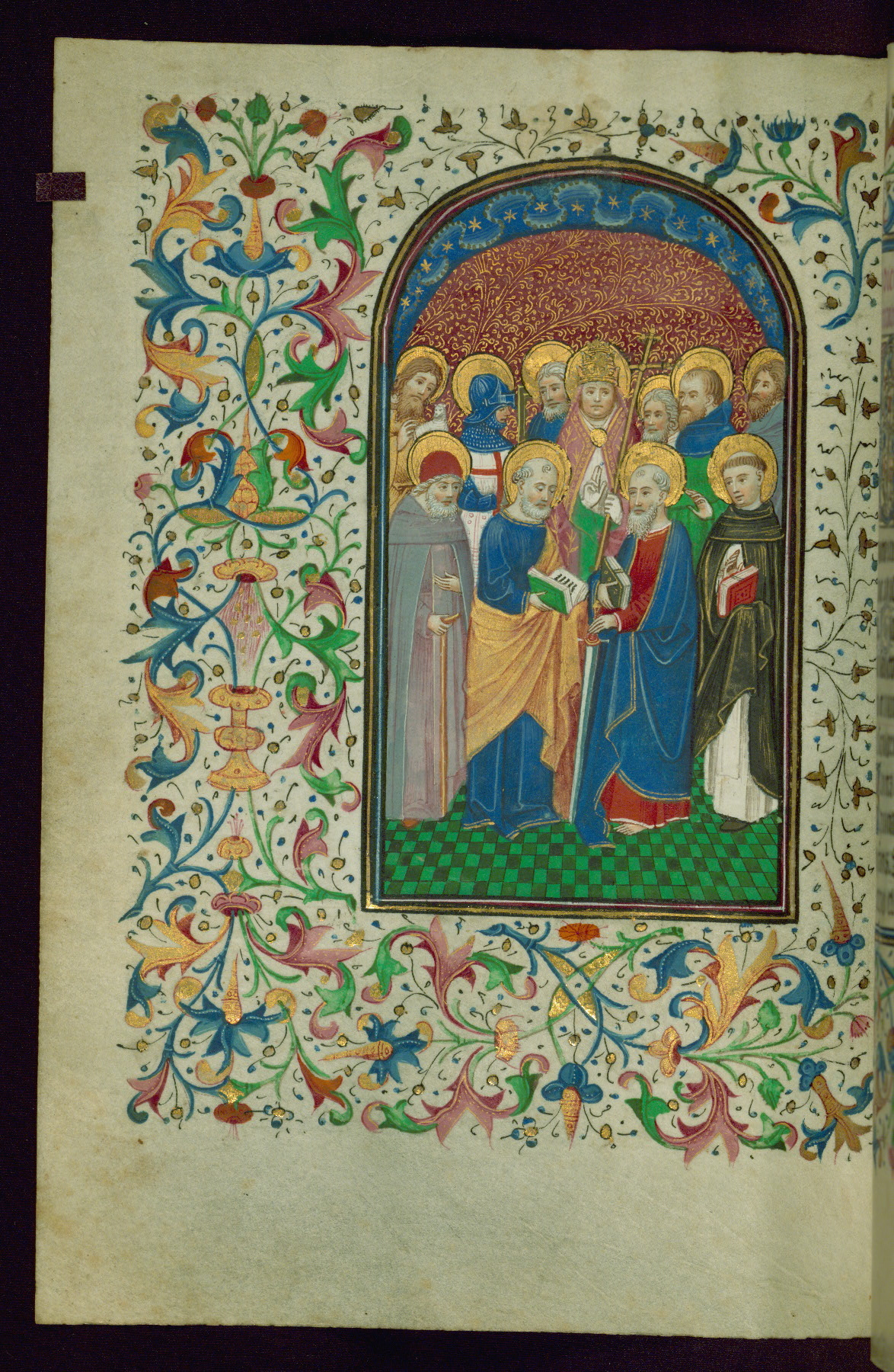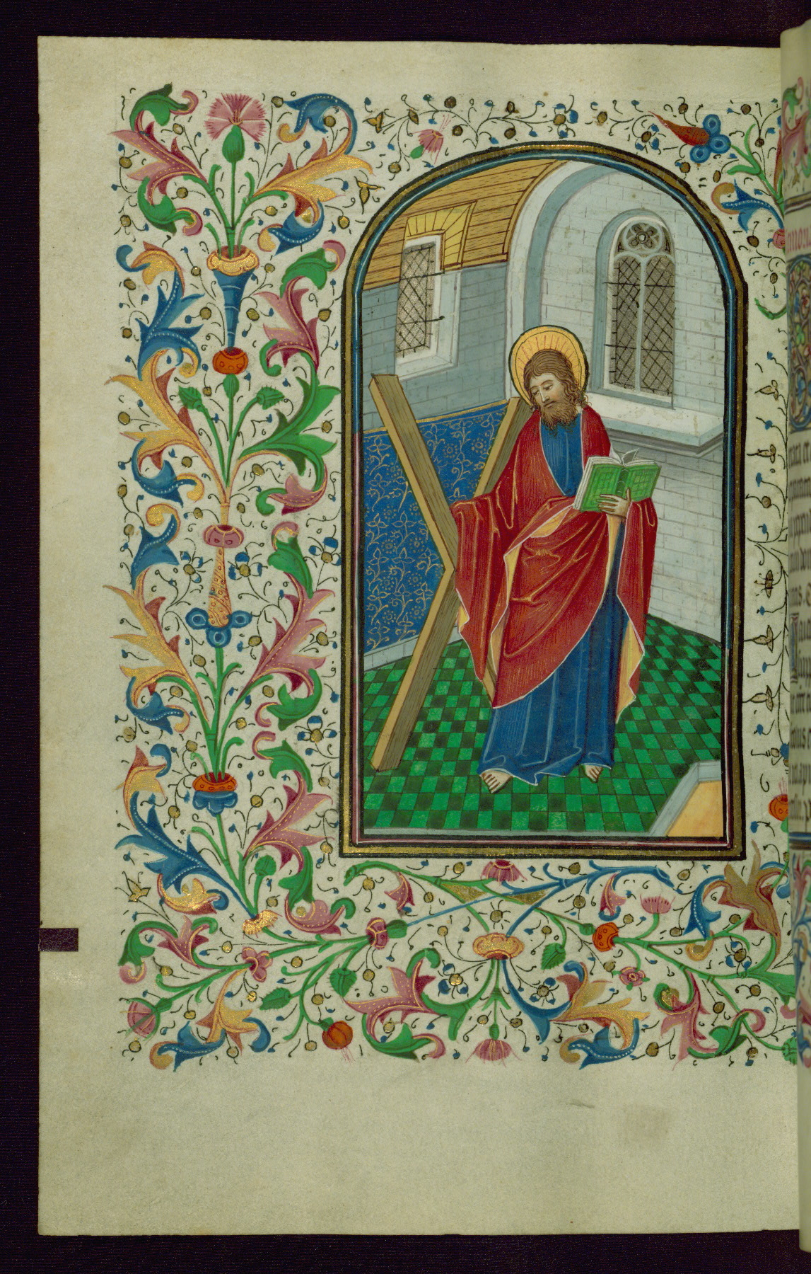 - Contents: Suffrages for saints: fol. 321r: John the Baptist; fol. 323r: Christopher; fol. 325r: George; fol. 327r: Sebastian; fol. 329r: Andrew; fol. 331r: Augustine; fol. 333r: Francis; fol. 335r: Bernardinus