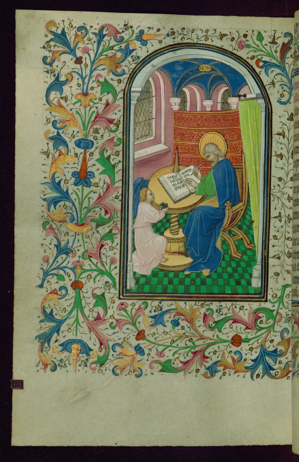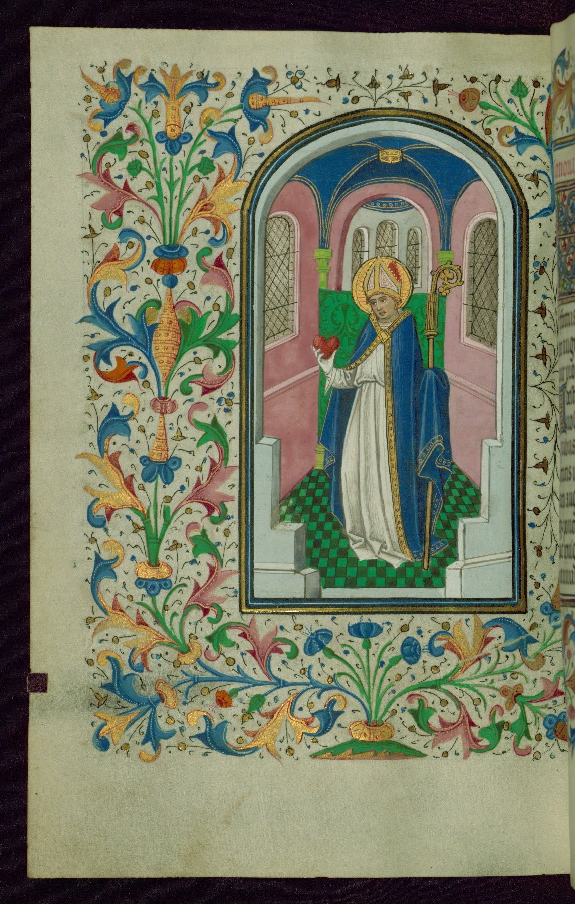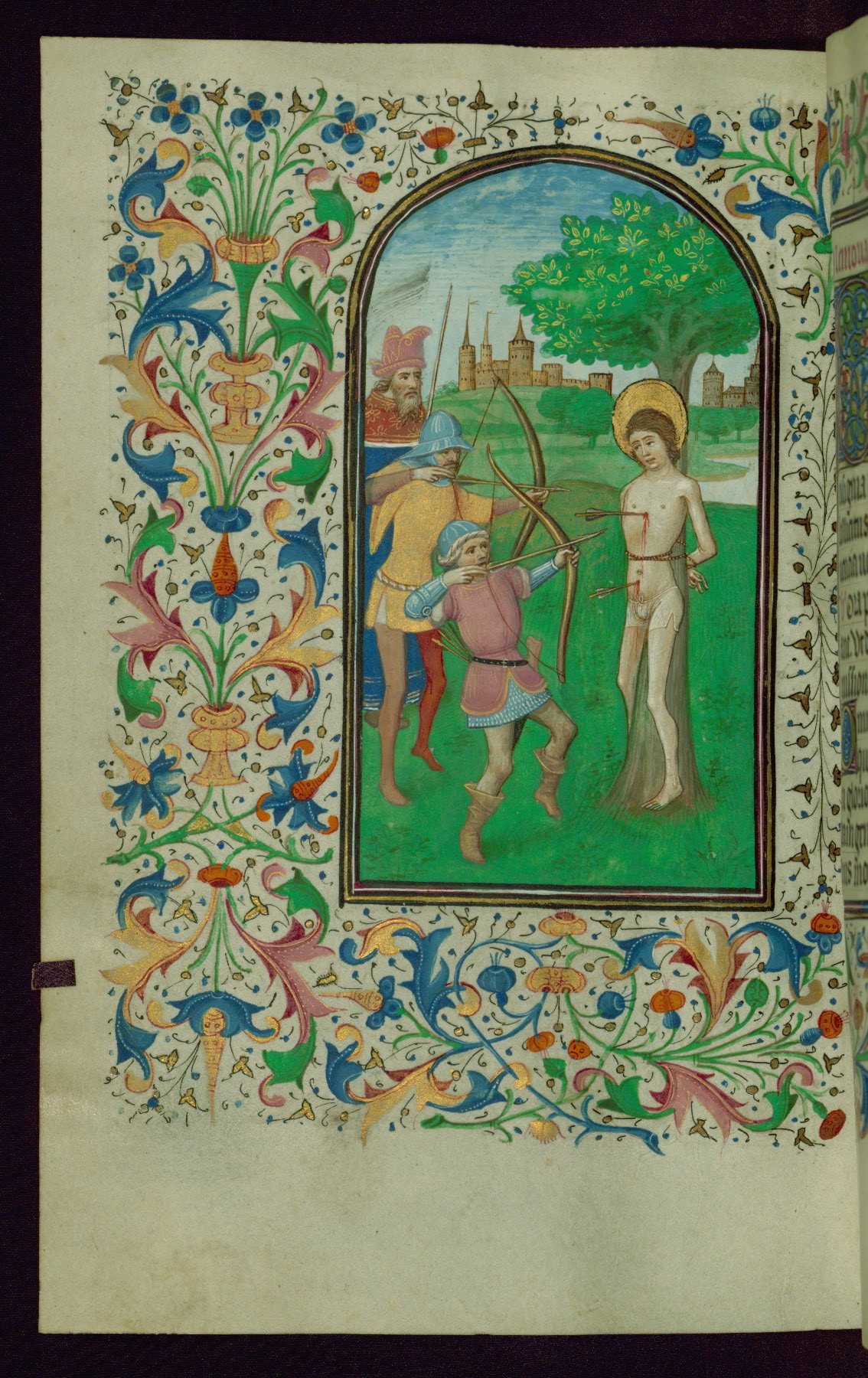 - Contents: Suffrages for saints: fol. 321r: John the Baptist; fol. 323r: Christopher; fol. 325r: George; fol. 327r: Sebastian; fol. 329r: Andrew; fol. 331r: Augustine; fol. 333r: Francis; fol. 335r: Bernardinus