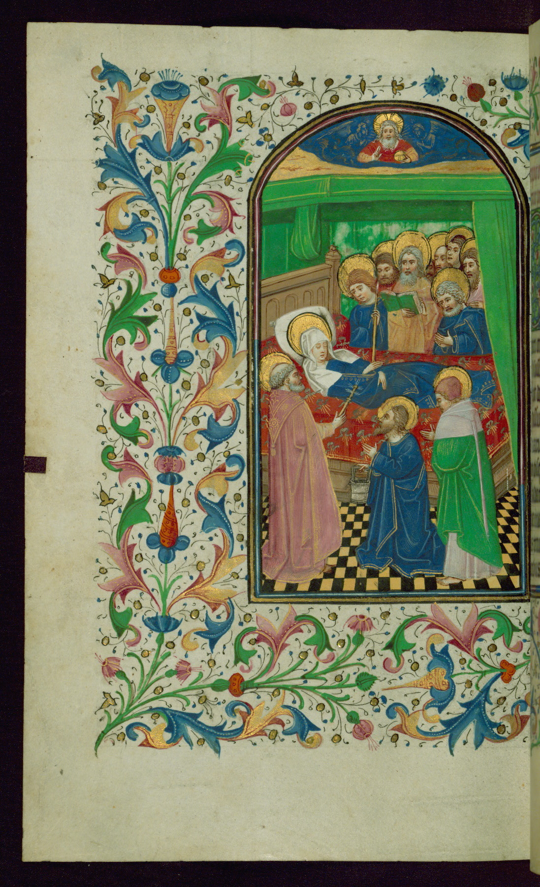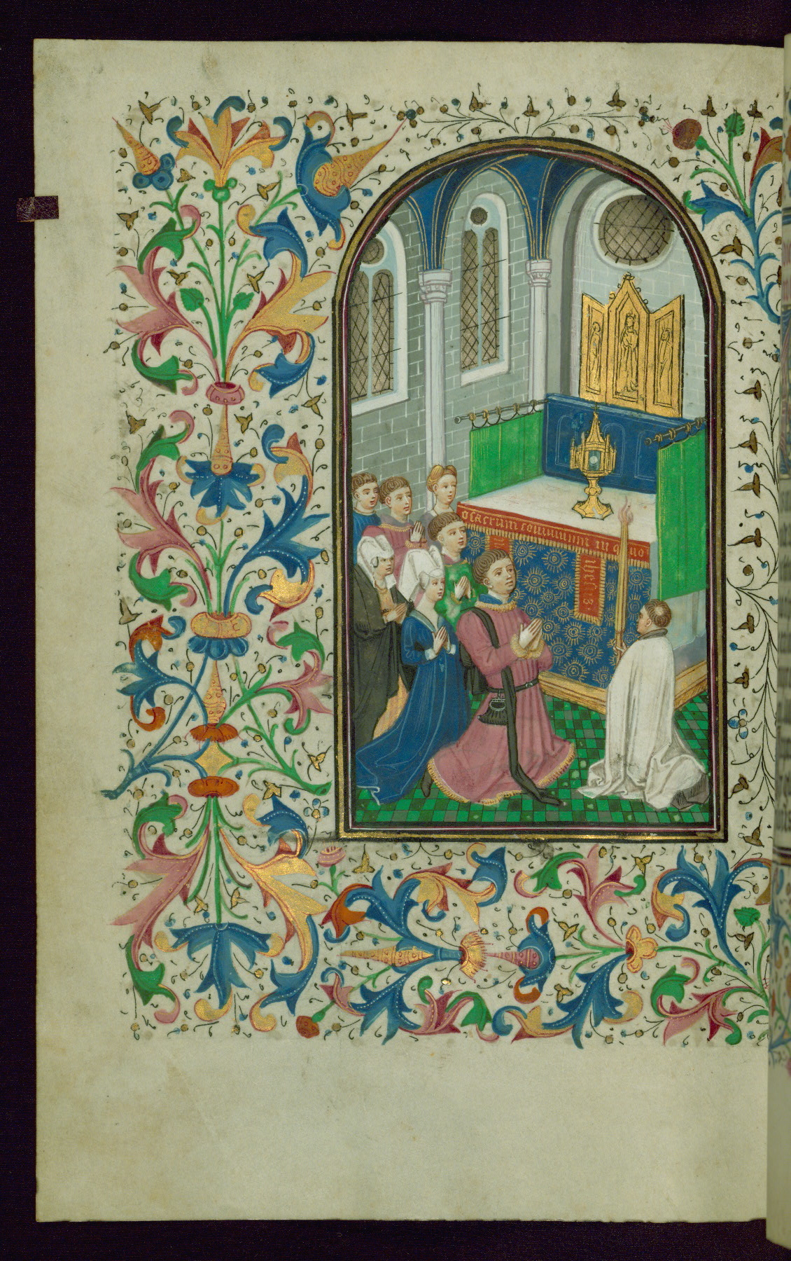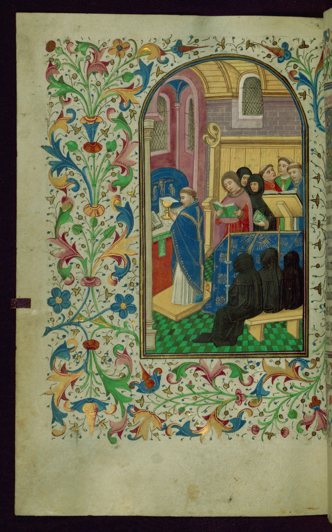 Made in Bruges ca. 1450-60 for the use of Rome, in the circle of Willem Vrelant; French and South Netherlandish saints in Calendar; patron depicted before St. Bernardinus on fol. 334v, perhaps also with his family at mass and funeral service on fols. 82v and 267v
