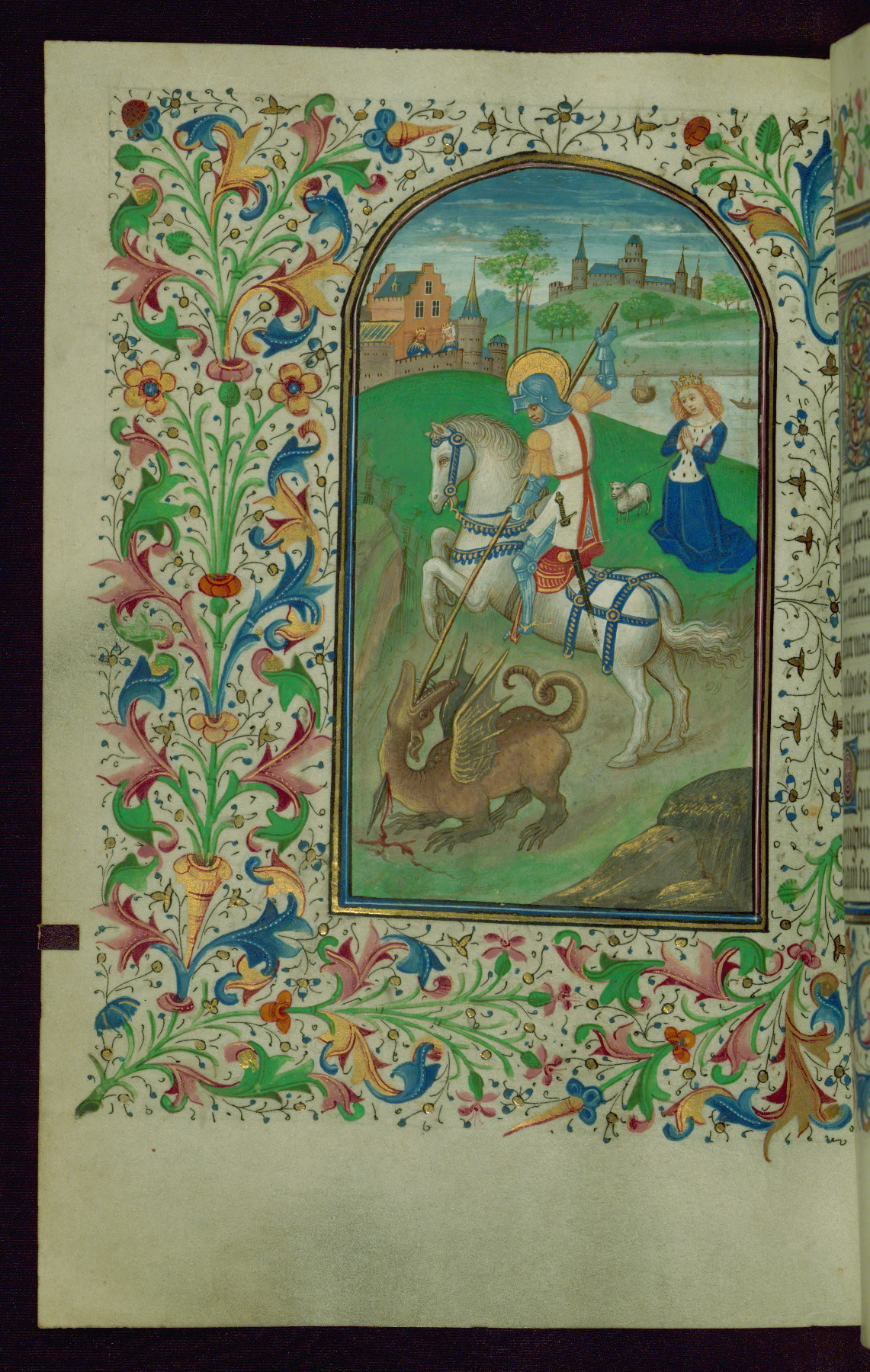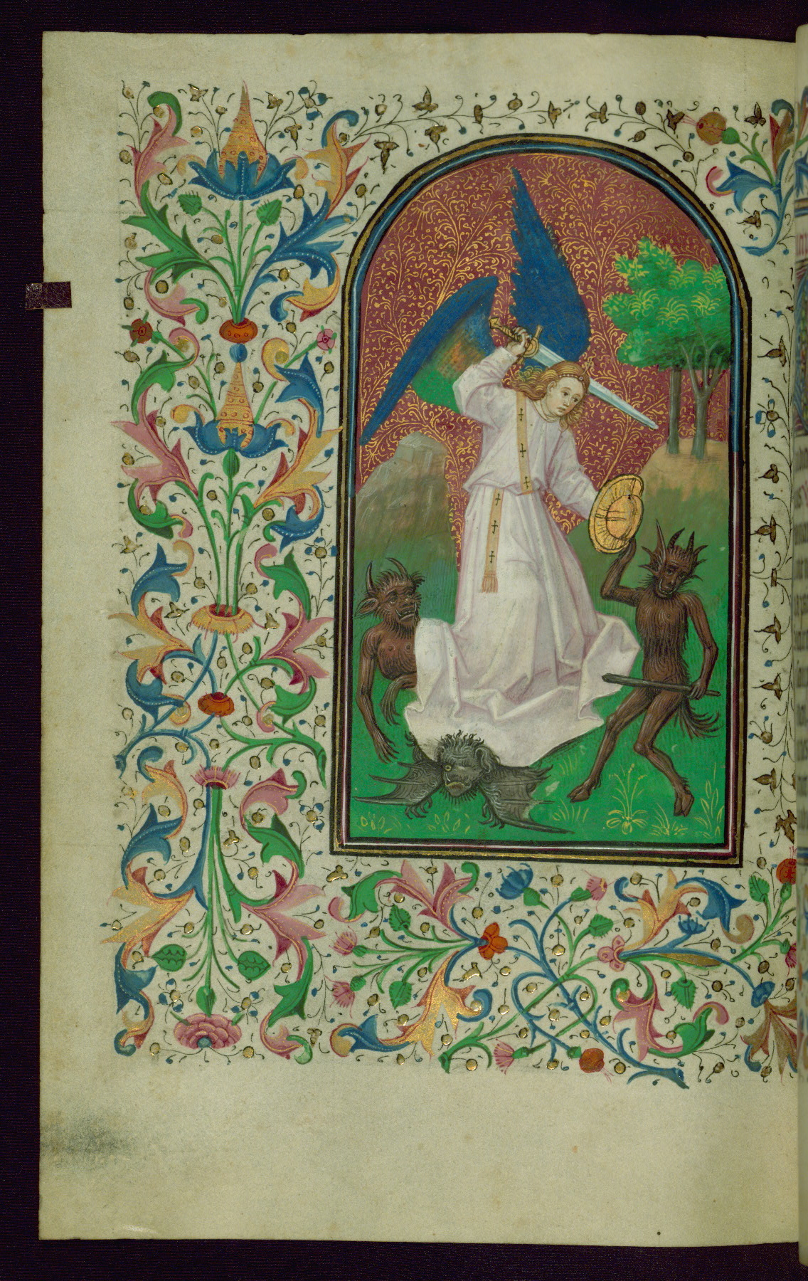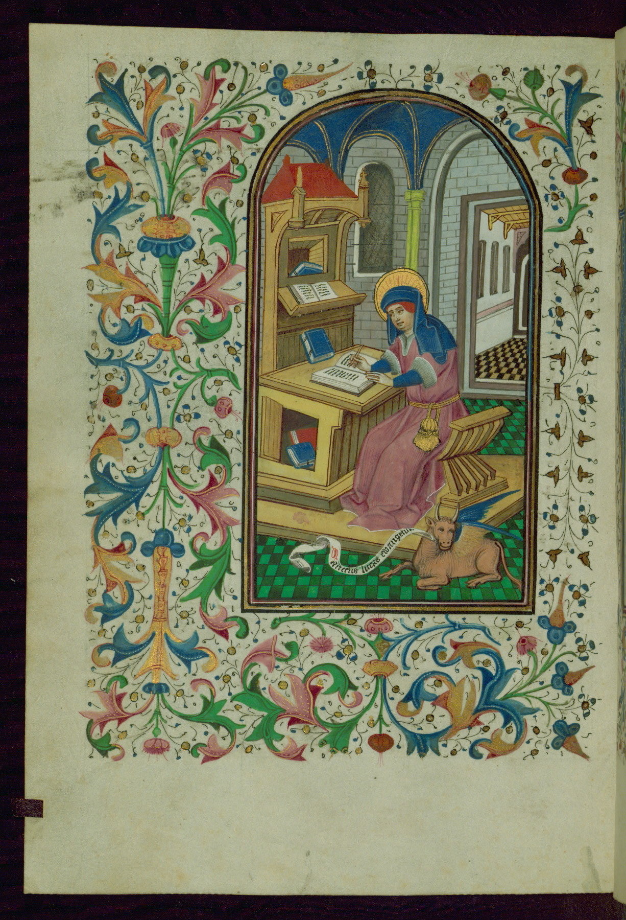 - Decoration note: Thirty-three extant full-page miniatures, all inserted, one in grisaille; decorated illuminated initials: present on pages opposite colored miniatures (5 lines), opposite grisaille miniature on fol. 163r, at secondary text divisions (2-4 lines), and "K L" in calendar (3 lines); flourished initials; borders: on pages opposite miniatures, at secondary text openings, on record of calendar pages, opposite grisaille miniature on fol. 162v; marginalia passim with no particular program, mostly single motifs; line fillers, found mostly in litany