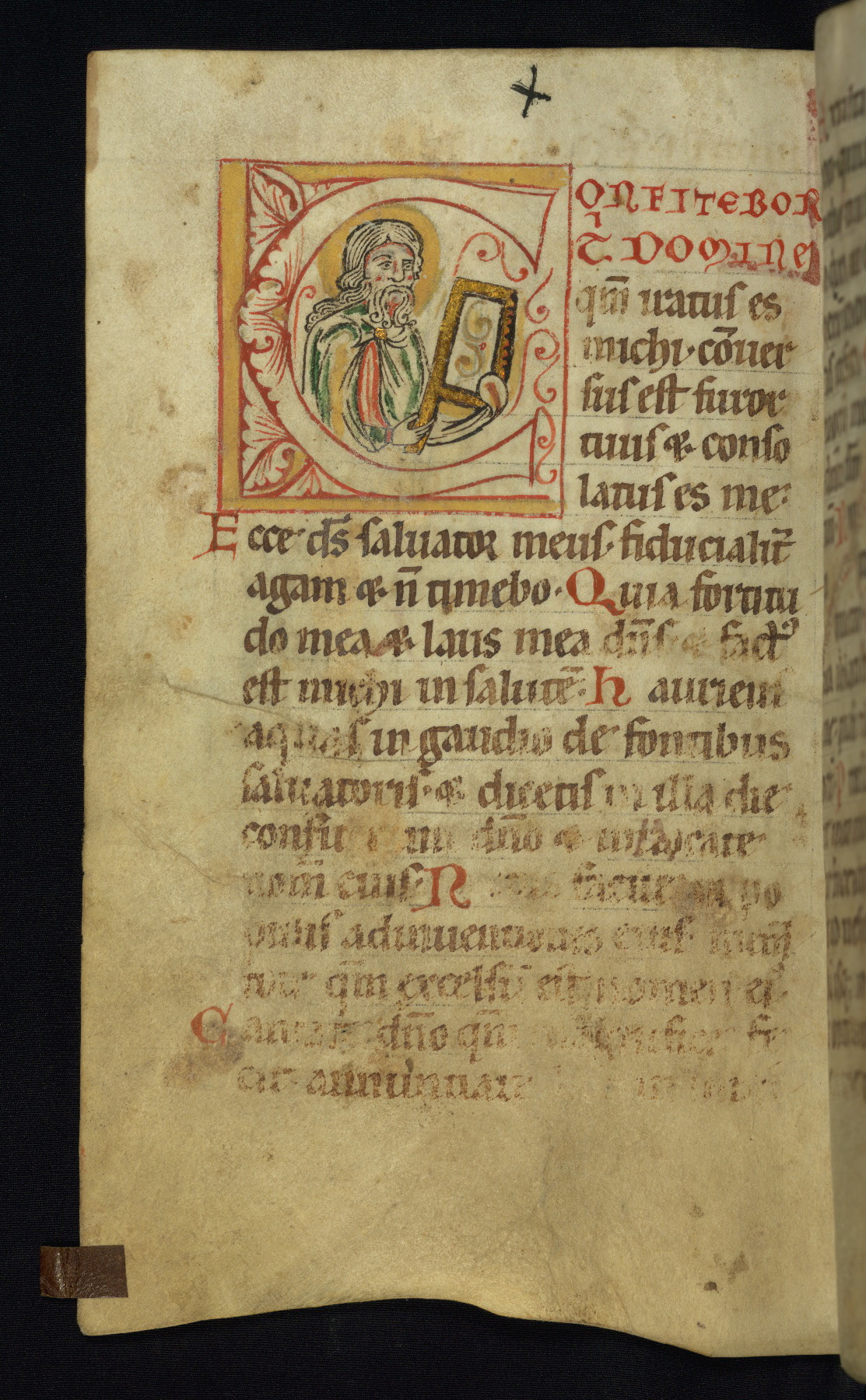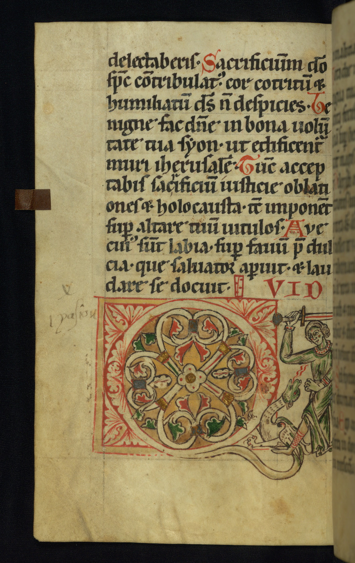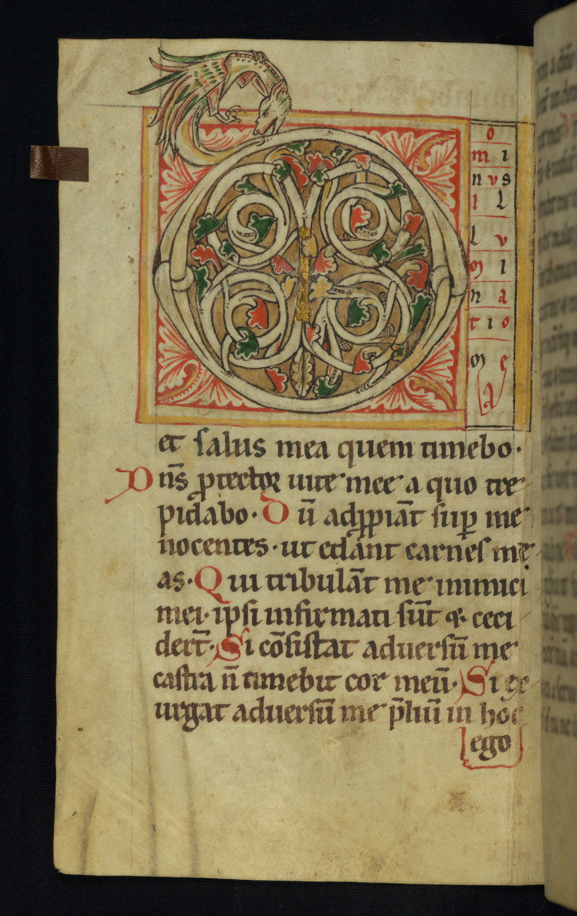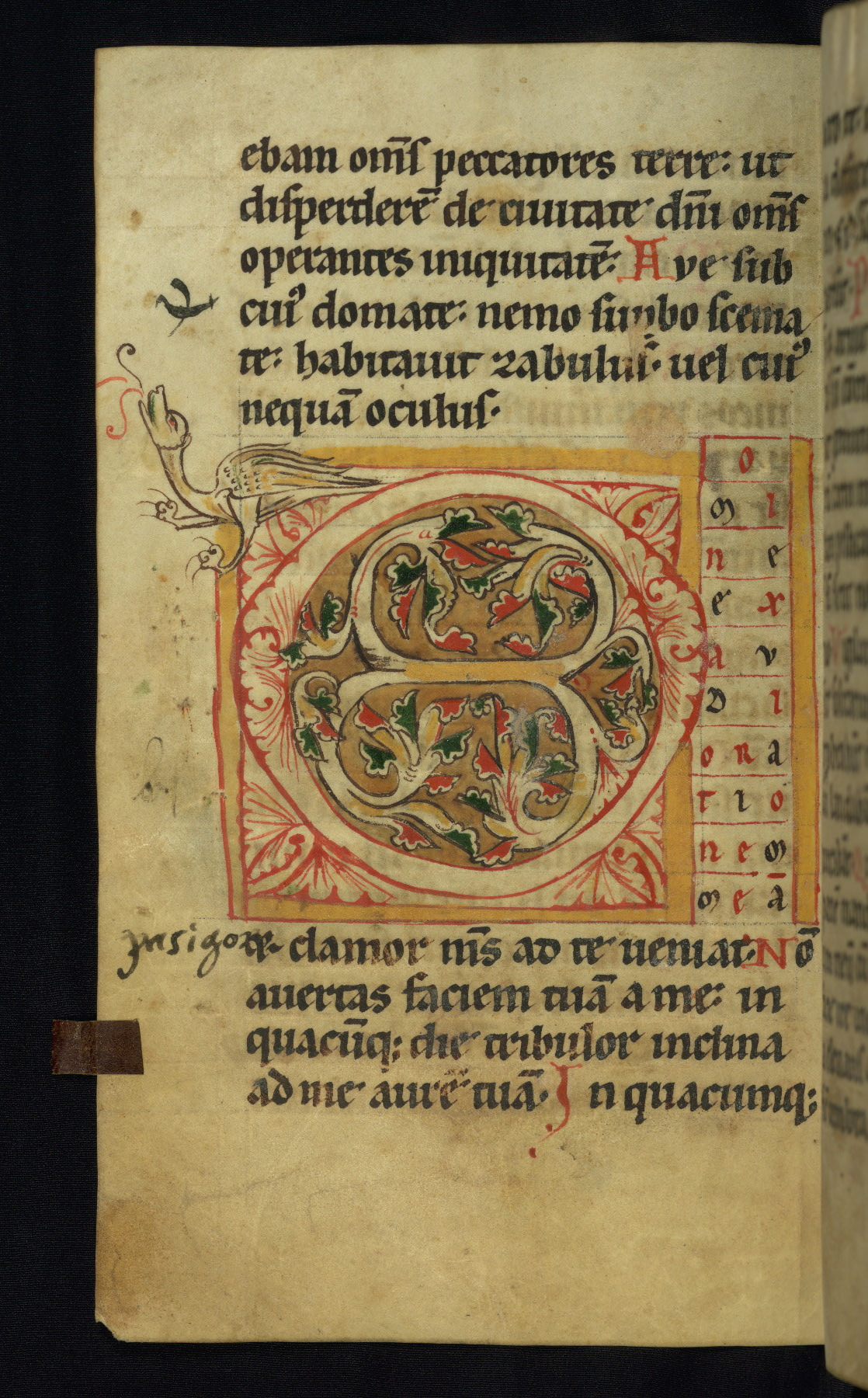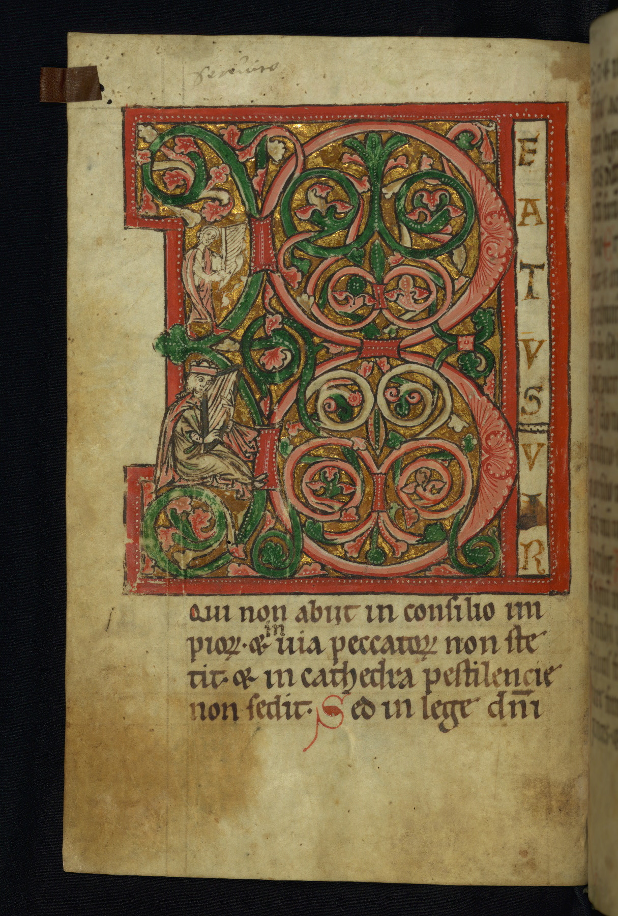 - Decoration note: Seven inhabited and two historiated initials with beasts and human figures (7-15 lines); two foliate initials (9-10 lines); initials drawn in black and red pen, often with gold or yellow wash backgrounds and red and green accents; Psalms begin with red pen-drawn decorative initials with blue or green flourishes (3-8 lines); Psalm verses begin with red initials (1 line high); rubrics in red, text in black ink