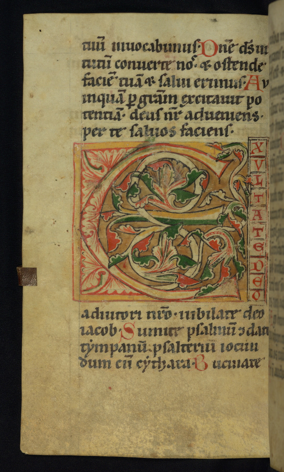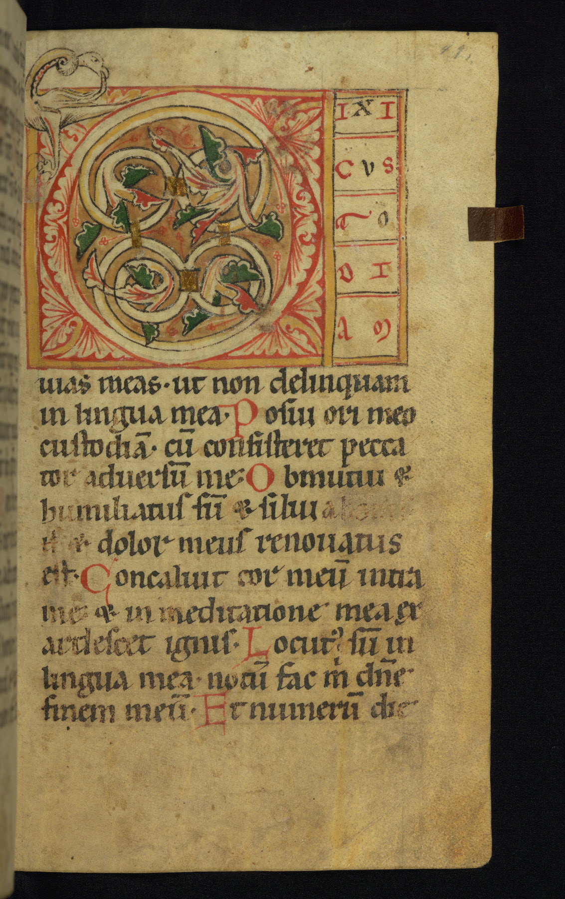 - Contents: Divisions at eight psalms for the liturgical week (Psalms 1, 26, 38, 52, 68, 80, 97, and 109), with additional divisions at Psalms 51 and 101 (these comprise the usual tripartite division that includes Psalm 1); each psalm ends with a verse of a Psalterium Beatae Mariae; charm added fol. 20r under Psalm 21: "Grabbatim zephap pantazer primellus/Adiutor meus esto domino fac quod peto ne/moreris"; Psalms 148 and 149 conflated