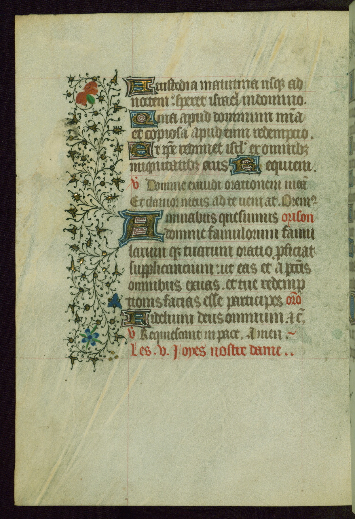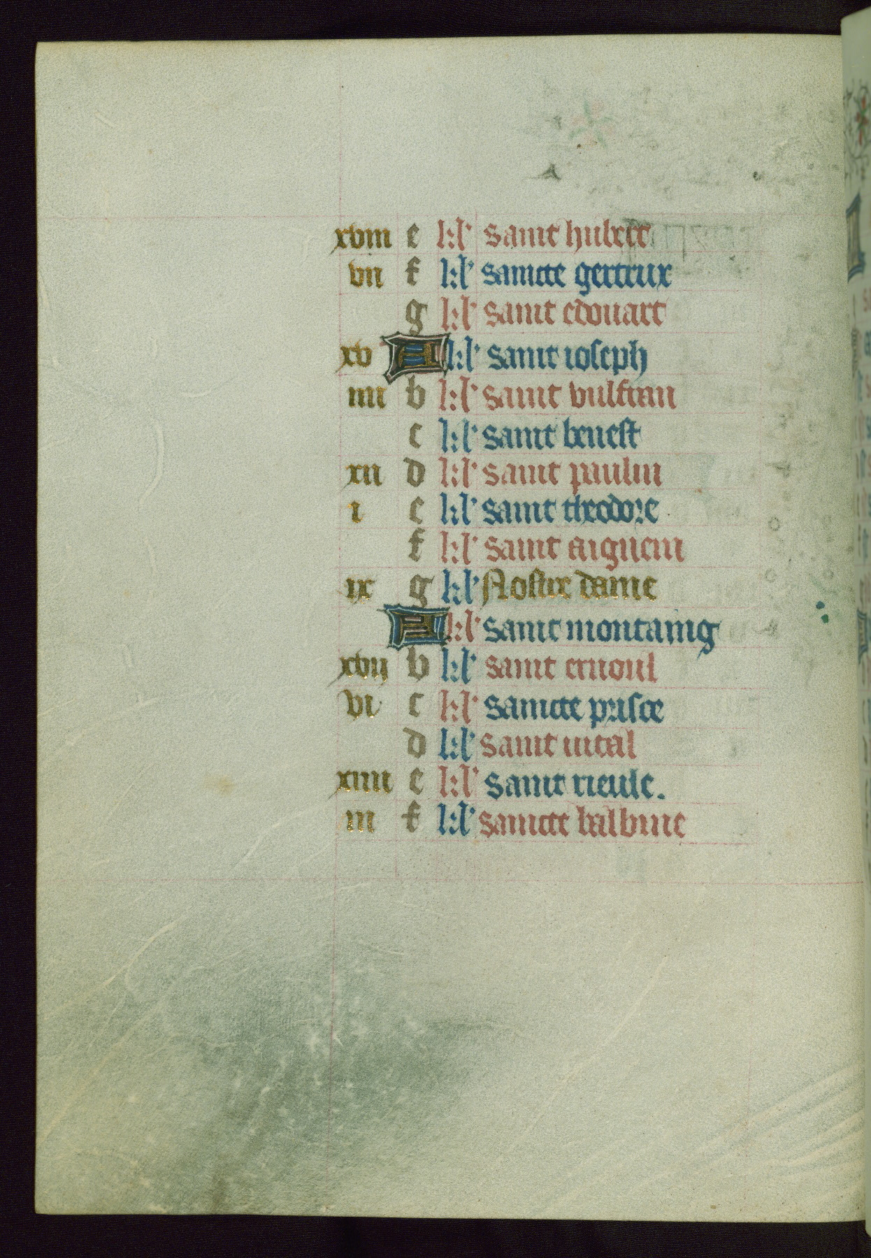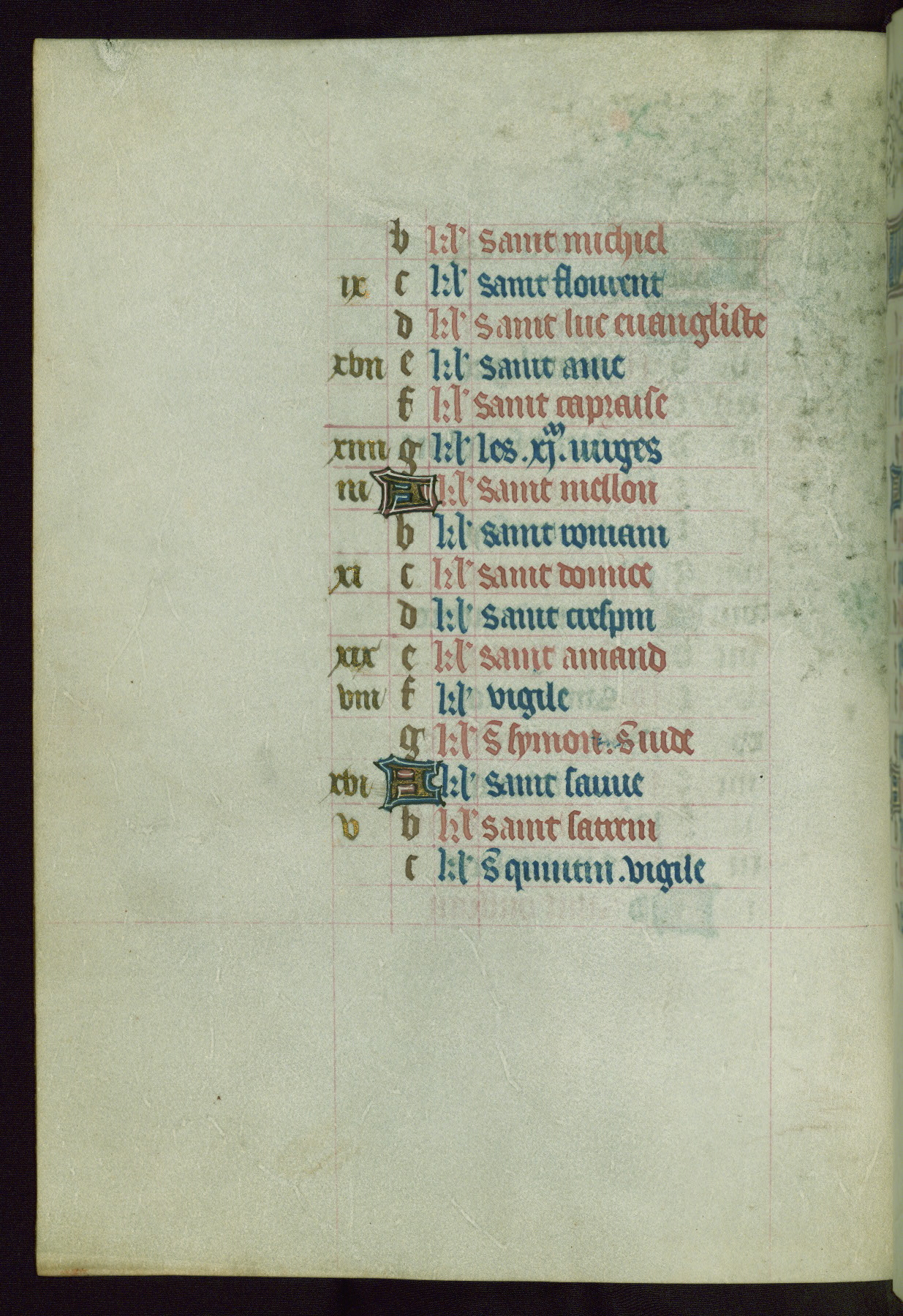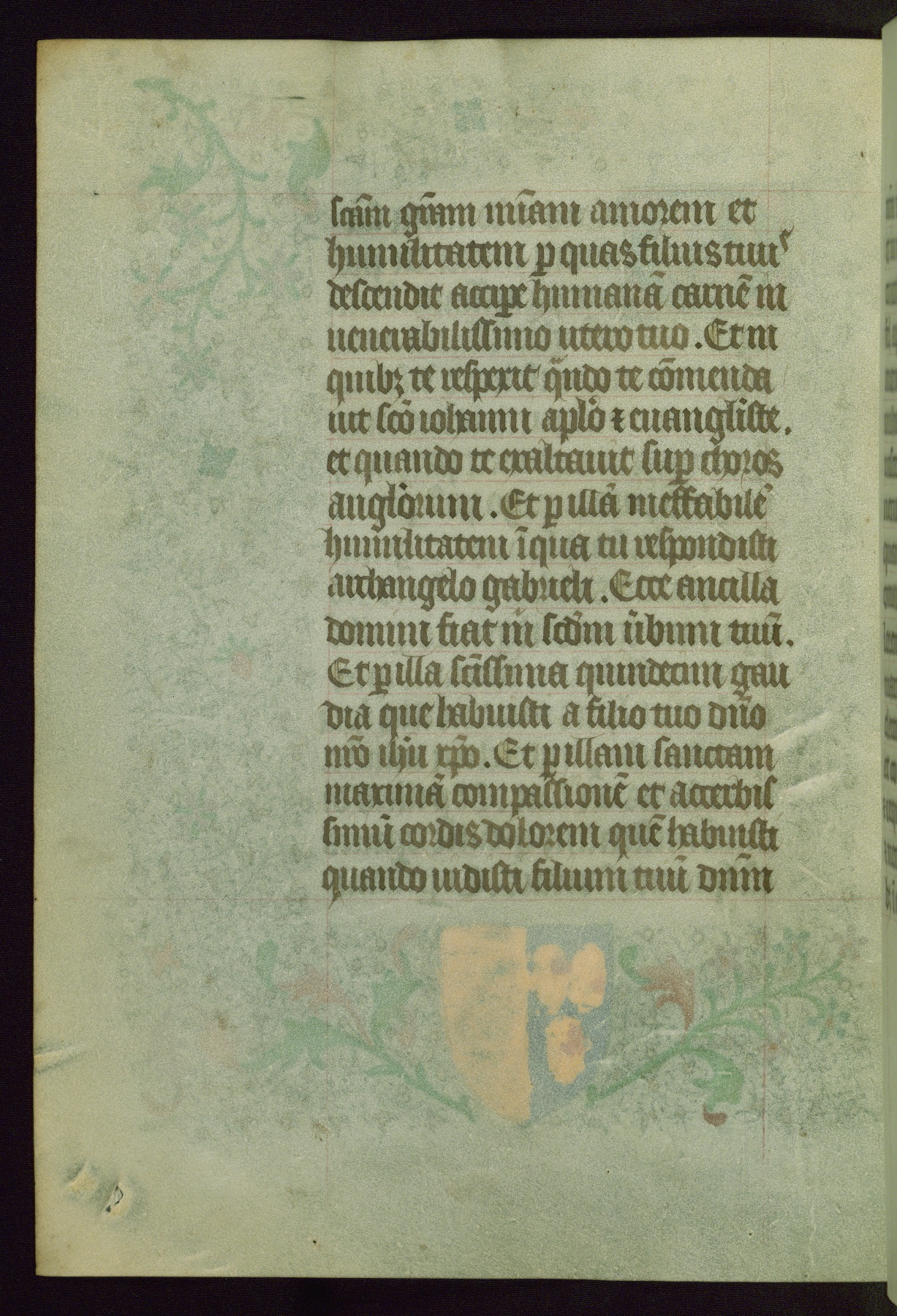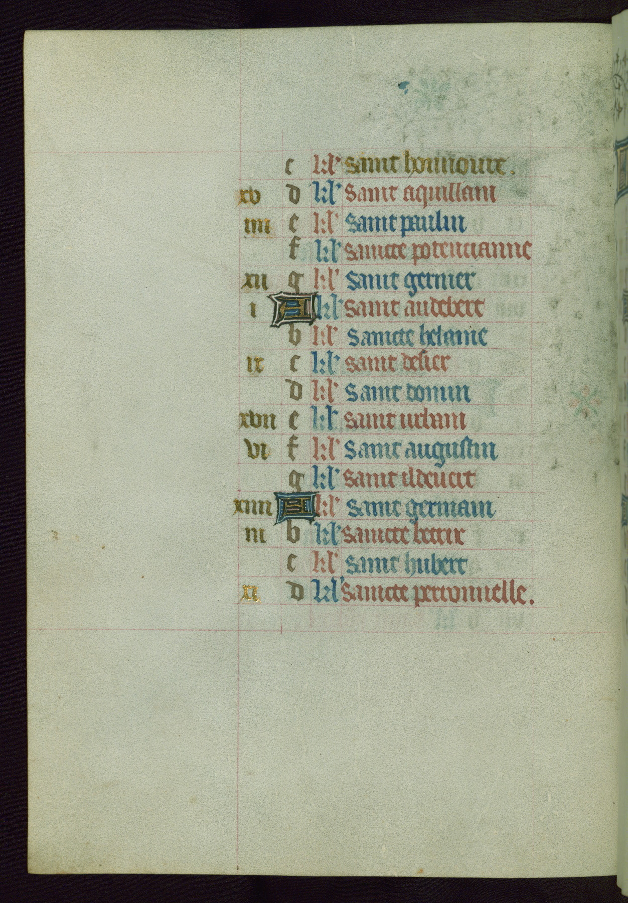 This Book of Hours was created ca. 1435-1440 in Amiens by artists from the circle of the Master of W.281 (Randall, cat. 112) for a female patron depicted on fol. 135r. The manuscript contains fourteen miniatures and is localized to Amiens by the contents of the calendar and litany, which include many saints particular to that region. Quire 12 (fols. 82-89) is misbound with quire 13 (fols. 90-97), with Suffrages and the Seven Verses of St. Bernard (fols. 82-89) intended to be after the Office of the Dead (fols. 90-128), as evinced by the location of the rubric for the Office of the Dead on fol. 81v.