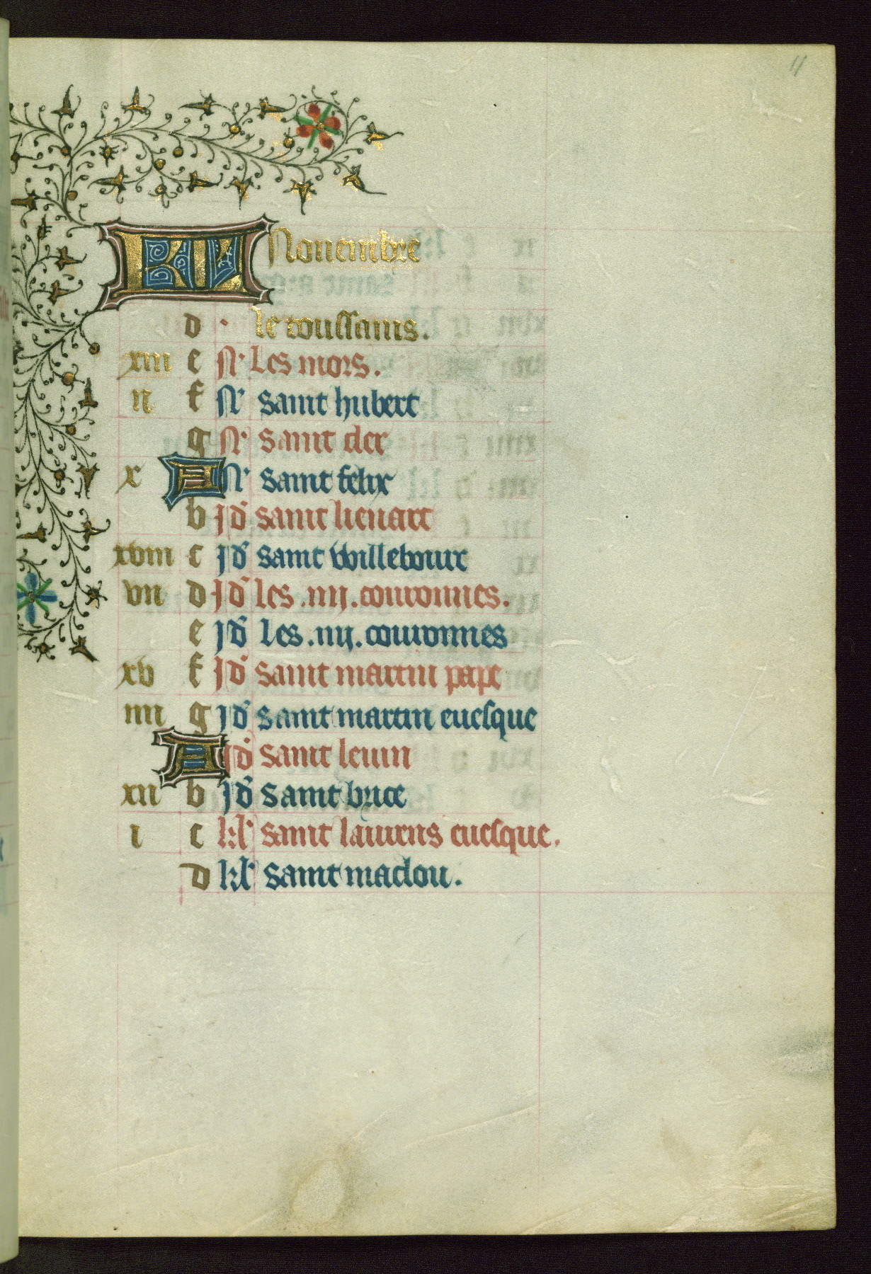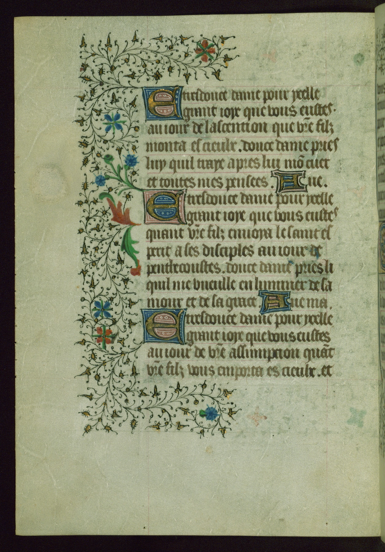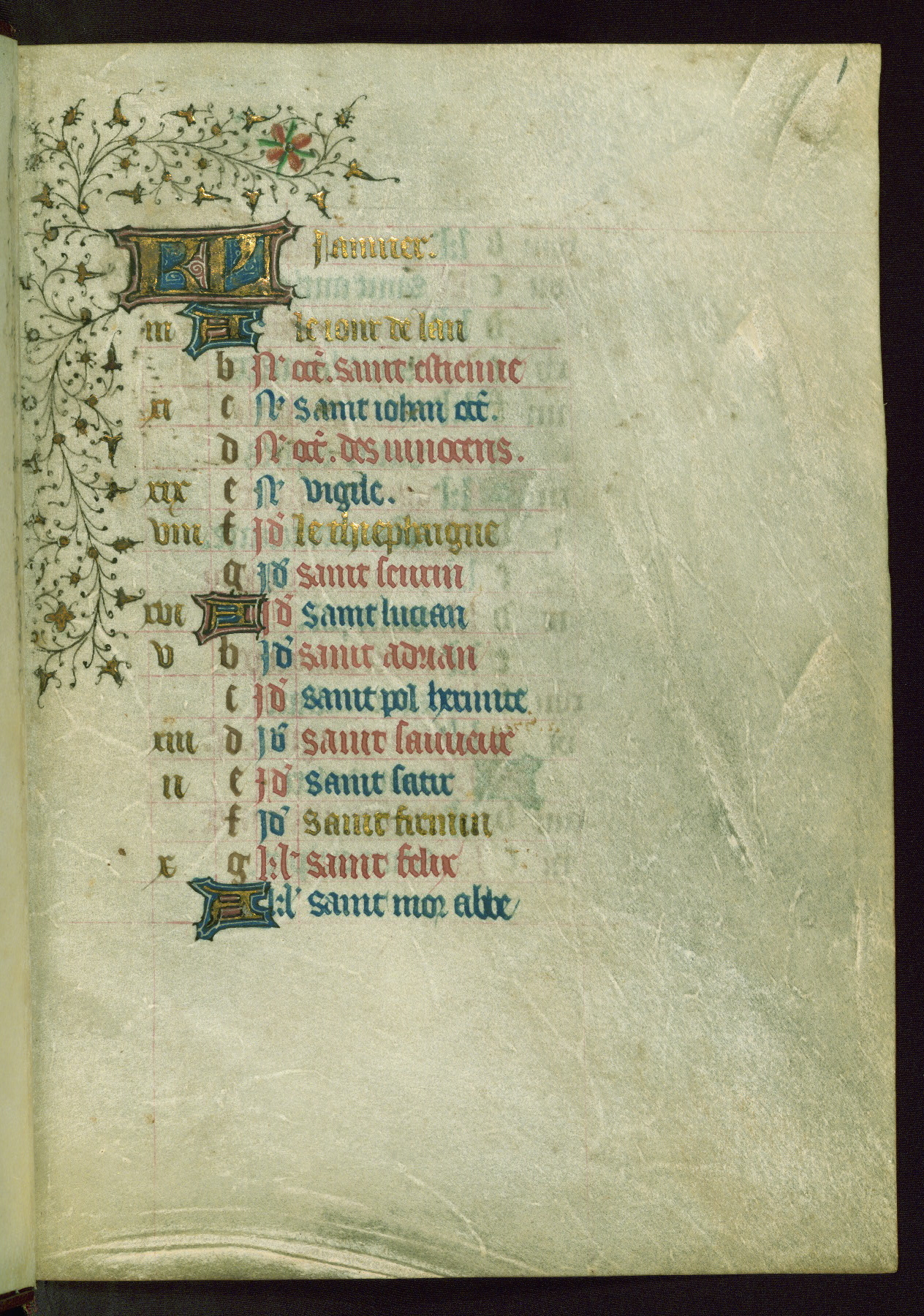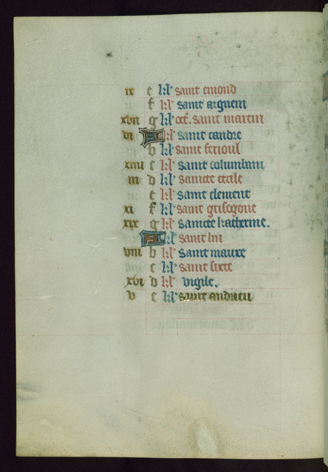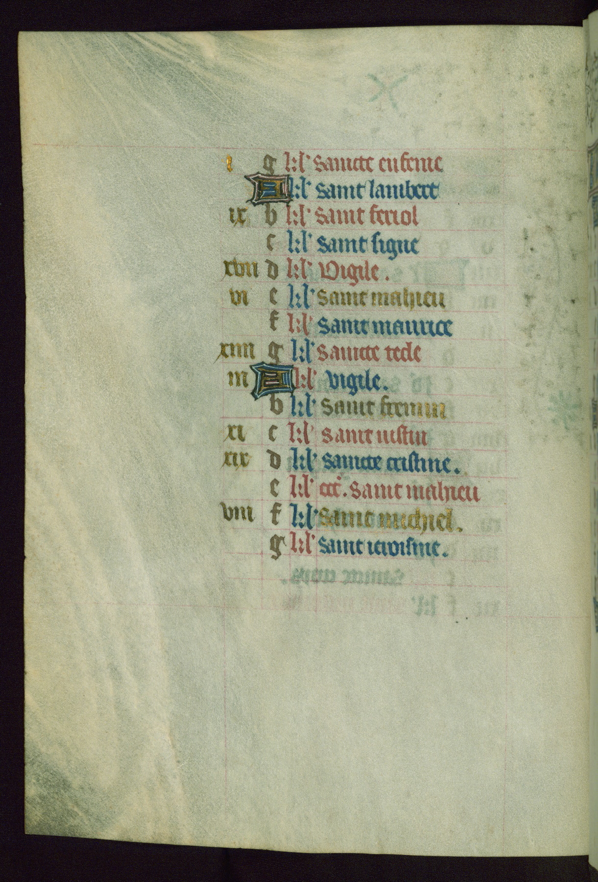 This Book of Hours was created ca. 1435-1440 in Amiens by artists from the circle of the Master of W.281 (Randall, cat. 112) for a female patron depicted on fol. 135r. The manuscript contains fourteen miniatures and is localized to Amiens by the contents of the calendar and litany, which include many saints particular to that region. Quire 12 (fols. 82-89) is misbound with quire 13 (fols. 90-97), with Suffrages and the Seven Verses of St. Bernard (fols. 82-89) intended to be after the Office of the Dead (fols. 90-128), as evinced by the location of the rubric for the Office of the Dead on fol. 81v.