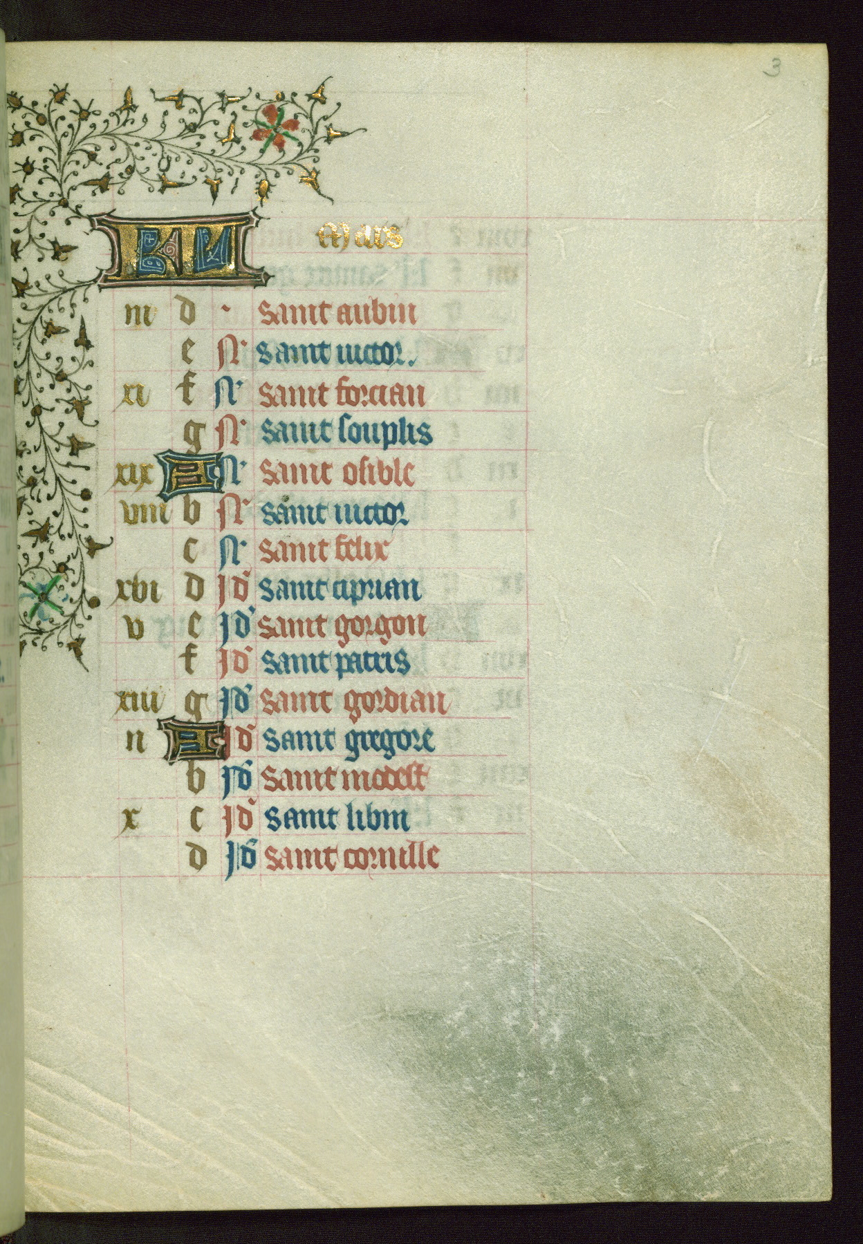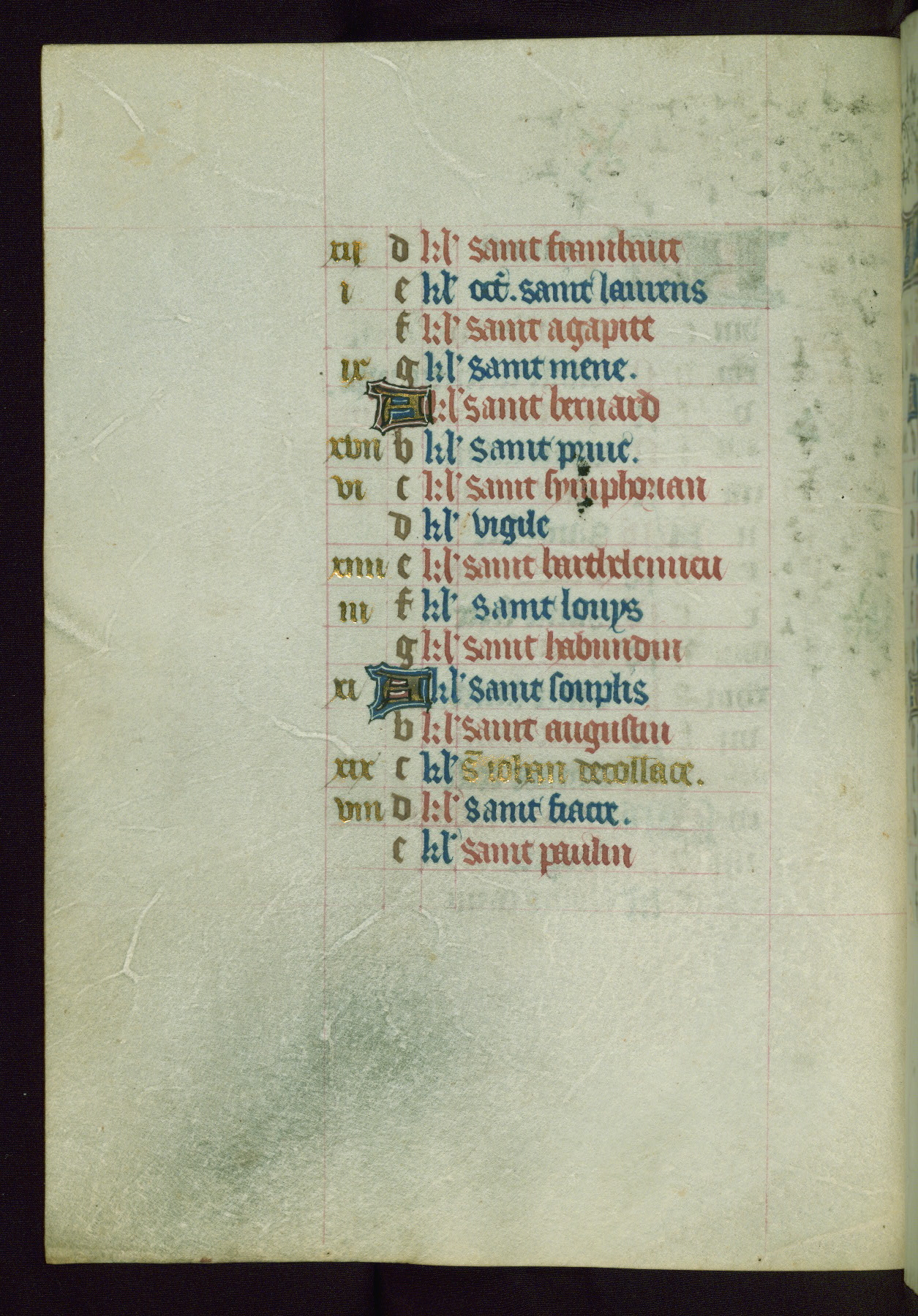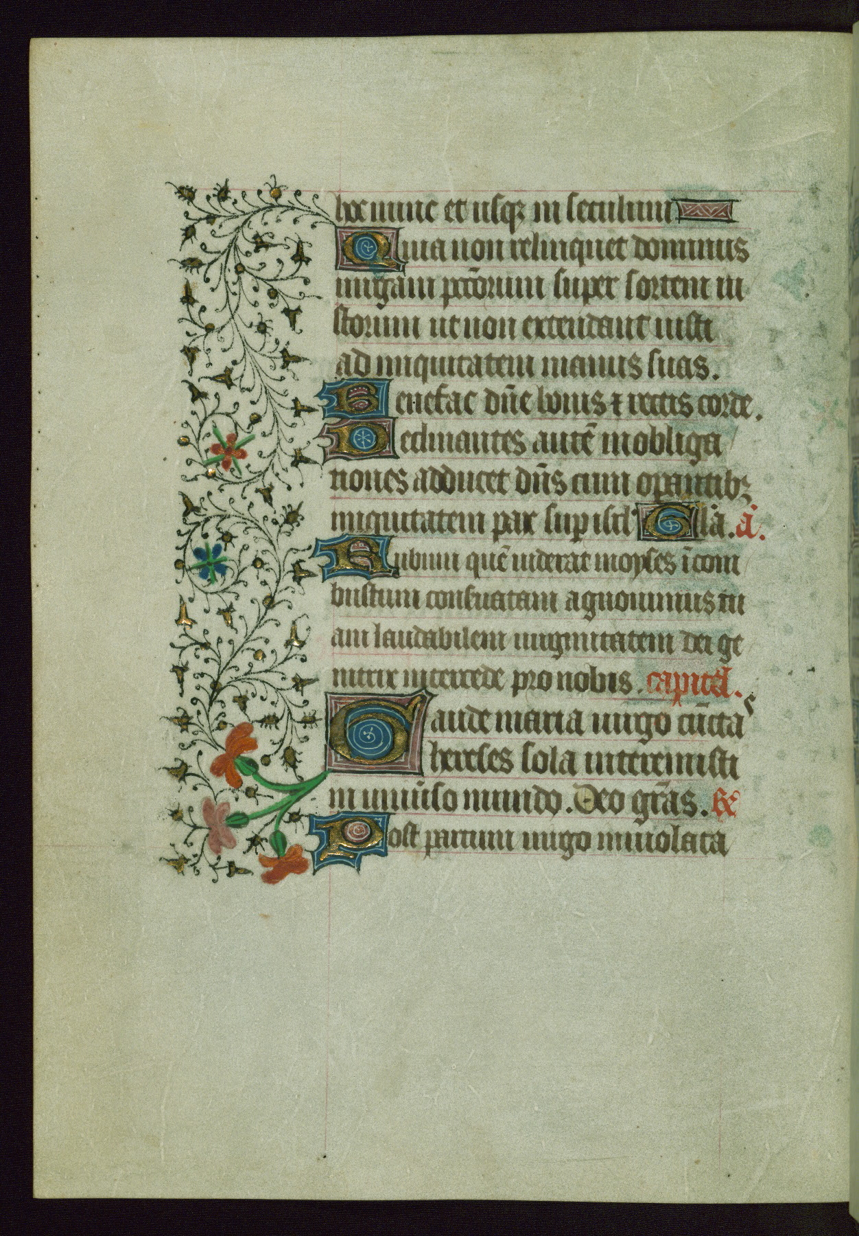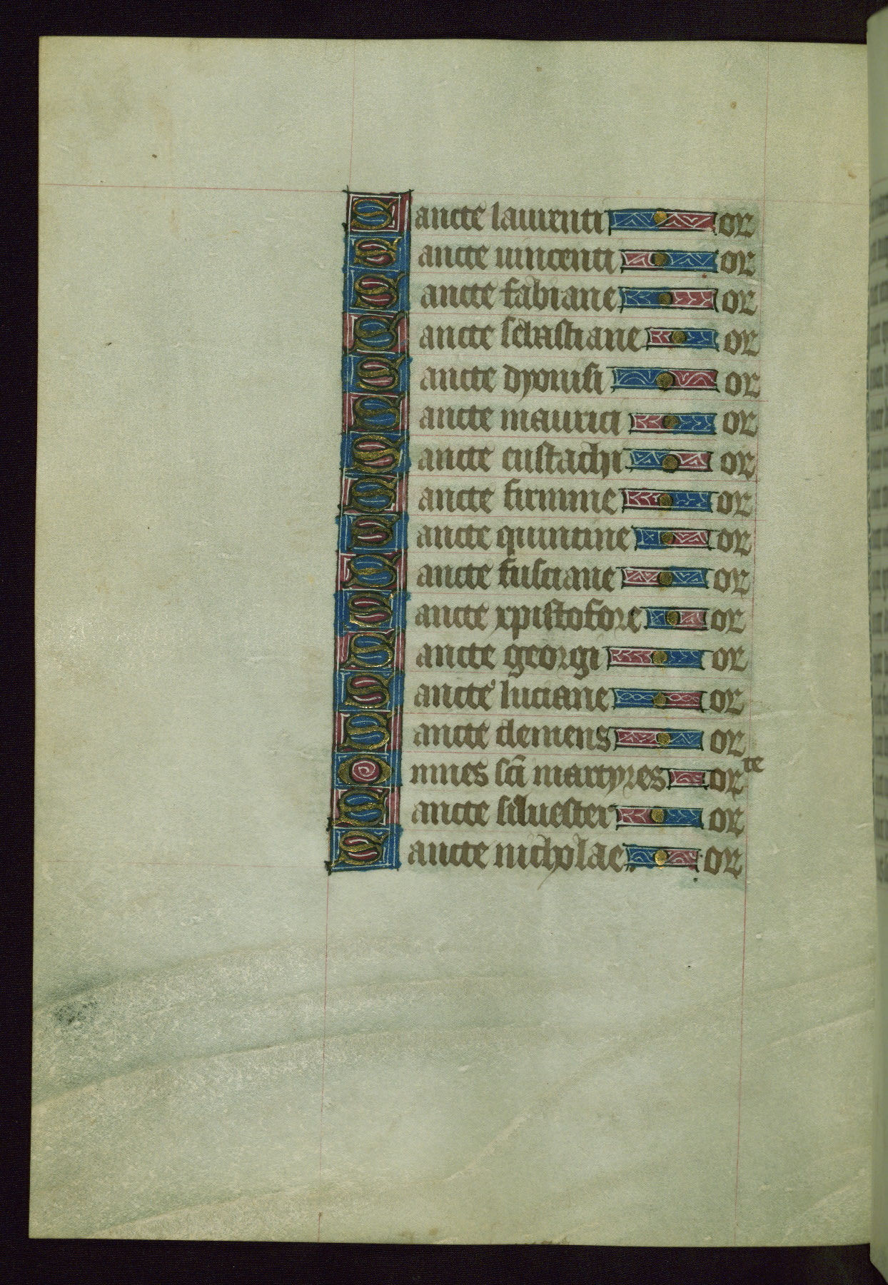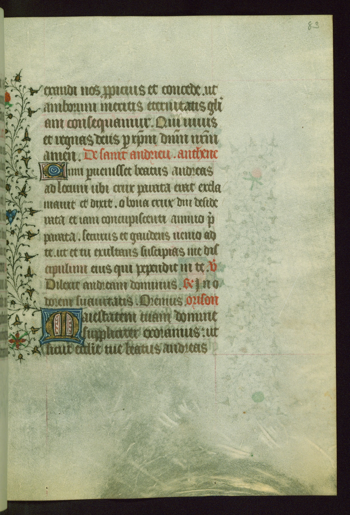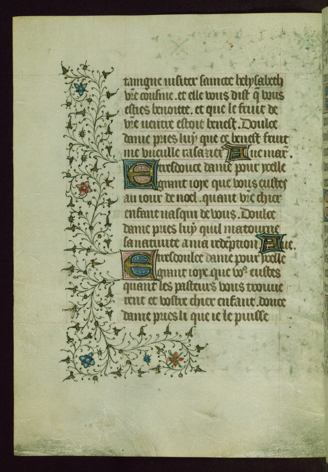 This Book of Hours was created ca. 1435-1440 in Amiens by artists from the circle of the Master of W.281 (Randall, cat. 112) for a female patron depicted on fol. 135r. The manuscript contains fourteen miniatures and is localized to Amiens by the contents of the calendar and litany, which include many saints particular to that region. Quire 12 (fols. 82-89) is misbound with quire 13 (fols. 90-97), with Suffrages and the Seven Verses of St. Bernard (fols. 82-89) intended to be after the Office of the Dead (fols. 90-128), as evinced by the location of the rubric for the Office of the Dead on fol. 81v.