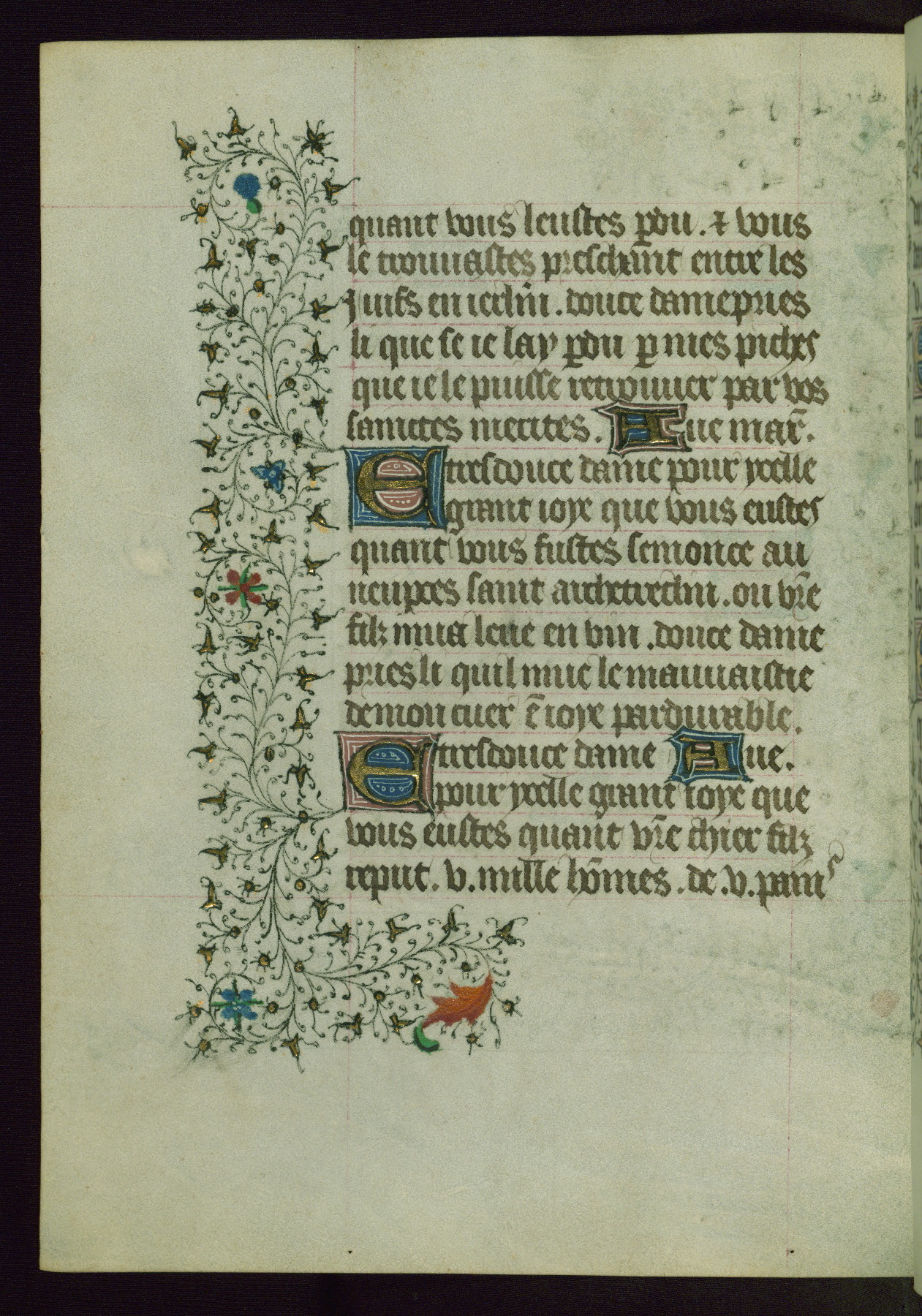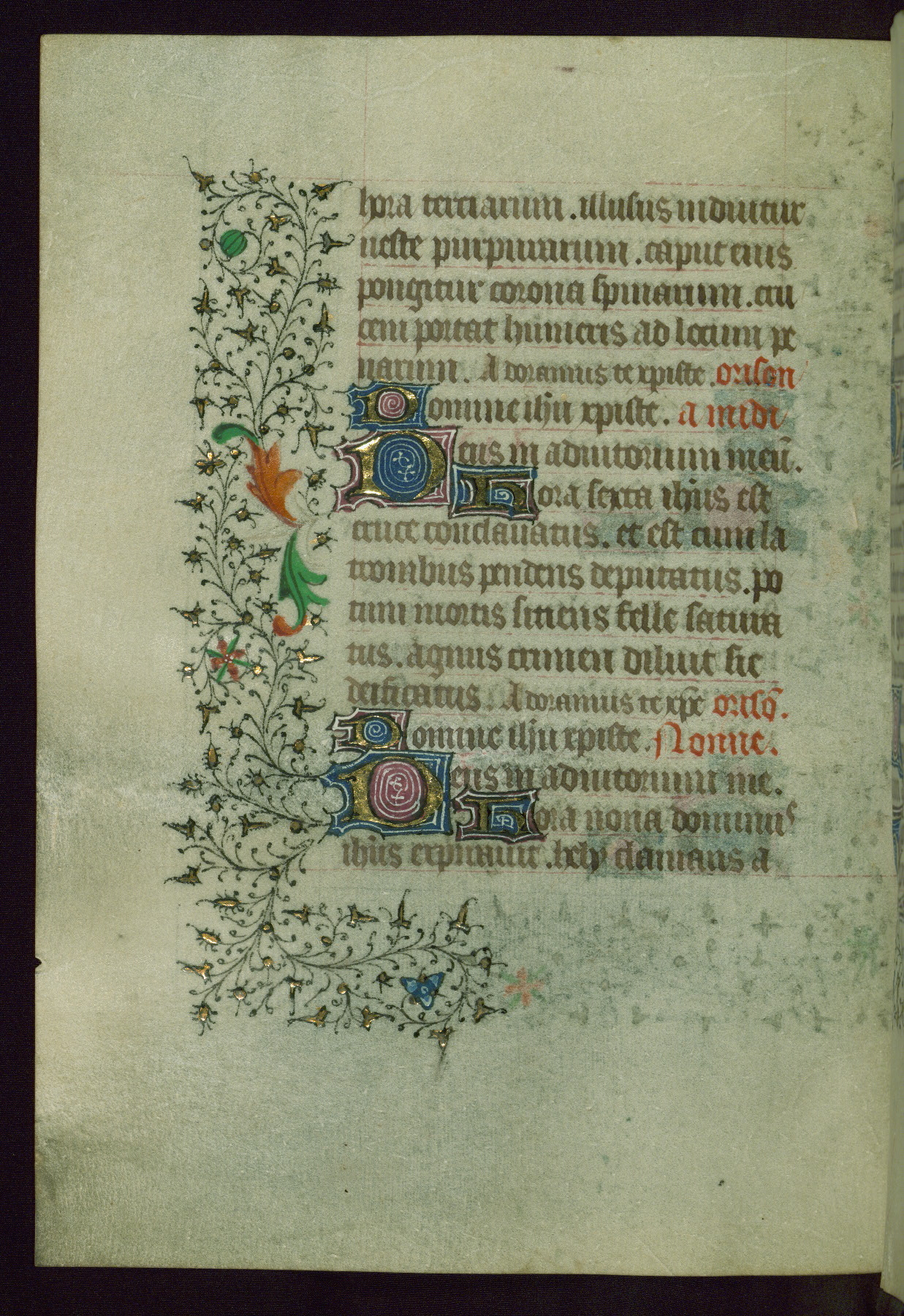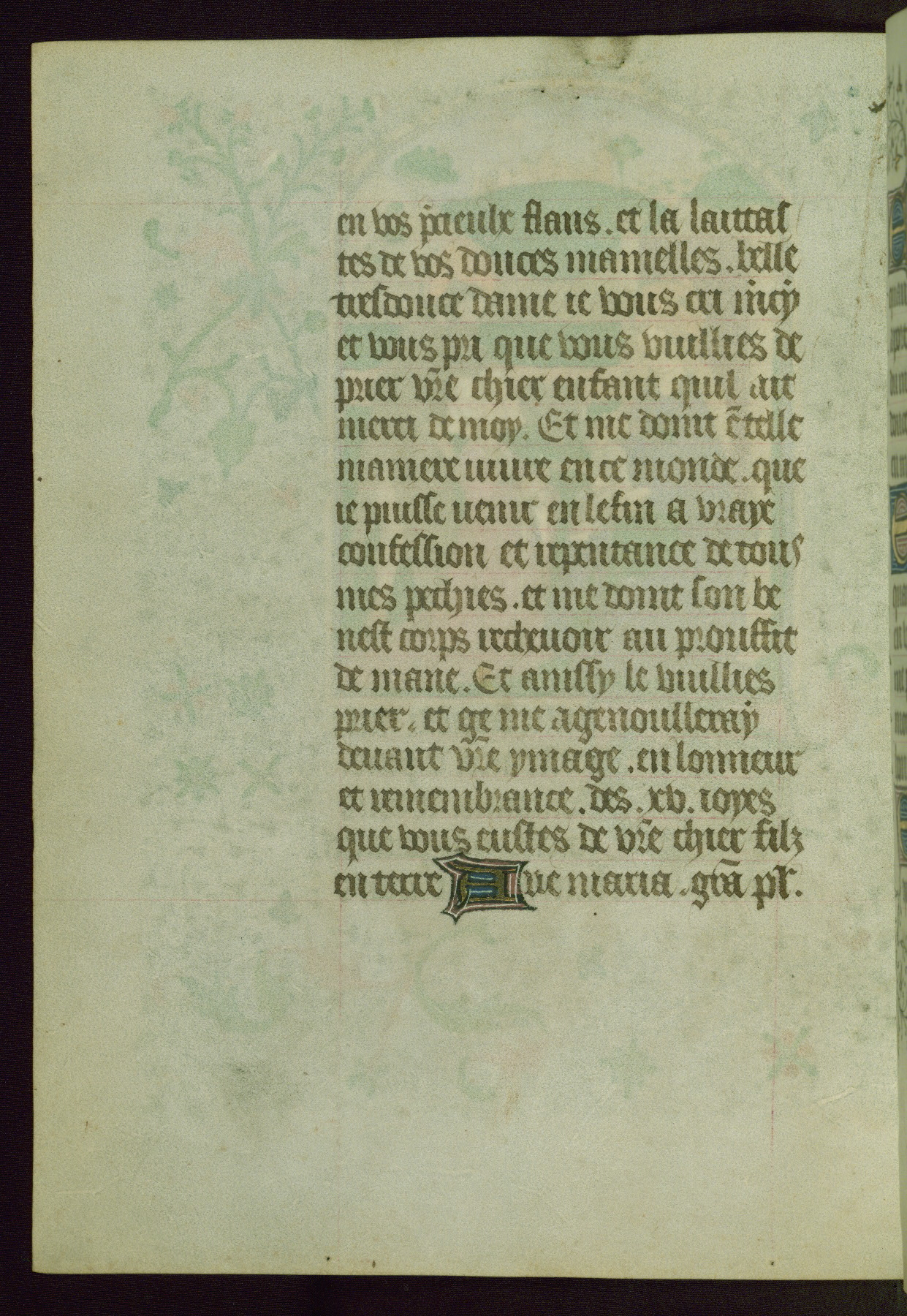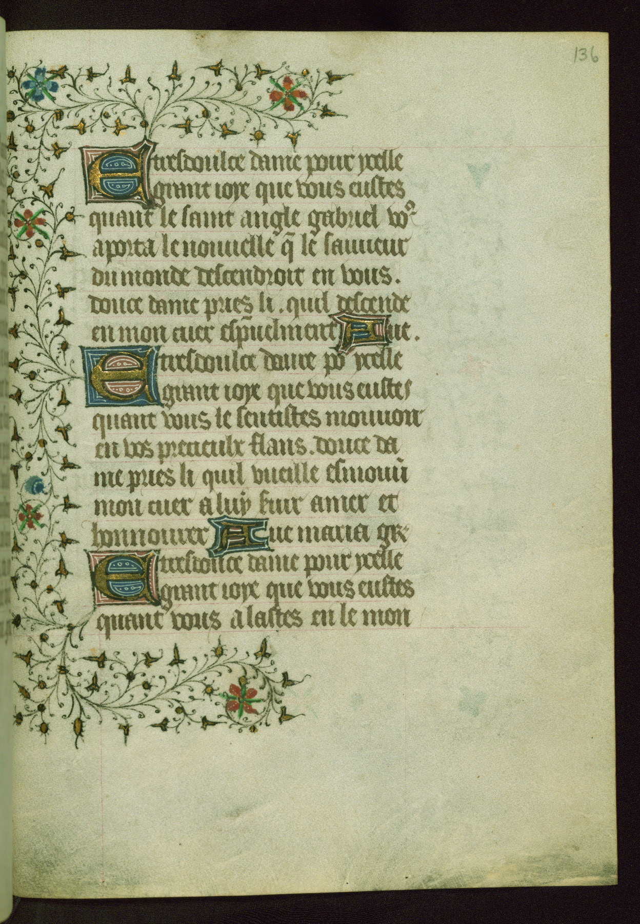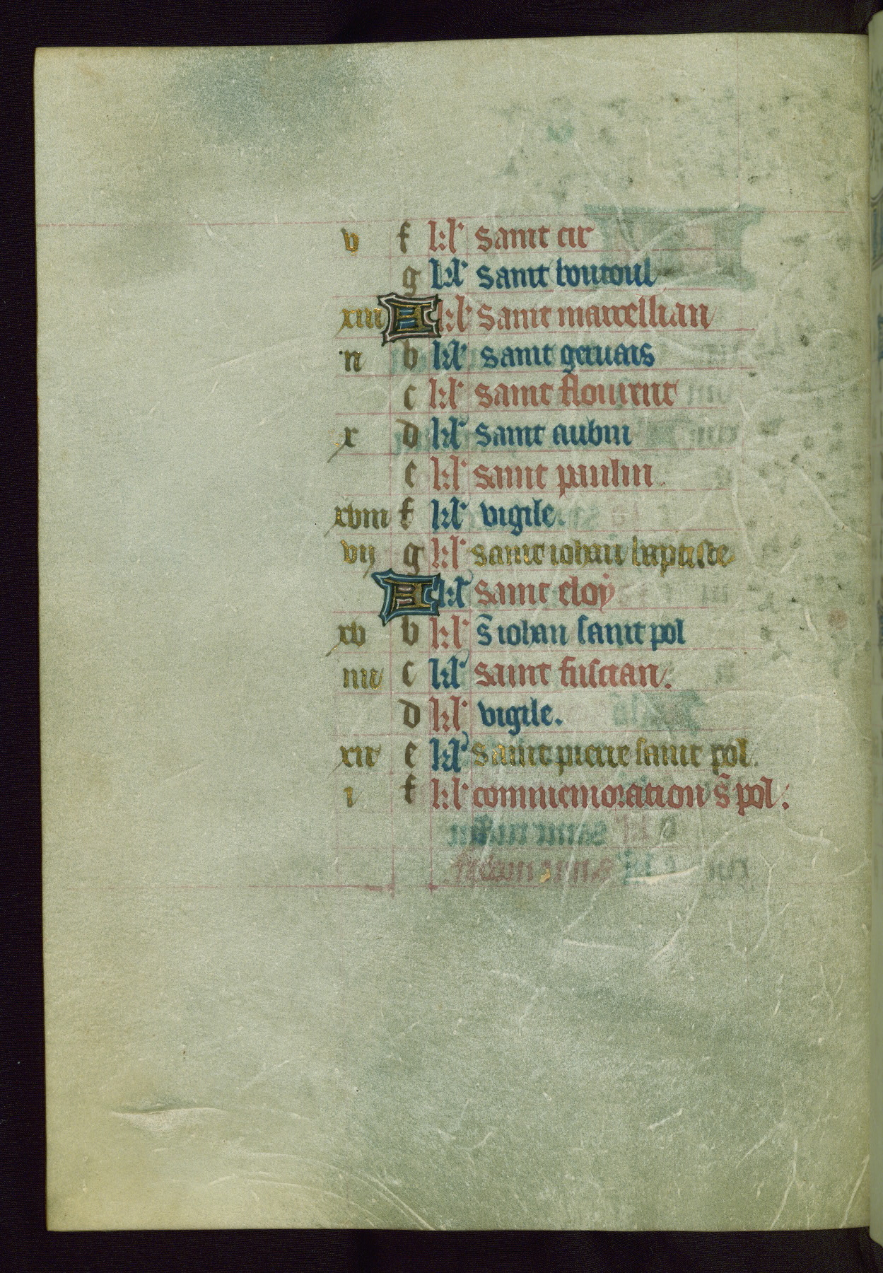 This Book of Hours was created ca. 1435-1440 in Amiens by artists from the circle of the Master of W.281 (Randall, cat. 112) for a female patron depicted on fol. 135r. The manuscript contains fourteen miniatures and is localized to Amiens by the contents of the calendar and litany, which include many saints particular to that region. Quire 12 (fols. 82-89) is misbound with quire 13 (fols. 90-97), with Suffrages and the Seven Verses of St. Bernard (fols. 82-89) intended to be after the Office of the Dead (fols. 90-128), as evinced by the location of the rubric for the Office of the Dead on fol. 81v.