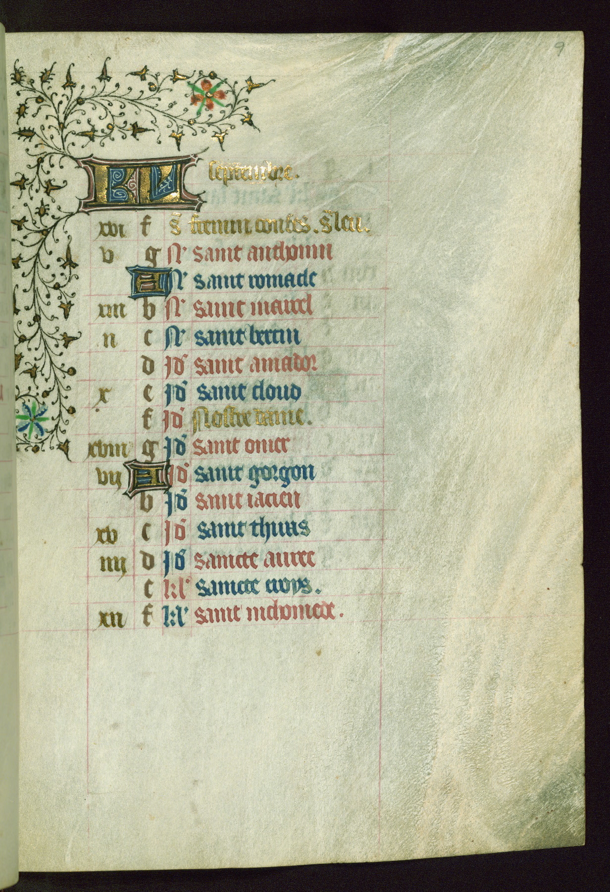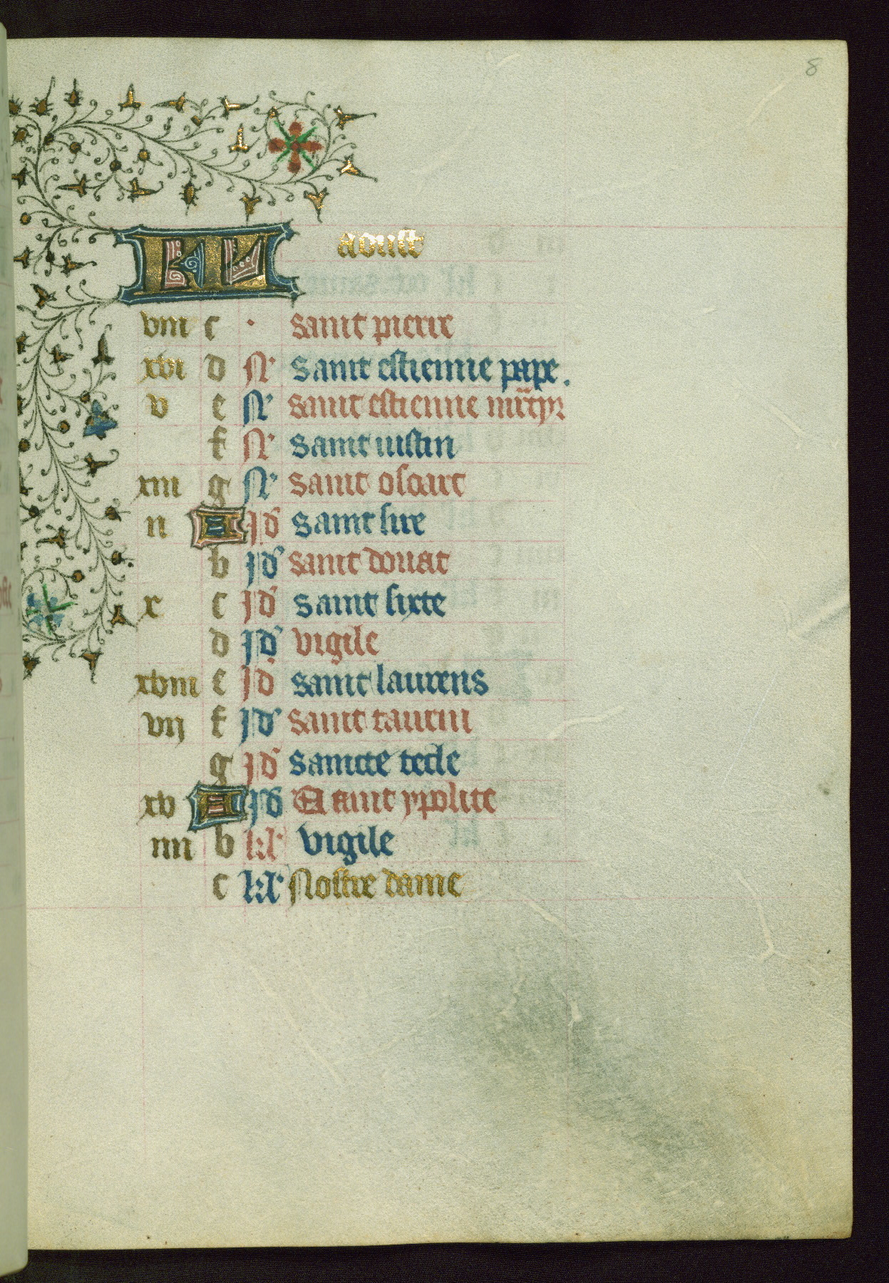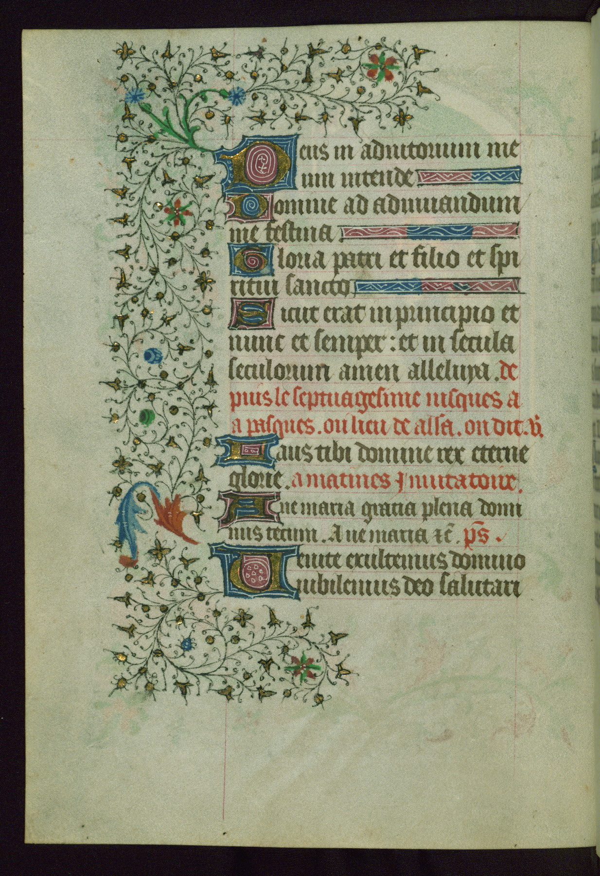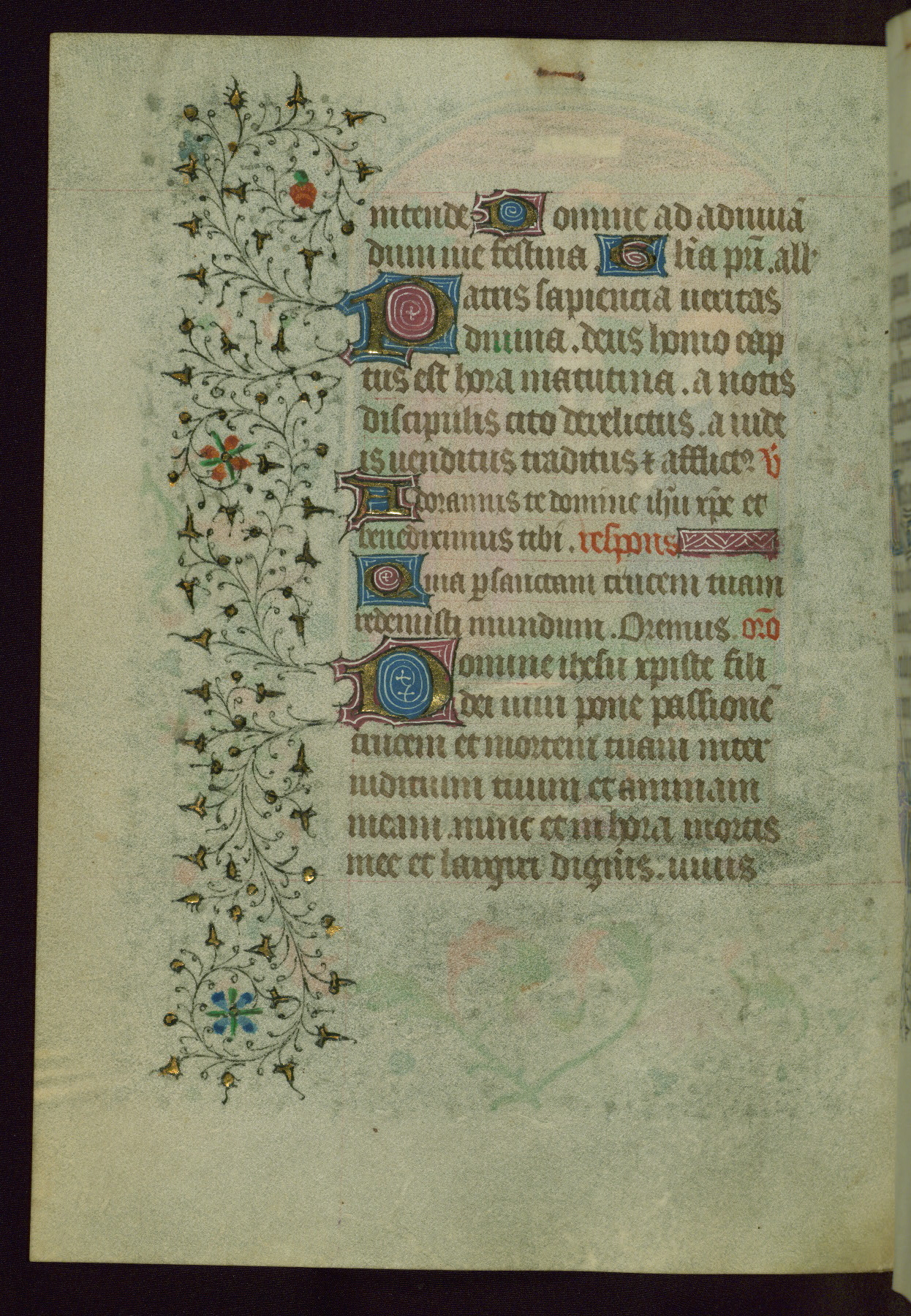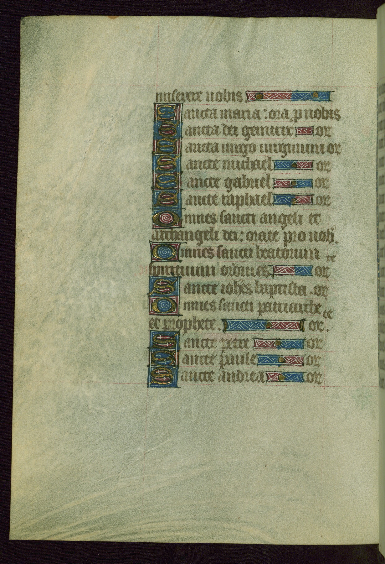 This Book of Hours was created ca. 1435-1440 in Amiens by artists from the circle of the Master of W.281 (Randall, cat. 112) for a female patron depicted on fol. 135r. The manuscript contains fourteen miniatures and is localized to Amiens by the contents of the calendar and litany, which include many saints particular to that region. Quire 12 (fols. 82-89) is misbound with quire 13 (fols. 90-97), with Suffrages and the Seven Verses of St. Bernard (fols. 82-89) intended to be after the Office of the Dead (fols. 90-128), as evinced by the location of the rubric for the Office of the Dead on fol. 81v.