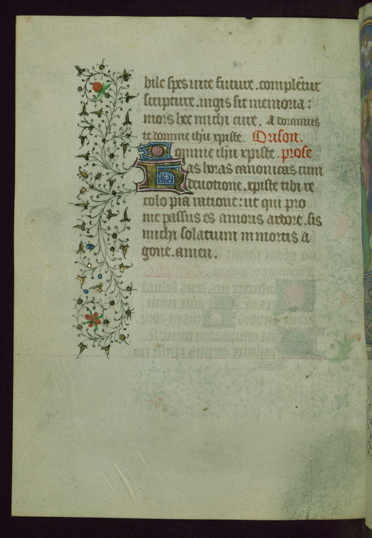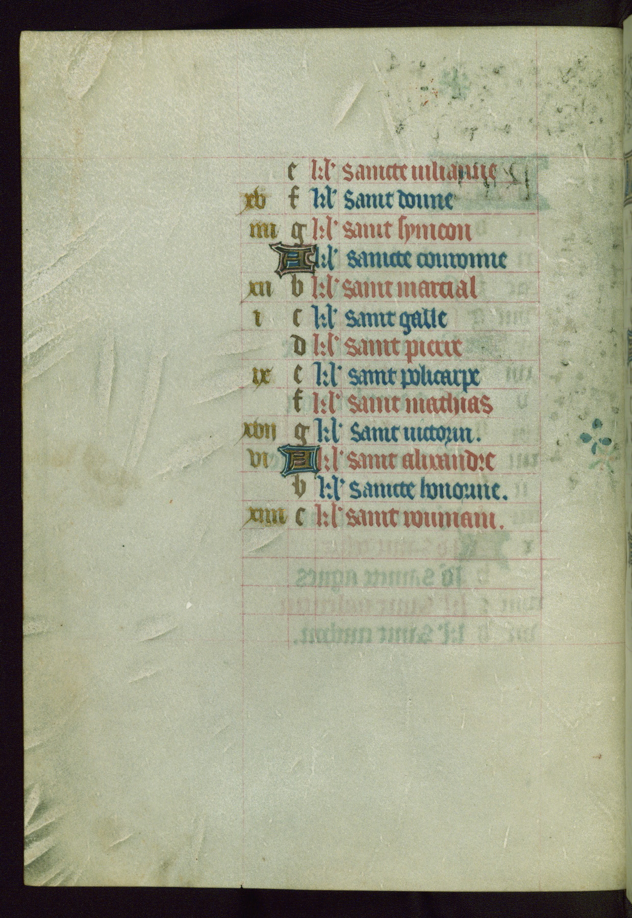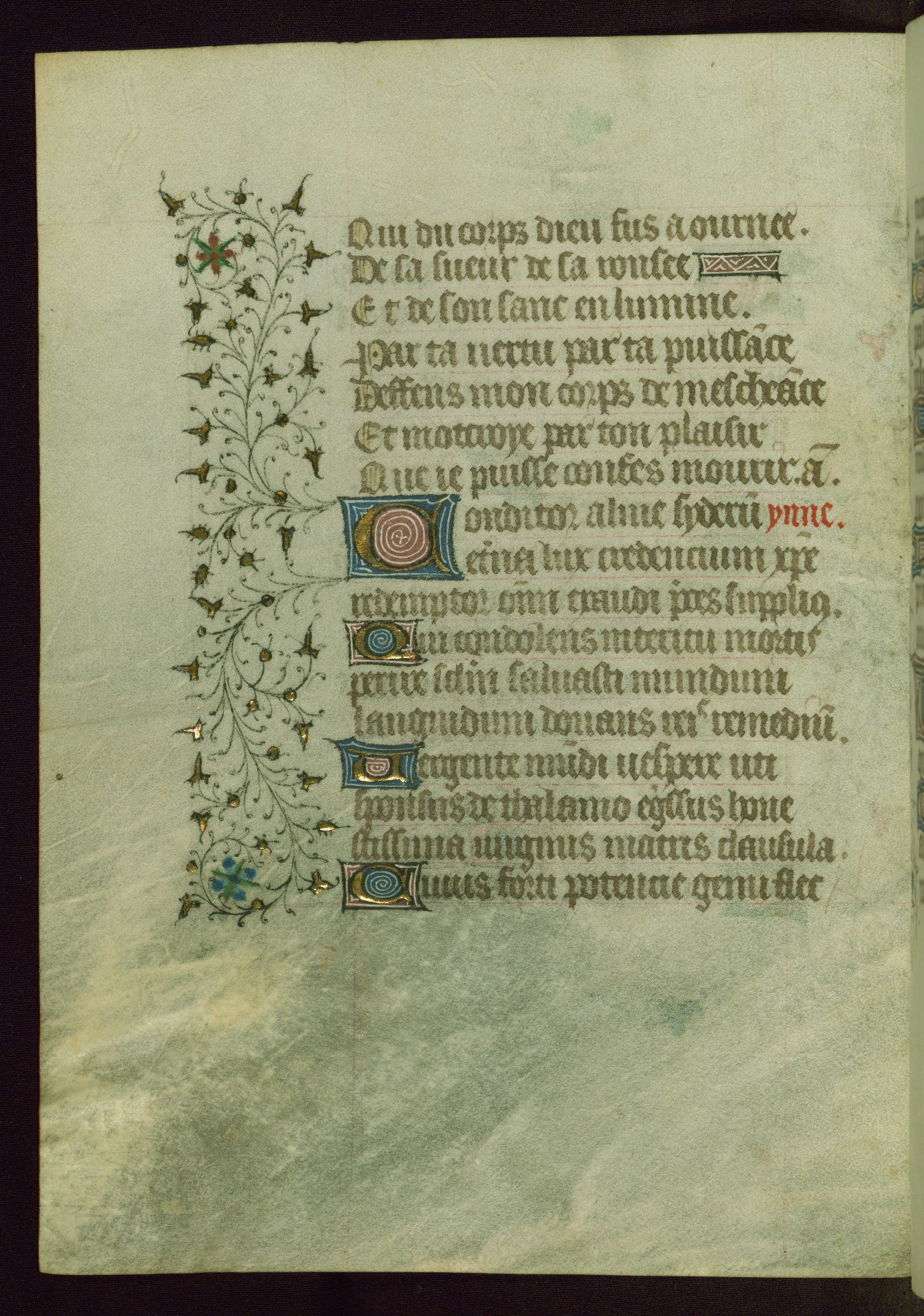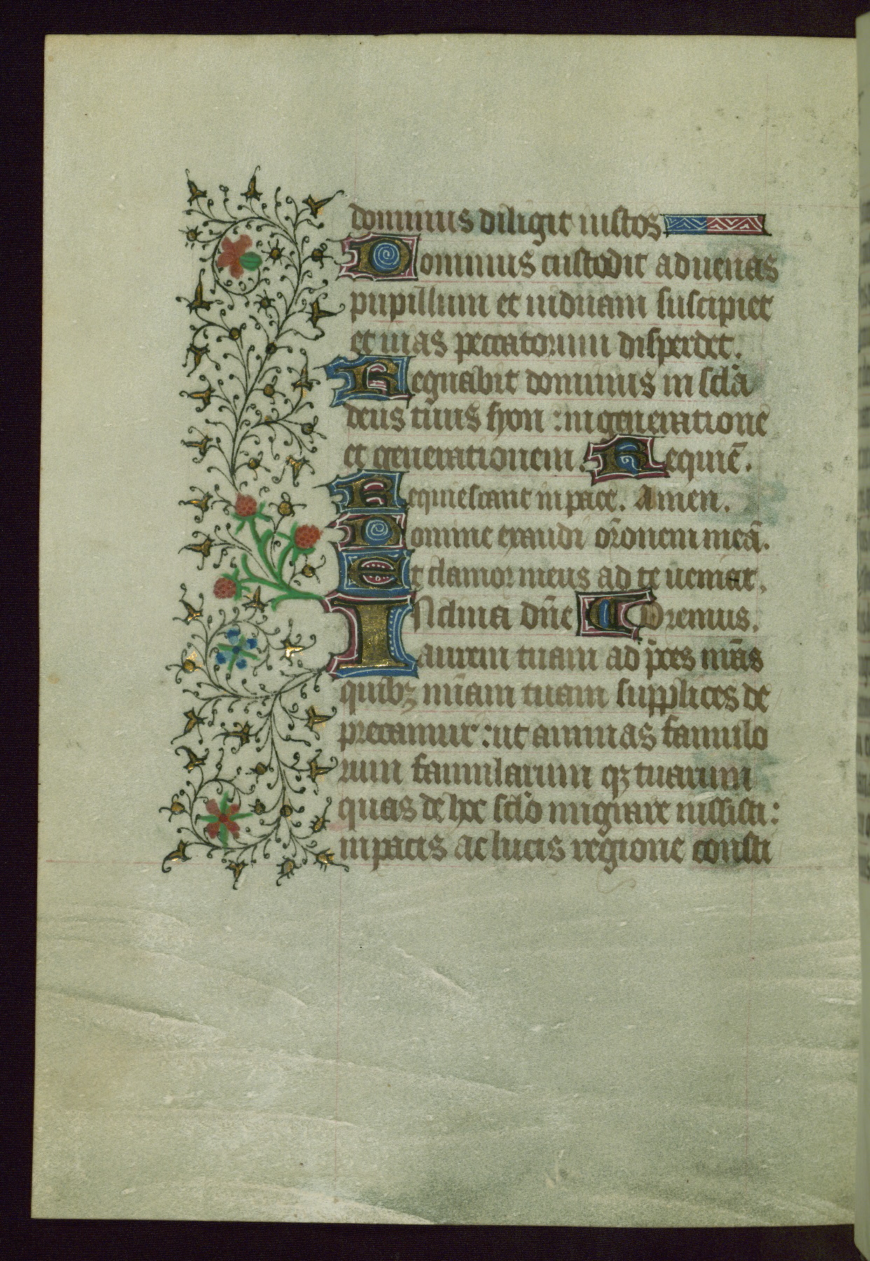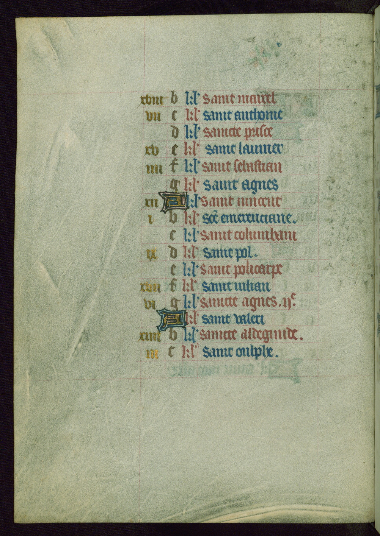 This Book of Hours was created ca. 1435-1440 in Amiens by artists from the circle of the Master of W.281 (Randall, cat. 112) for a female patron depicted on fol. 135r. The manuscript contains fourteen miniatures and is localized to Amiens by the contents of the calendar and litany, which include many saints particular to that region. Quire 12 (fols. 82-89) is misbound with quire 13 (fols. 90-97), with Suffrages and the Seven Verses of St. Bernard (fols. 82-89) intended to be after the Office of the Dead (fols. 90-128), as evinced by the location of the rubric for the Office of the Dead on fol. 81v.
