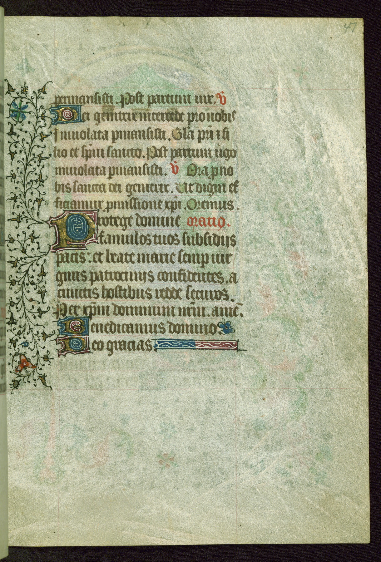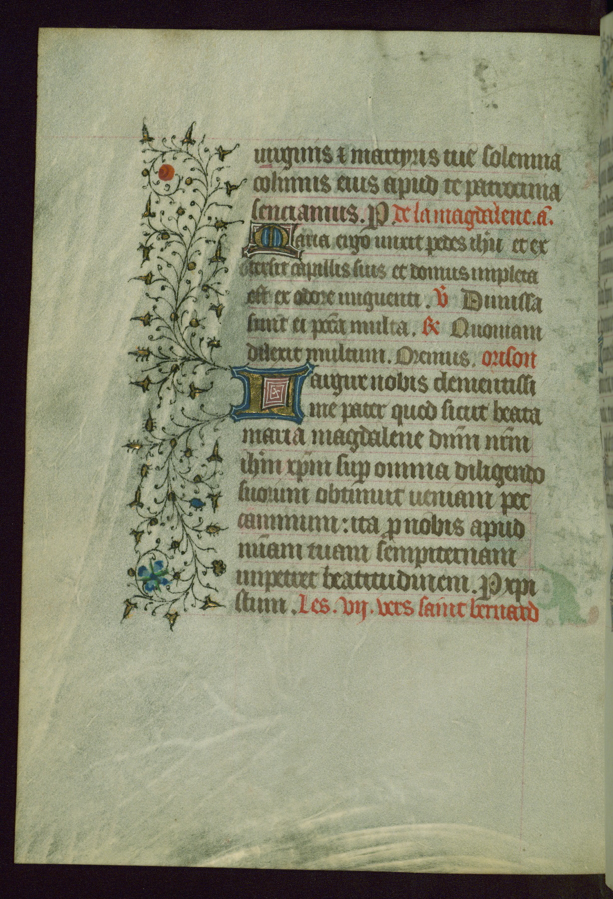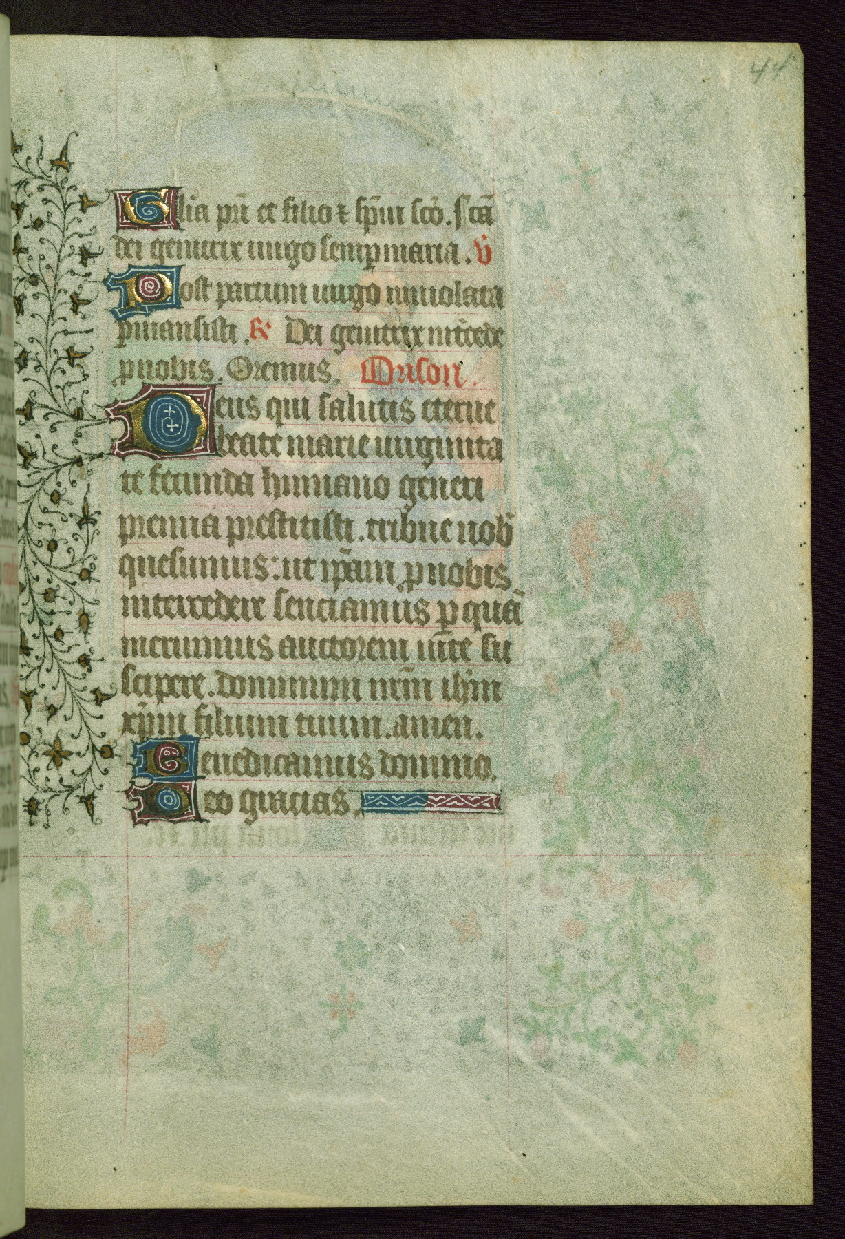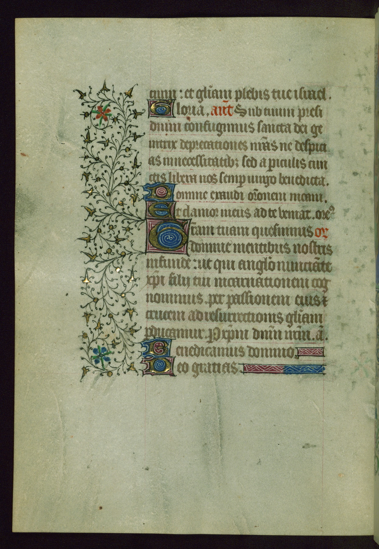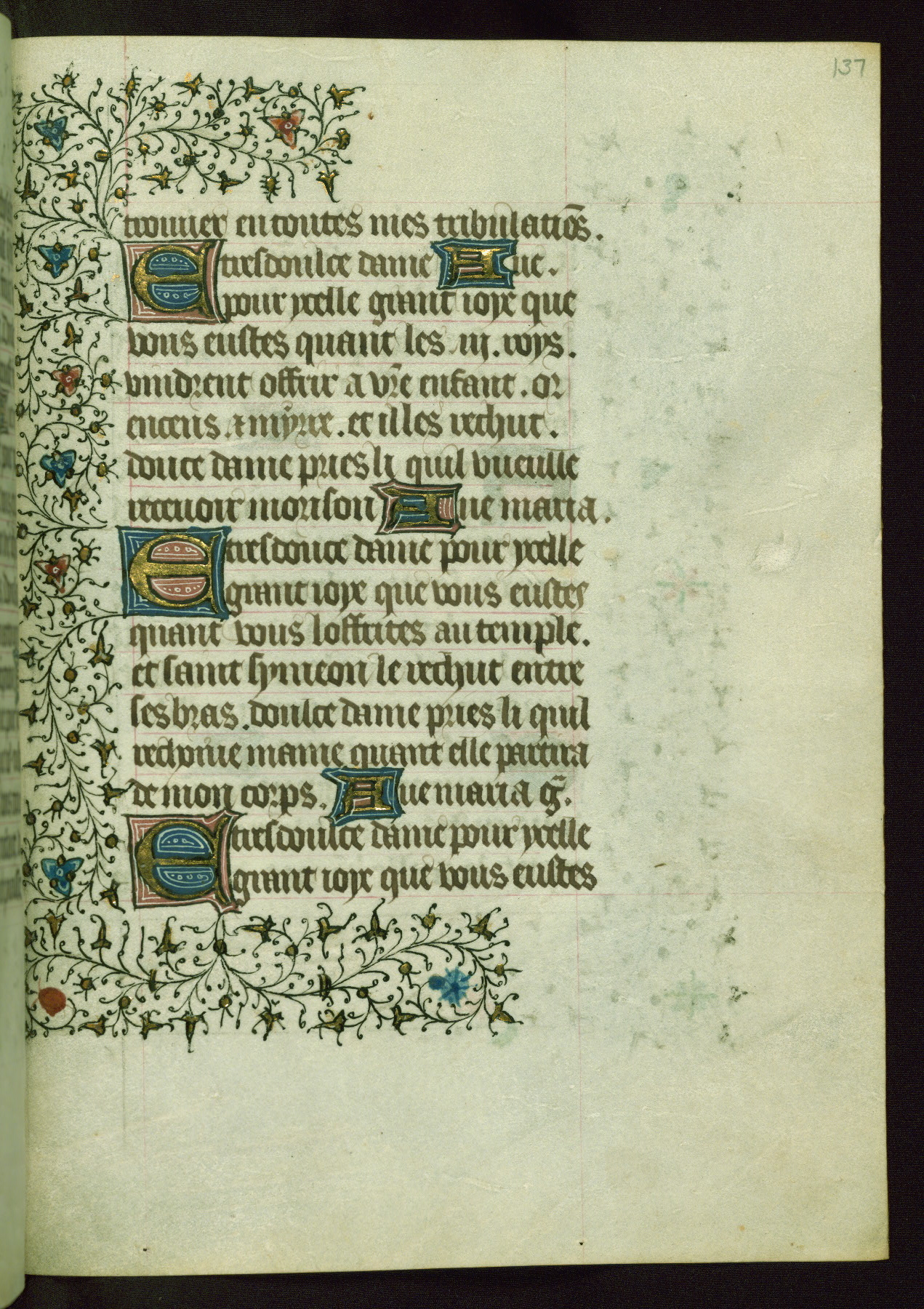 This Book of Hours was created ca. 1435-1440 in Amiens by artists from the circle of the Master of W.281 (Randall, cat. 112) for a female patron depicted on fol. 135r. The manuscript contains fourteen miniatures and is localized to Amiens by the contents of the calendar and litany, which include many saints particular to that region. Quire 12 (fols. 82-89) is misbound with quire 13 (fols. 90-97), with Suffrages and the Seven Verses of St. Bernard (fols. 82-89) intended to be after the Office of the Dead (fols. 90-128), as evinced by the location of the rubric for the Office of the Dead on fol. 81v.