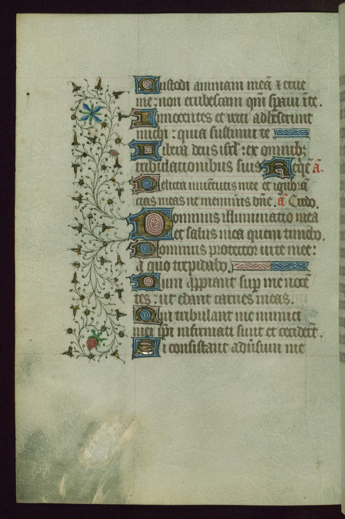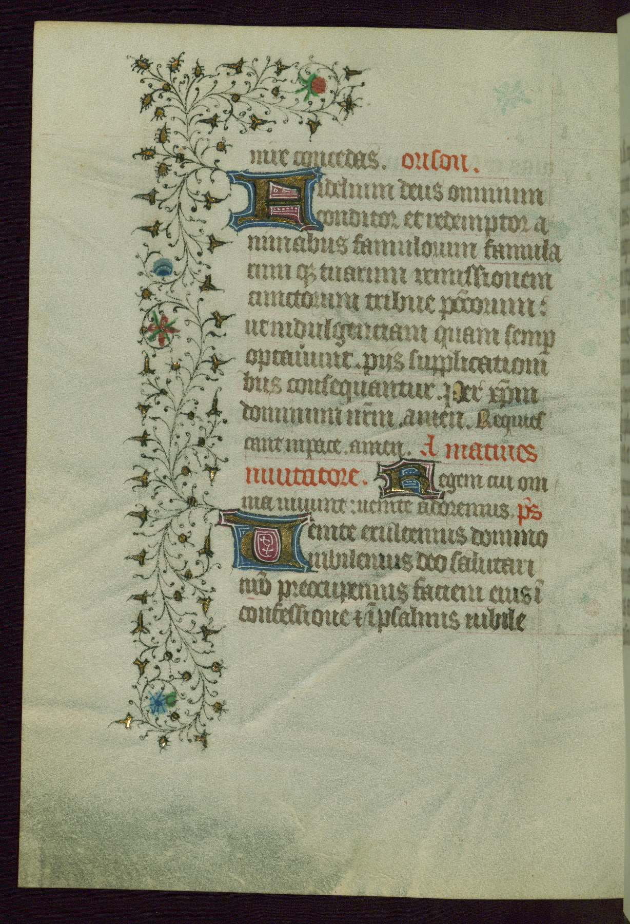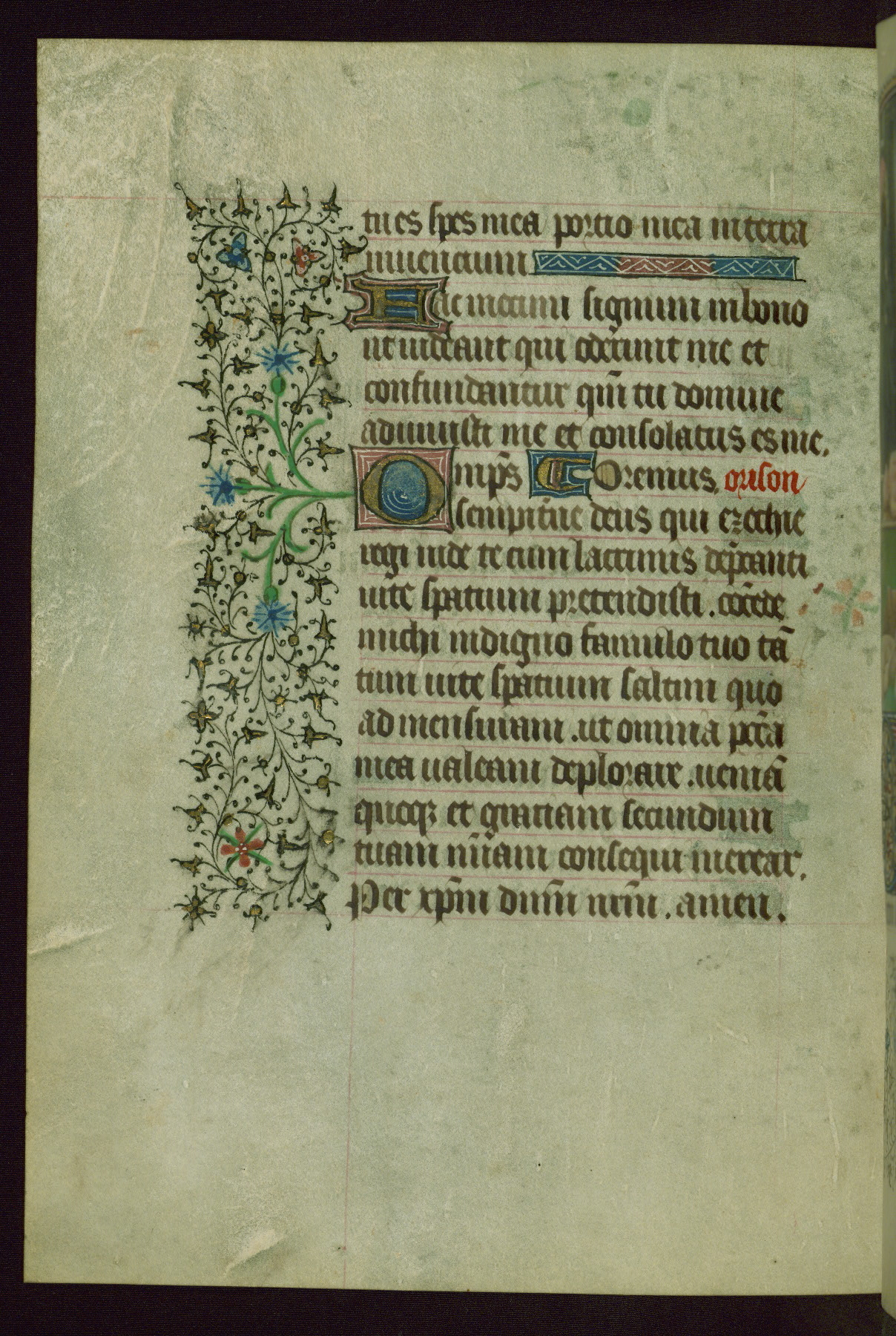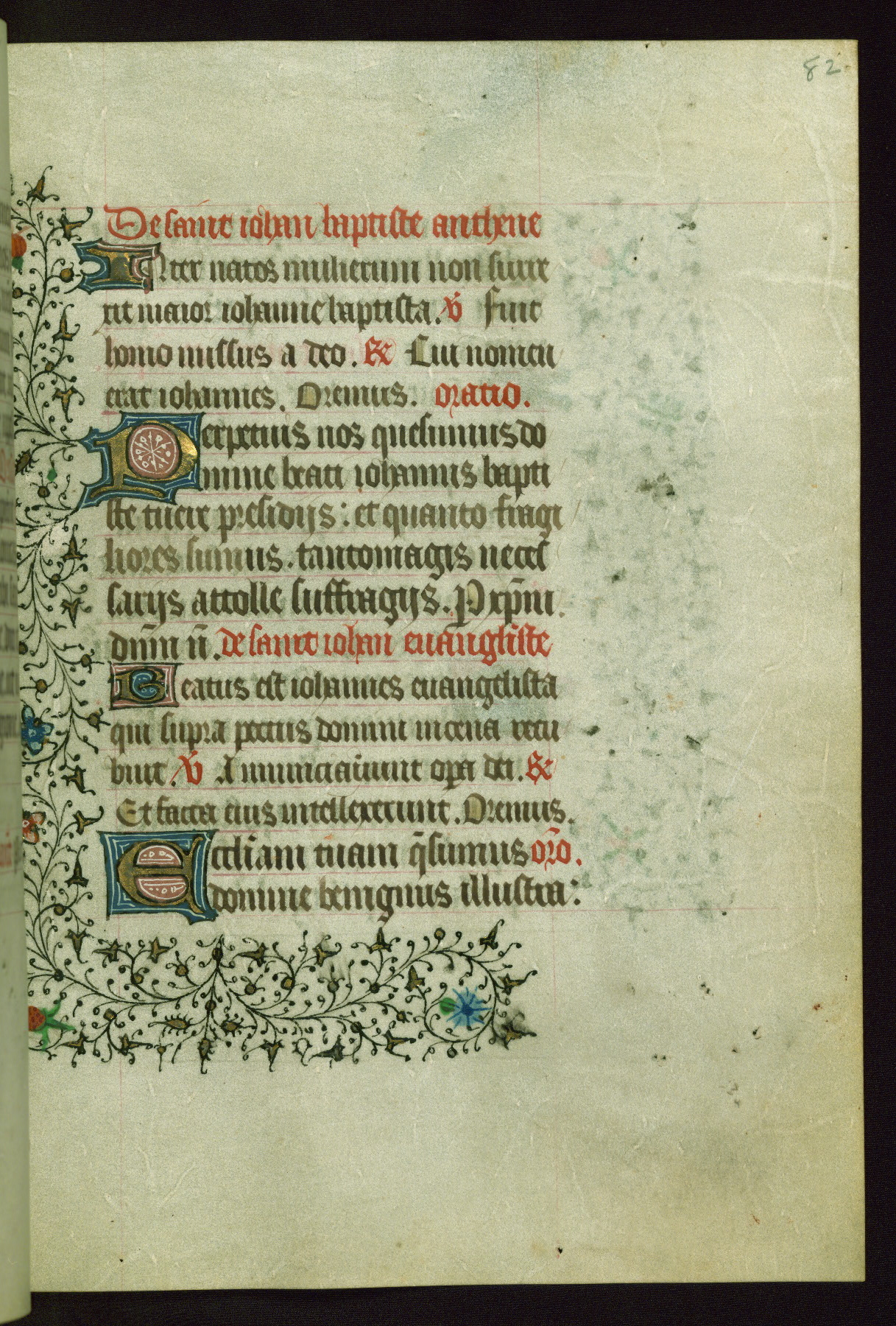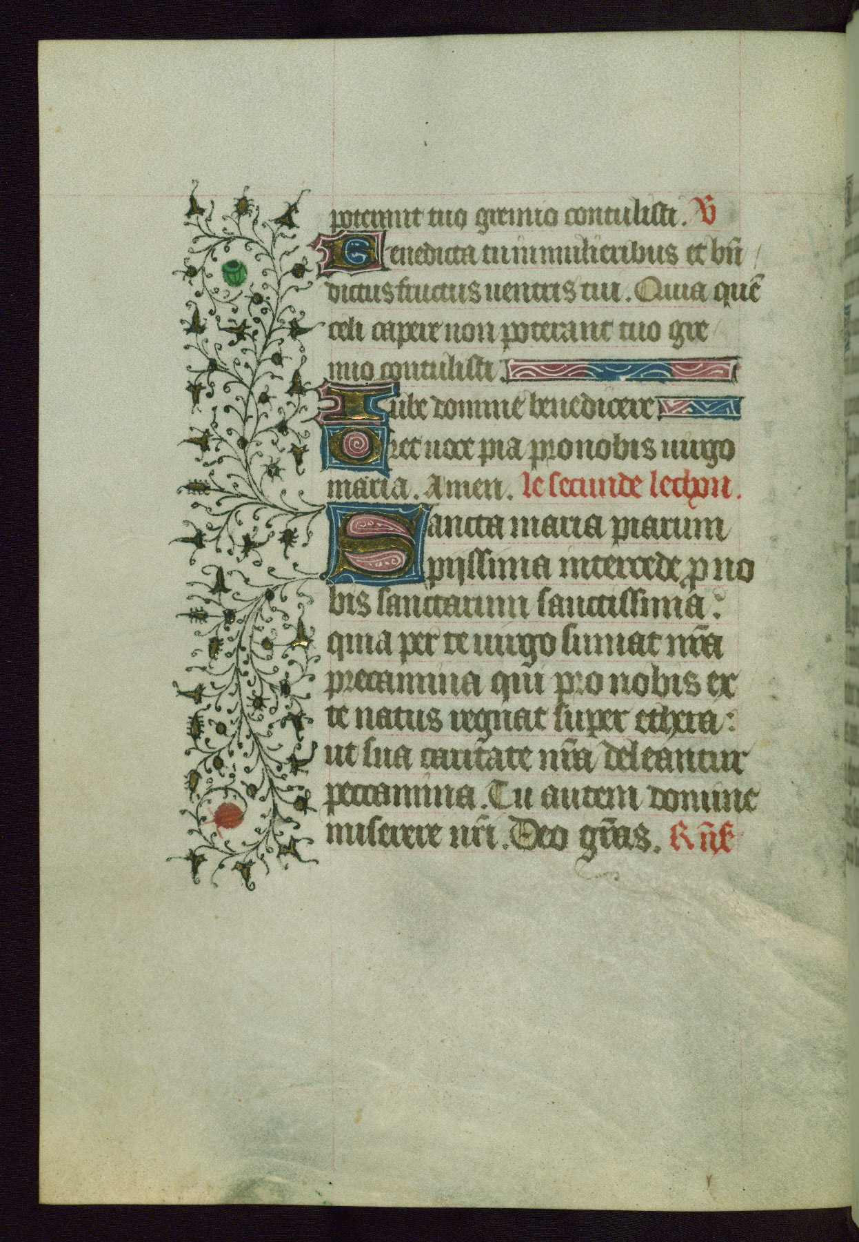 This Book of Hours was created ca. 1435-1440 in Amiens by artists from the circle of the Master of W.281 (Randall, cat. 112) for a female patron depicted on fol. 135r. The manuscript contains fourteen miniatures and is localized to Amiens by the contents of the calendar and litany, which include many saints particular to that region. Quire 12 (fols. 82-89) is misbound with quire 13 (fols. 90-97), with Suffrages and the Seven Verses of St. Bernard (fols. 82-89) intended to be after the Office of the Dead (fols. 90-128), as evinced by the location of the rubric for the Office of the Dead on fol. 81v.