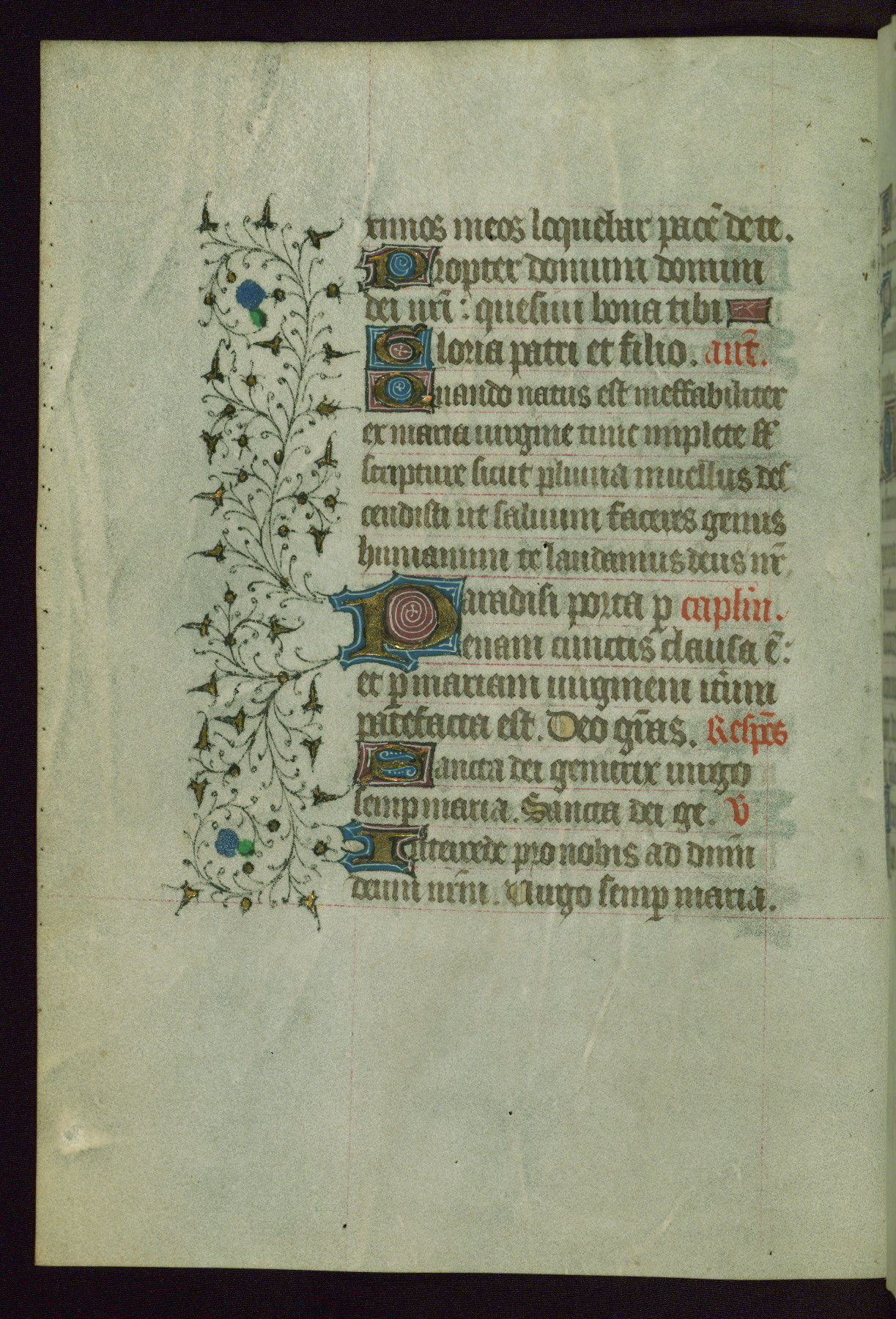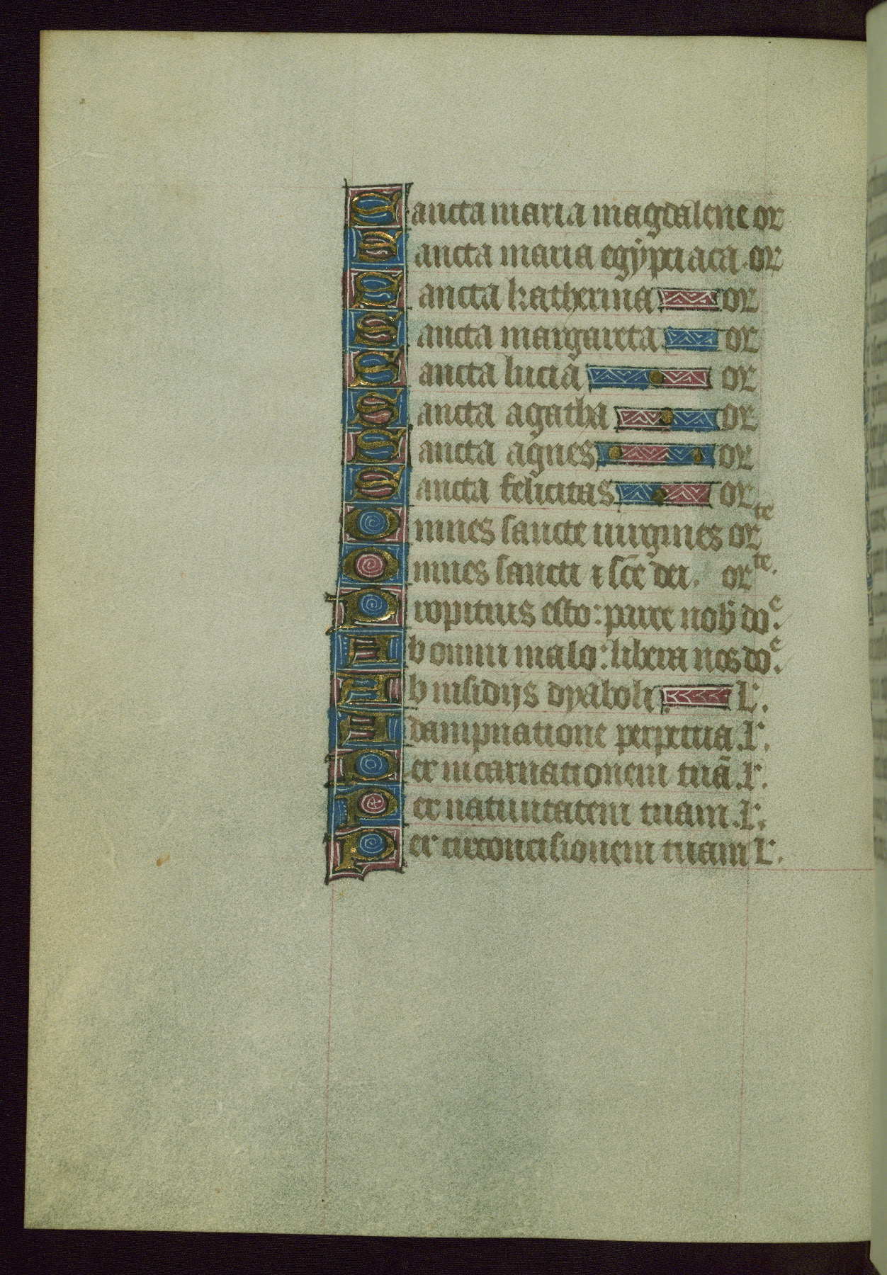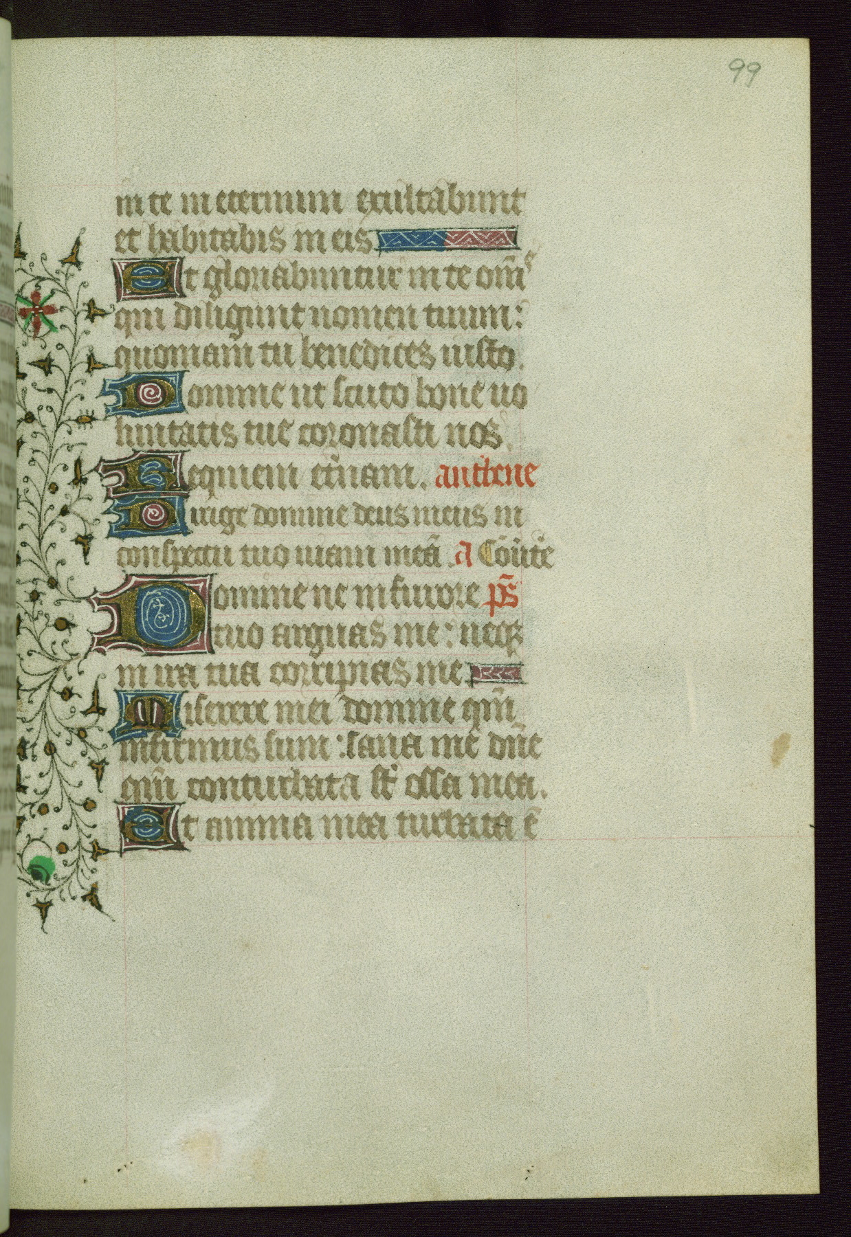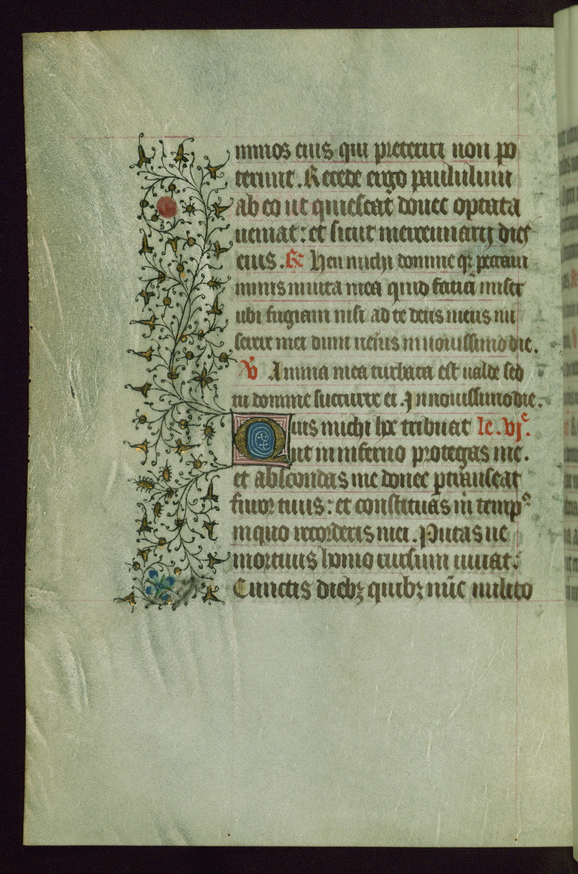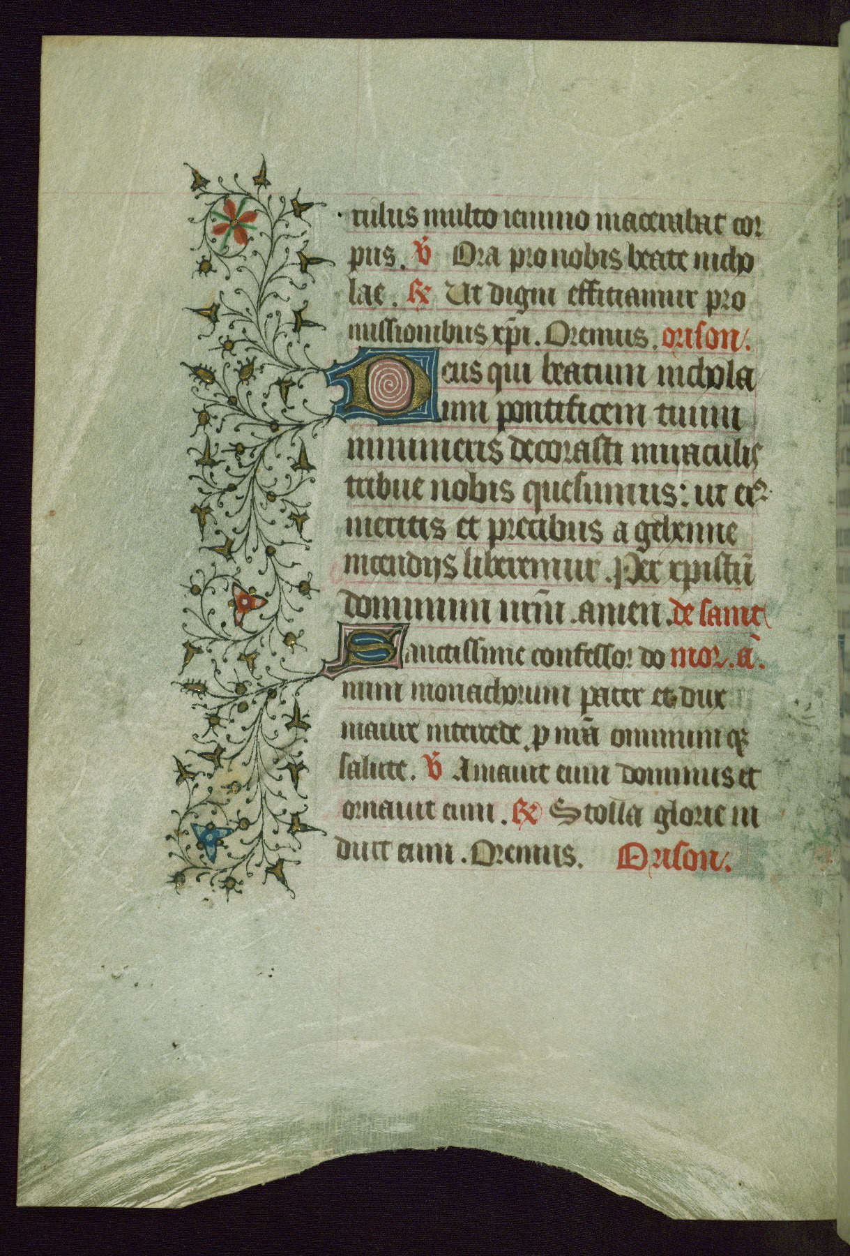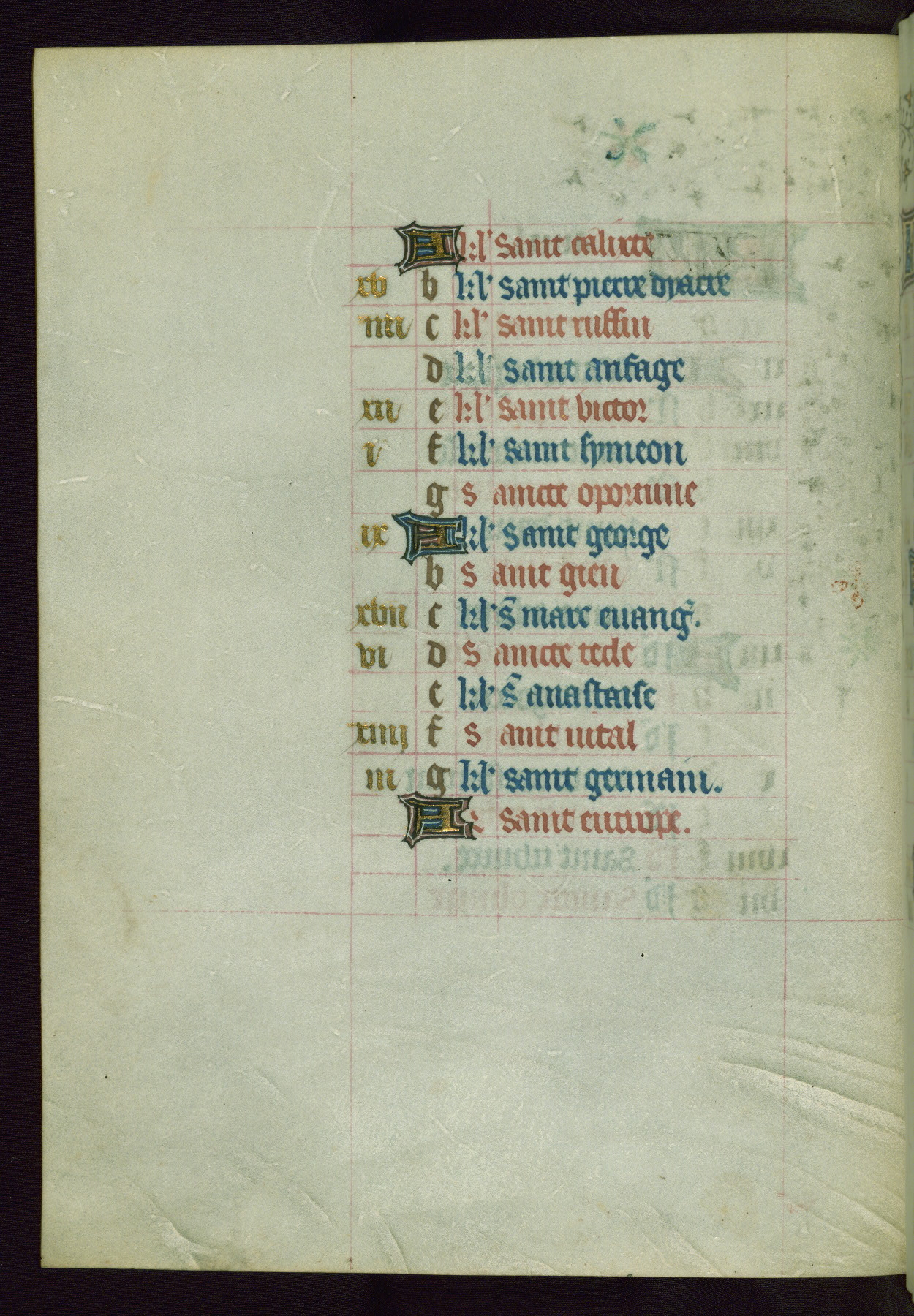 This Book of Hours was created ca. 1435-1440 in Amiens by artists from the circle of the Master of W.281 (Randall, cat. 112) for a female patron depicted on fol. 135r. The manuscript contains fourteen miniatures and is localized to Amiens by the contents of the calendar and litany, which include many saints particular to that region. Quire 12 (fols. 82-89) is misbound with quire 13 (fols. 90-97), with Suffrages and the Seven Verses of St. Bernard (fols. 82-89) intended to be after the Office of the Dead (fols. 90-128), as evinced by the location of the rubric for the Office of the Dead on fol. 81v.