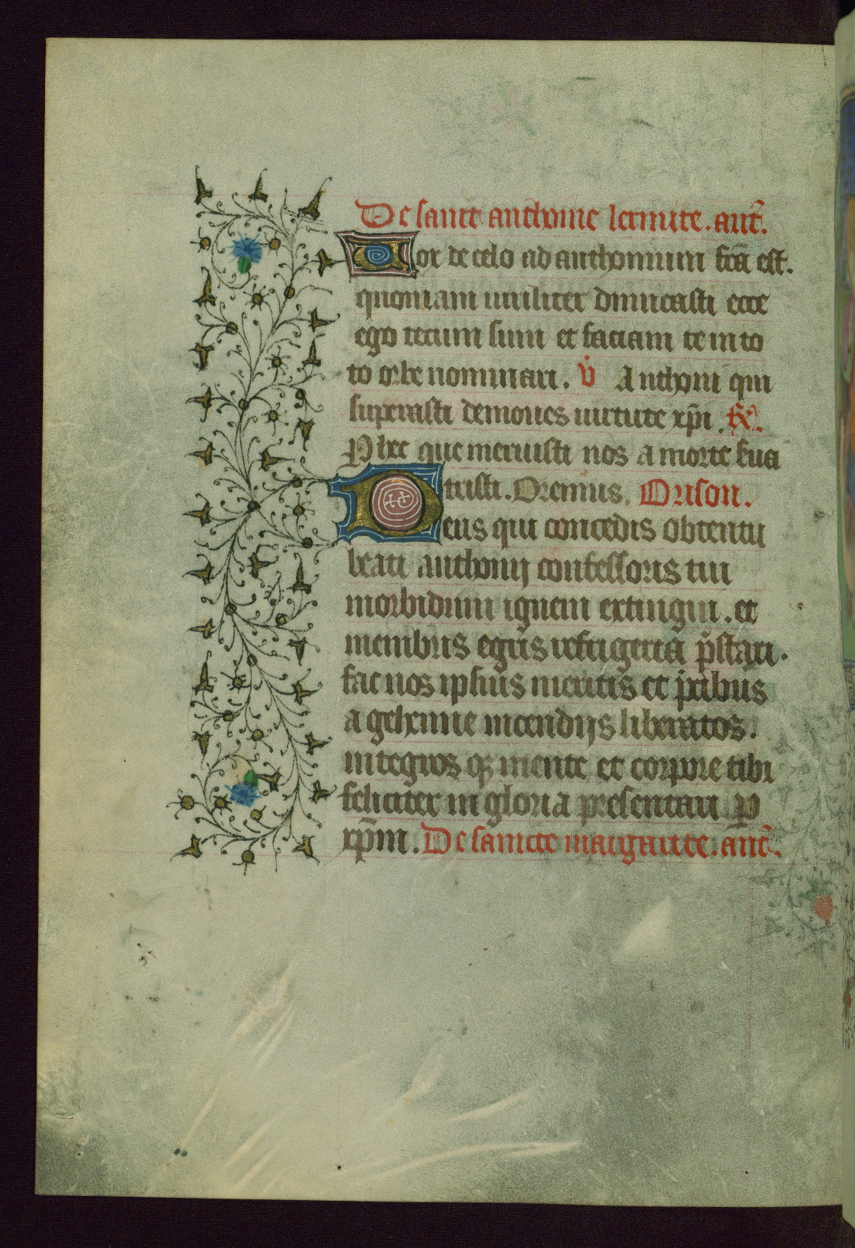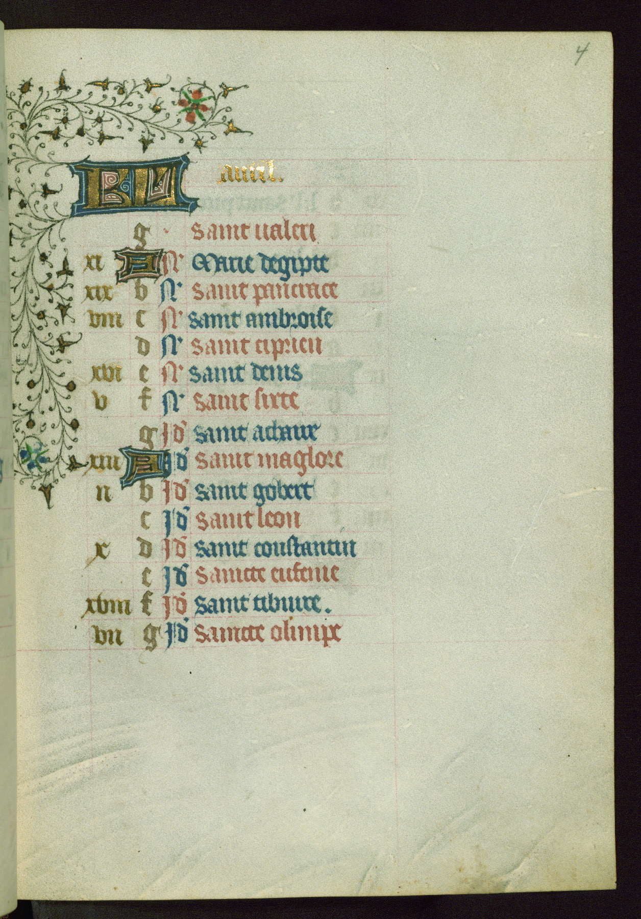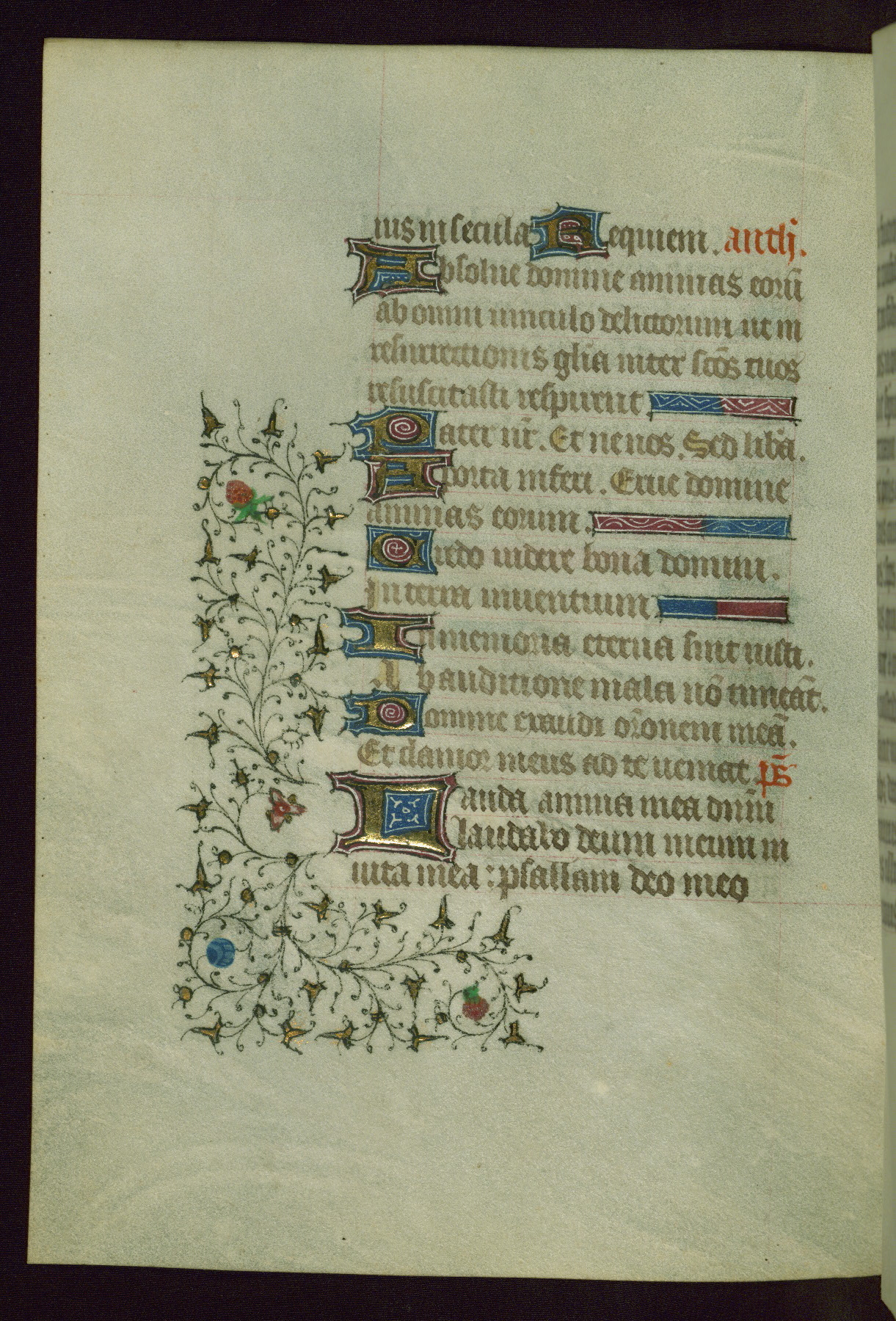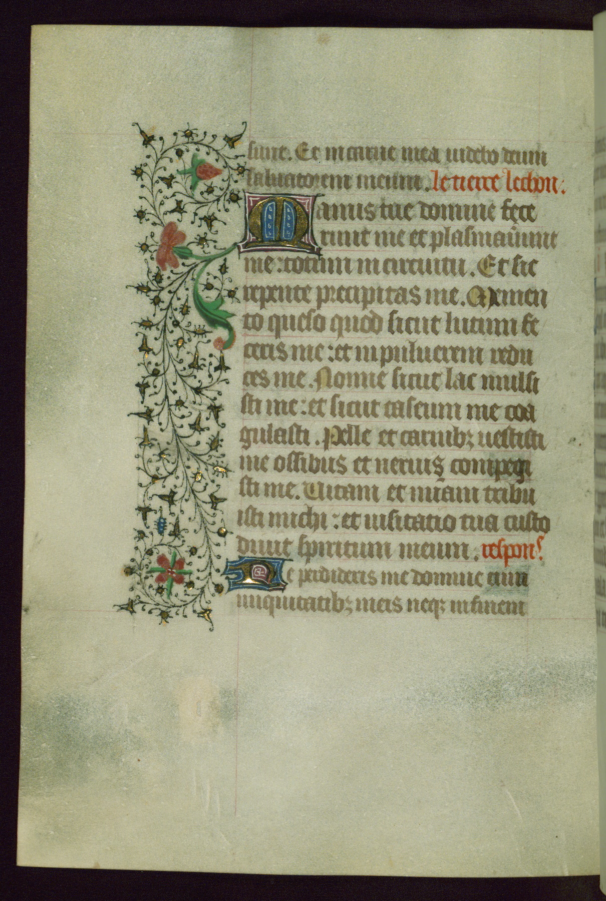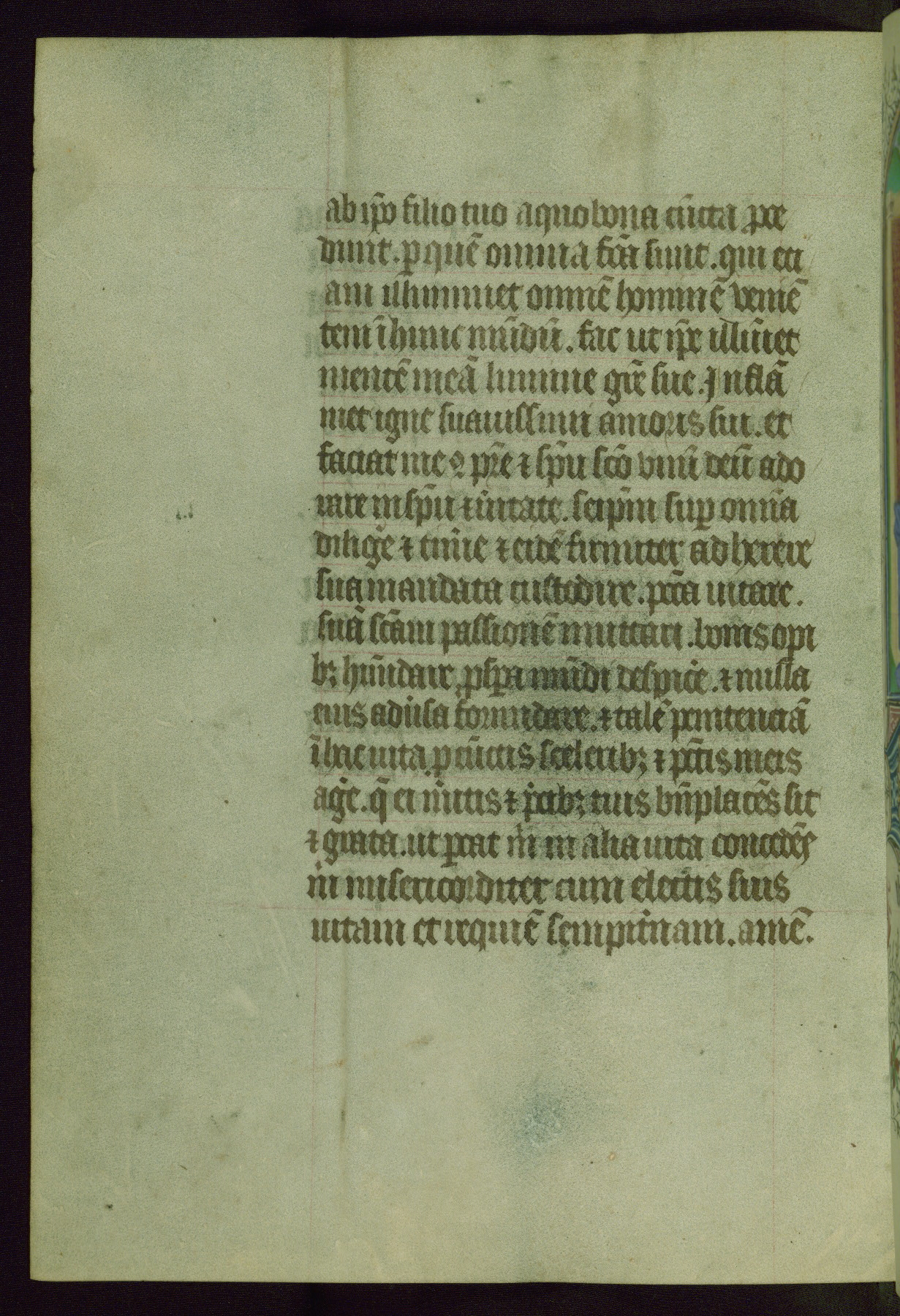 This Book of Hours was created ca. 1435-1440 in Amiens by artists from the circle of the Master of W.281 (Randall, cat. 112) for a female patron depicted on fol. 135r. The manuscript contains fourteen miniatures and is localized to Amiens by the contents of the calendar and litany, which include many saints particular to that region. Quire 12 (fols. 82-89) is misbound with quire 13 (fols. 90-97), with Suffrages and the Seven Verses of St. Bernard (fols. 82-89) intended to be after the Office of the Dead (fols. 90-128), as evinced by the location of the rubric for the Office of the Dead on fol. 81v.